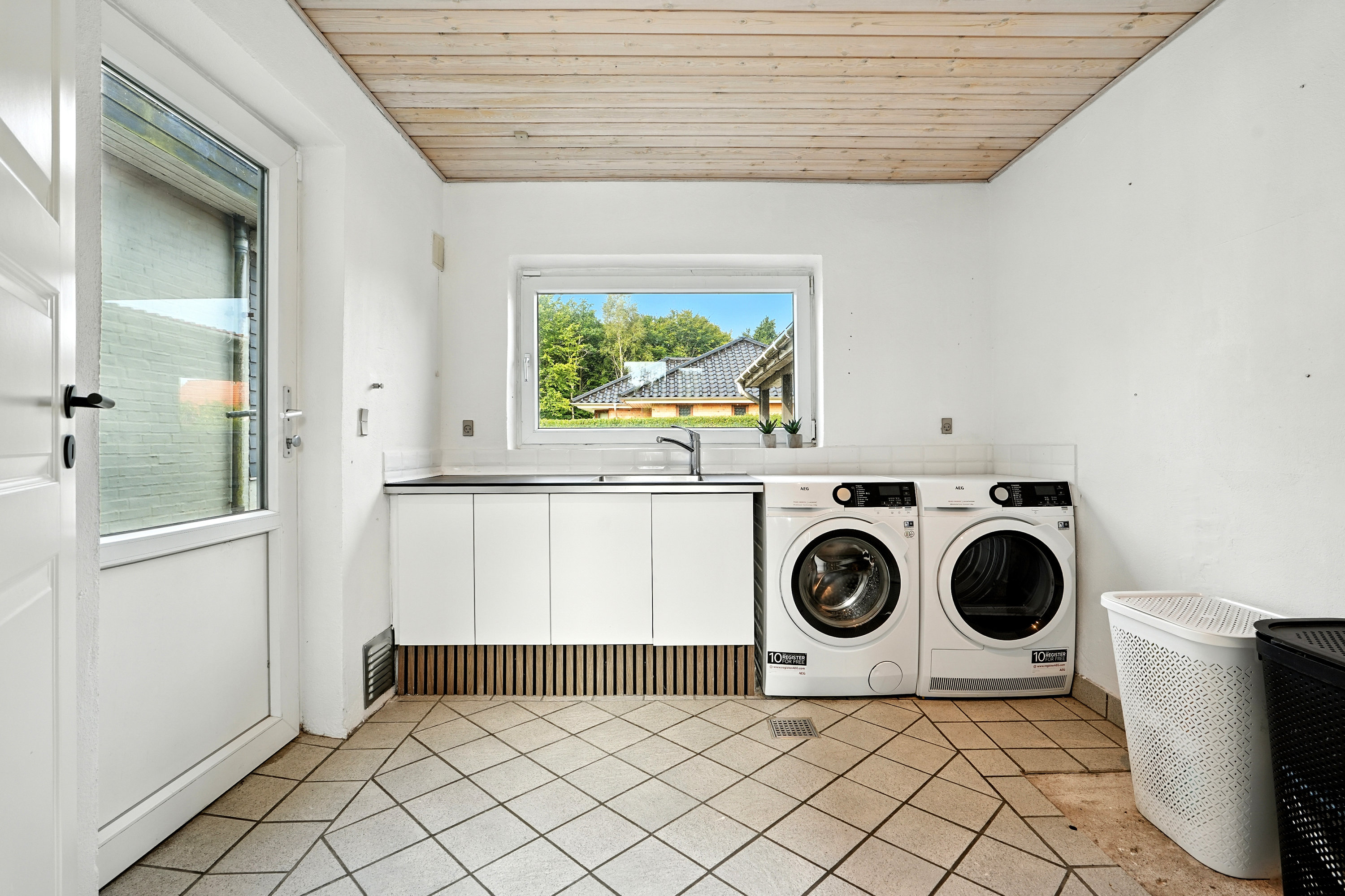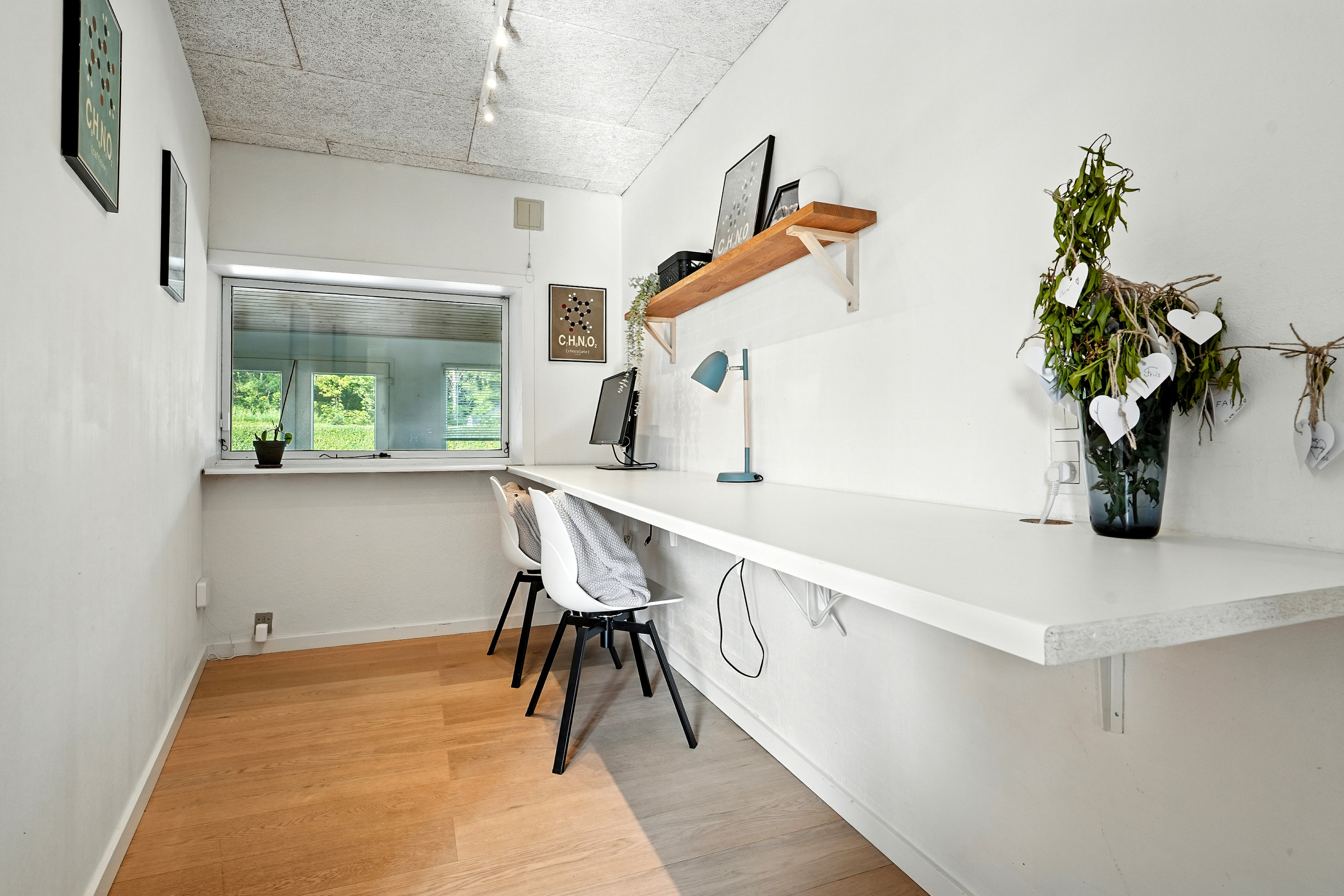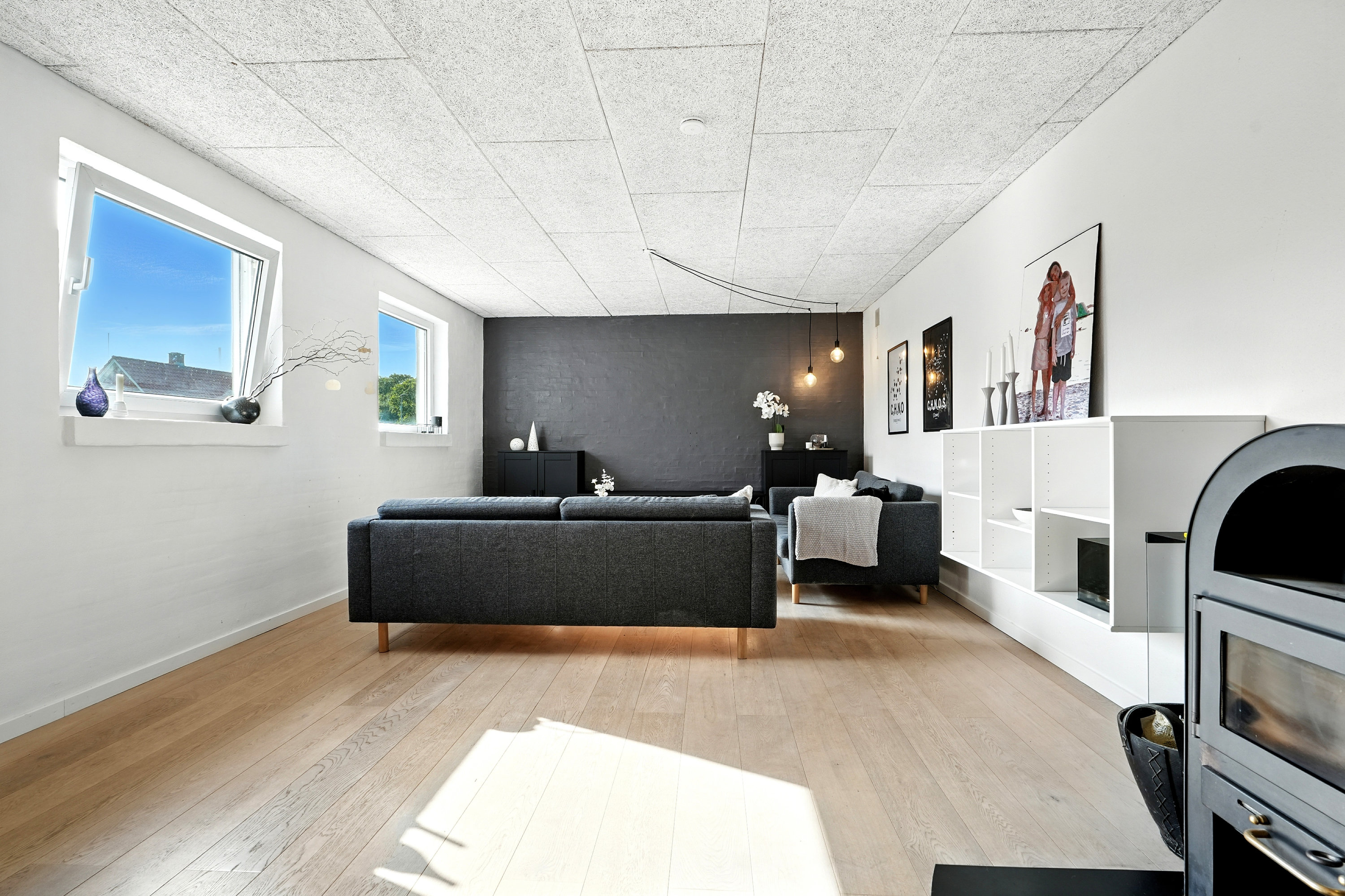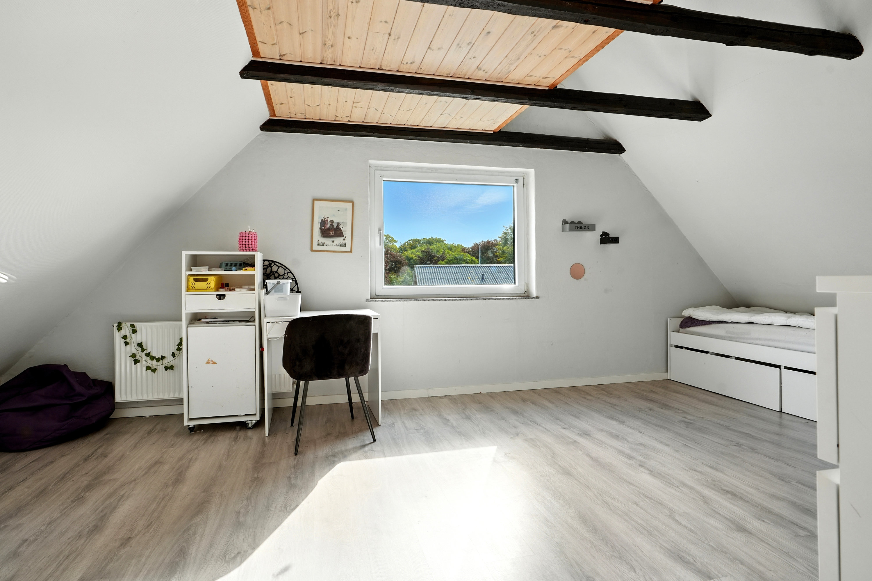 Til huset hører også en garage, som naturligvis kan bruges til bilen… men vi ved jo godt, at den nok ender som værksted, opbevaringsrum, fitnesscenter eller band-øvelokale. Mulighederne er uendelige – og du slipper i hvert fald for at skrabe is af ruderne til vinter.