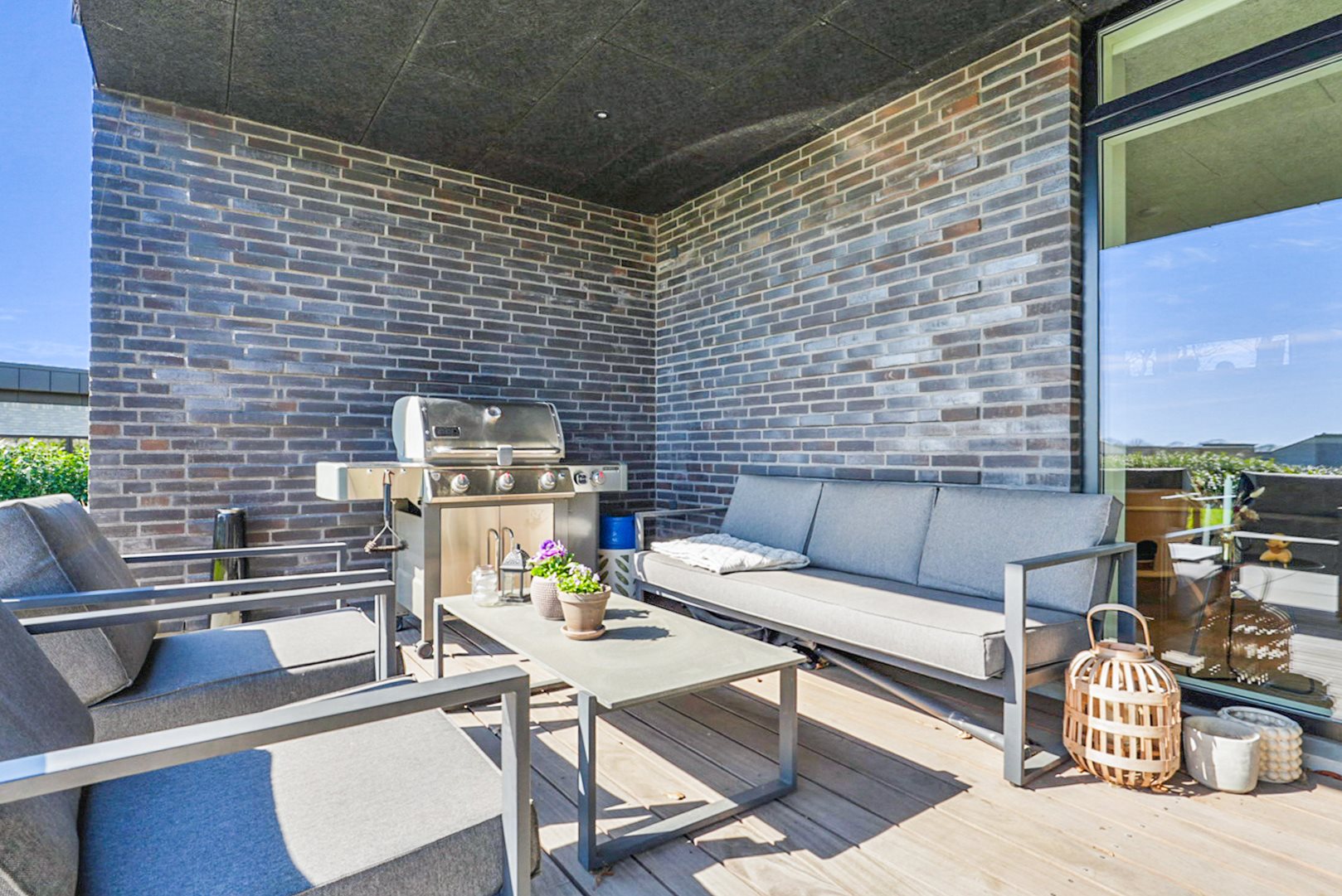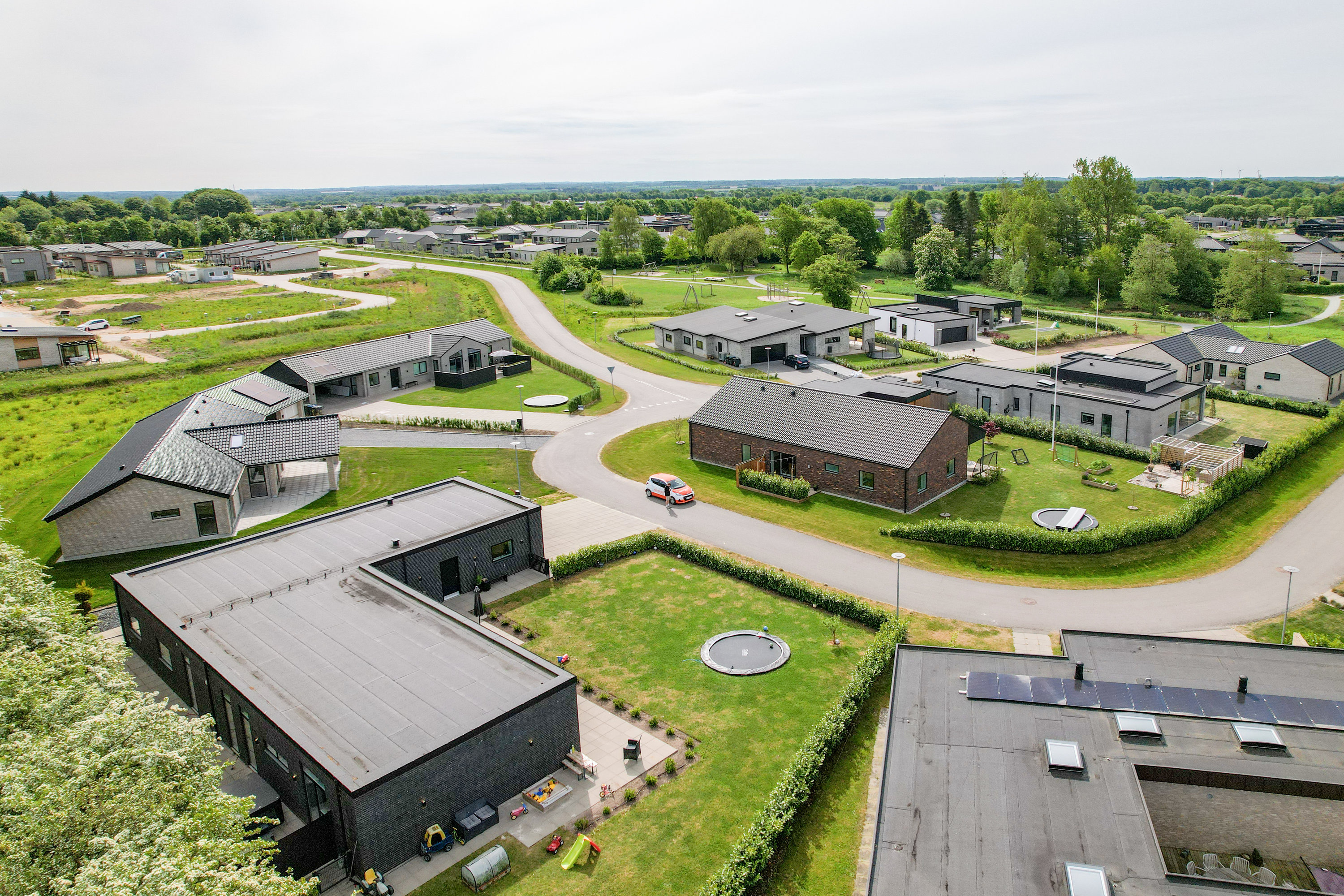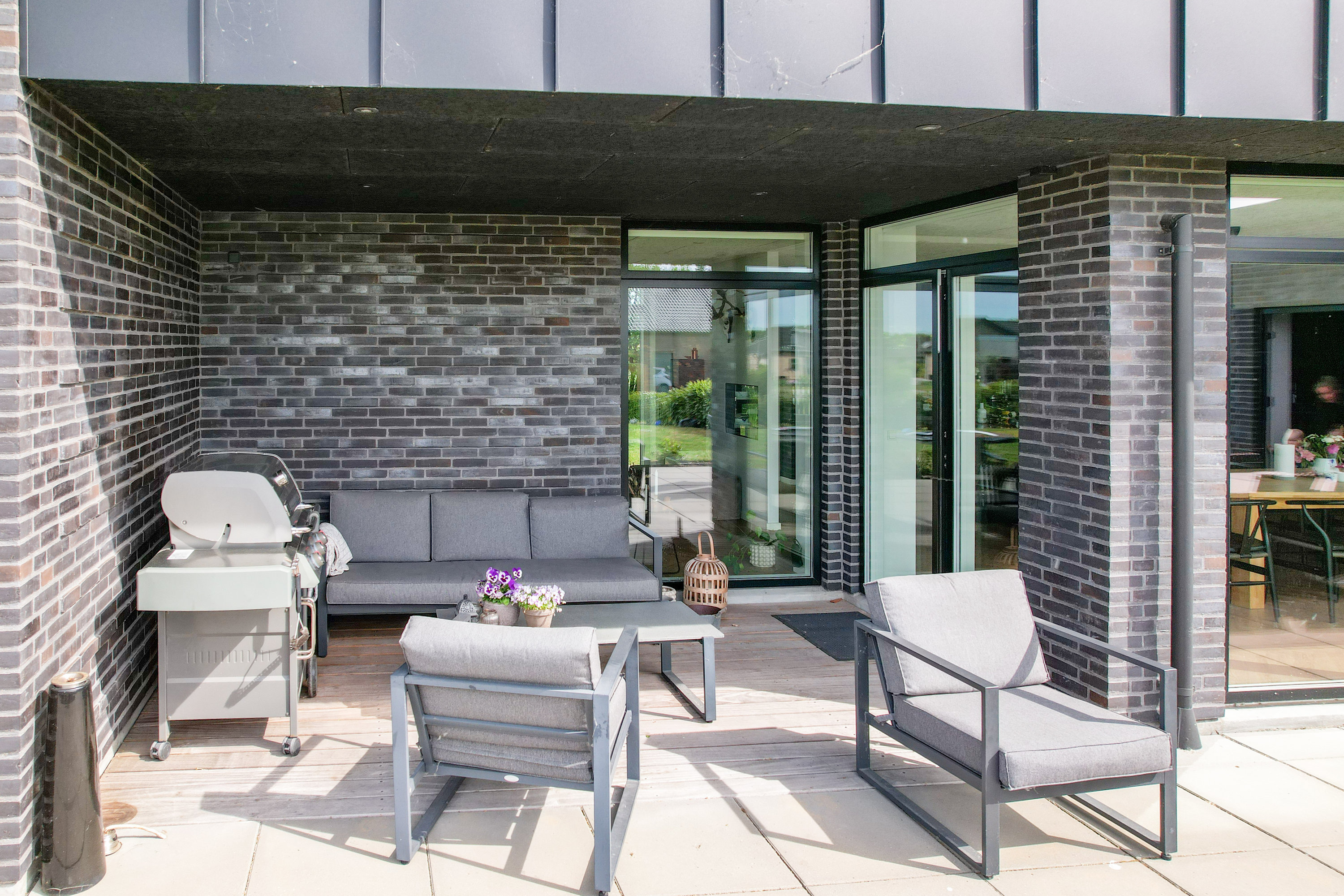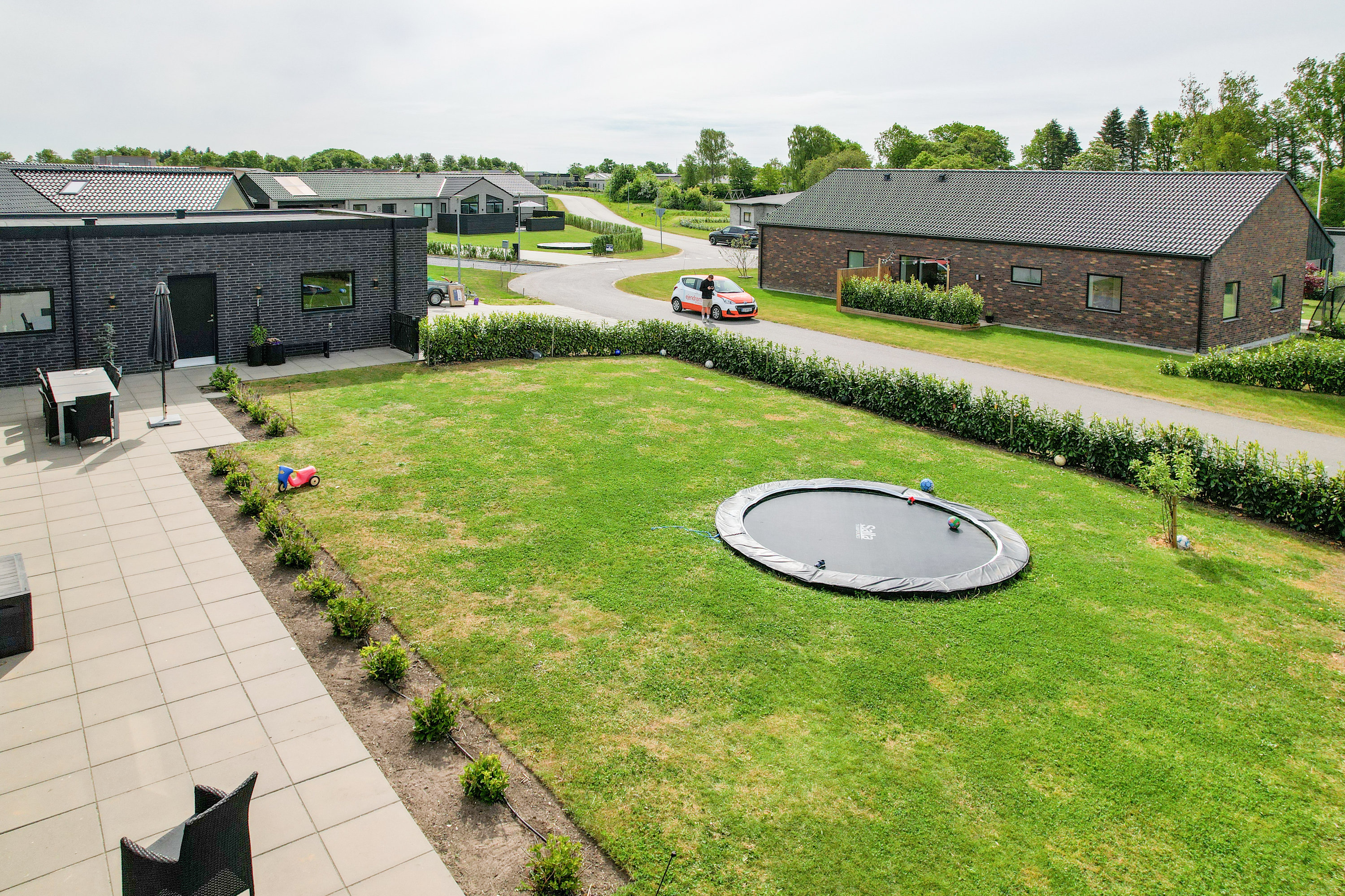 Udenfor venter en sydvendt og solrig have, der er anlagt med fokus på både funktion og æstetik. Her er plads til både leg, afslapning og hyggelige stunder med familie og venner – og med den overdækkede terrasse kan udelivet nydes i al slags vejr.