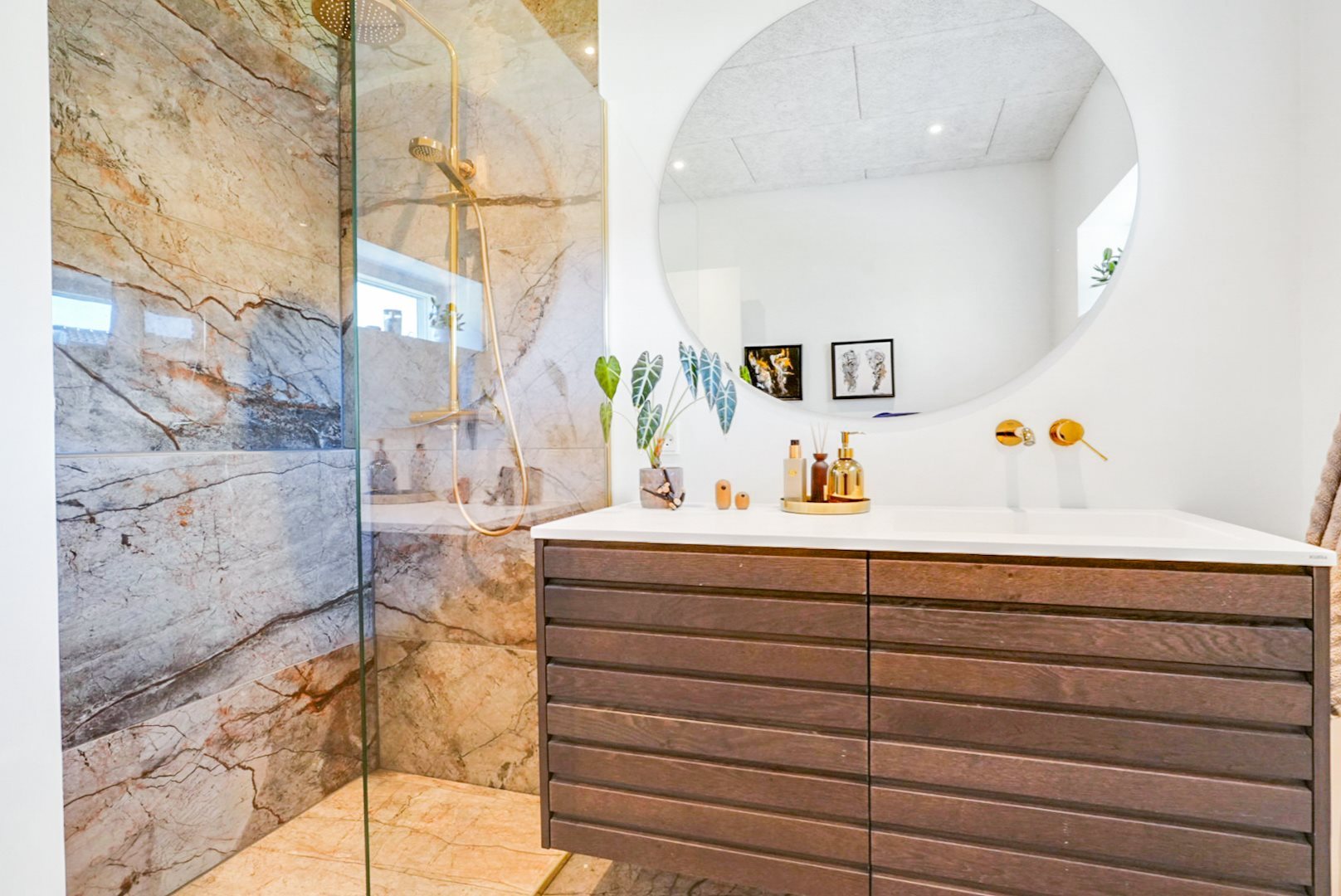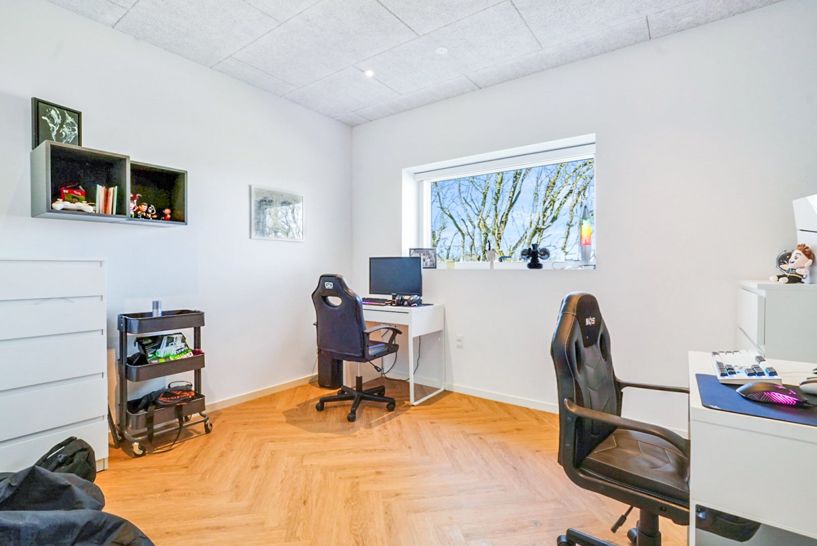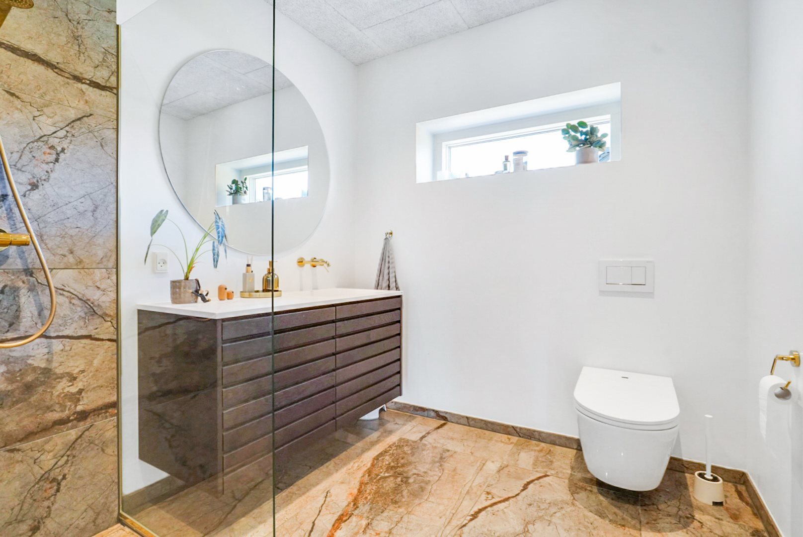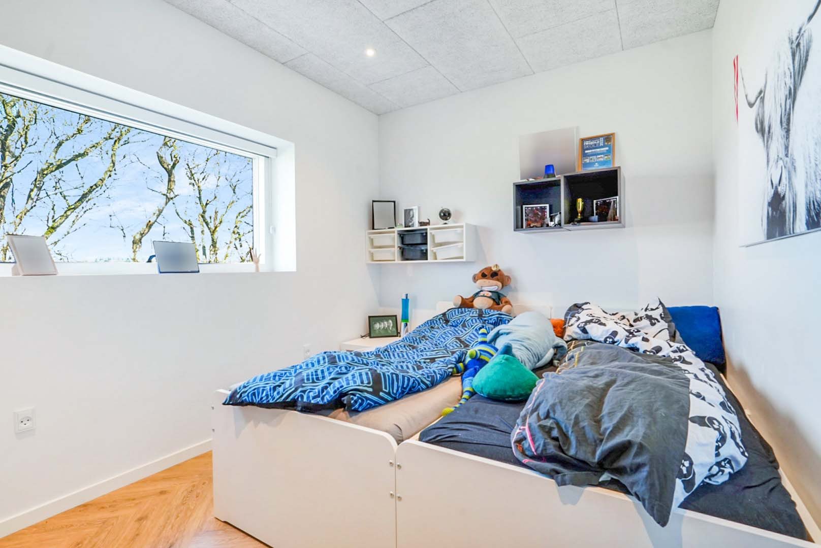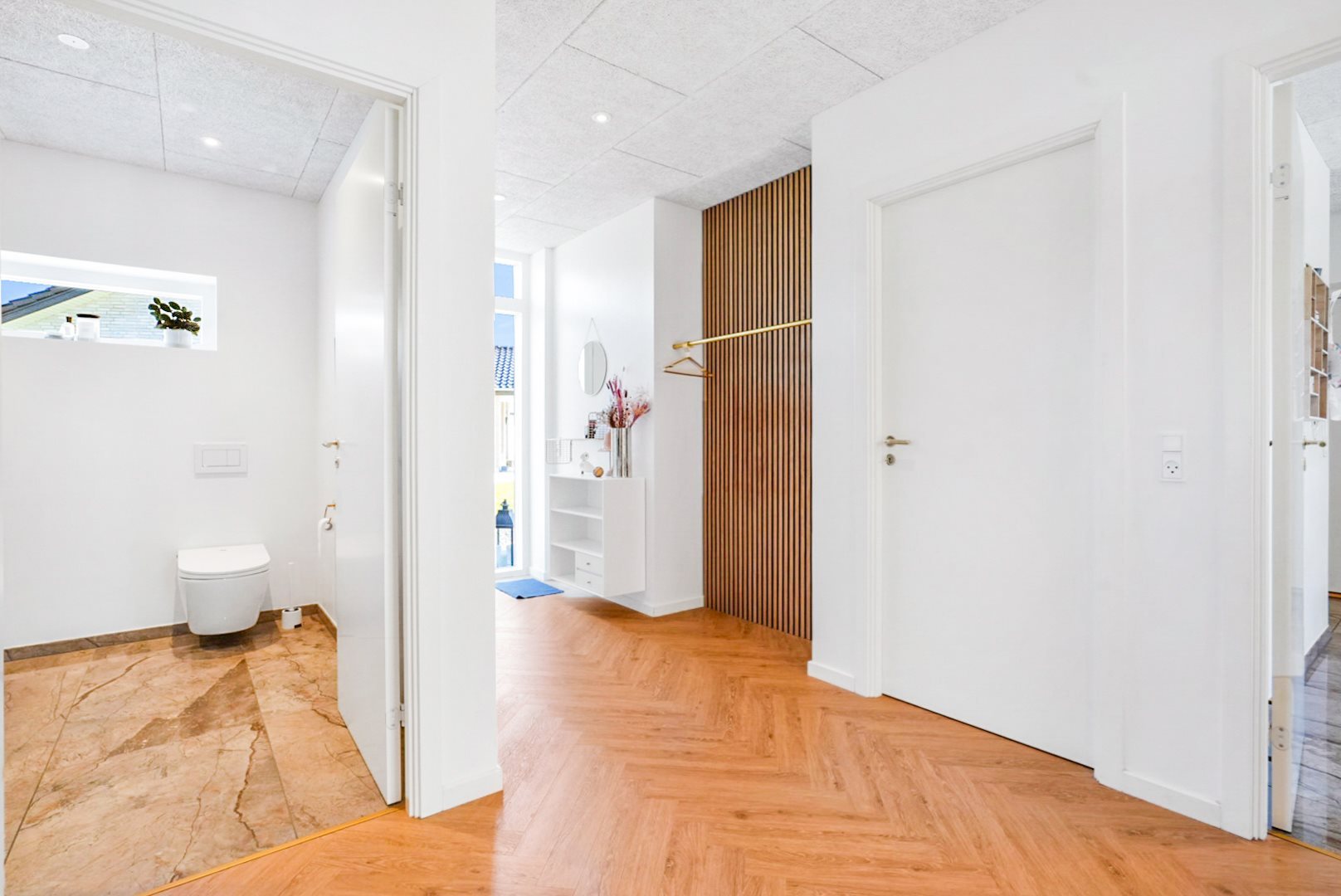 Stuen ligger let trukket tilbage og indbyder til ro og fordybelse med et smukt lysindfald og udsigt til haven. Forældreafdelingen er placeret separat og byder på soveværelse med walk-in og direkte adgang til eget badeværelse – en privat oase med hotelstemning. Derudover får du tre børneværelser, endnu et stilfuldt badeværelse, et rummeligt bryggers med direkte adgang til den store integrerede garage, samt et ekstra værelse, oplagt som kontor eller gæsteværelse.