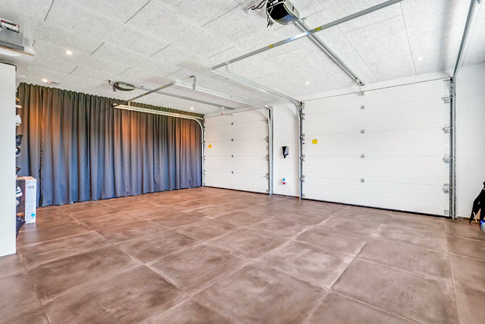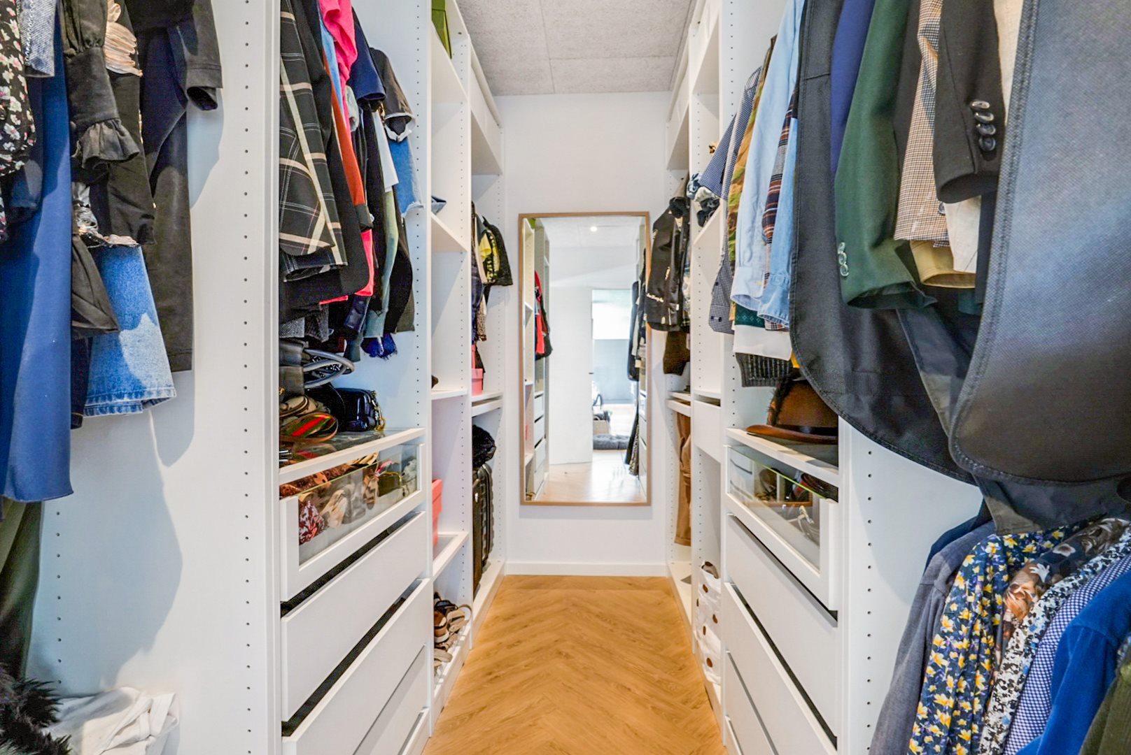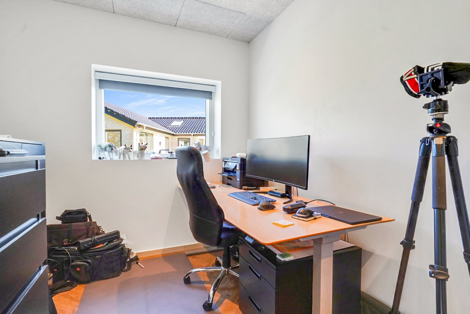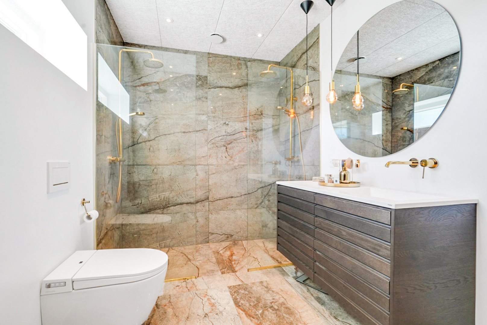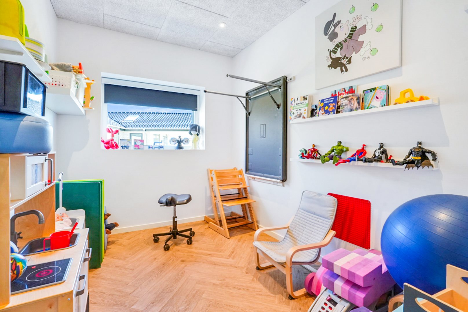 Stuen ligger let trukket tilbage og indbyder til ro og fordybelse med et smukt lysindfald og udsigt til haven. Forældreafdelingen er placeret separat og byder på soveværelse med walk-in og direkte adgang til eget badeværelse – en privat oase med hotelstemning. Derudover får du tre børneværelser, endnu et stilfuldt badeværelse, et rummeligt bryggers med direkte adgang til den store integrerede garage, samt et ekstra værelse, oplagt som kontor eller gæsteværelse.