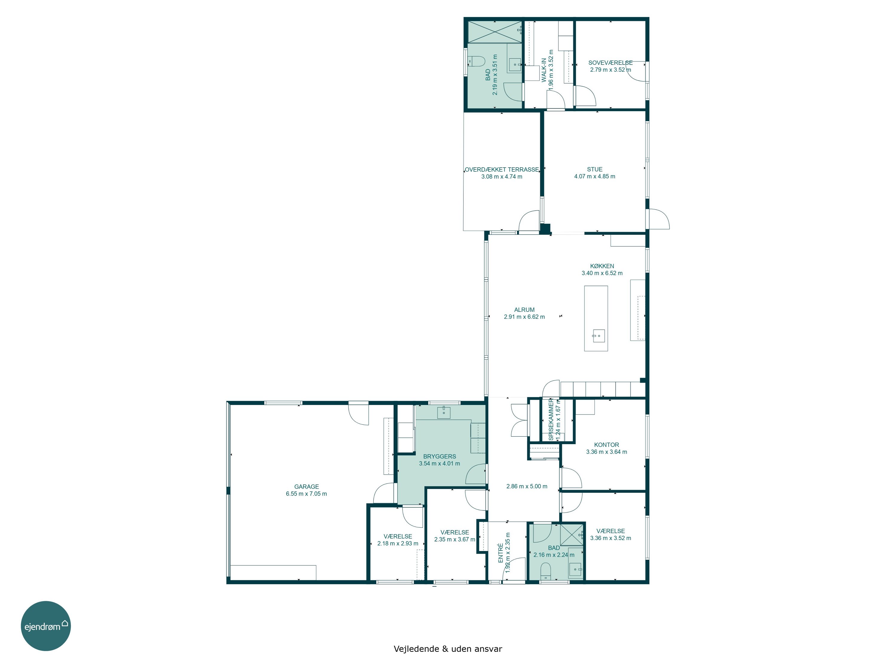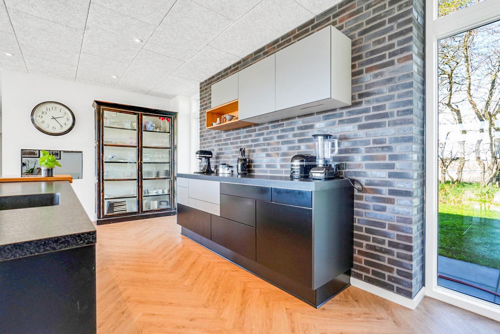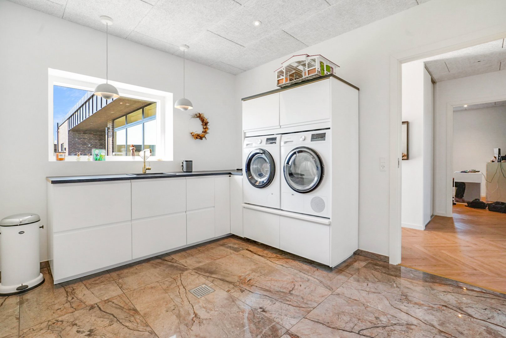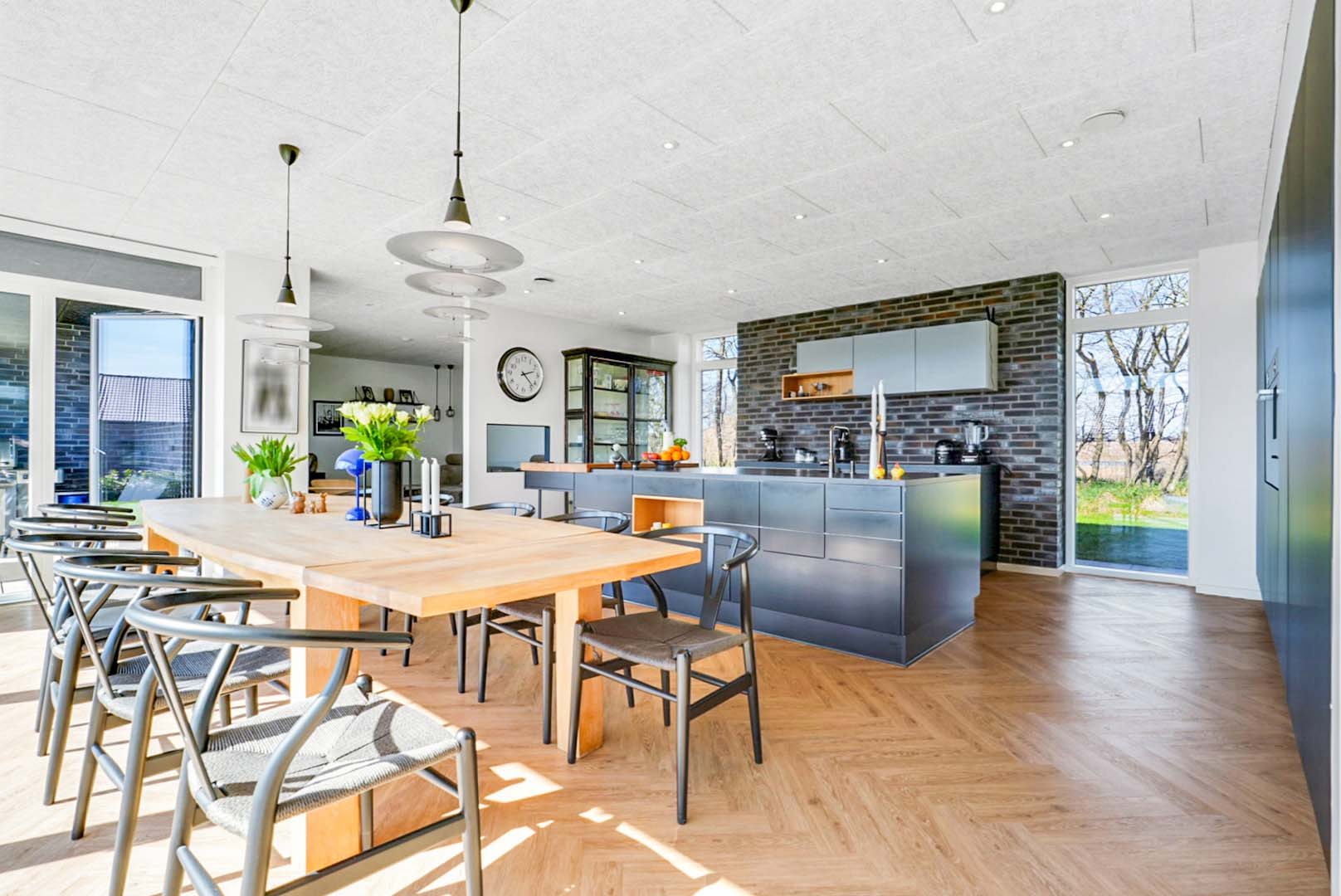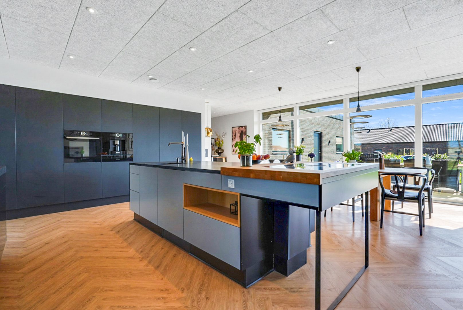 Villaen rummer hele 205 m² og fremstår med en gennemtænkt planløsning, der imødekommer den moderne families behov for både samvær og privatliv. Hjemmets naturlige samlingspunkt er det store, åbne køkken-alrum, hvor det elegante køkken med stor køkkenø, indbyggede løsninger og rene linjer skaber de perfekte rammer om både hverdagsmad og gæstemiddag. Herfra er der direkte adgang til en hyggelig og overdækket terrasse, som gør det nemt at forlænge sommeraftenerne udendørs.