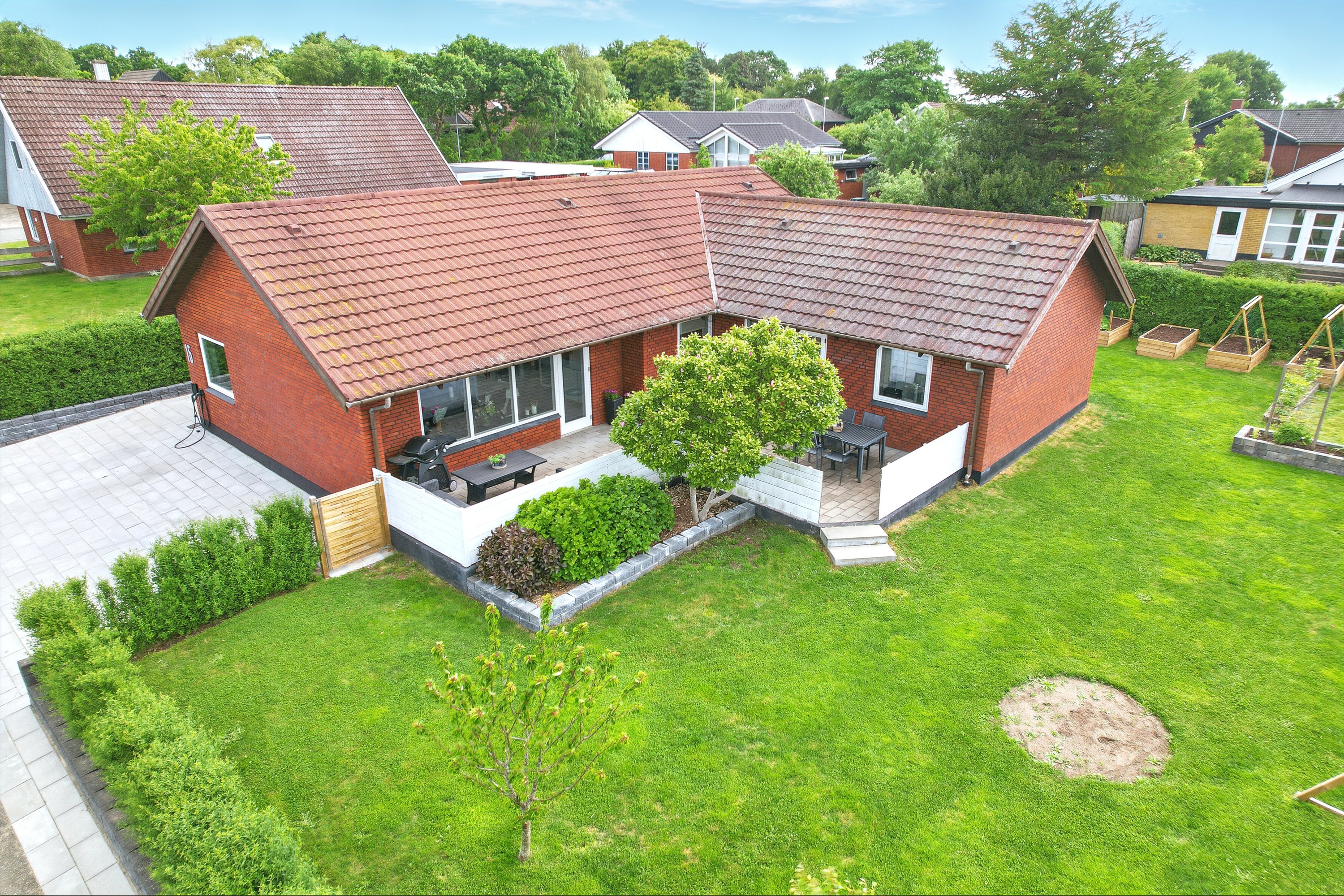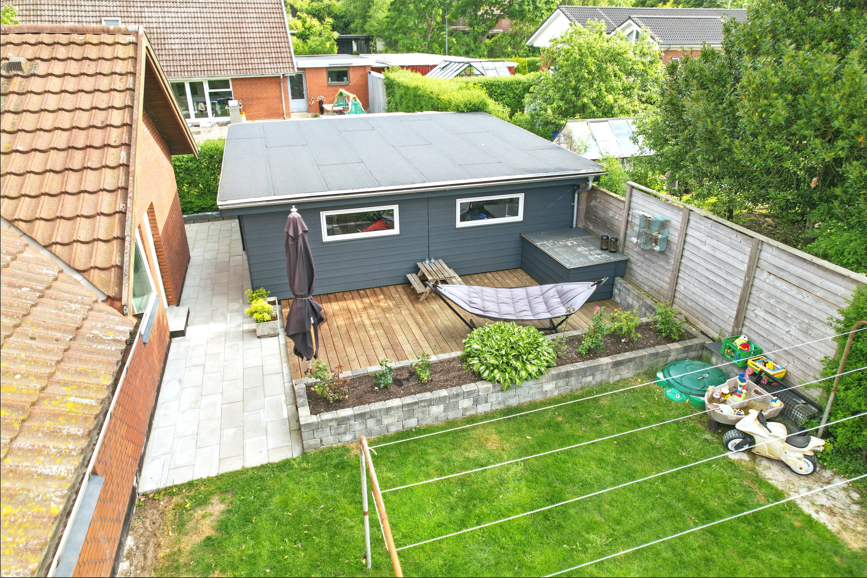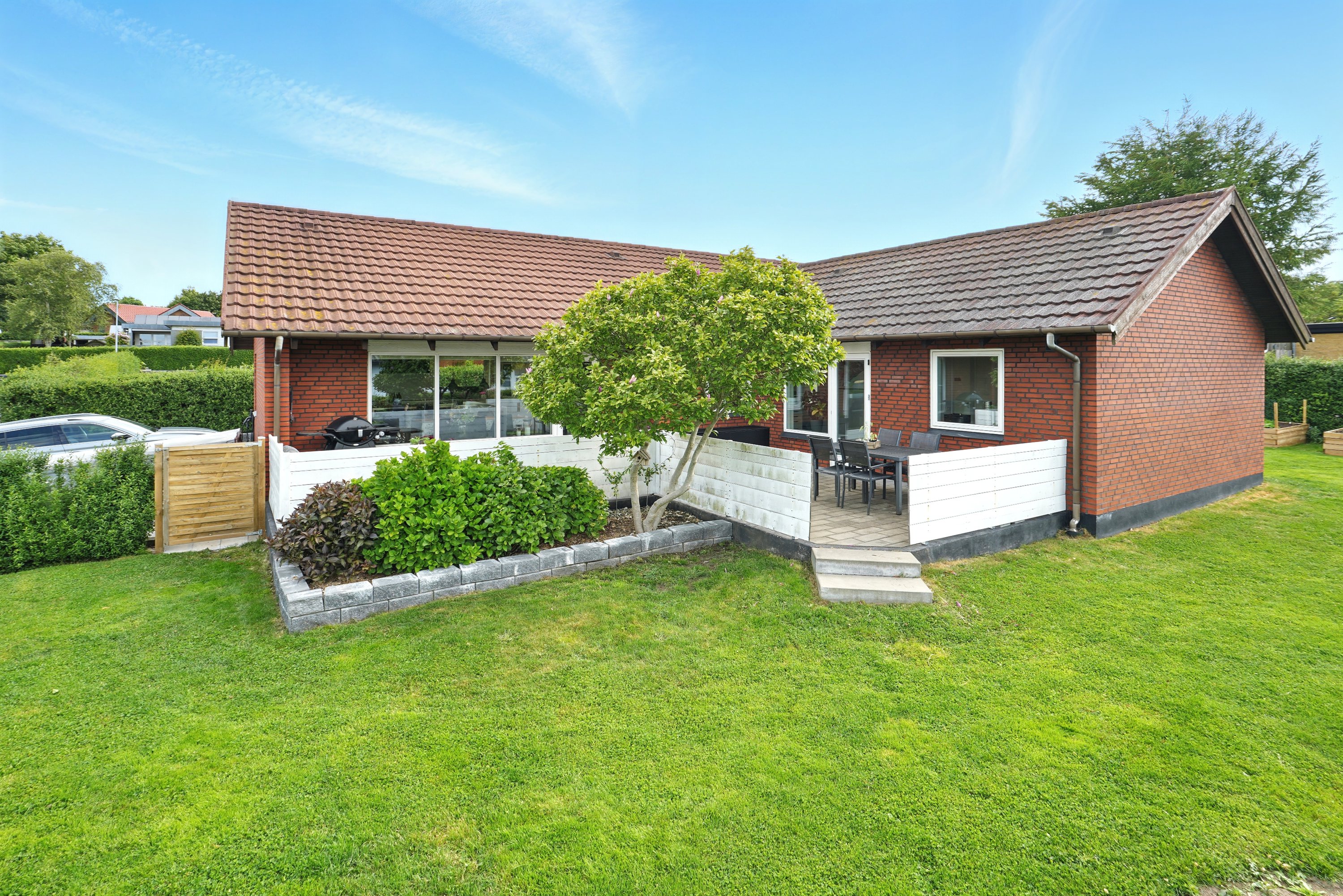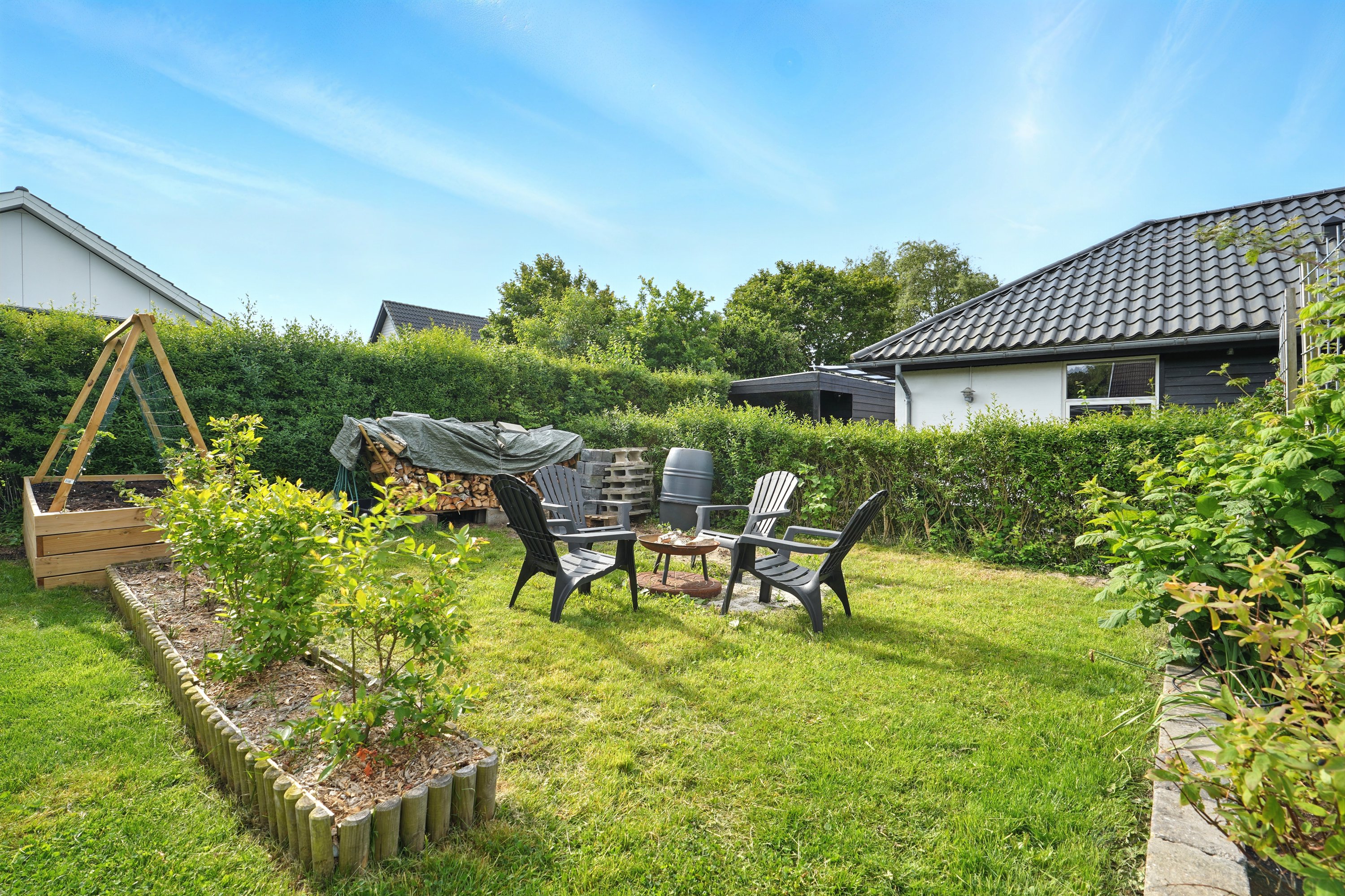 Haven er lukket og privat, perfekt til leg og afslapning. Fra køkken-alrummet er der direkte udgang til en hyggelig terrasse – ideel til sommerens grillaftener.