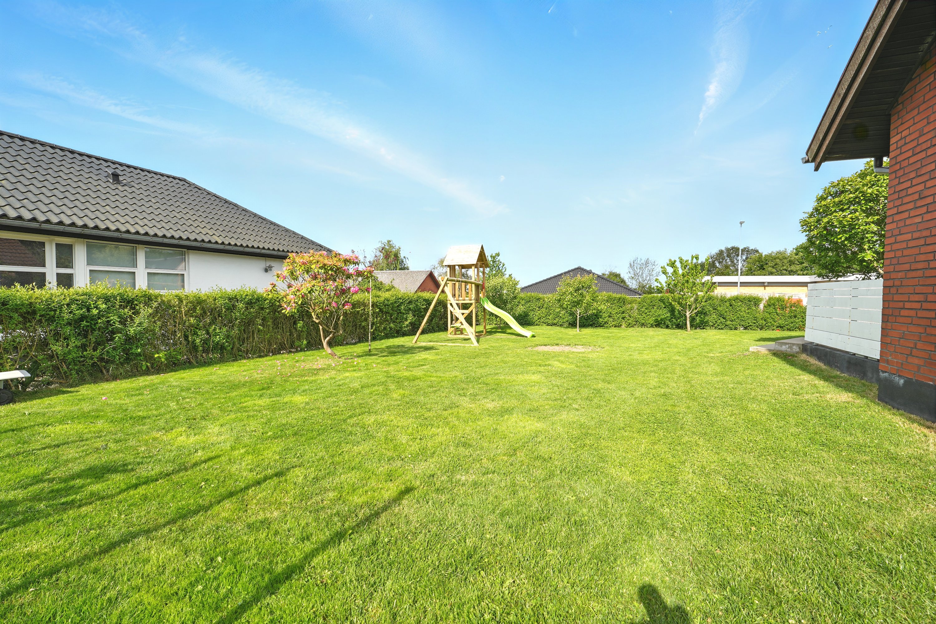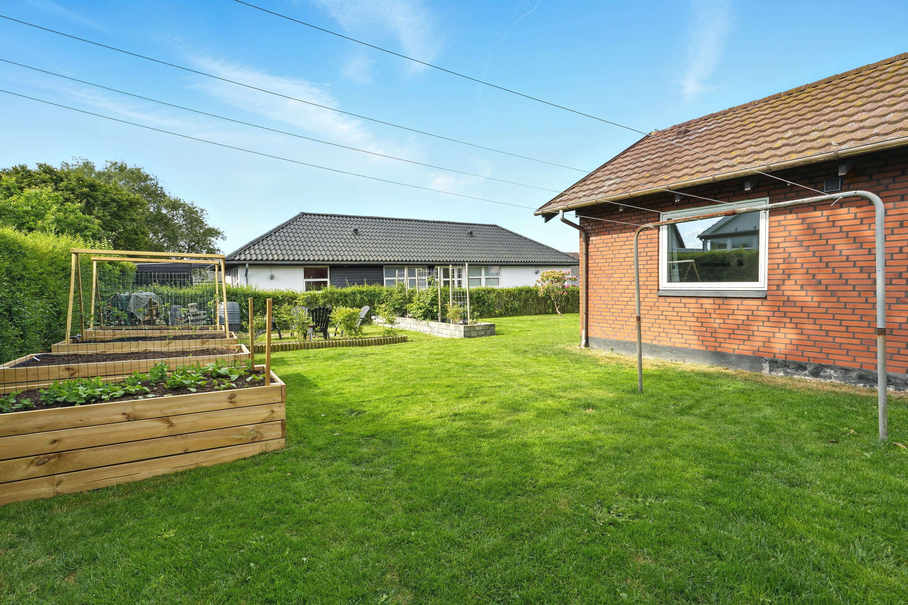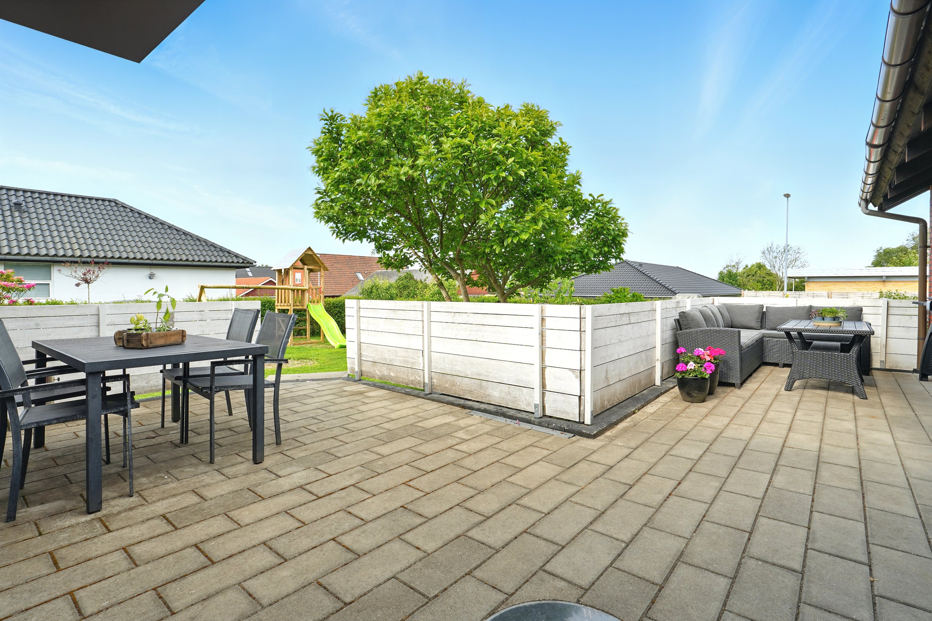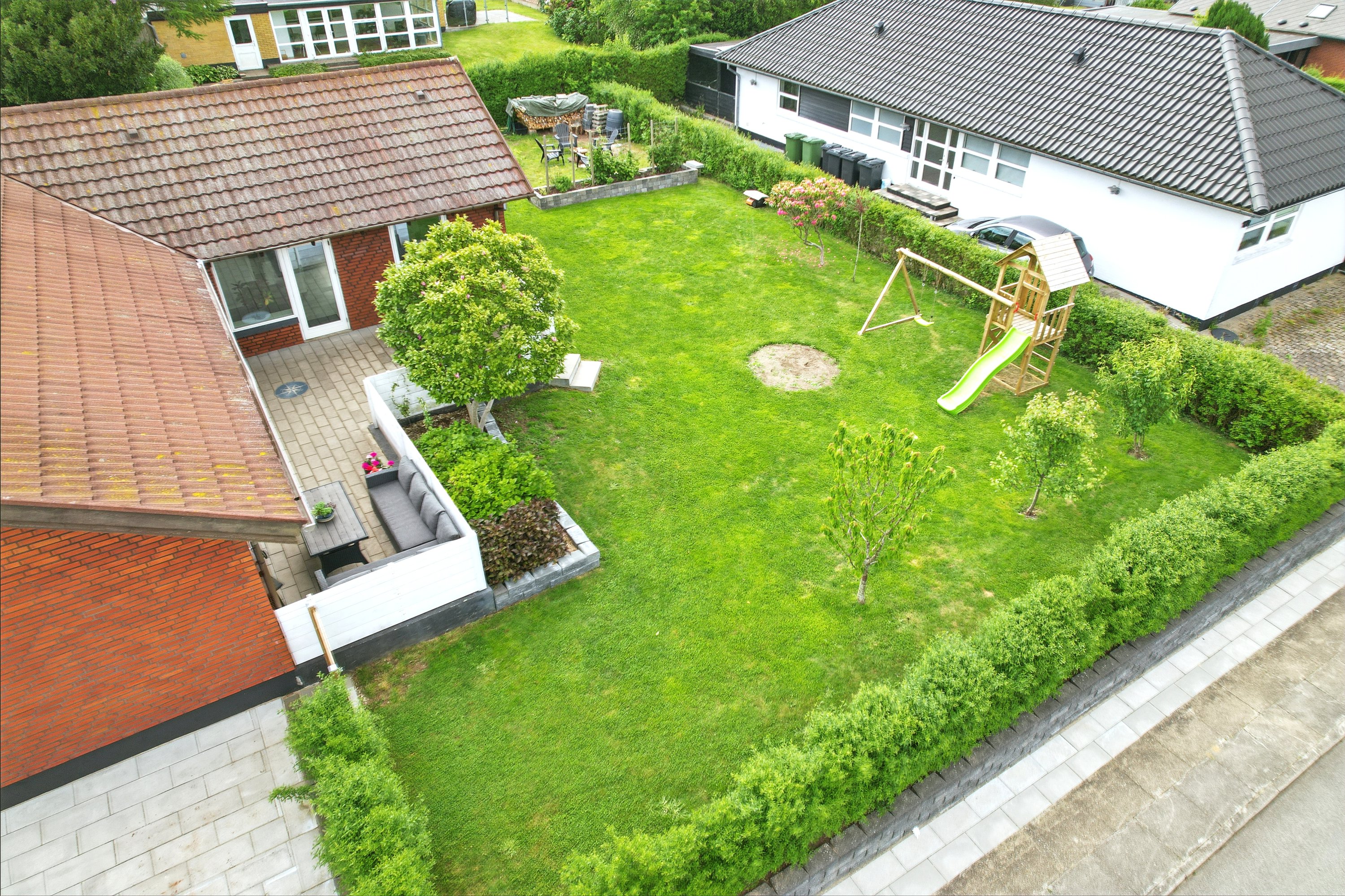 Haven er lukket og privat, perfekt til leg og afslapning. Fra køkken-alrummet er der direkte udgang til en hyggelig terrasse – ideel til sommerens grillaftener.