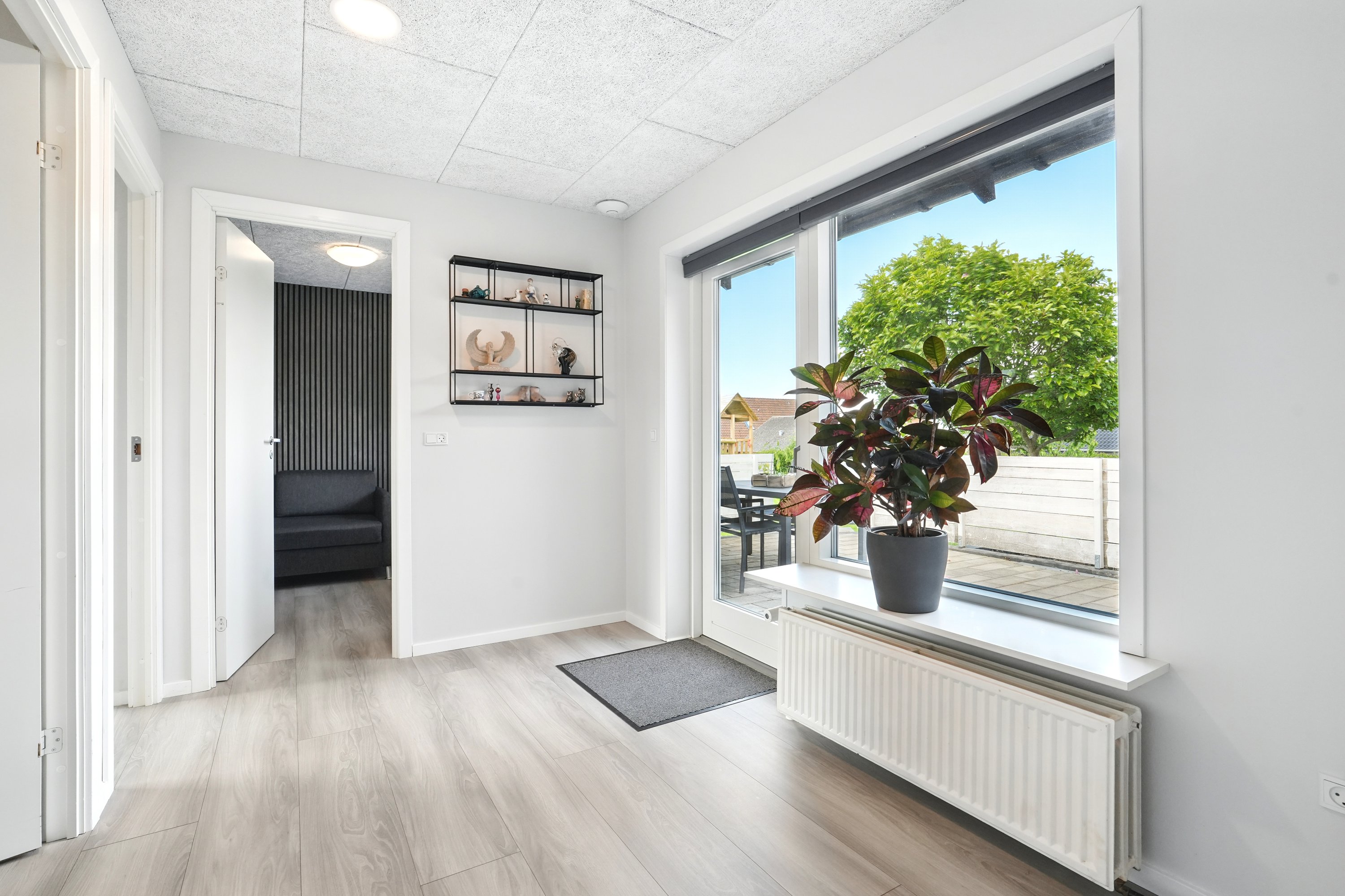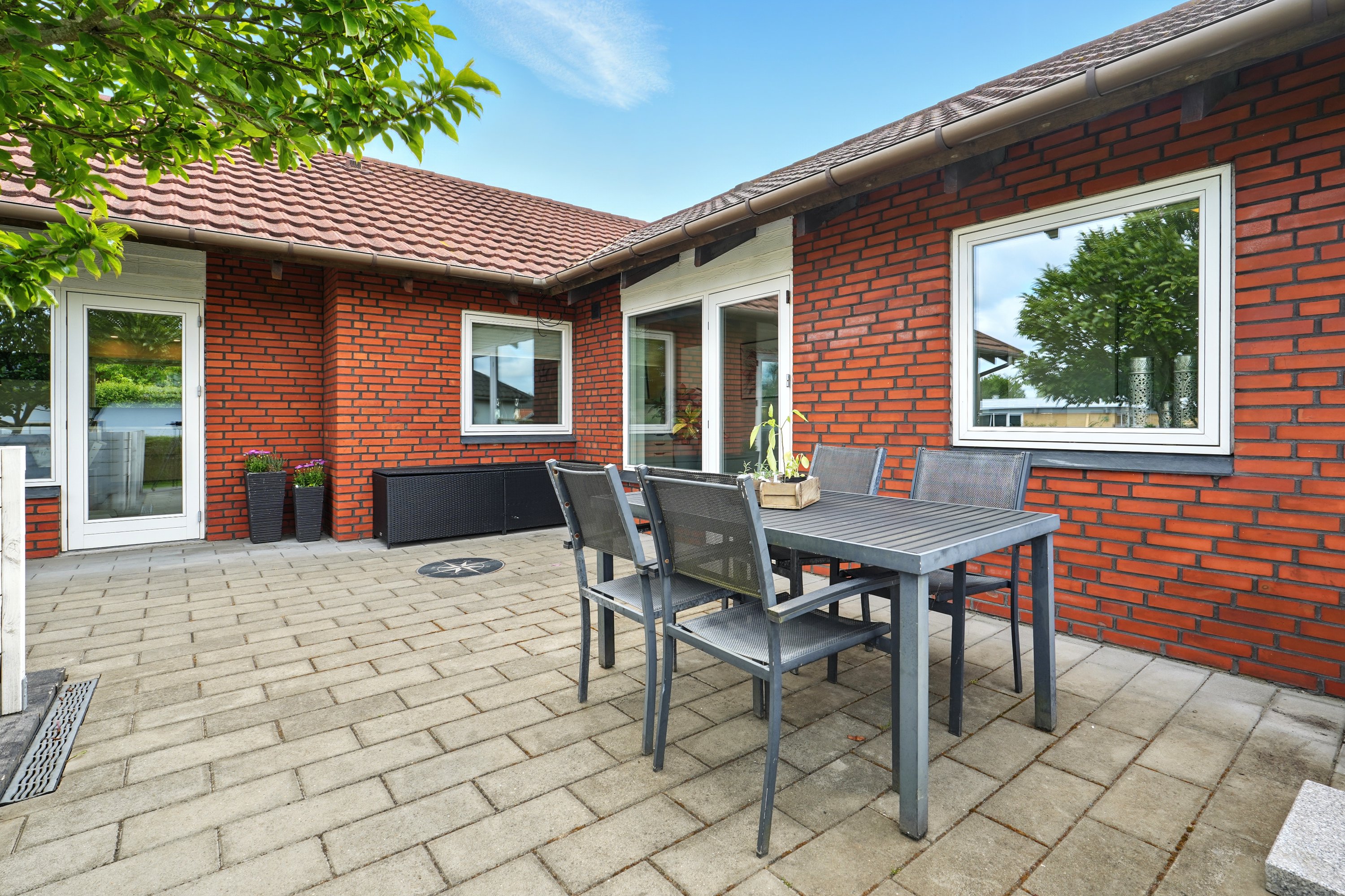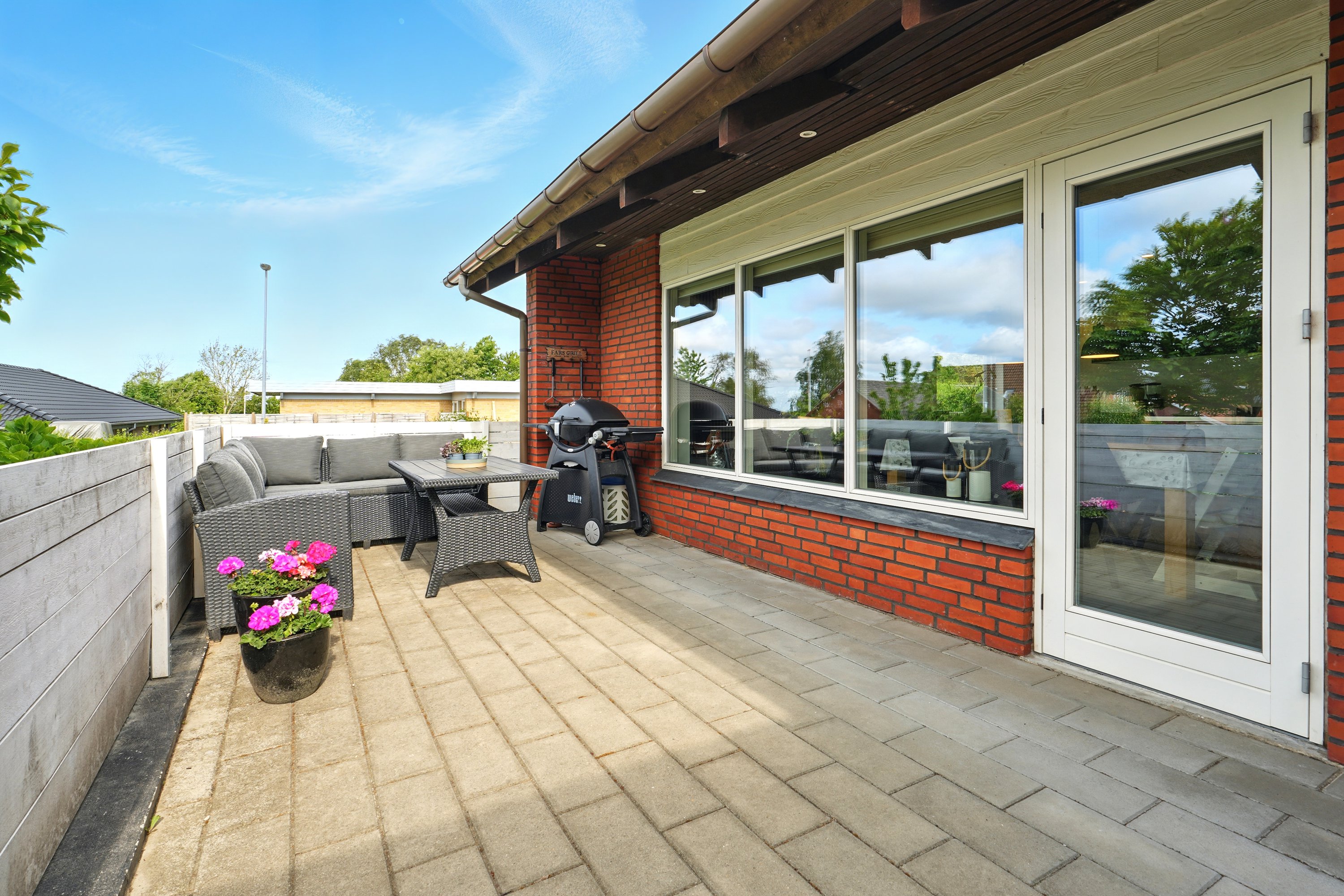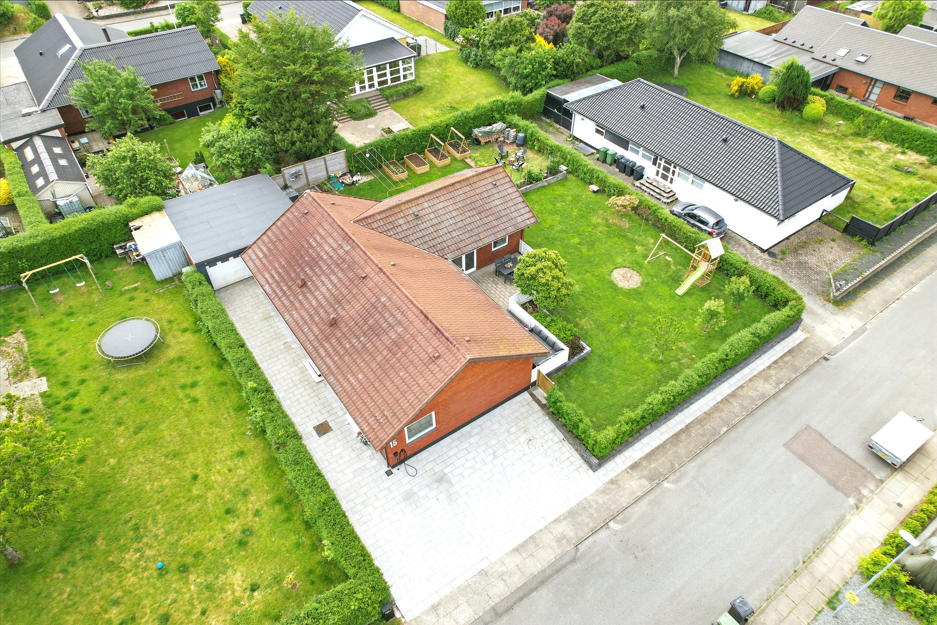 Haven er lukket og privat, perfekt til leg og afslapning. Fra køkken-alrummet er der direkte udgang til en hyggelig terrasse – ideel til sommerens grillaftener.