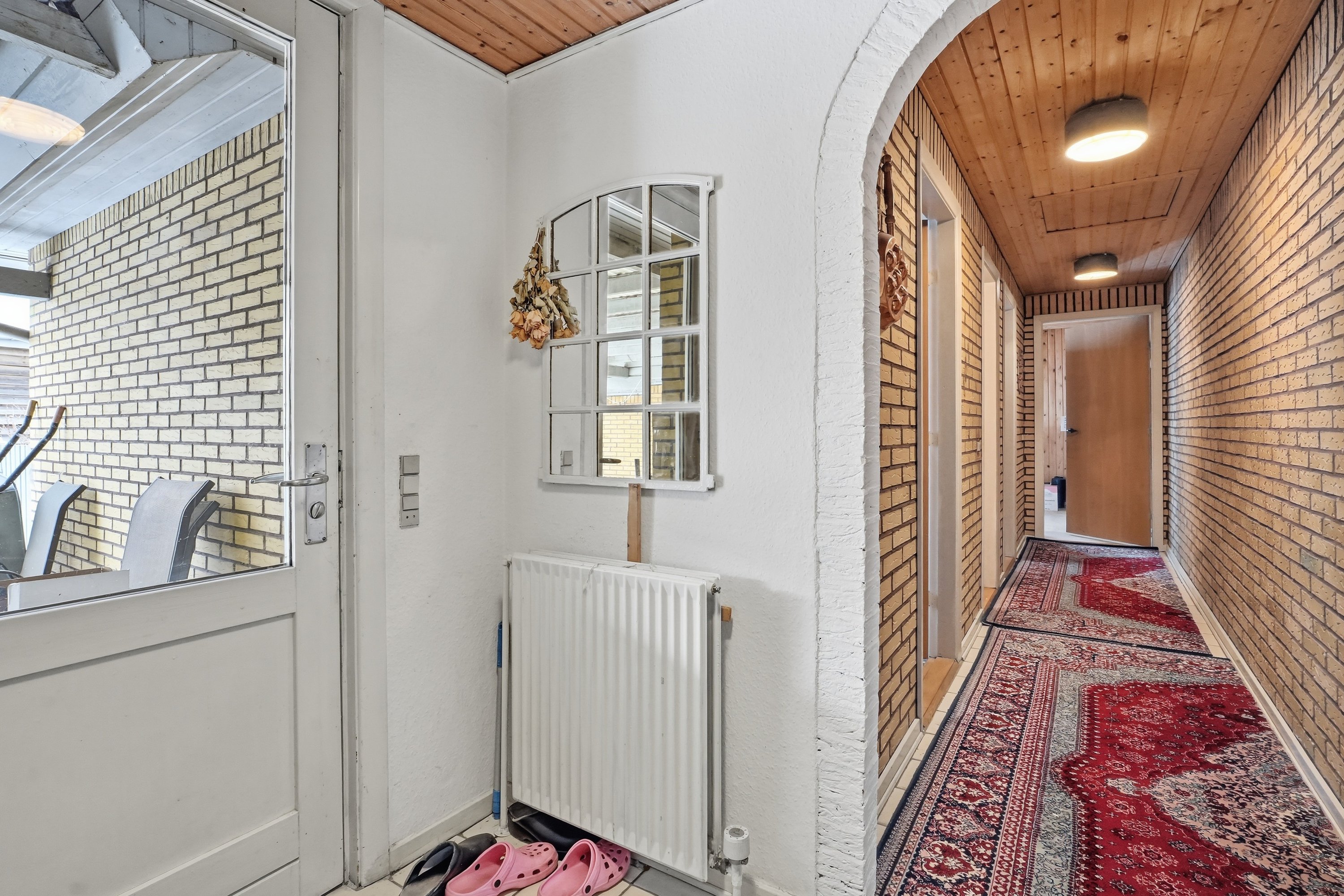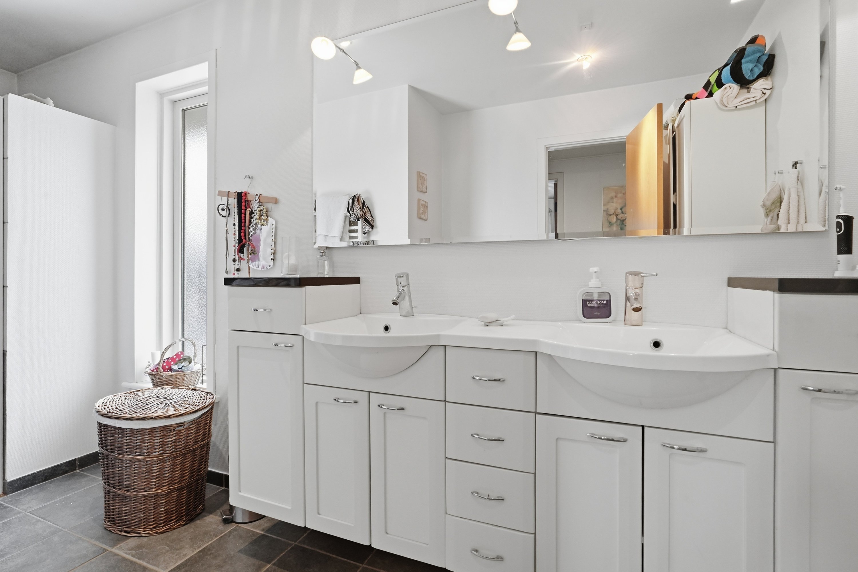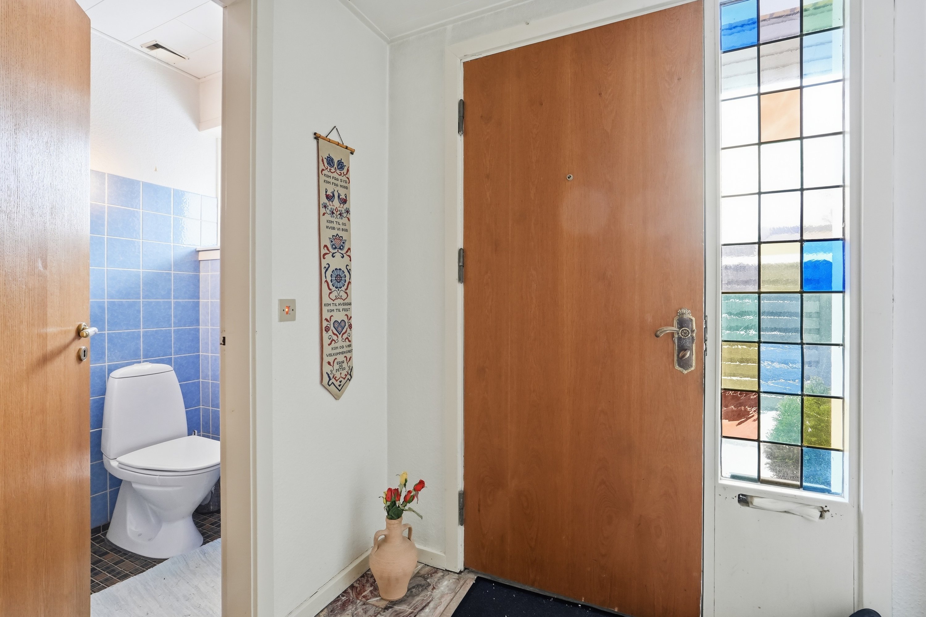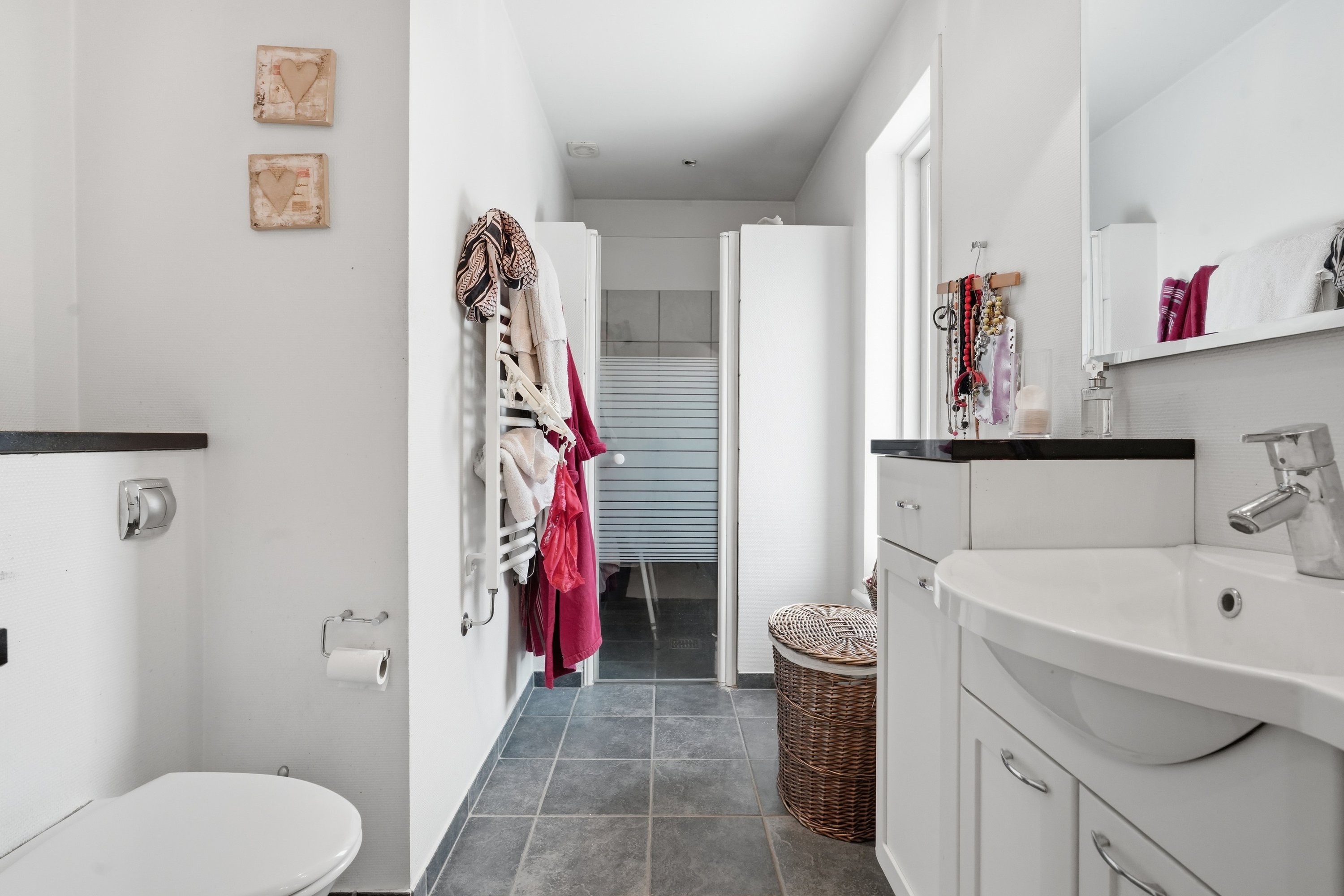 Indretningen byder på en nydelig gæsteentré, hvorfra der er en gæstetoilet. Fra fordelingsgangen er der to store værelser, hvortil der er et walk-in-closet. Badeværelset er lyst og rummeligt – her er der naturligvis gulvvarme og bruseniche.