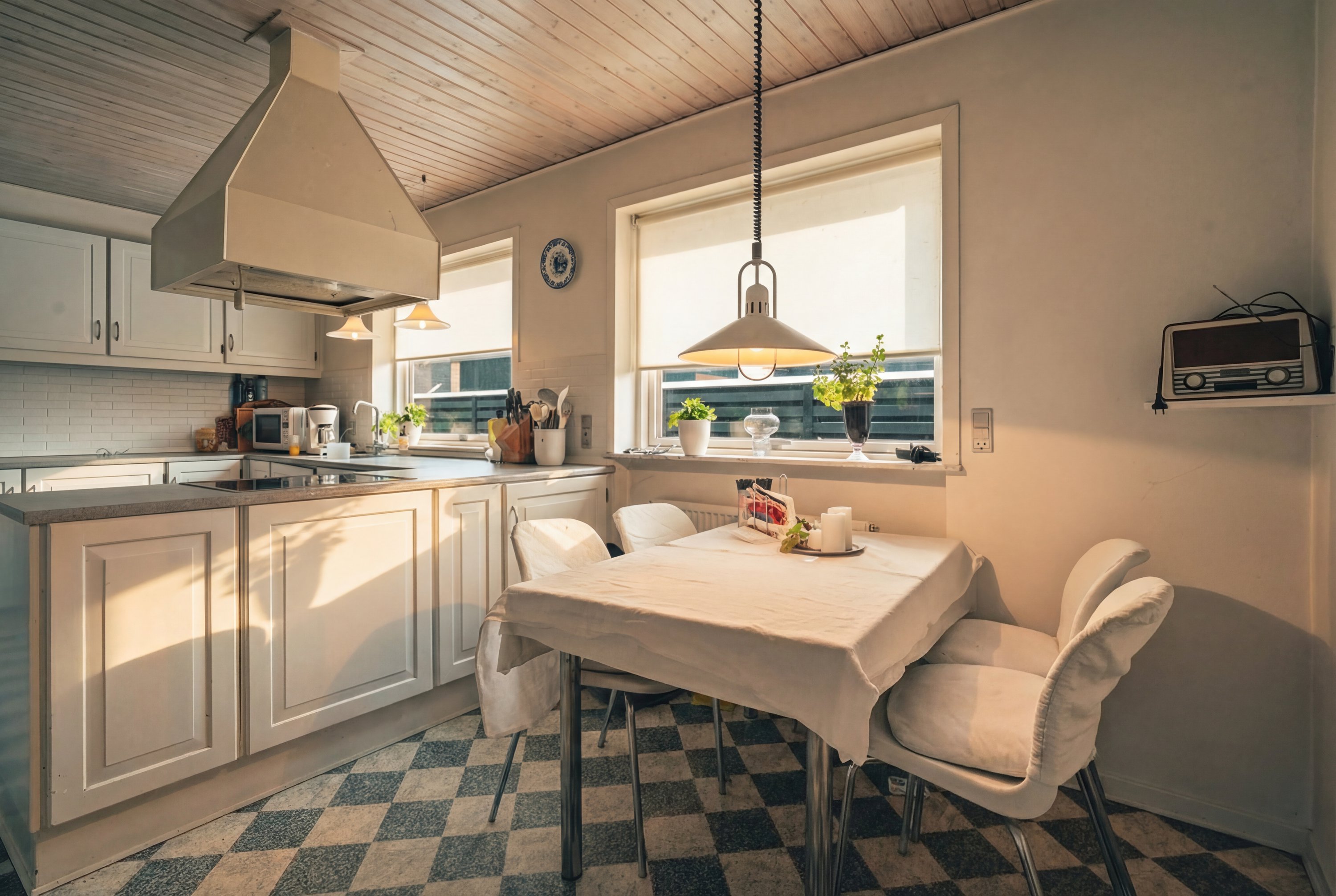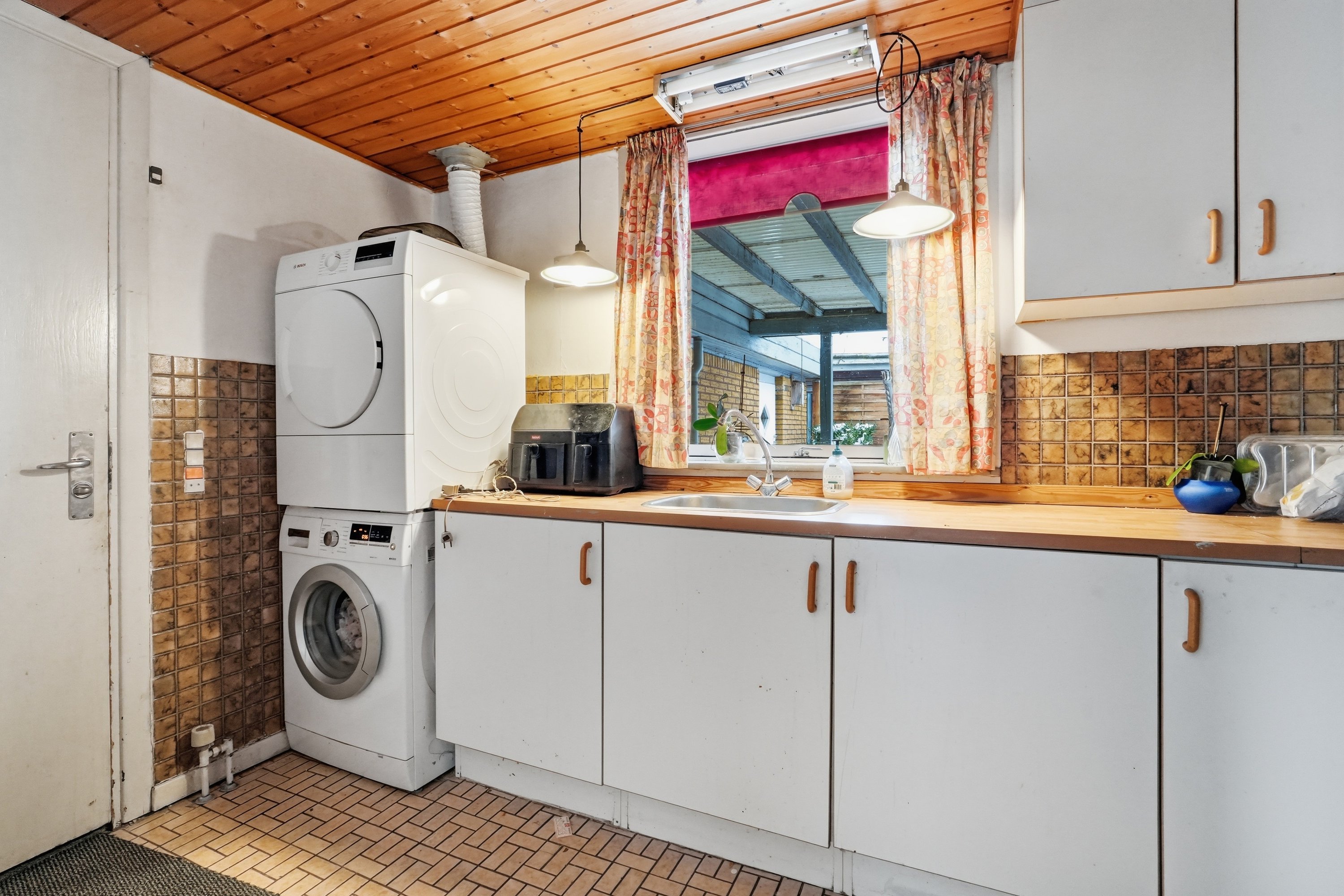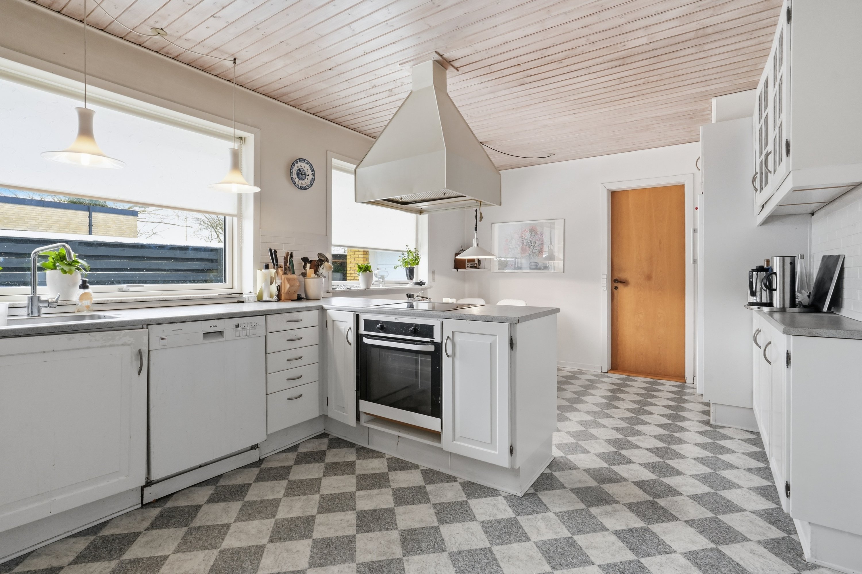 Køkkenet indeholder god bordplads, samt spiseplads. Her er der rig mulighed for at åbne op til stuen og derved skabe et lyst og moderne køkken/alrum. Fra stuen har man direkte udgang til have og terrasse, samt nedgang til en hyggelig opholdsstue med pejs.