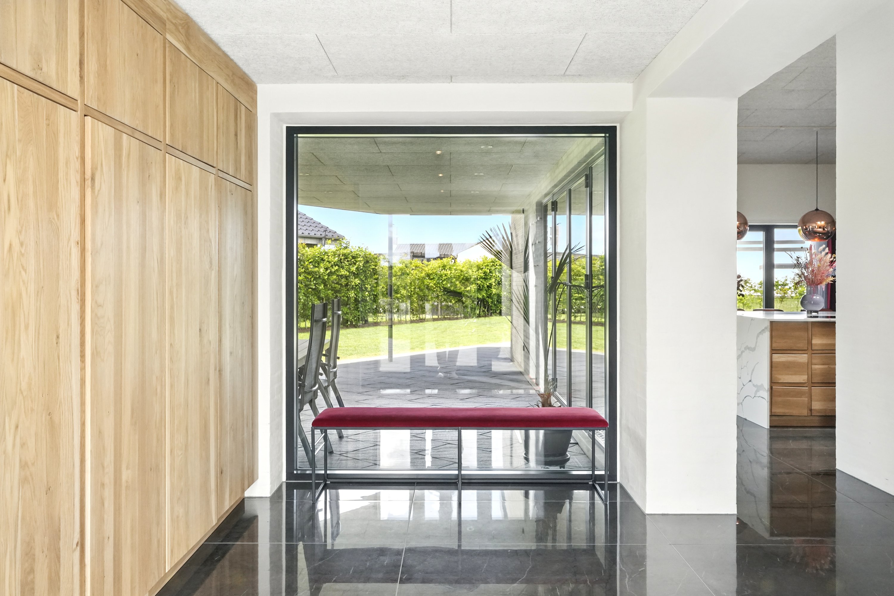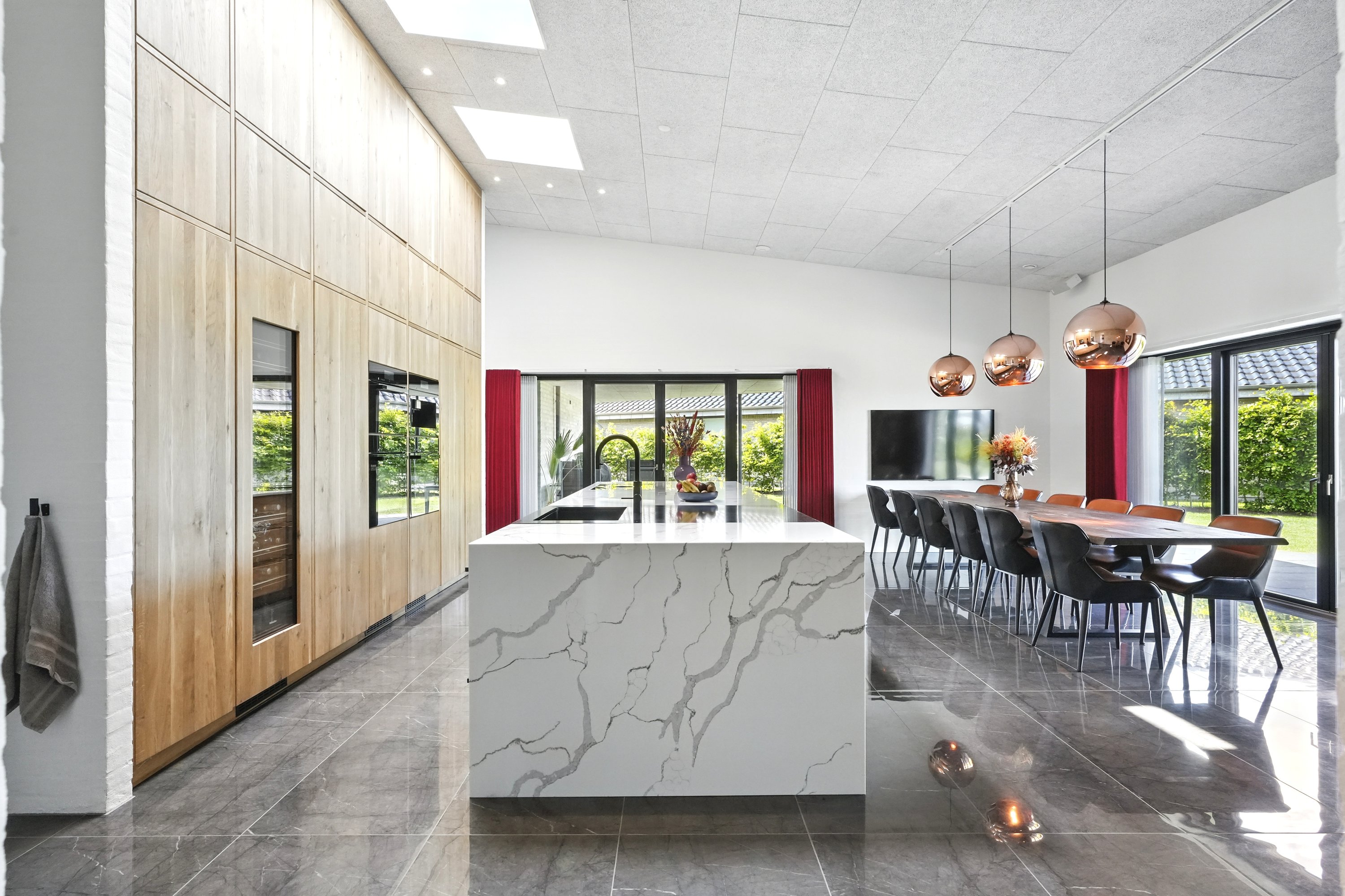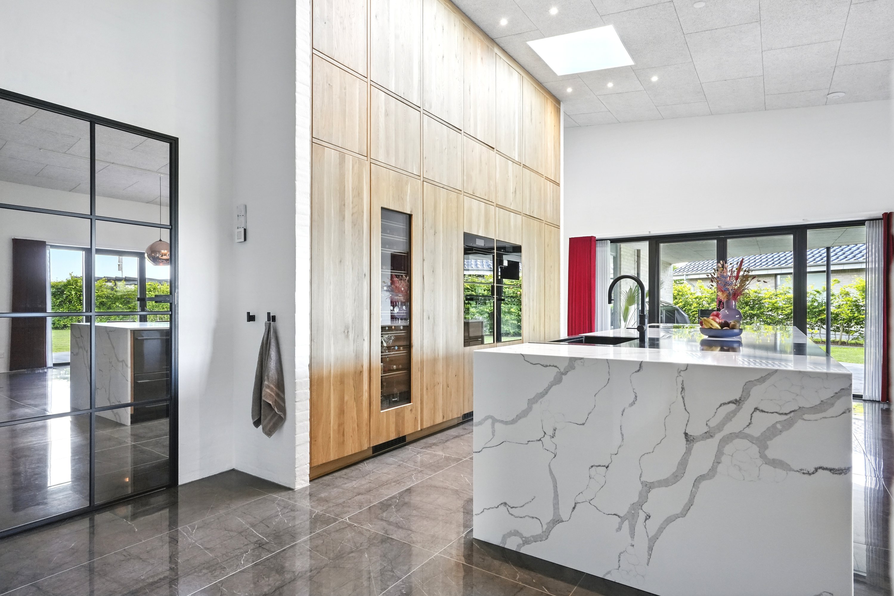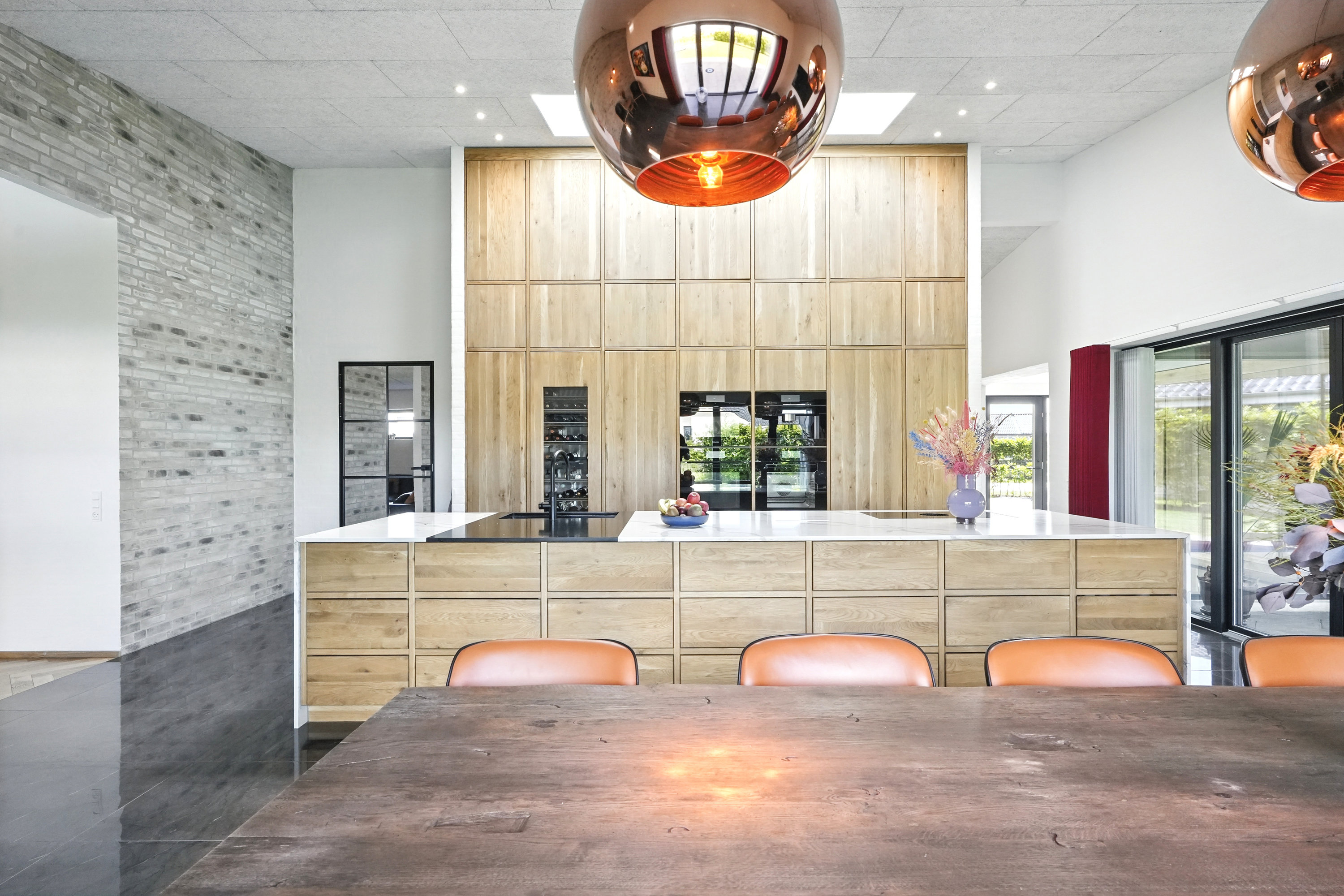 Boligen er arkitekttegnet og indrettet med massive egetræsinventarer gennem hele huset, elegant tilpasset loftshøjde for en harmonisk og gennemført stil. Det store, åbne køkken-alrum er husets naturlige samlingspunkt og ideelt til både hverdagsliv og større sammenkomster. Her er alt i hårde hvidevarer, herunder tre ovne, indbygningskaffemaskine, skuffeopvaskemaskine og Quooker med Cube. Bryggerset er smart gemt bag køkkenet, så funktionalitet og æstetik forenes på fineste vis.