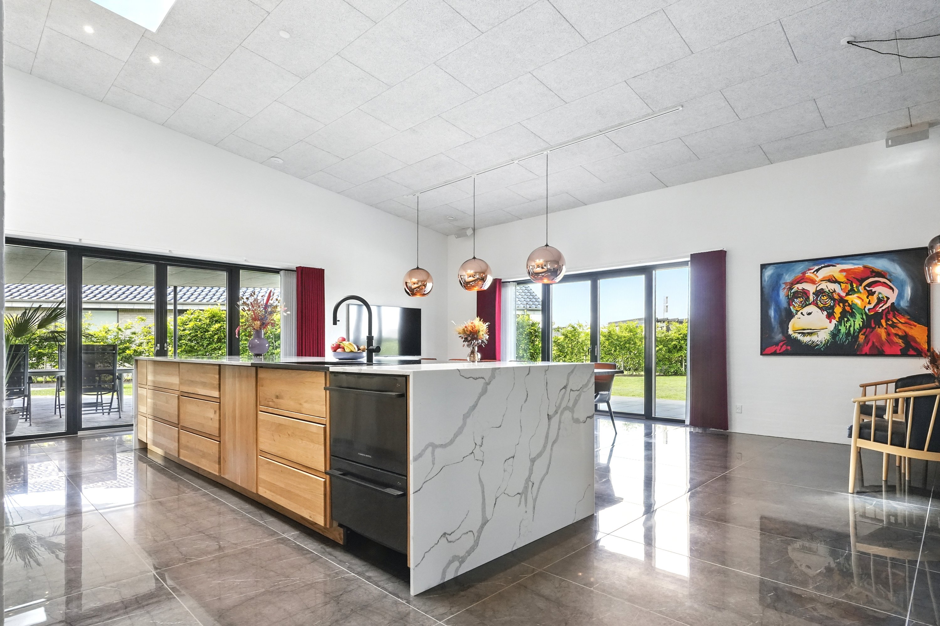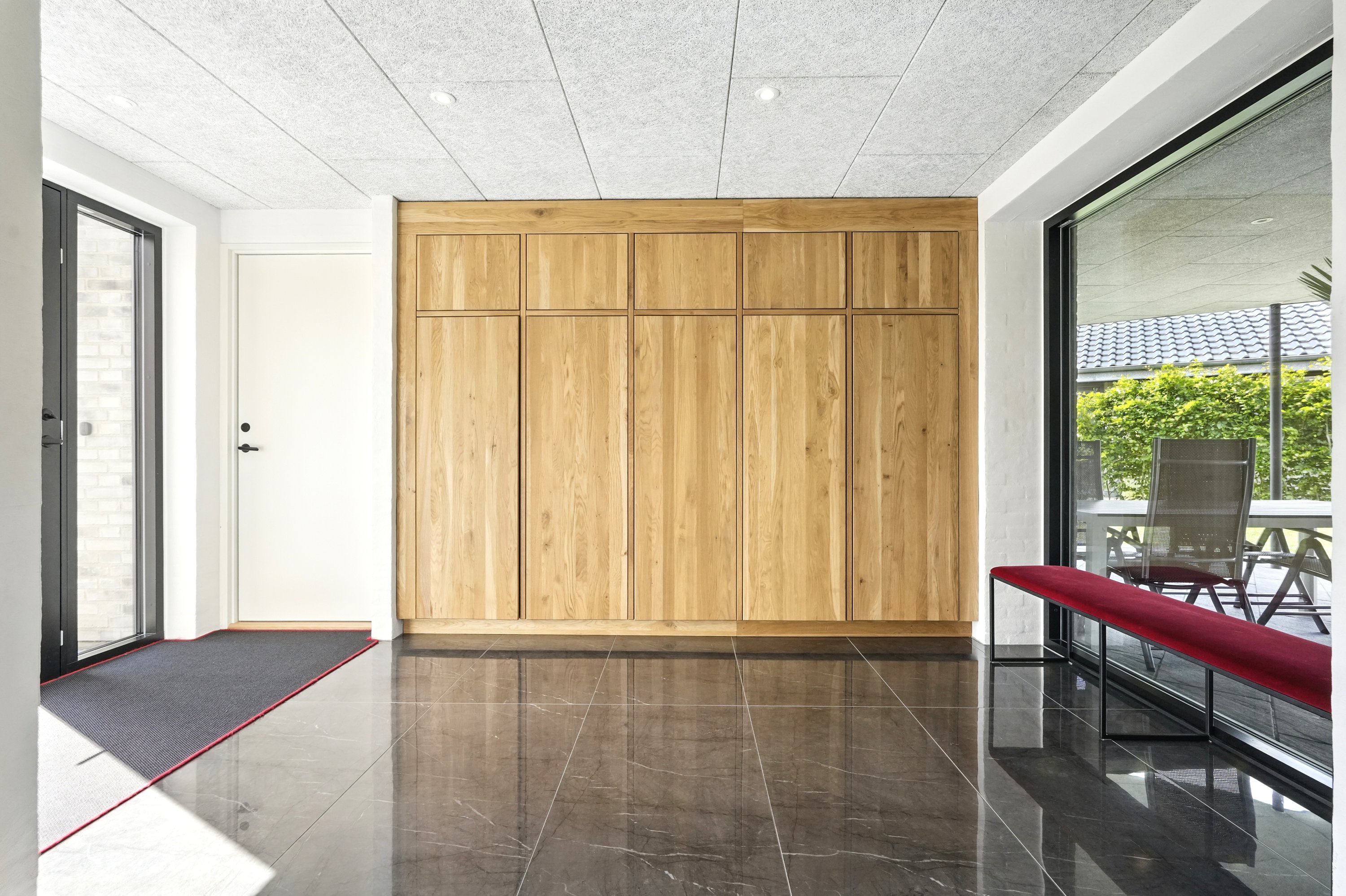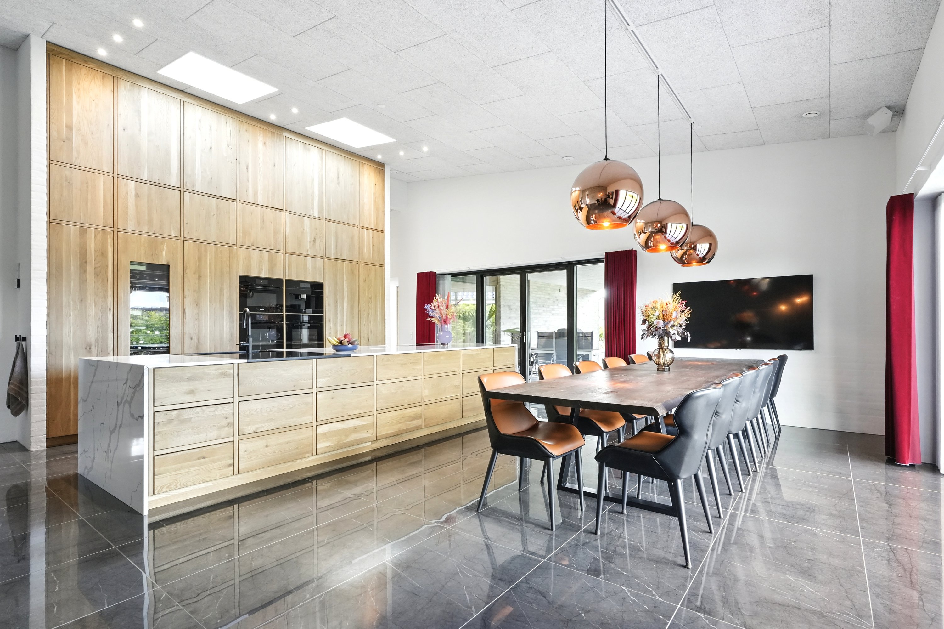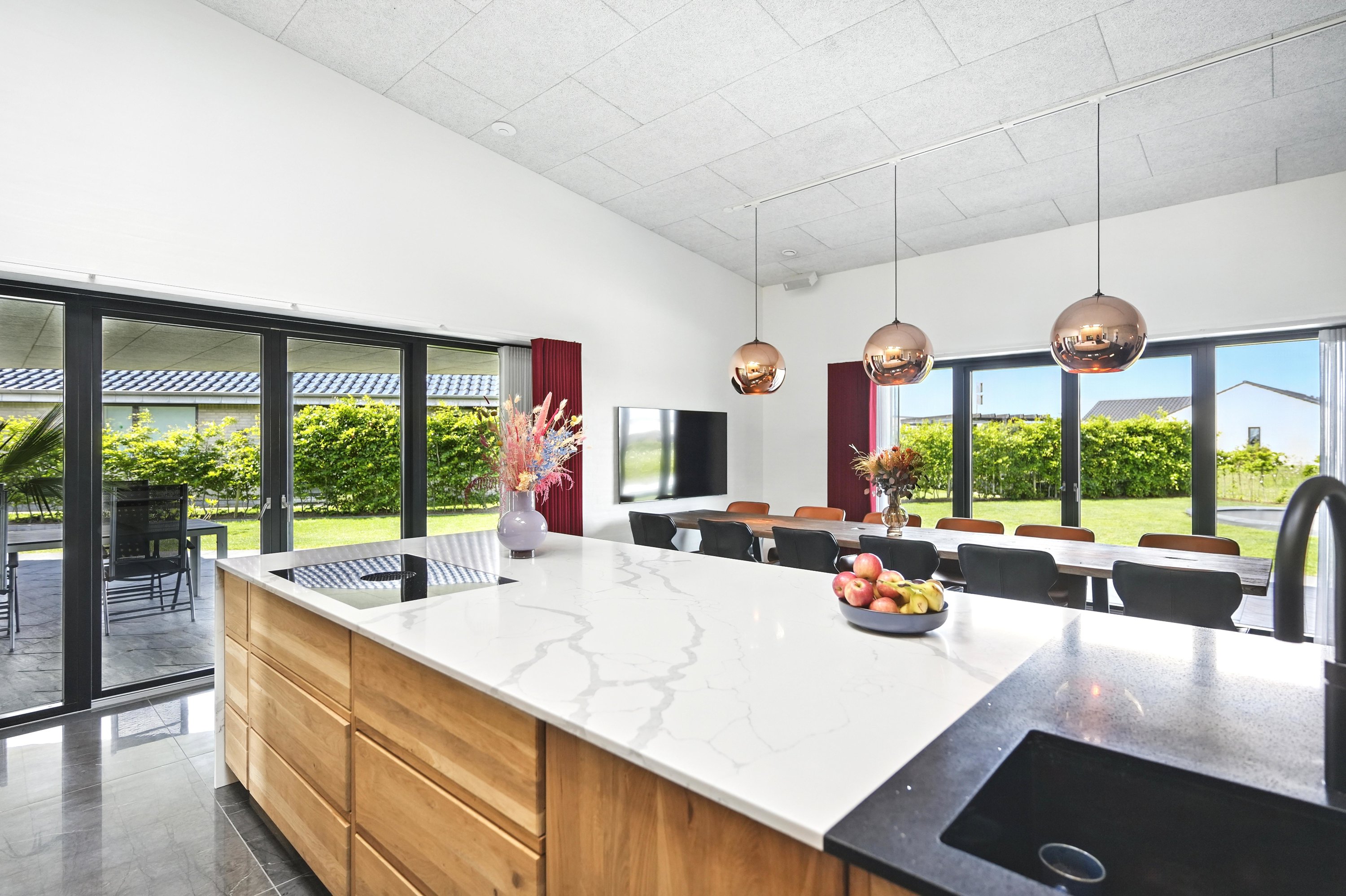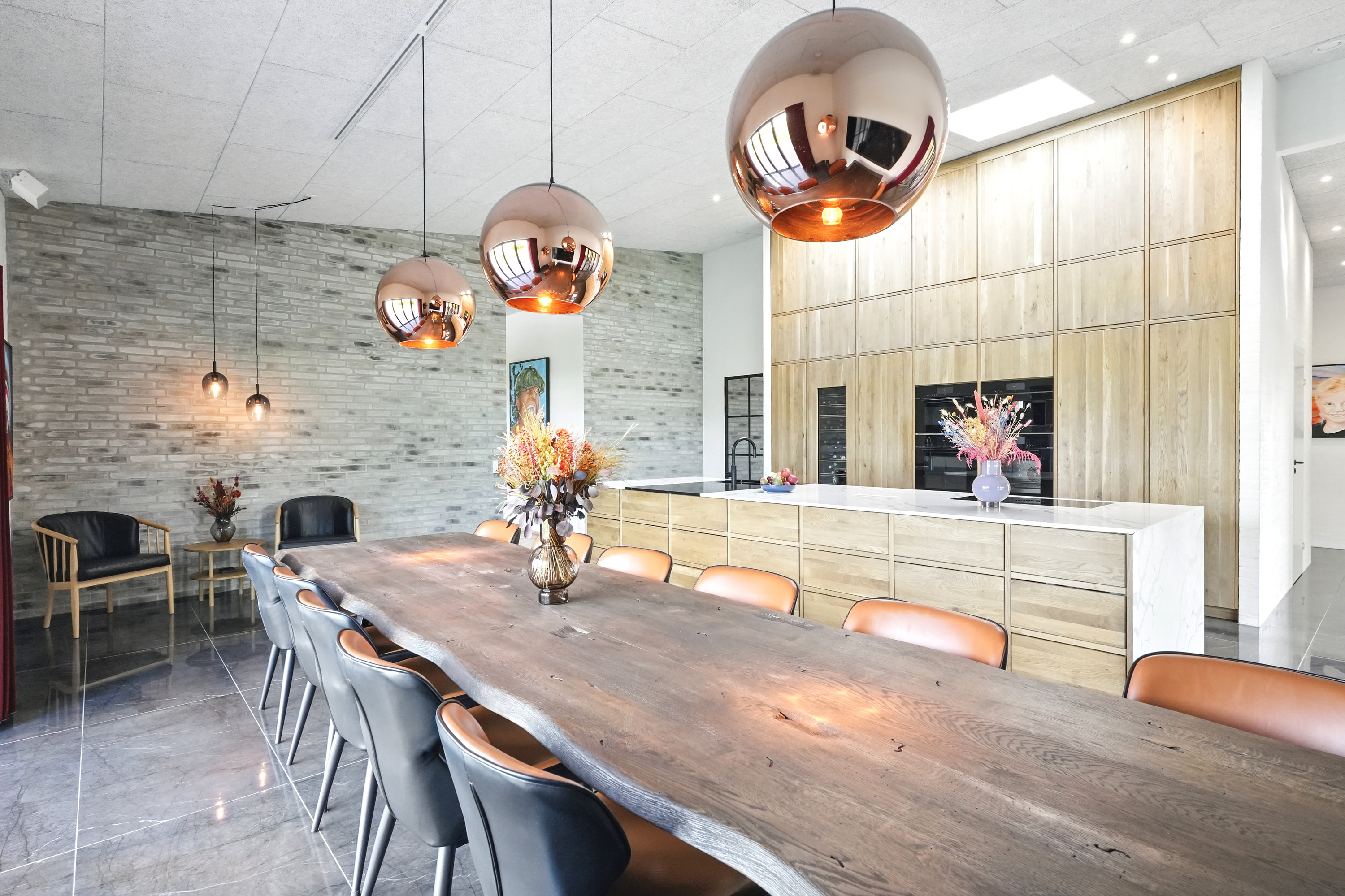 Boligen er arkitekttegnet og indrettet med massive egetræsinventarer gennem hele huset, elegant tilpasset loftshøjde for en harmonisk og gennemført stil. Det store, åbne køkken-alrum er husets naturlige samlingspunkt og ideelt til både hverdagsliv og større sammenkomster. Her er alt i hårde hvidevarer, herunder tre ovne, indbygningskaffemaskine, skuffeopvaskemaskine og Quooker med Cube. Bryggerset er smart gemt bag køkkenet, så funktionalitet og æstetik forenes på fineste vis.