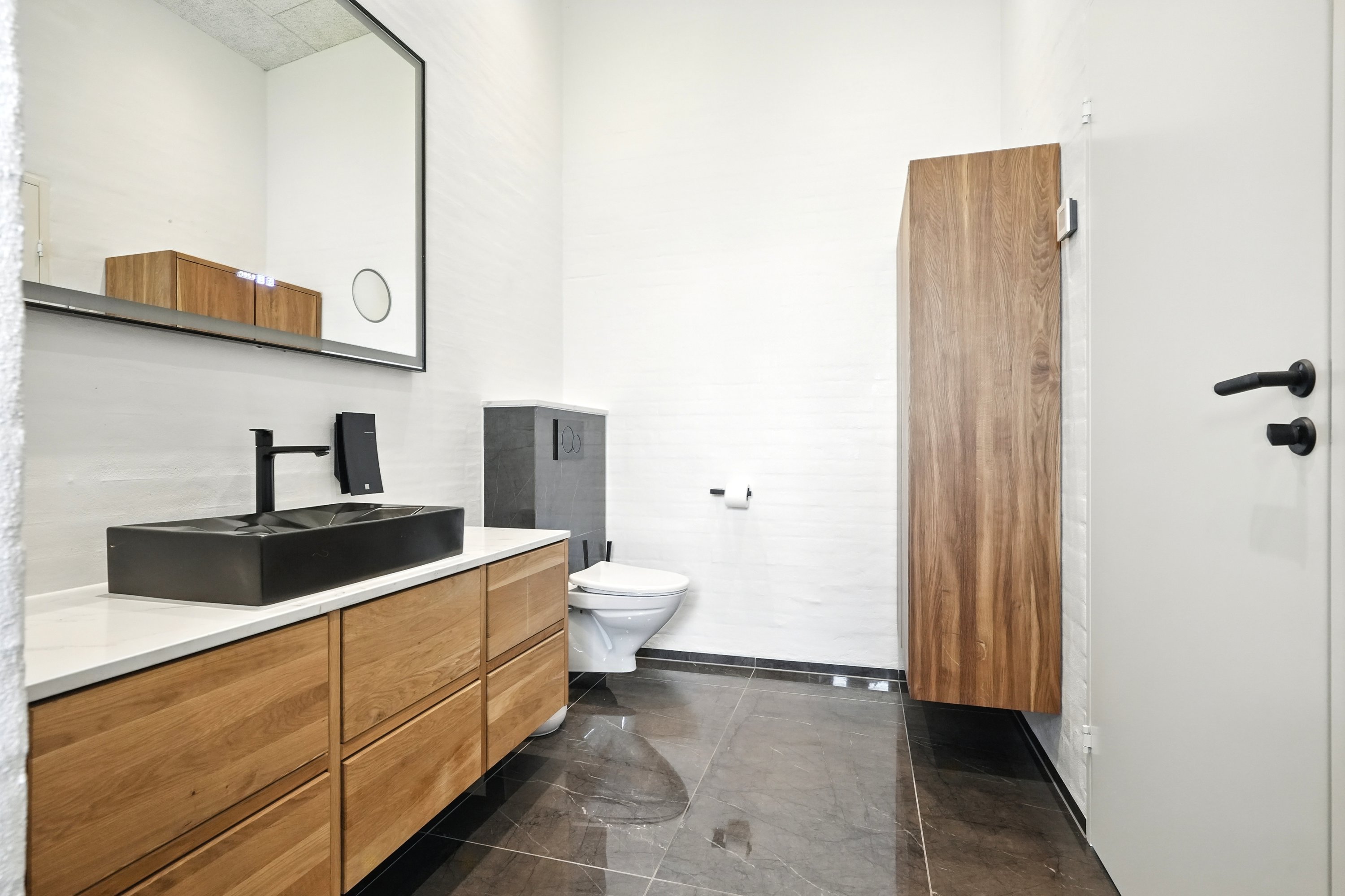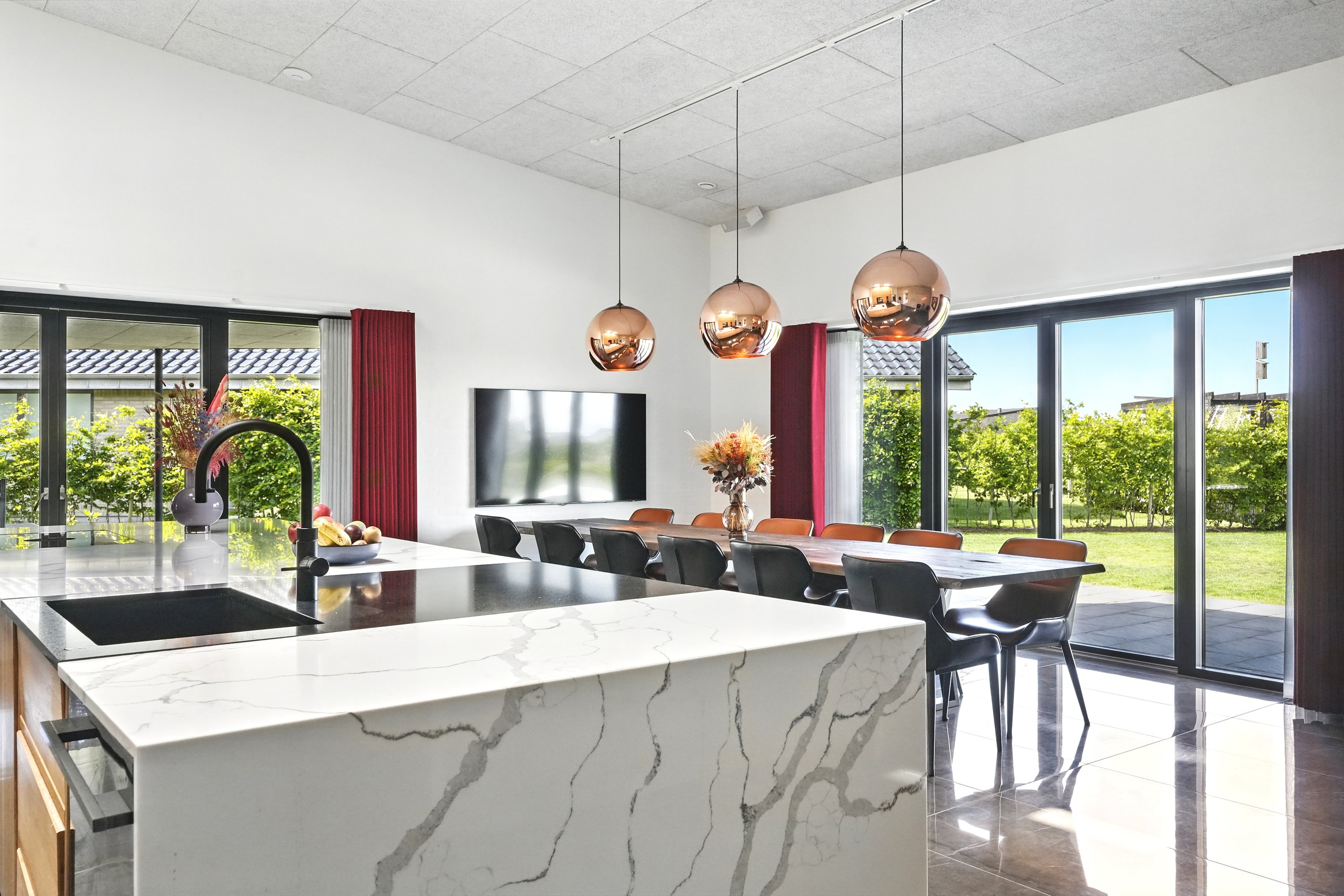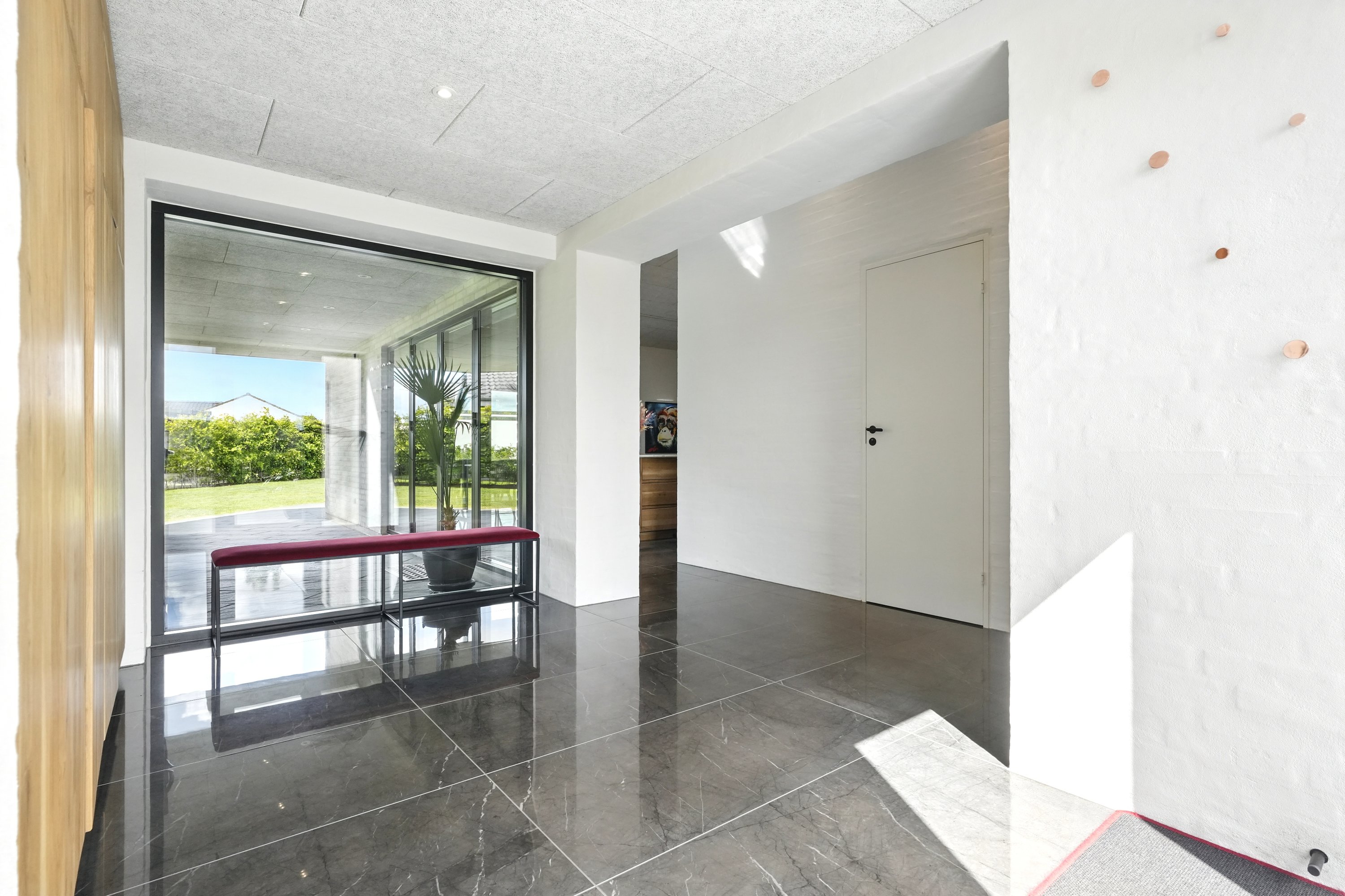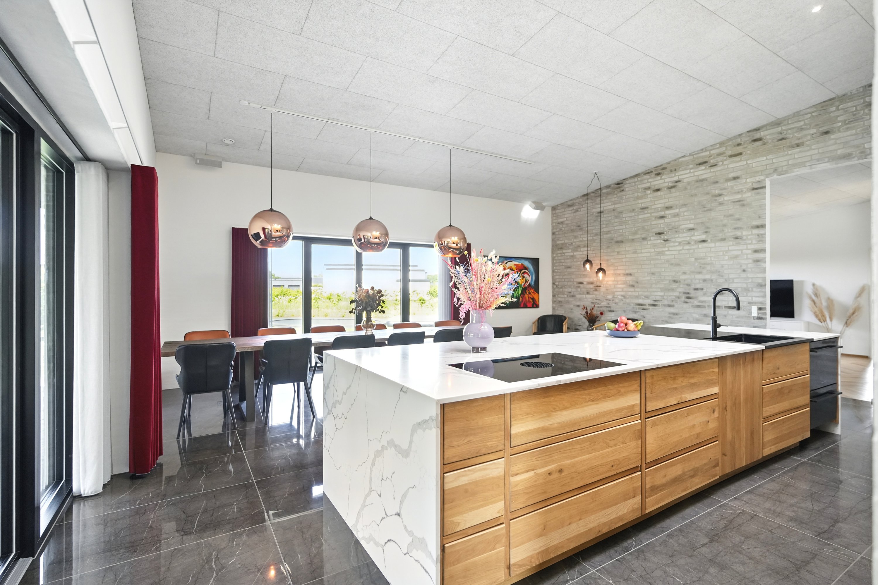Boligen er arkitekttegnet og indrettet med massive egetræsinventarer gennem hele huset, elegant tilpasset loftshøjde for en harmonisk og gennemført stil. Det store, åbne køkken-alrum er husets naturlige samlingspunkt og ideelt til både hverdagsliv og større sammenkomster. Her er alt i hårde hvidevarer, herunder tre ovne, indbygningskaffemaskine, skuffeopvaskemaskine og Quooker med Cube. Bryggerset er smart gemt bag køkkenet, så funktionalitet og æstetik forenes på fineste vis.