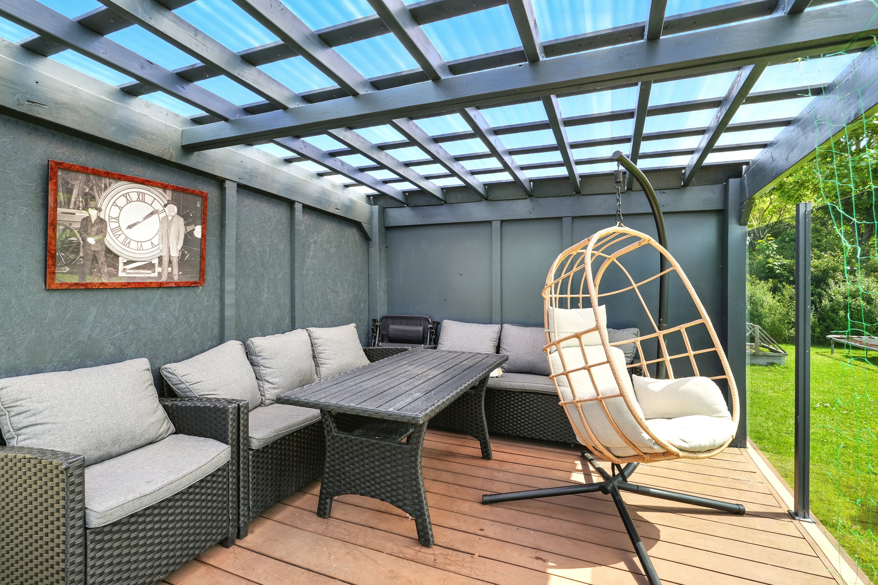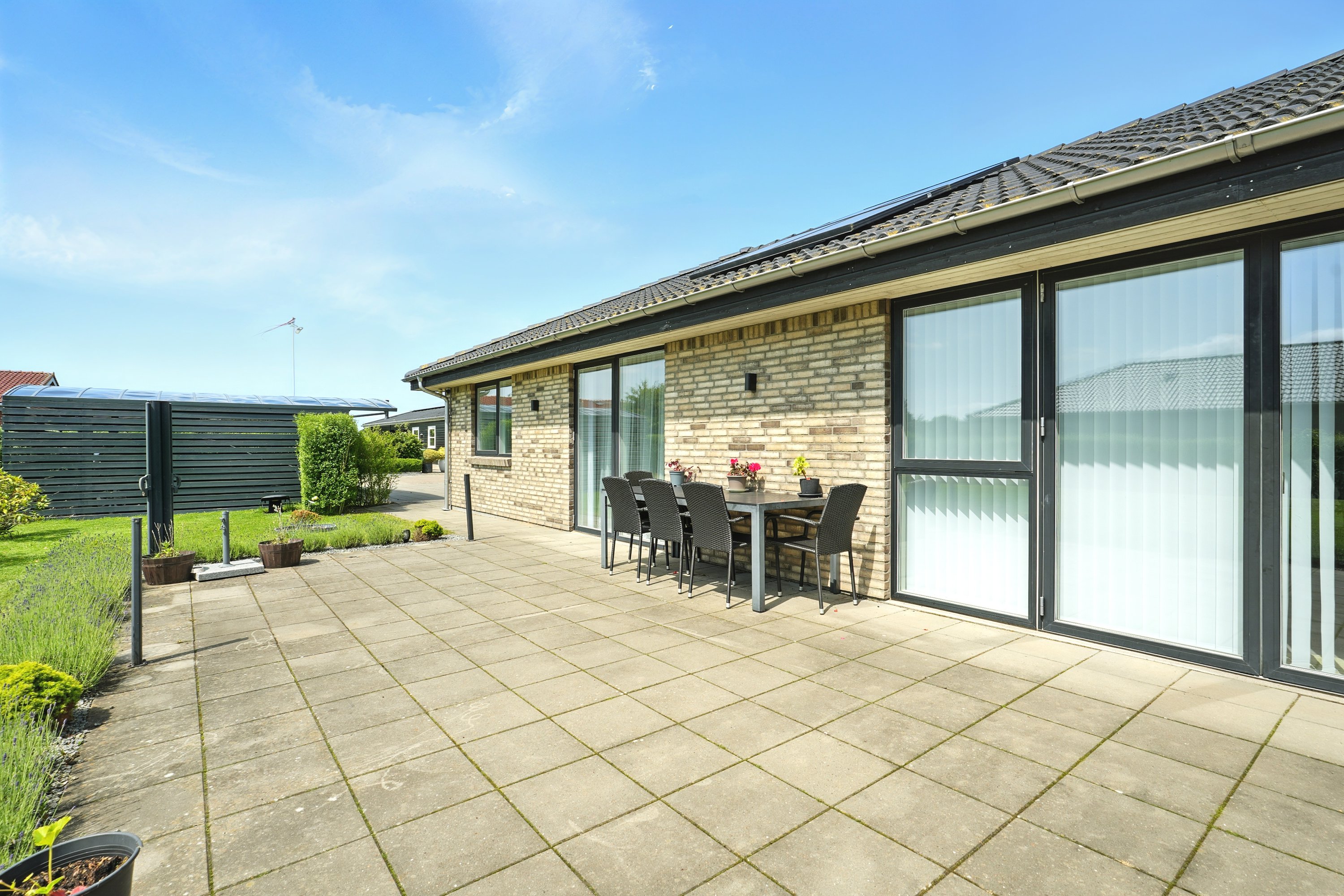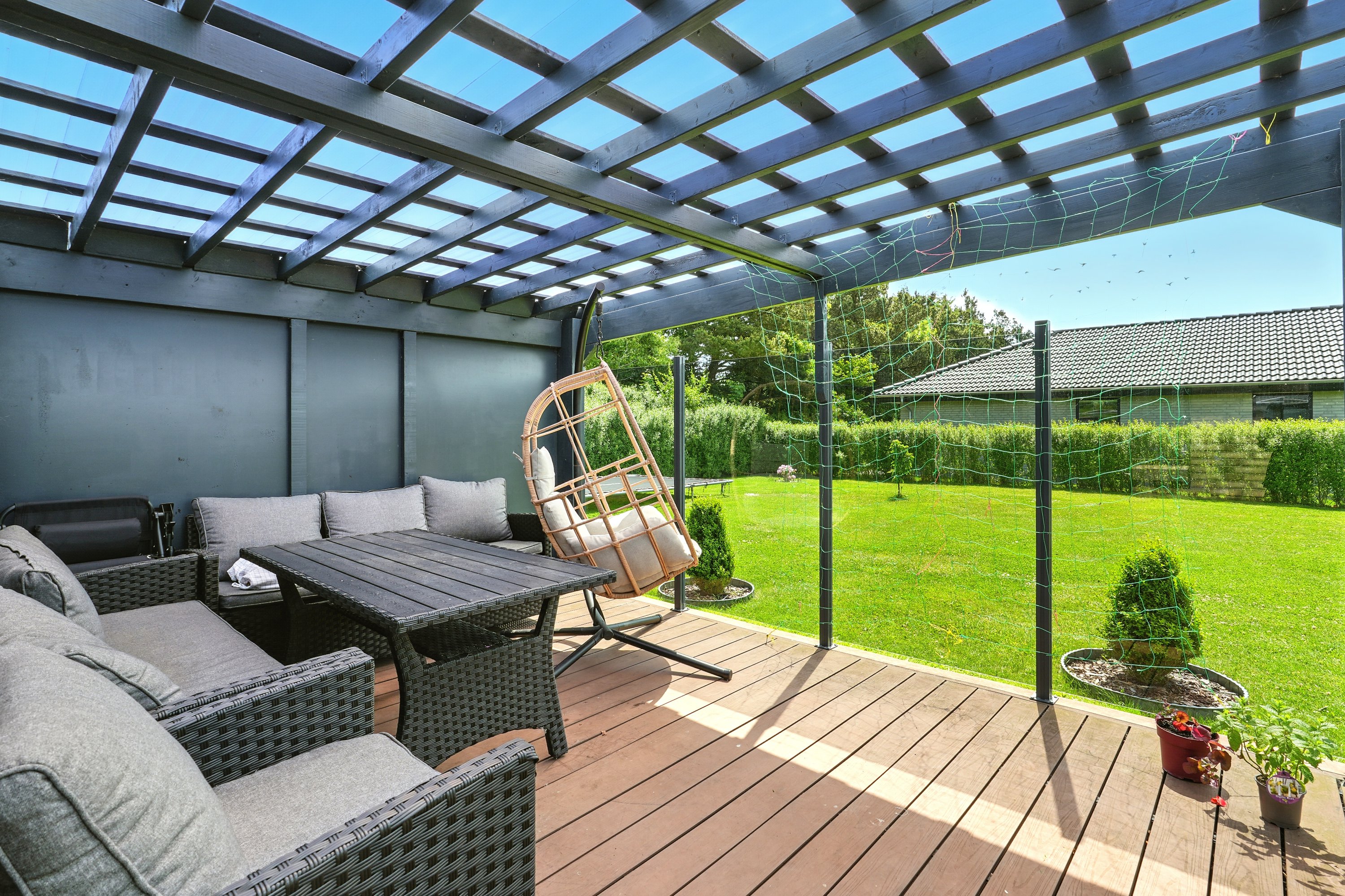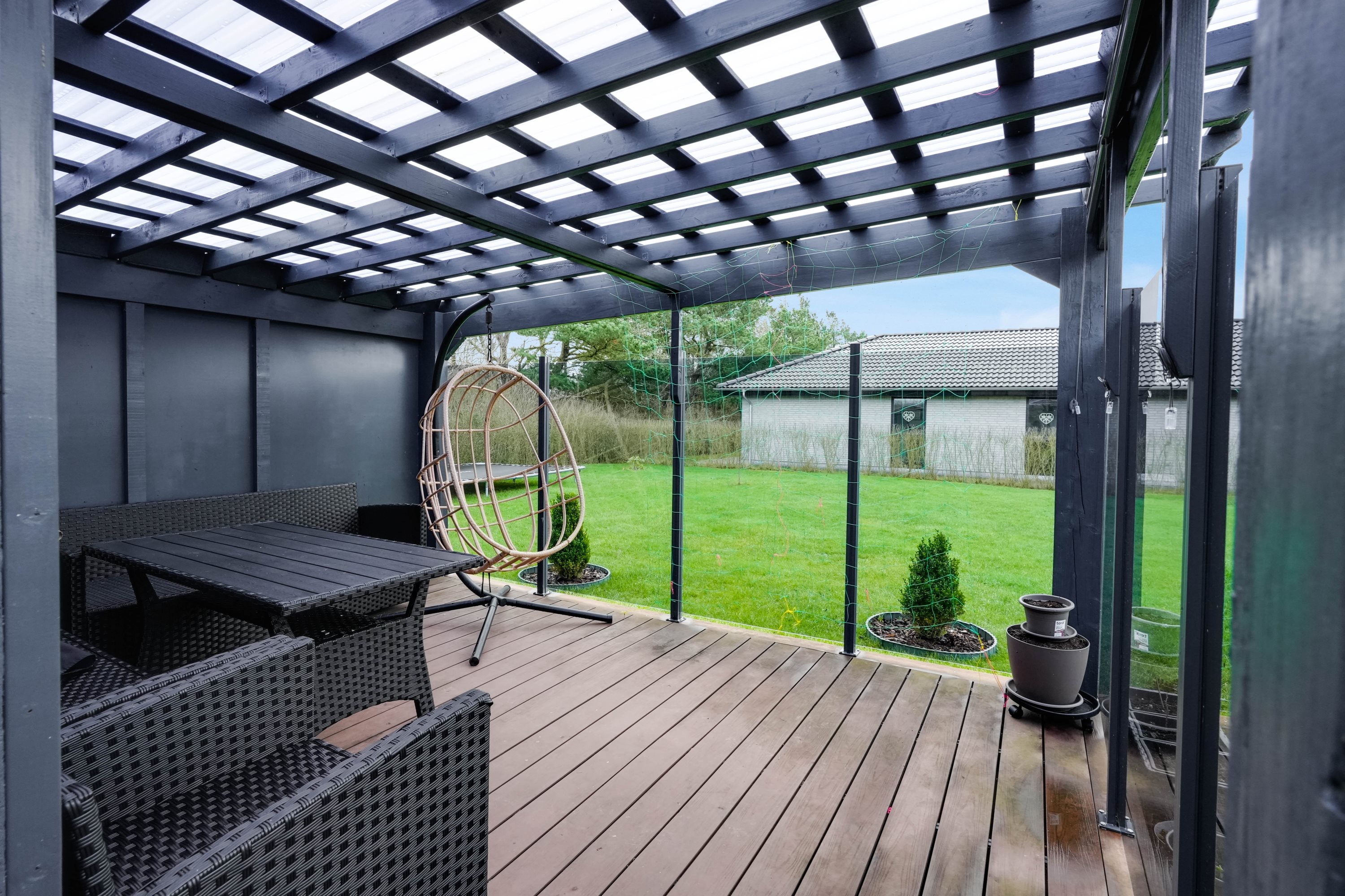 Udendørs venter en stor og solrig terrasse, hvor sælger i 2023 har fået etableret en overdækket del. Her kan de lange sommeraftener nydes i læ, uanset vejret, mens børnene leger frit på den store grund.