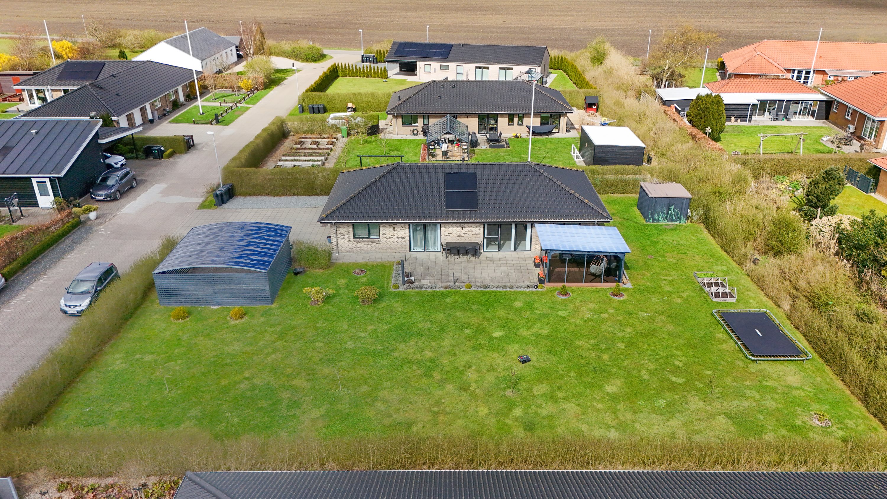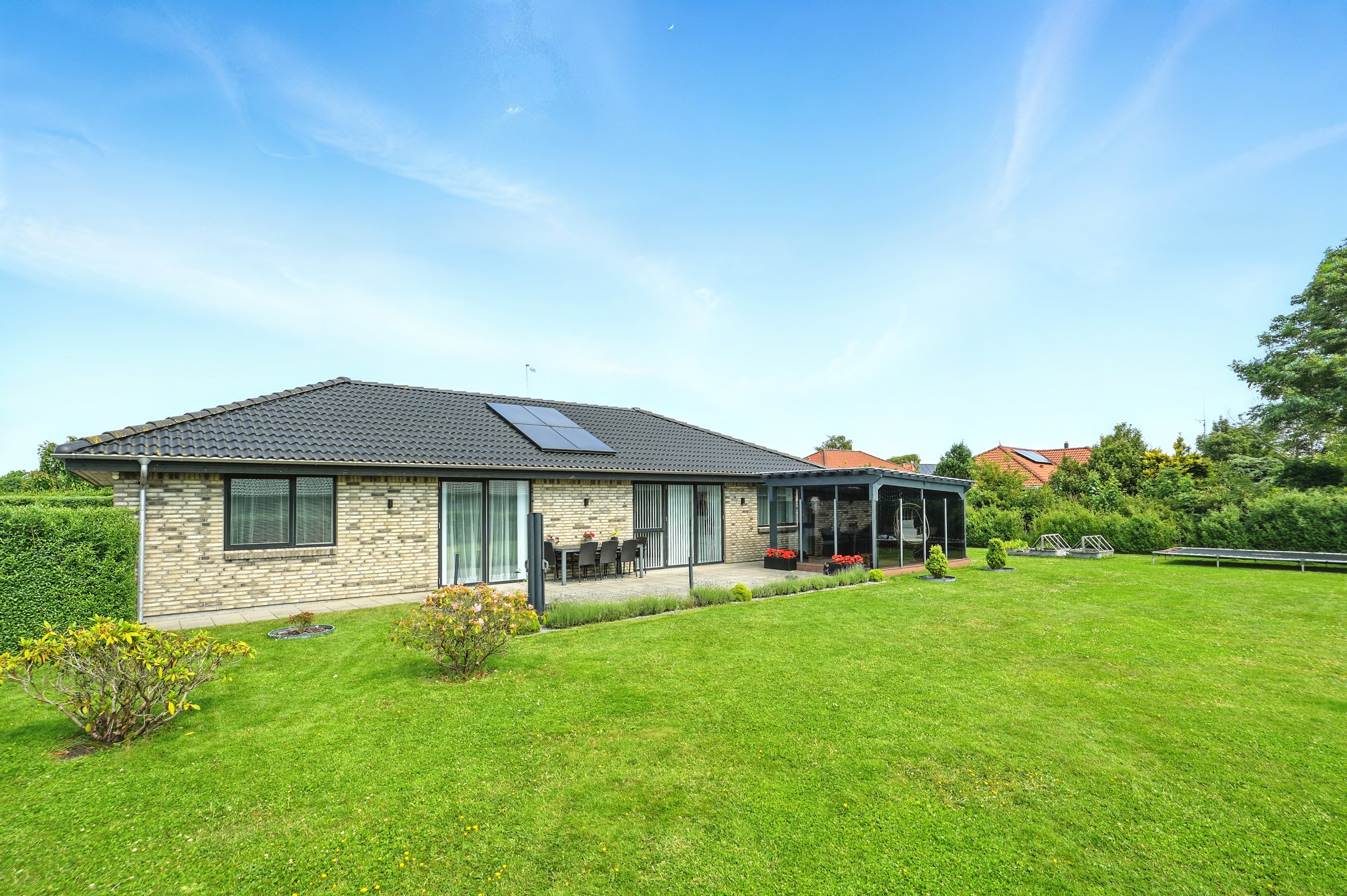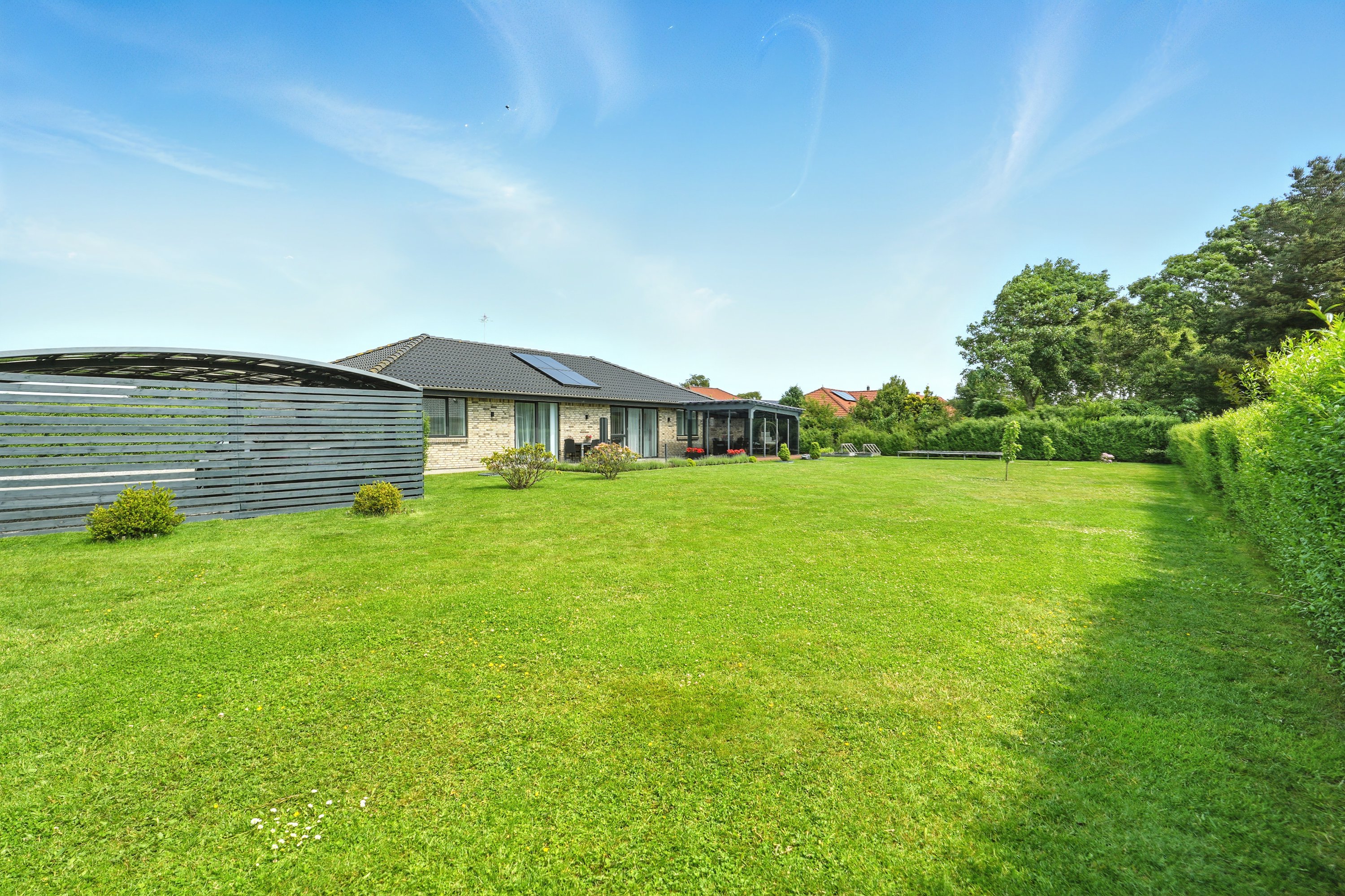 Udendørs venter en stor og solrig terrasse, hvor sælger i 2023 har fået etableret en overdækket del. Her kan de lange sommeraftener nydes i læ, uanset vejret, mens børnene leger frit på den store grund.