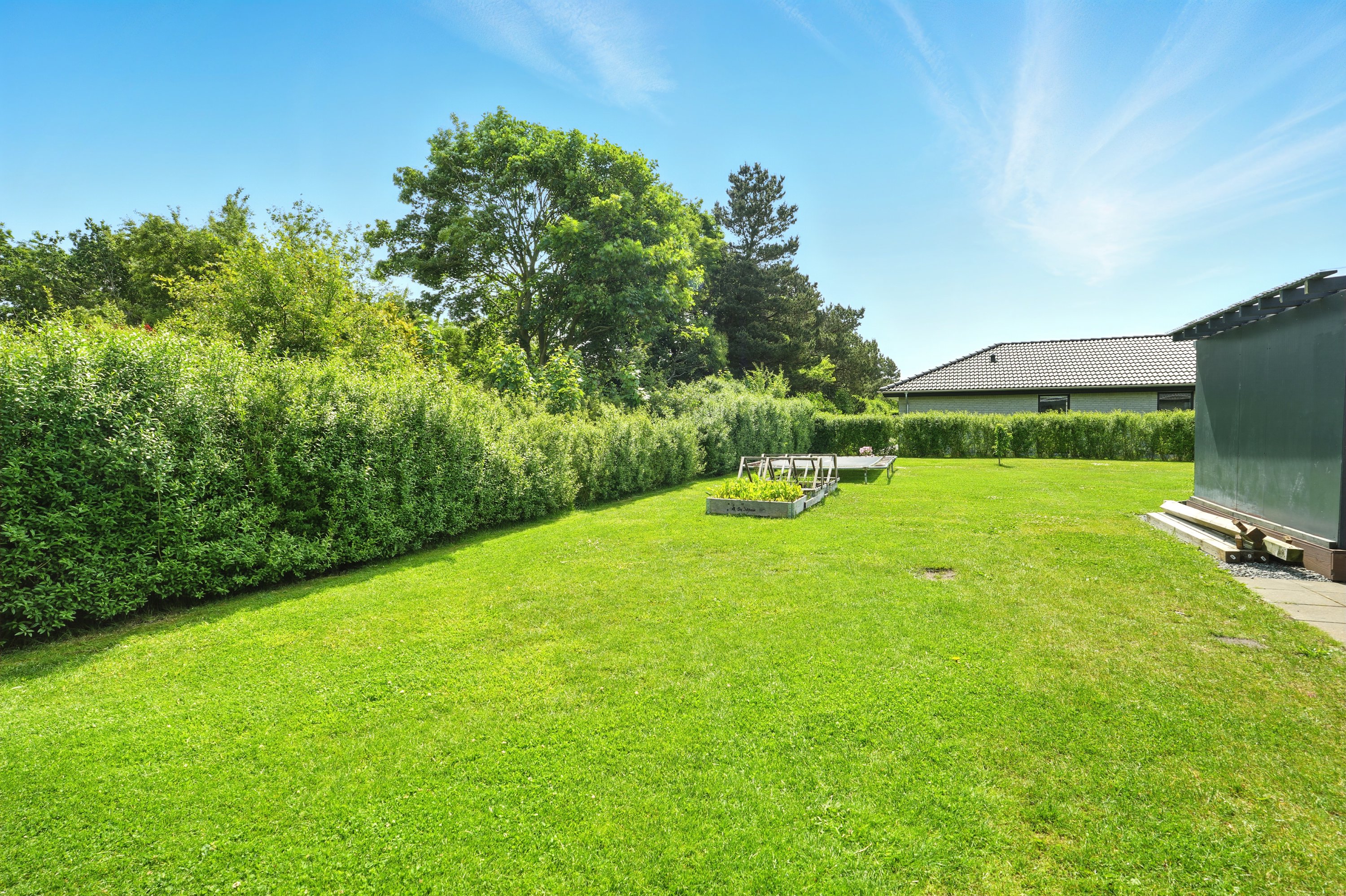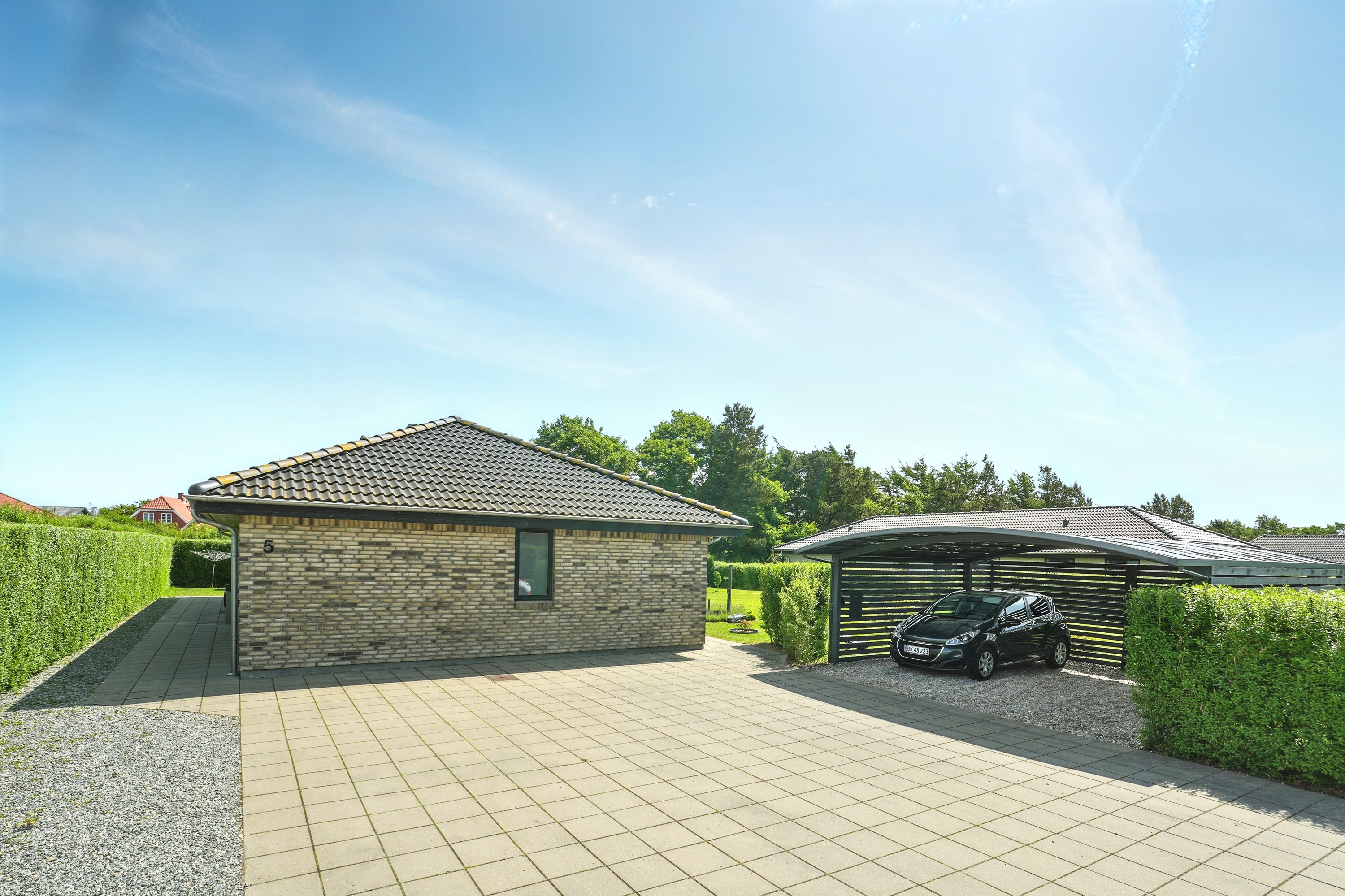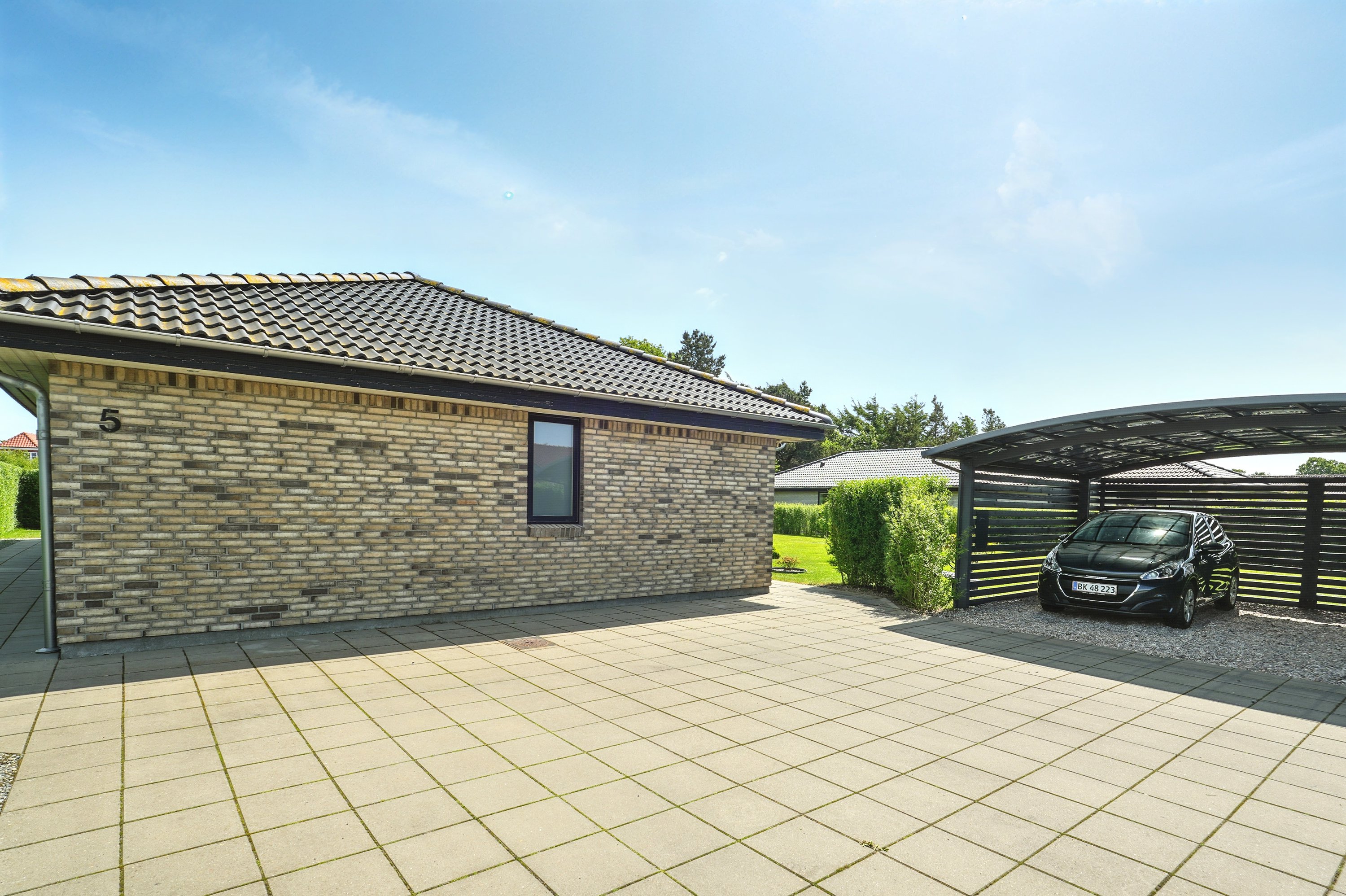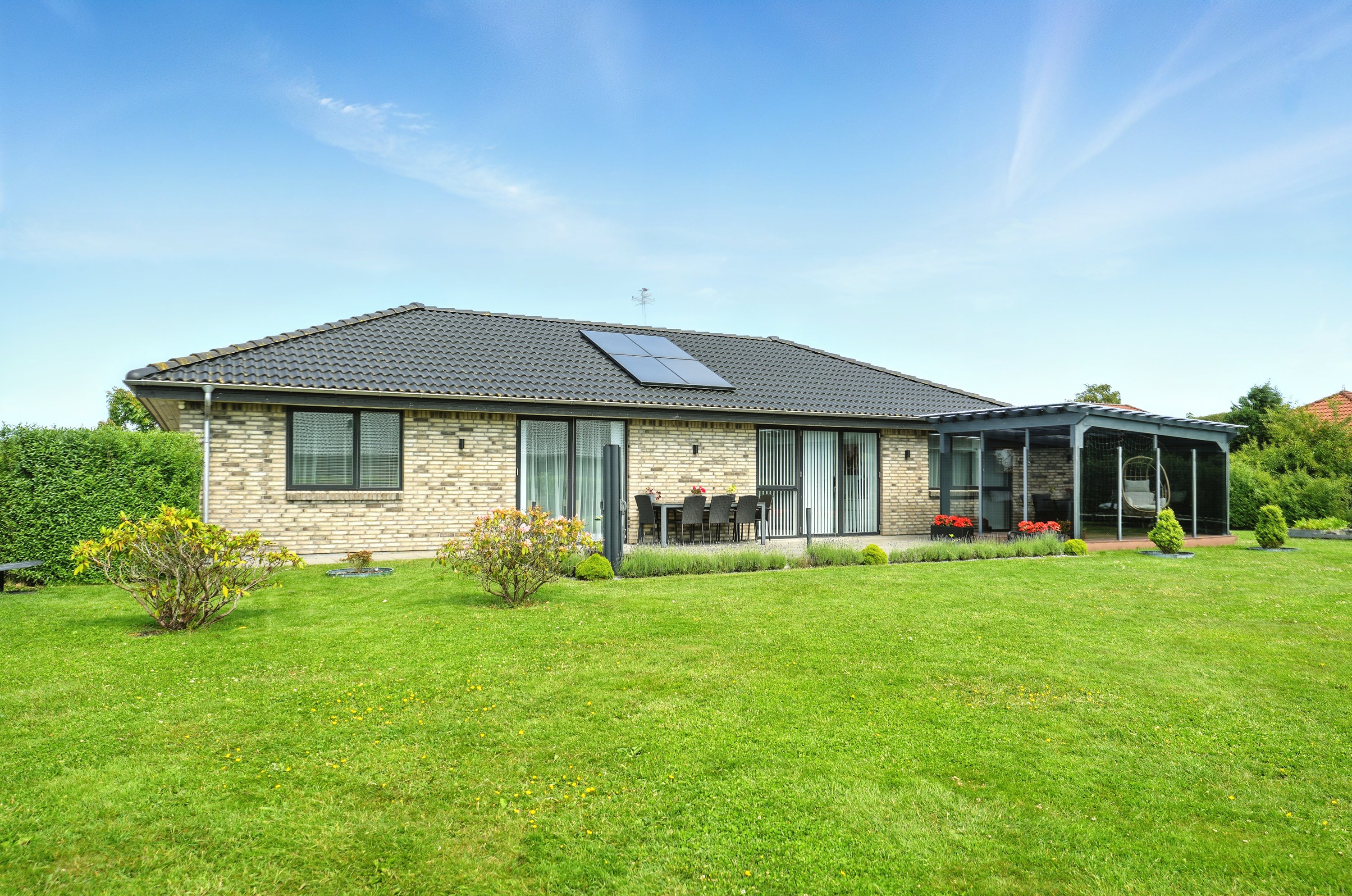 Udendørs venter en stor og solrig terrasse, hvor sælger i 2023 har fået etableret en overdækket del. Her kan de lange sommeraftener nydes i læ, uanset vejret, mens børnene leger frit på den store grund.