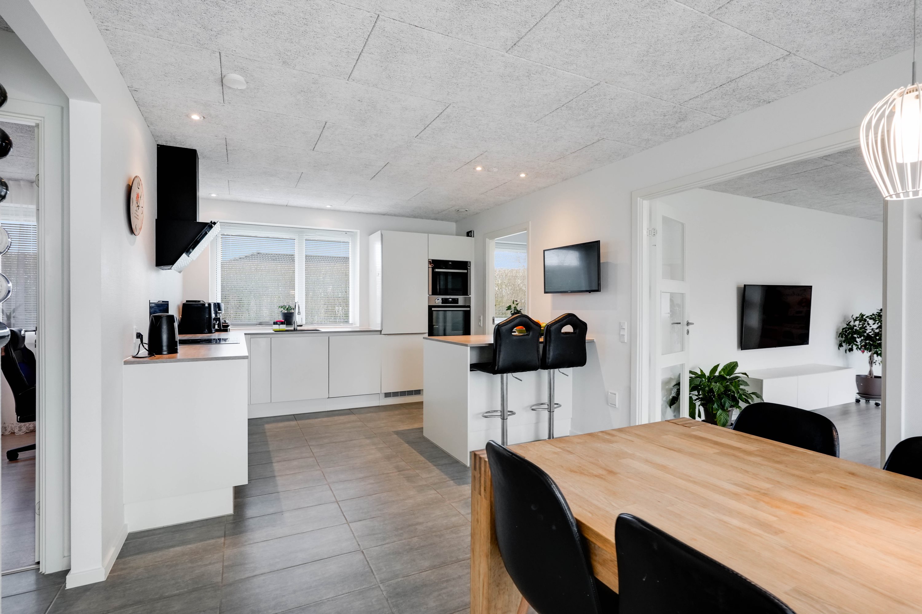 Villaen er opført i 2018 i tidløse materialer og med en gennemtænkt planløsning, hvor hver kvadratmeter er udnyttet optimalt. Hjertet i hjemmet er det lyse og rummelige køkken/alrum, hvor store vinduespartier inviterer naturen og lyset indenfor. Køkkenet fremstår stilrent og funktionelt med kvalitetsmaterialer, der gør madlavningen til en fornøjelse. Herfra er der direkte forbindelse til opholdsstuen, der kan adskilles med franske døre og har udgang til terrassen – et naturligt samlingspunkt for hele familien.