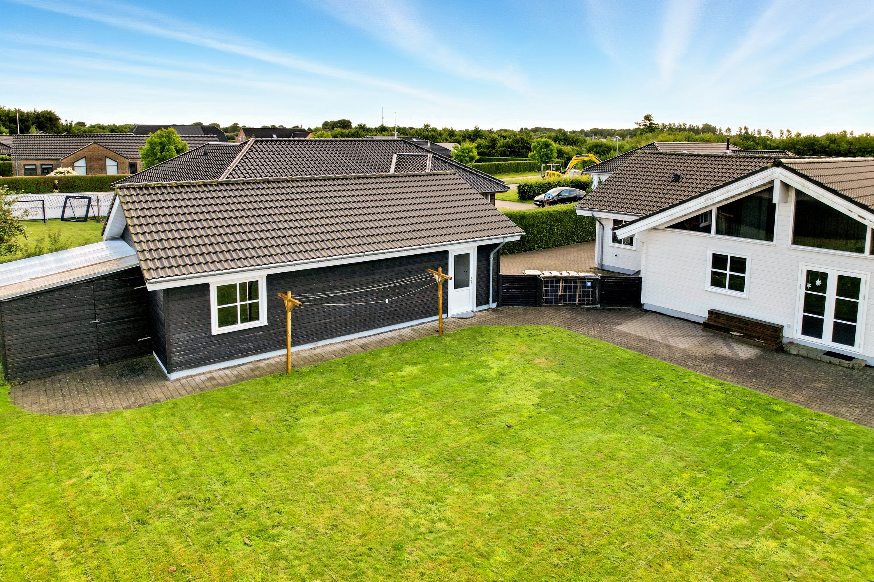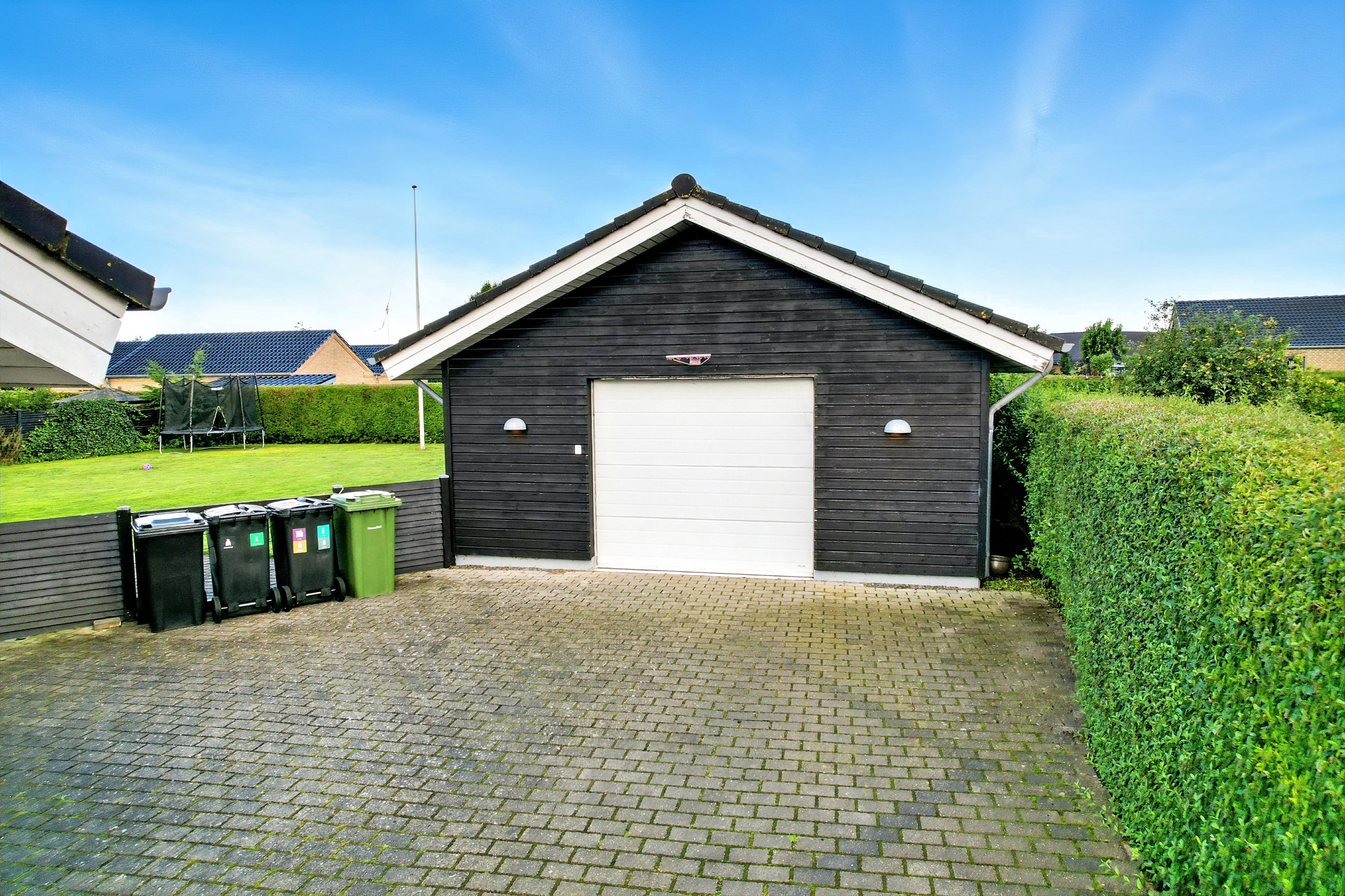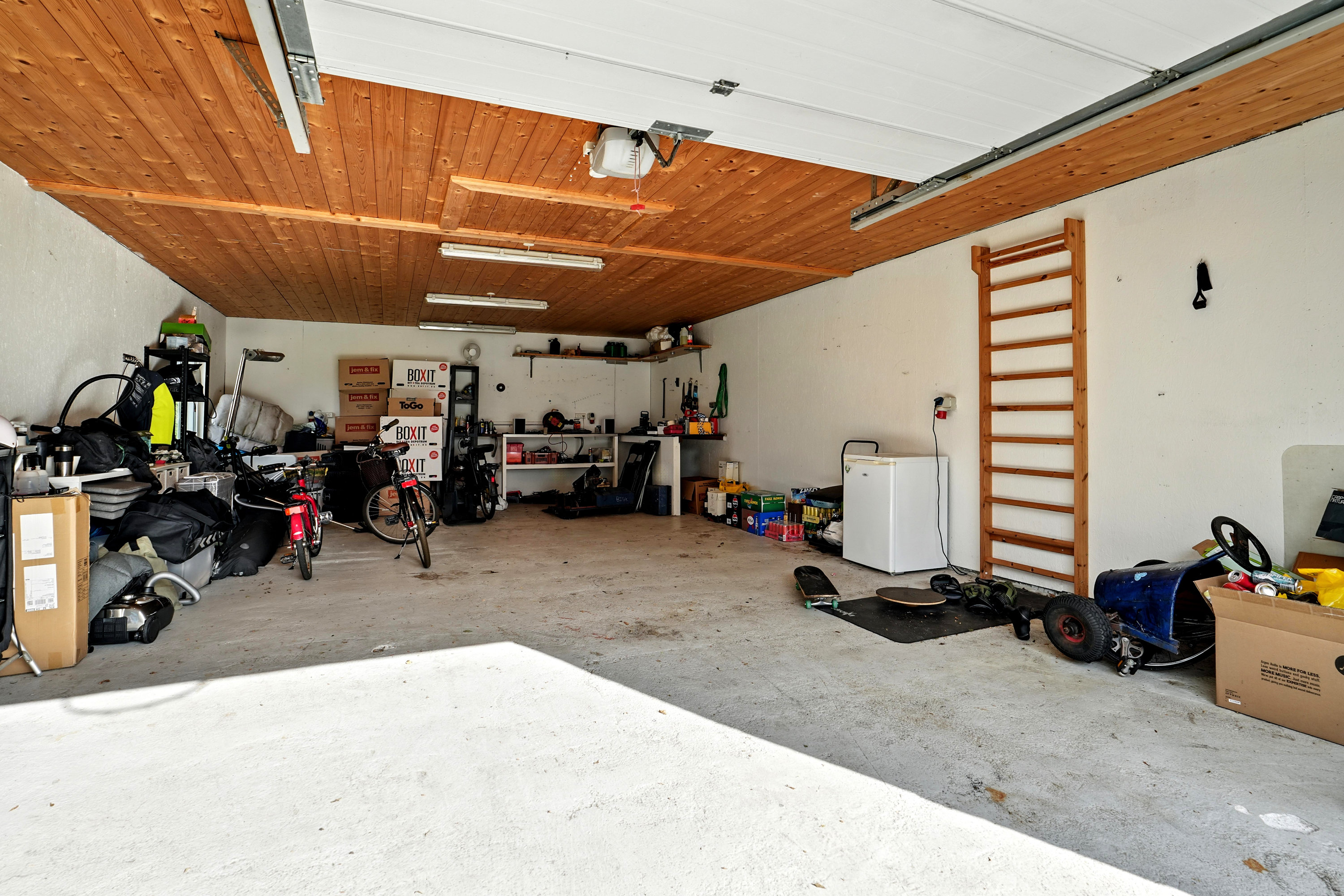 Som noget helt særligt medfølger en stor, isoleret garage på hele 60 kvadratmeter med elport. Her er der både plads til bilen, værkstedsbordet og rigelig opbevaring – ikke mindst i det gode loftrum over garagen, som gør det nemt at holde orden. Garagen er opført i samme stil som huset og ligger flot tilbagetrukket på grunden.