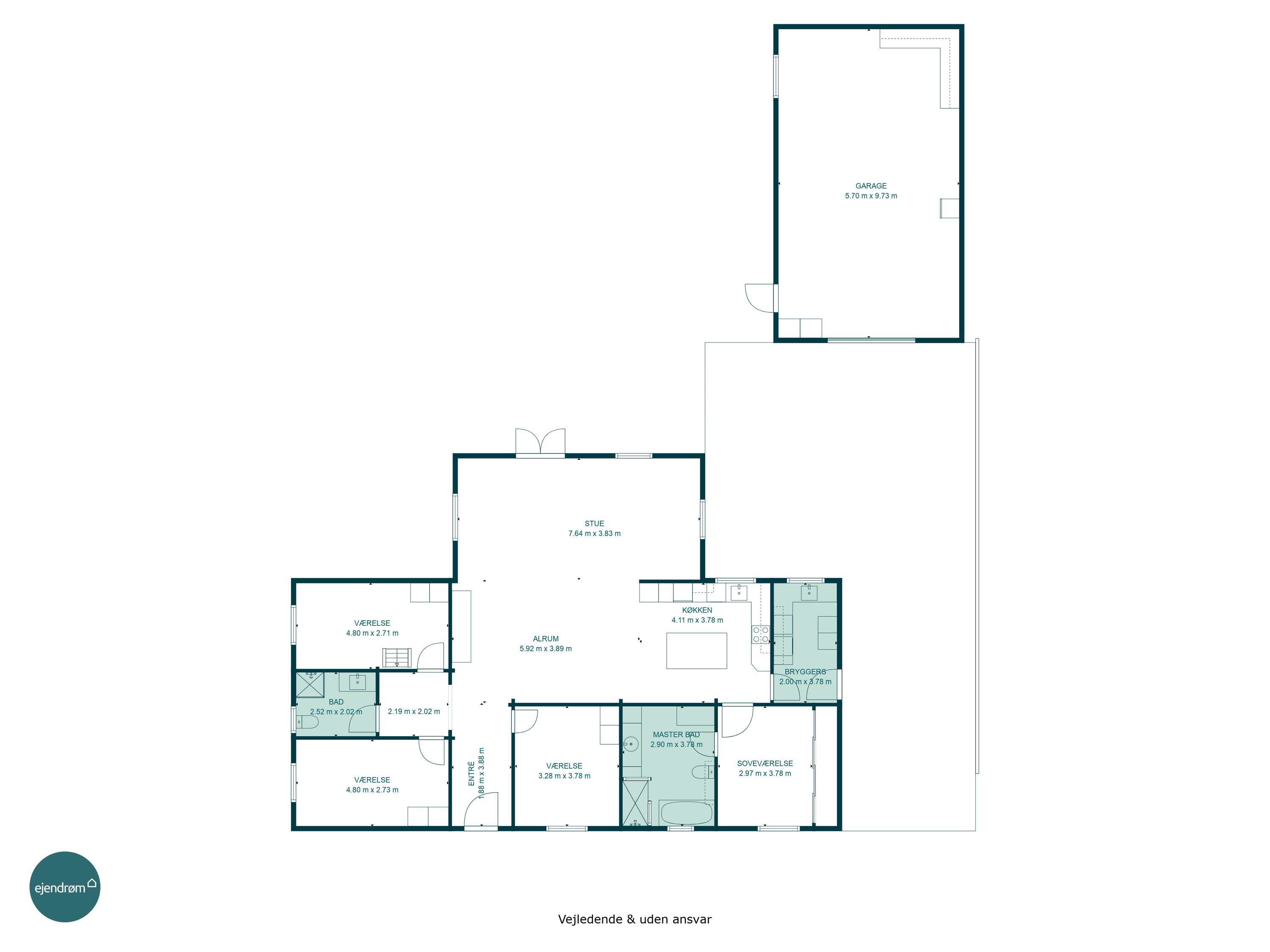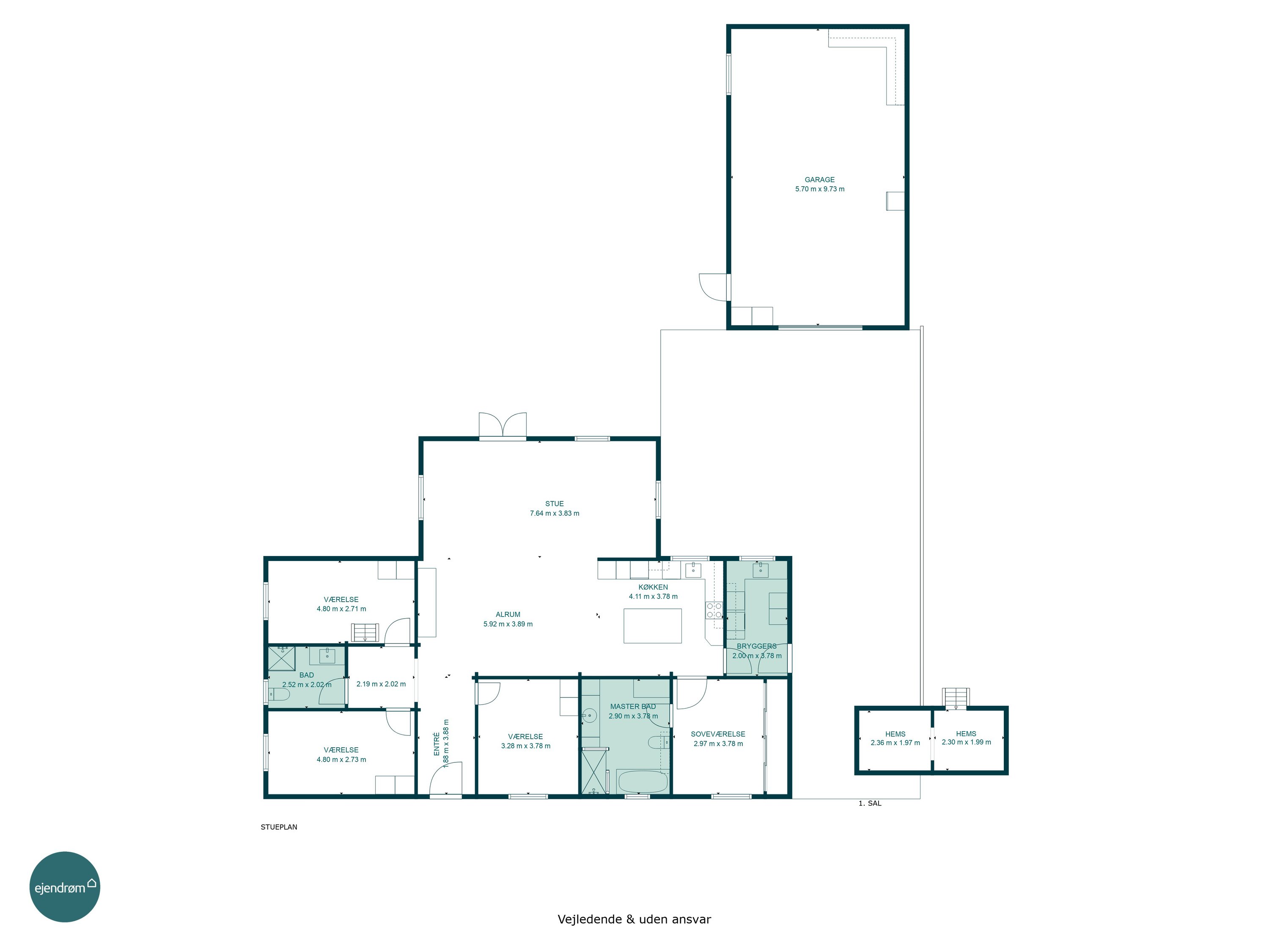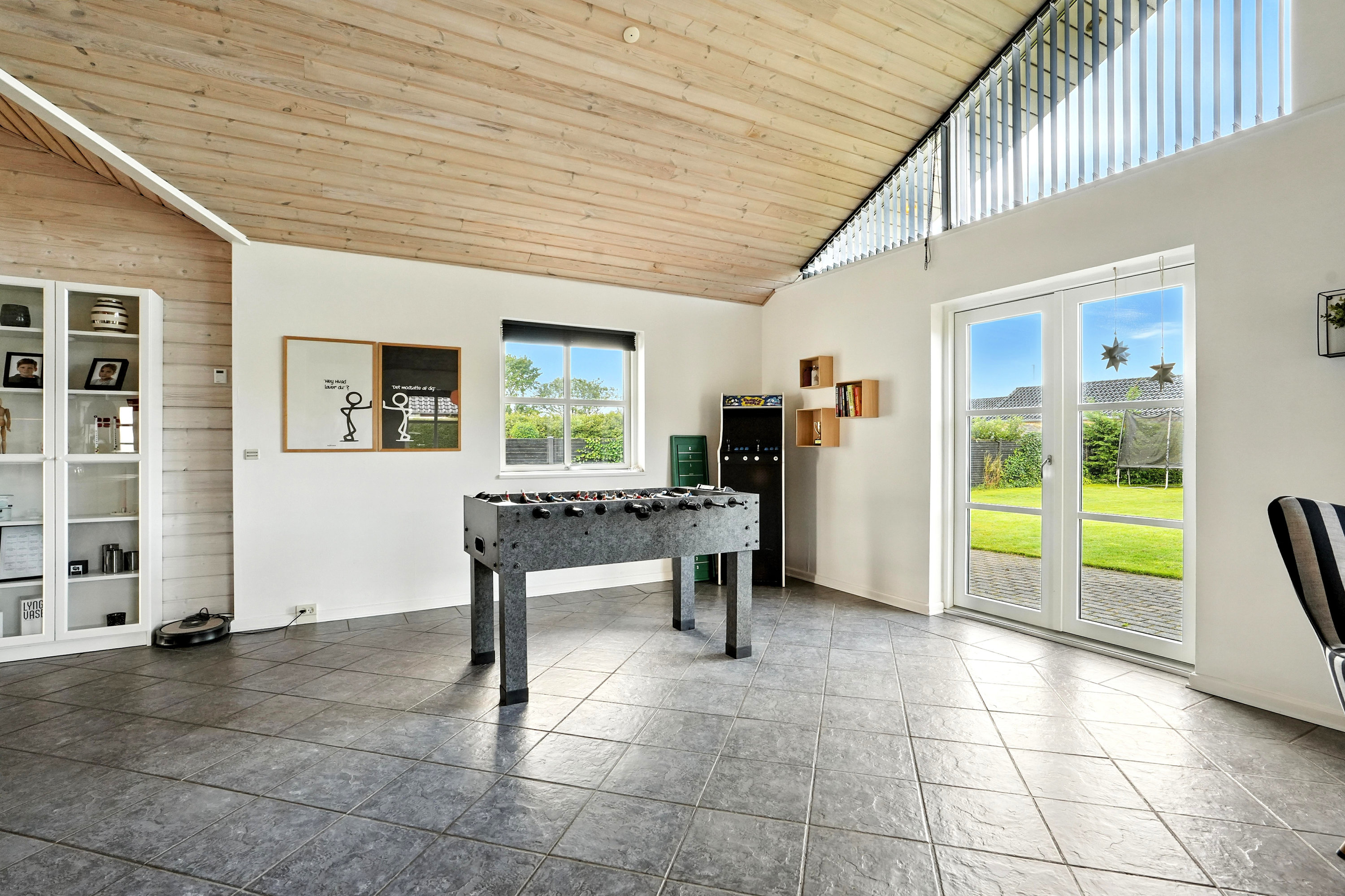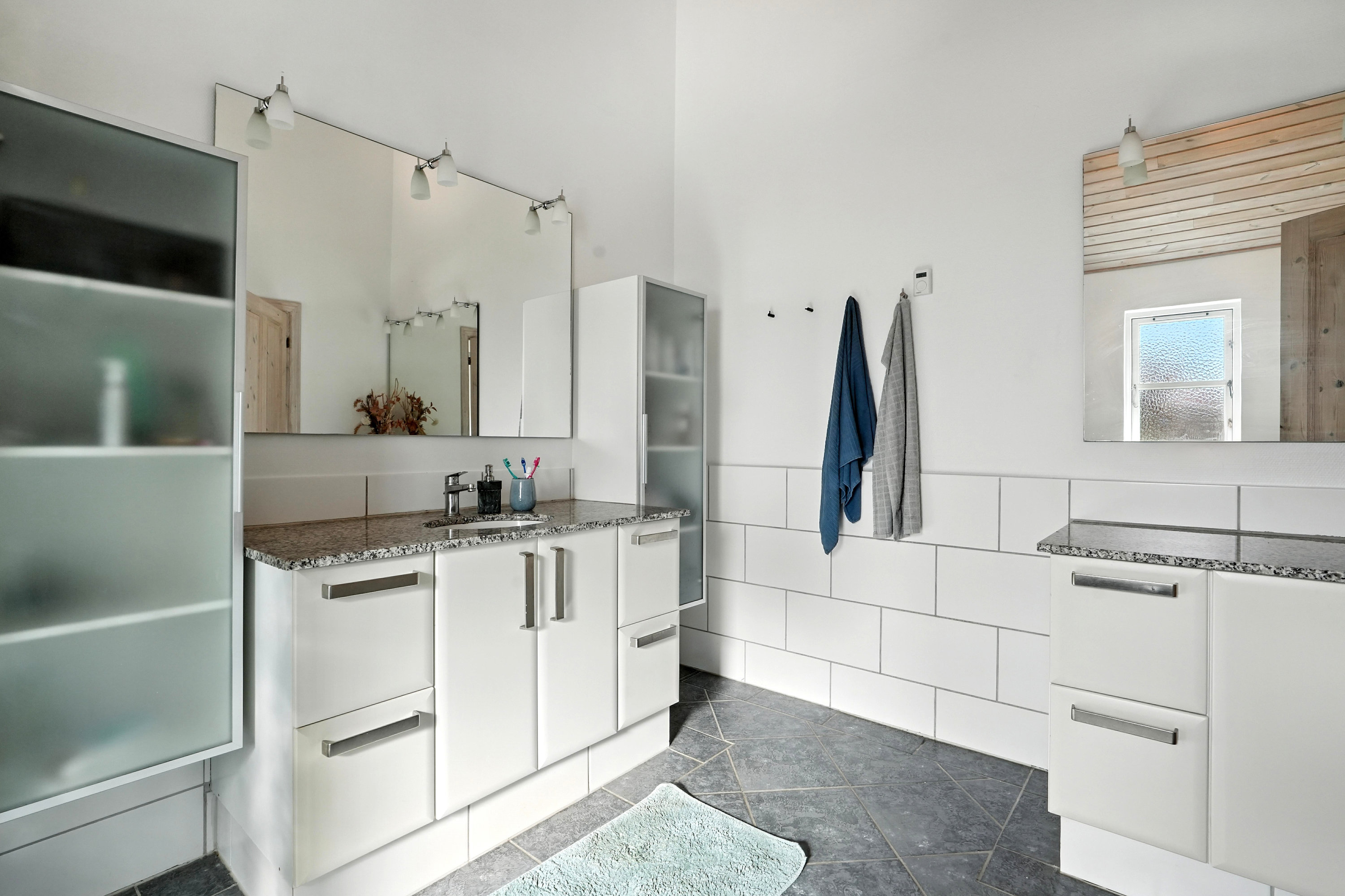Som noget helt særligt medfølger en stor, isoleret garage på hele 60 kvadratmeter med elport. Her er der både plads til bilen, værkstedsbordet og rigelig opbevaring – ikke mindst i det gode loftrum over garagen, som gør det nemt at holde orden. Garagen er opført i samme stil som huset og ligger flot tilbagetrukket på grunden.
