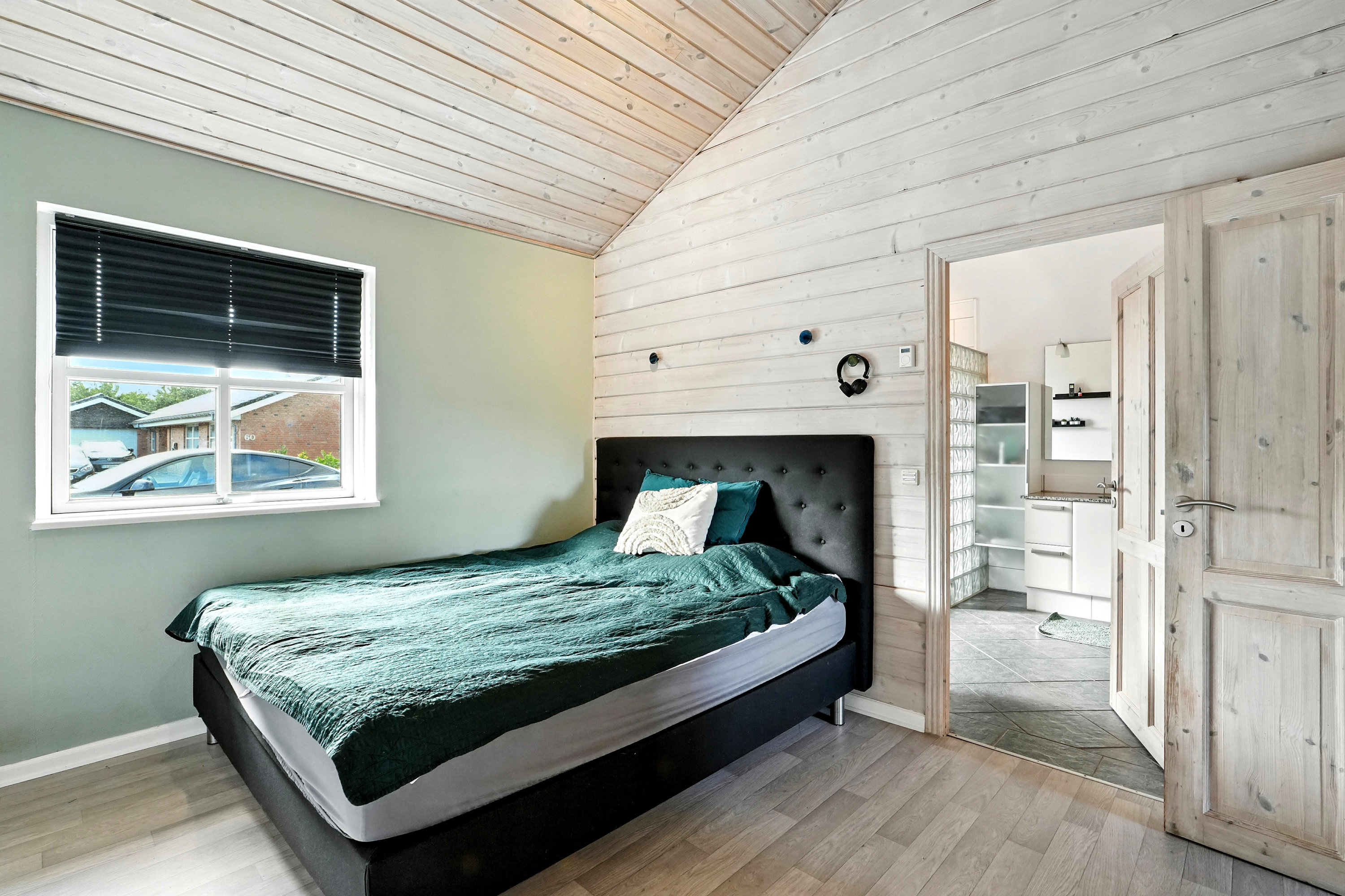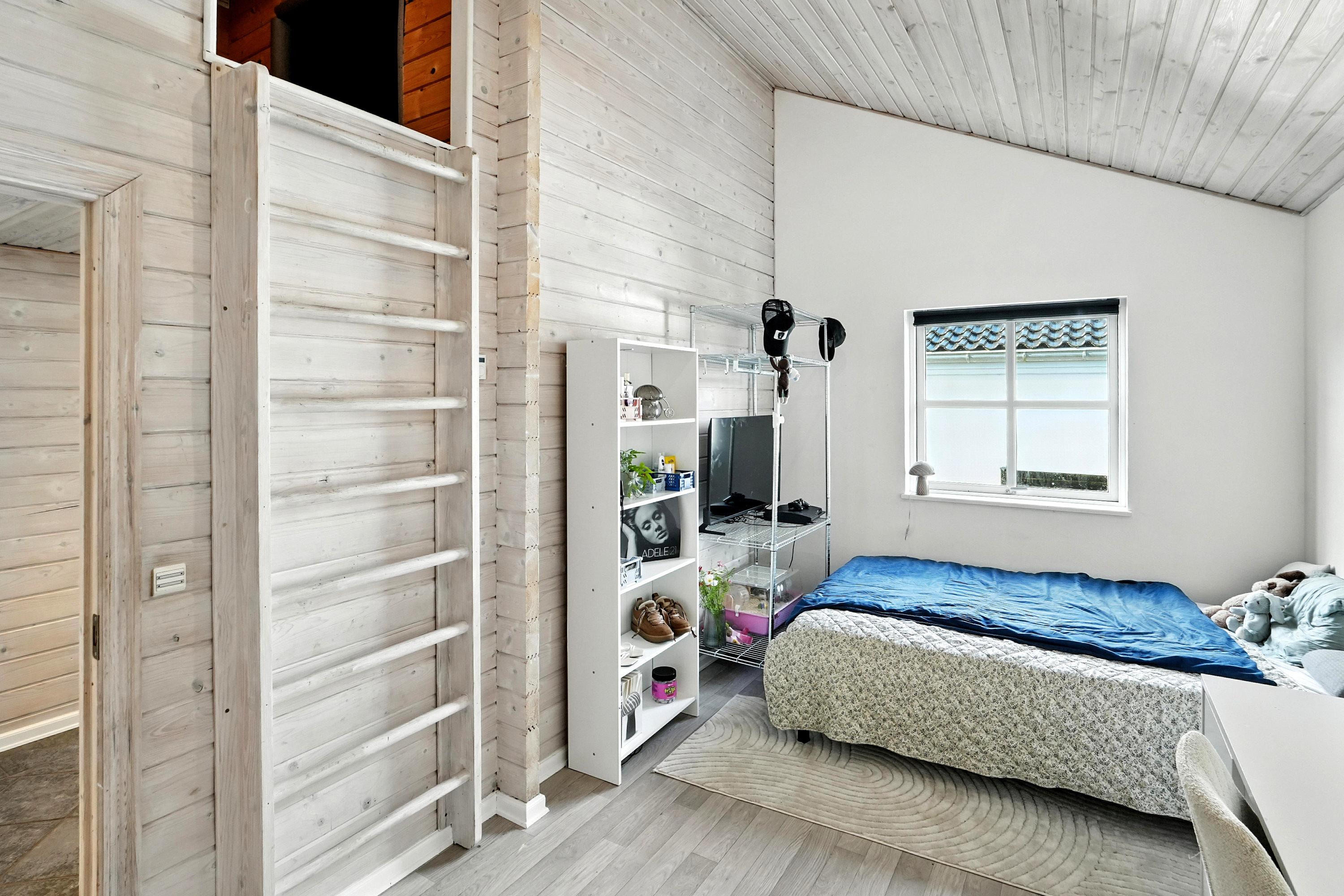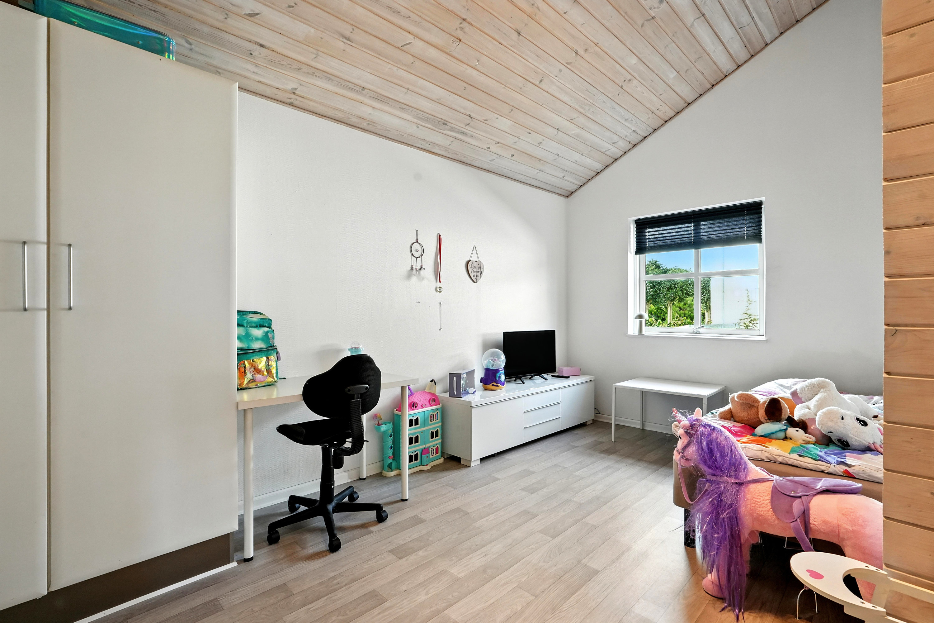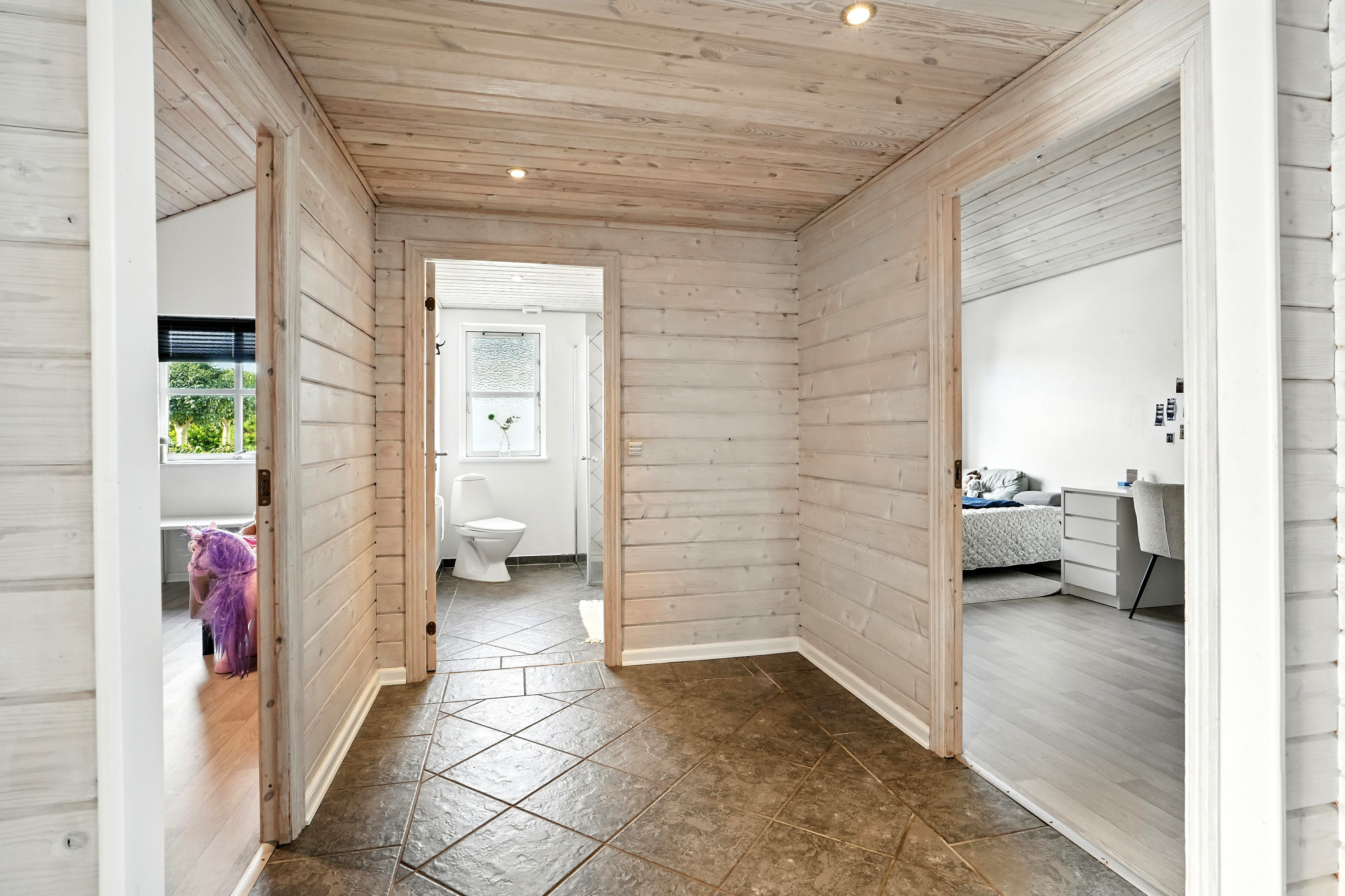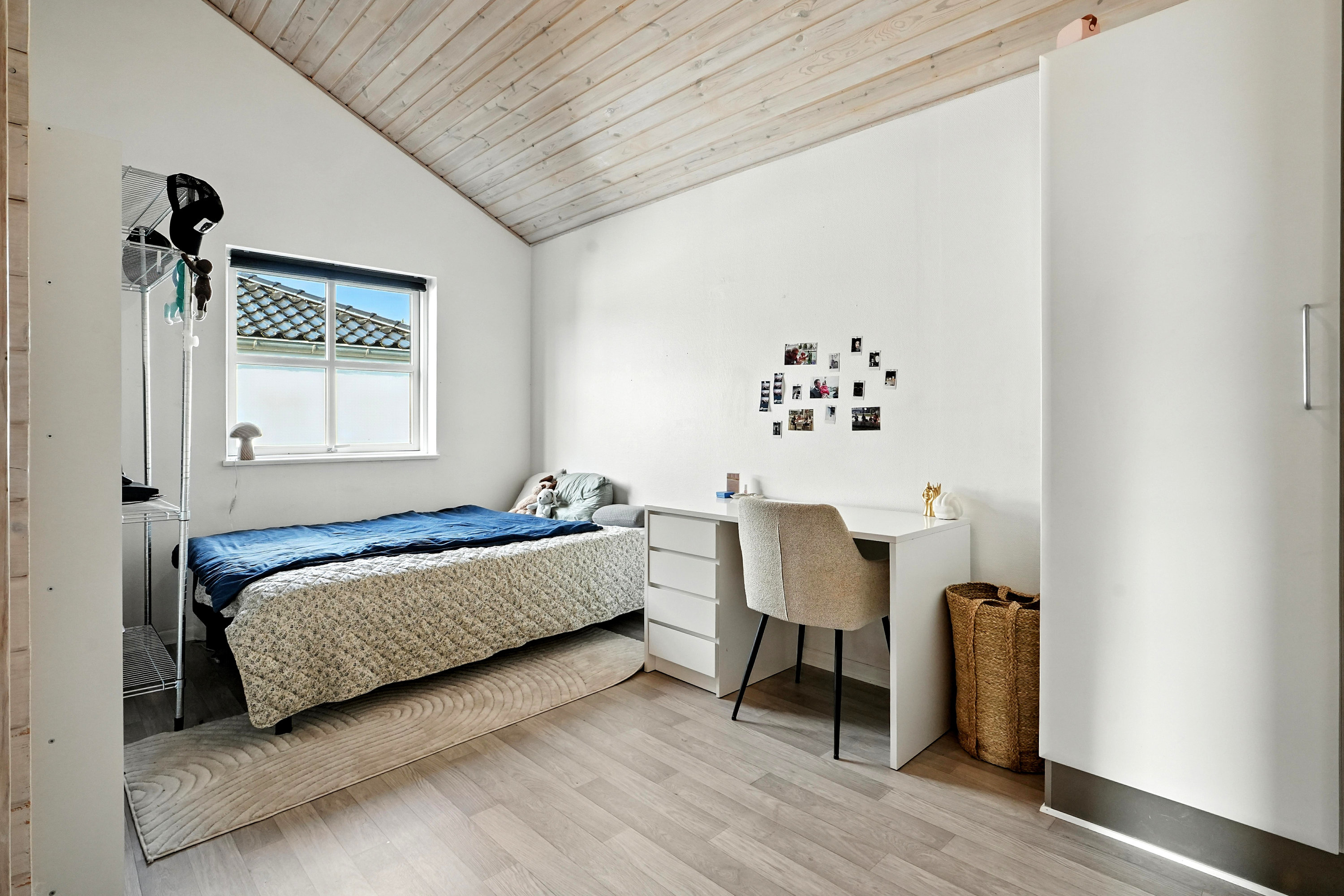 I den ene ende af huset finder du en dejlig forældreafdeling med et rummeligt soveværelse, god skabsplads og eget badeværelse med både spabad og bruseniche – en oplagt privat afdeling, der giver ro i hverdagen. I modsatte ende ligger børneafdelingen med tre gode værelser, hvoraf to har hems, så pladsen udnyttes optimalt. Her er der også adgang til gæstetoilettet, hvilket gør afdelingen både praktisk og funktionel. Fra alrummet er der udgang til en dejlig terrasse og en overskuelig have med masser af plads til leg og boldspil.
