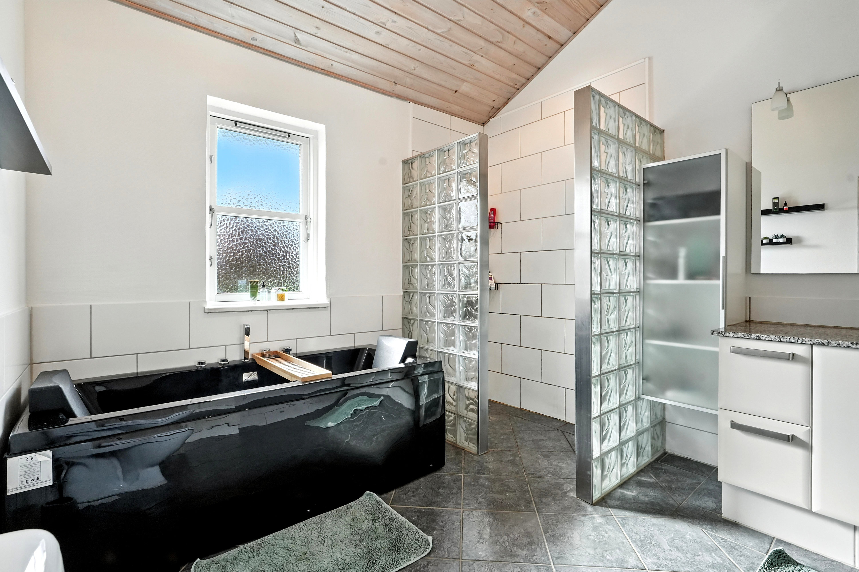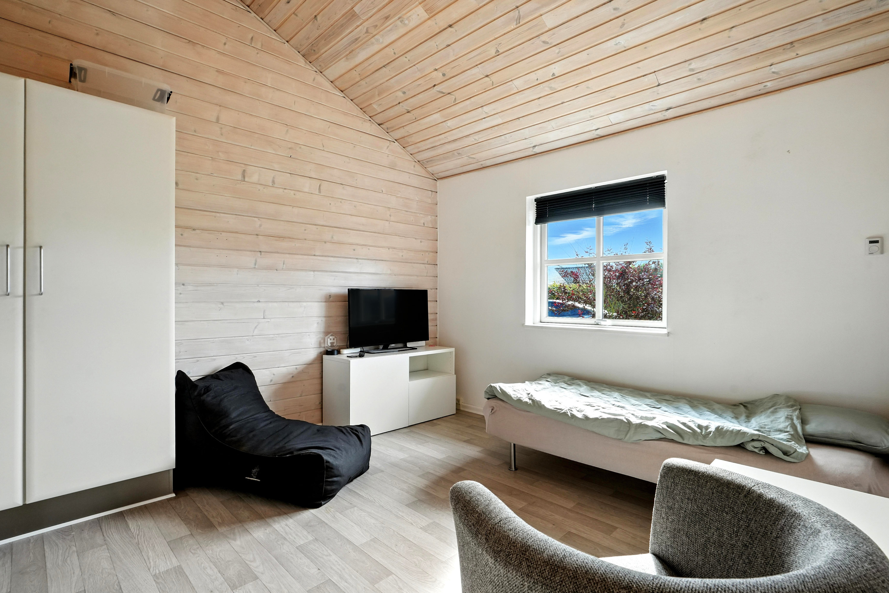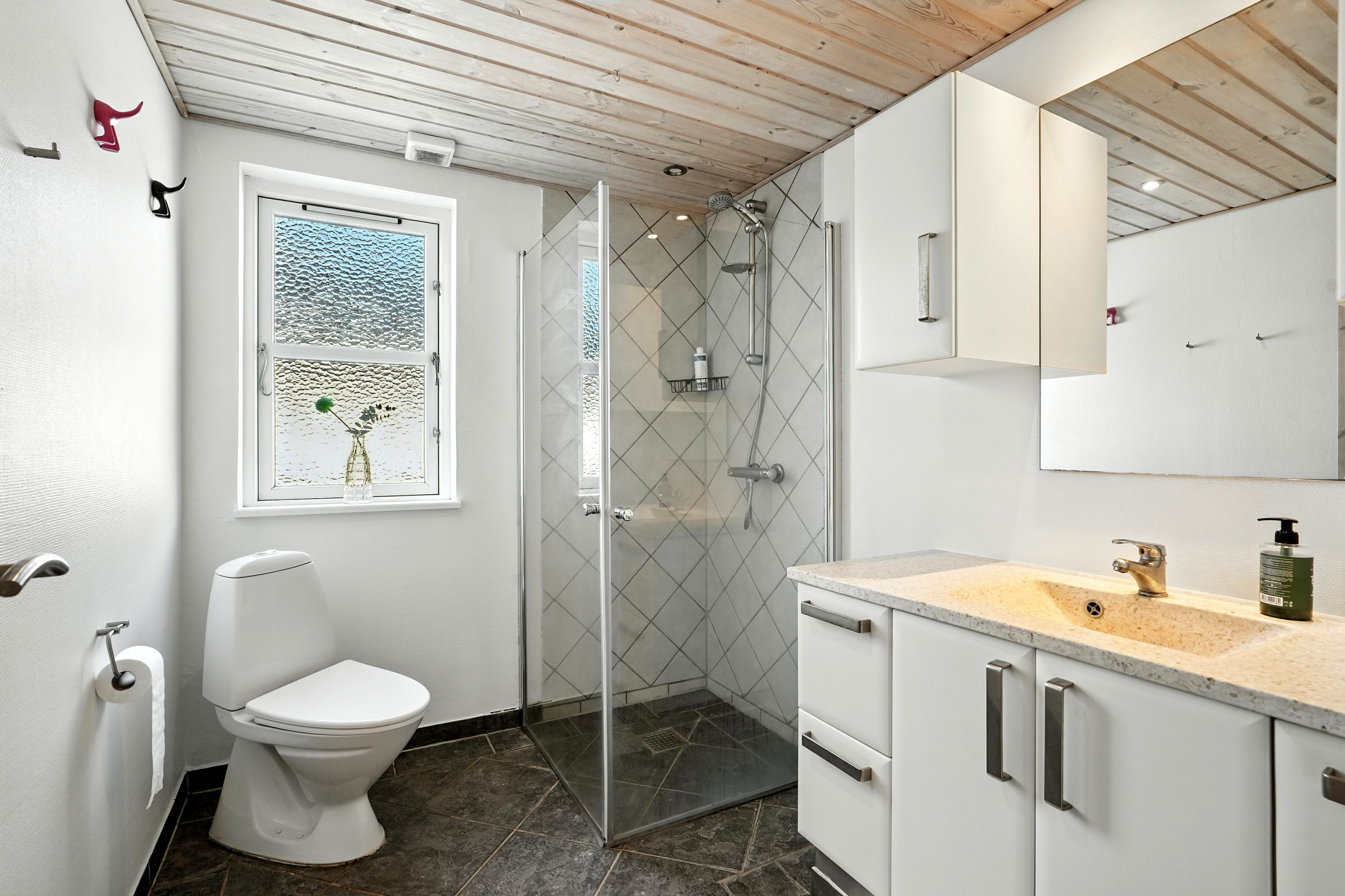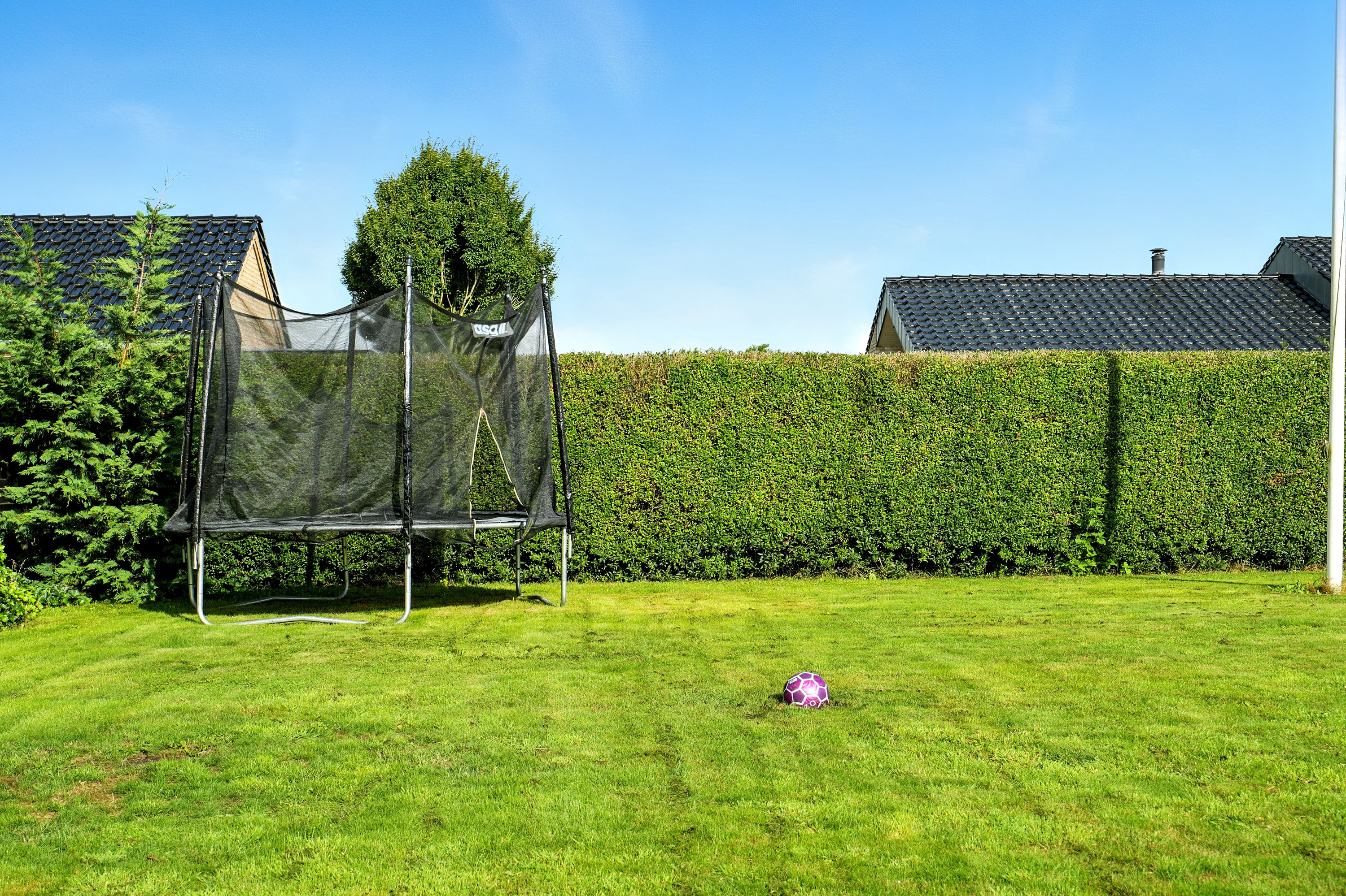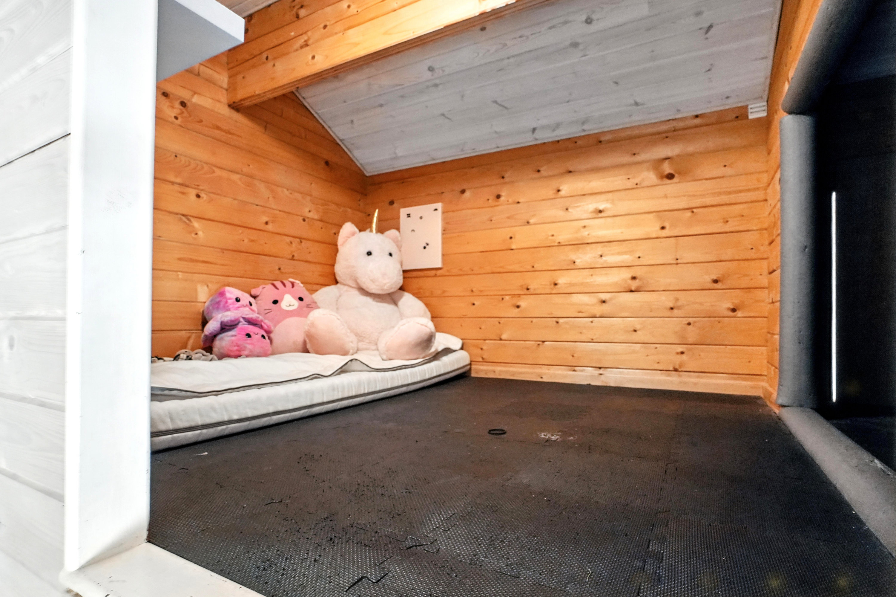 I den ene ende af huset finder du en dejlig forældreafdeling med et rummeligt soveværelse, god skabsplads og eget badeværelse med både spabad og bruseniche – en oplagt privat afdeling, der giver ro i hverdagen. I modsatte ende ligger børneafdelingen med tre gode værelser, hvoraf to har hems, så pladsen udnyttes optimalt. Her er der også adgang til gæstetoilettet, hvilket gør afdelingen både praktisk og funktionel. Fra alrummet er der udgang til en dejlig terrasse og en overskuelig have med masser af plads til leg og boldspil.