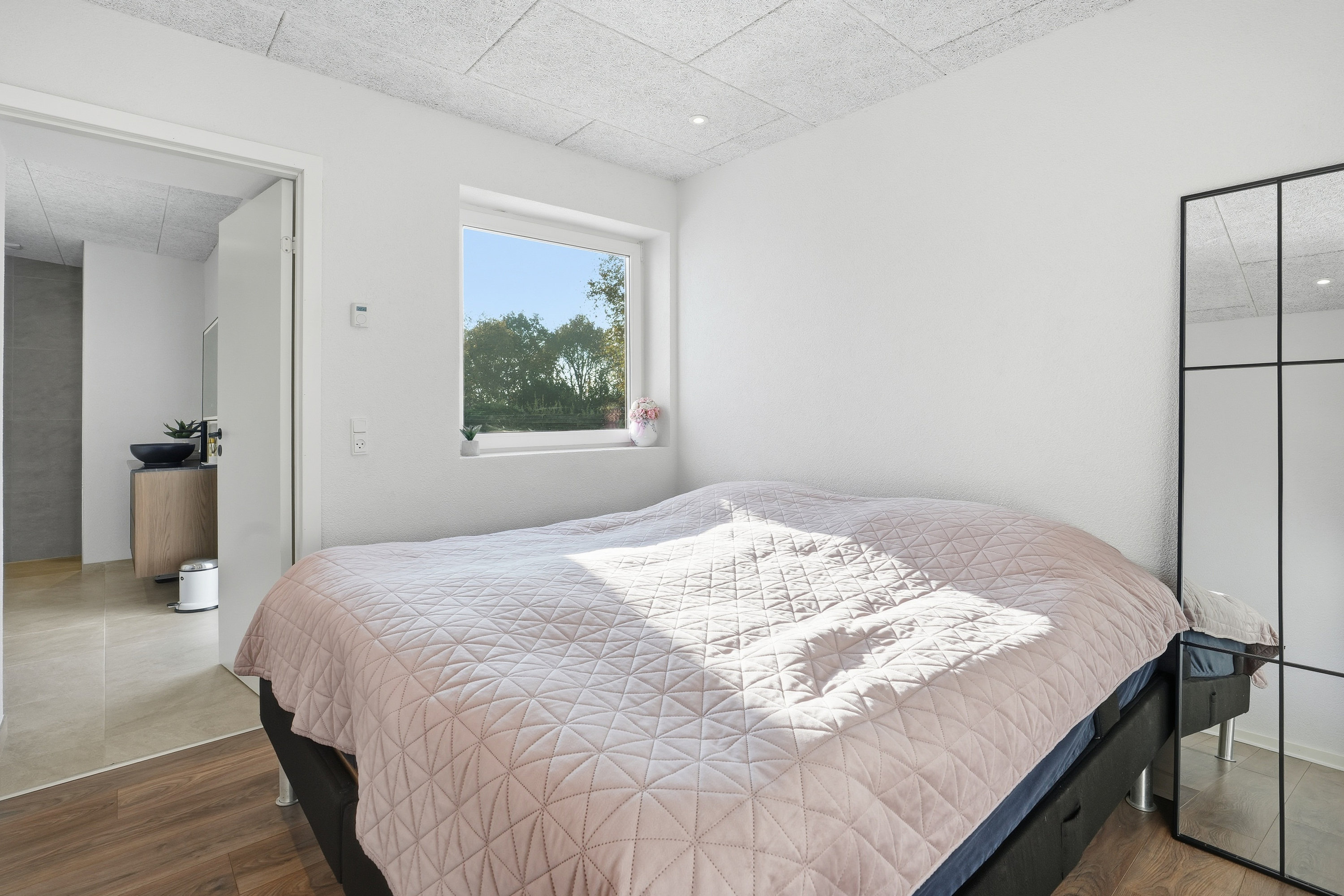 I forlængelse af entréen er der et stort soveværelse. Herfra har man direkte adgang til et imponerende badeværelse med dobbelt bruseniche.