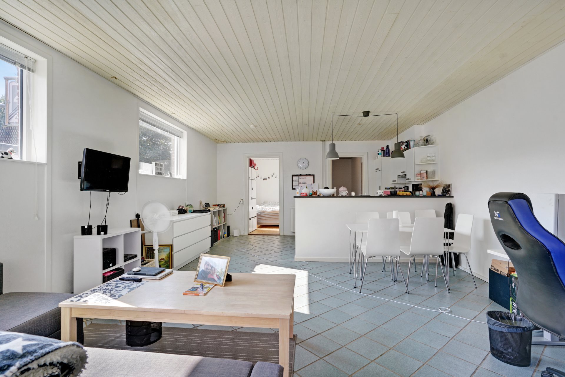 1. salen et stort rummeligt værelse, perfekt som teenageafdeling. I forlængelse af værelset har man et rummeligt køkken med god plads til et spisebord. Ved siden af køkkenet er lejlighedens toilet også at finde.