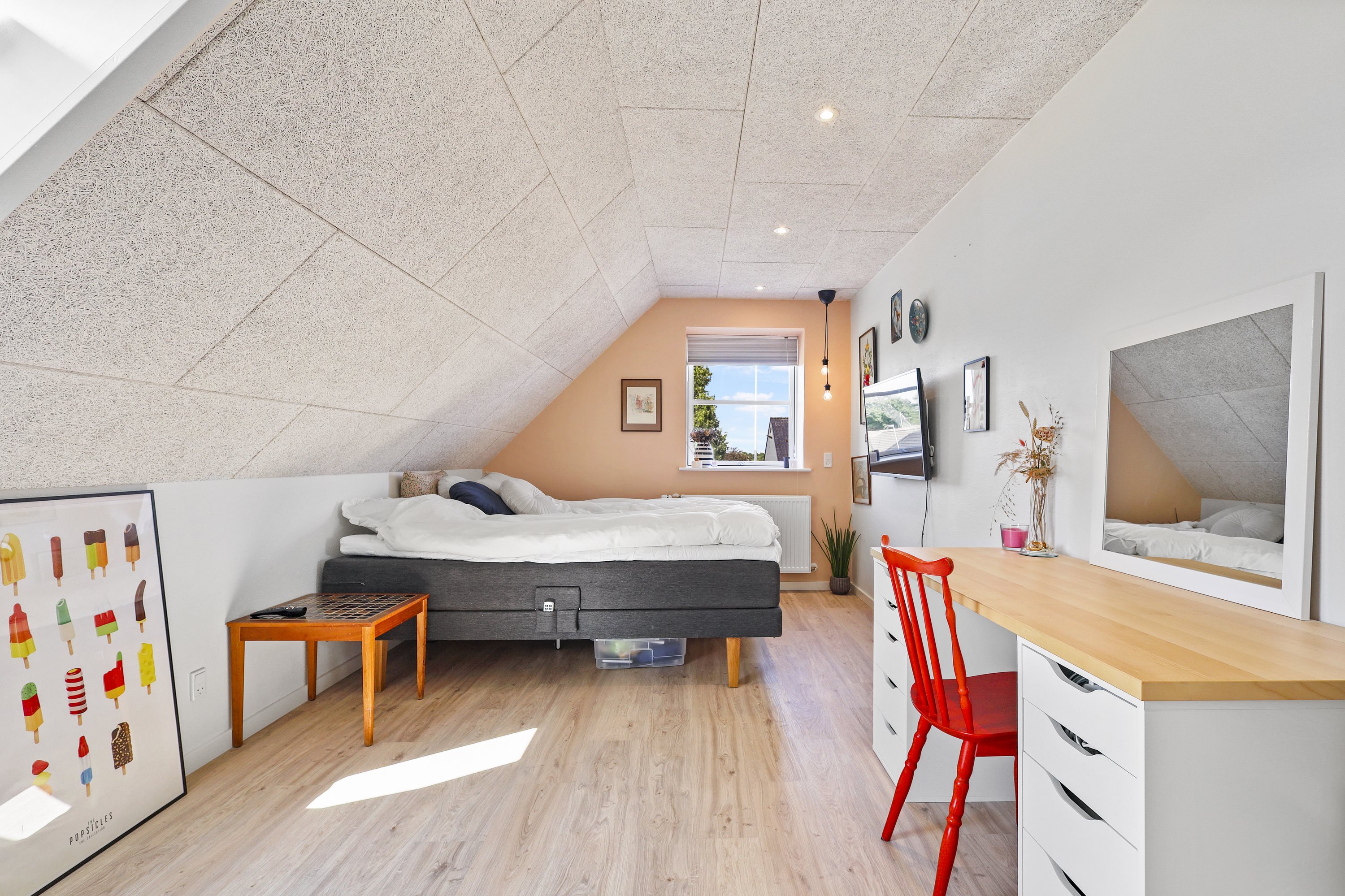 Med sine 4 værelser + den store stue er dette hjem som skabt til at rumme både hverdagslivet og de særlige øjeblikke, der binder familien tættere sammen. Husets hjerte er den rummelige og lyse stue, som indbyder til fællesskab og hyggelige aftener foran brændeovnen. Fra stuen er der adgang til en charmerende udestue, hvor man kan nyde udsigten til haven, året rundt.