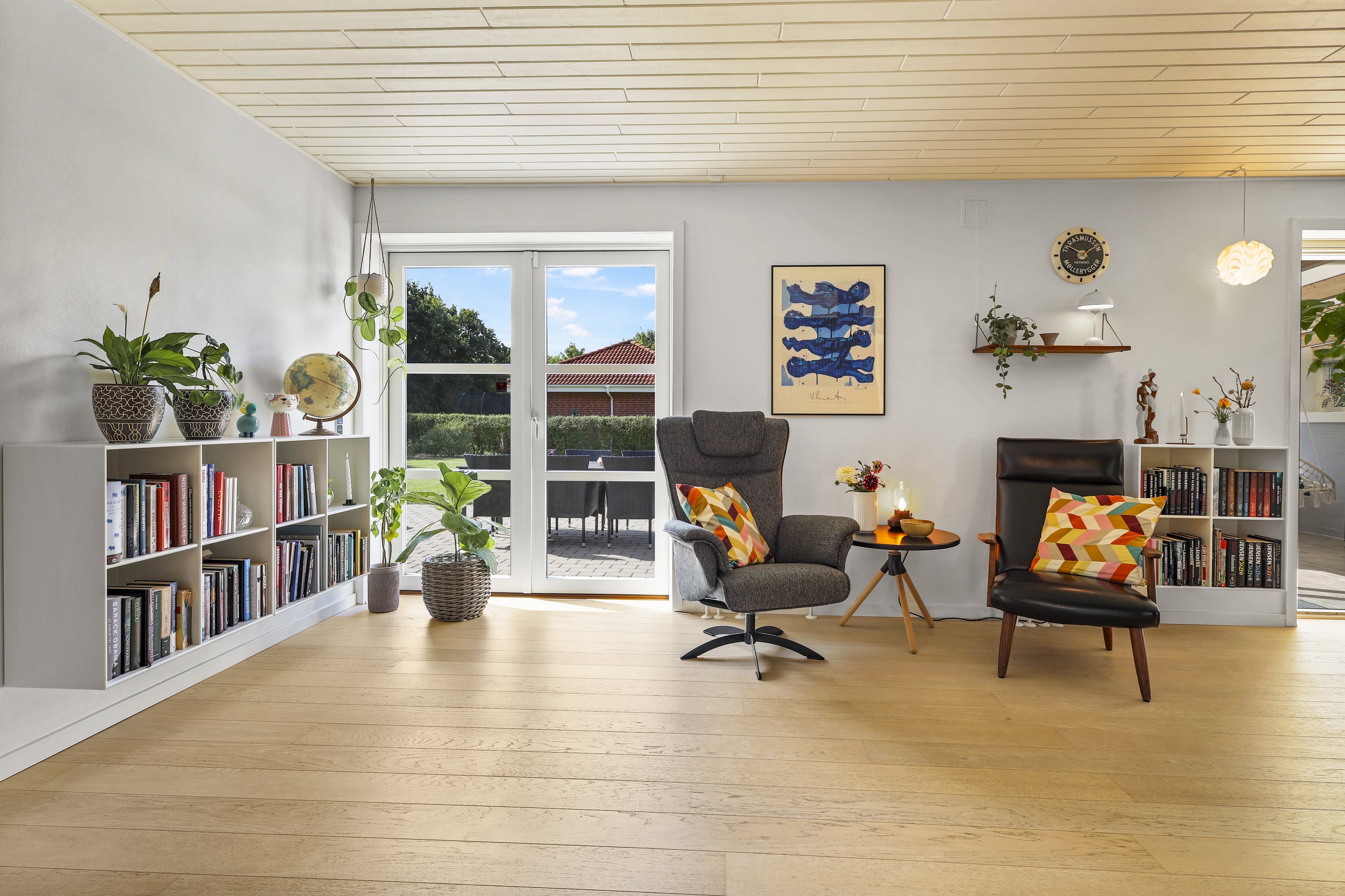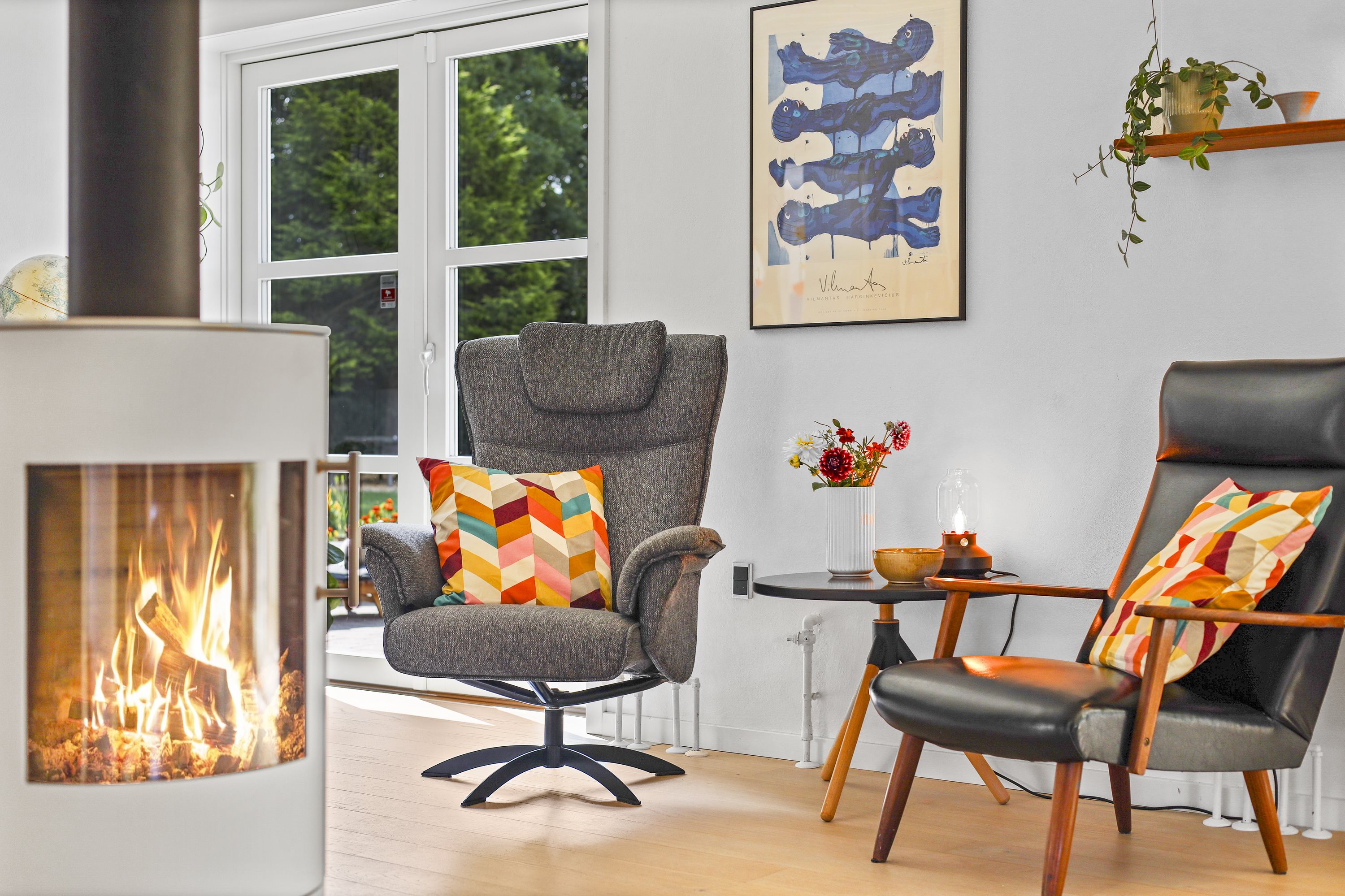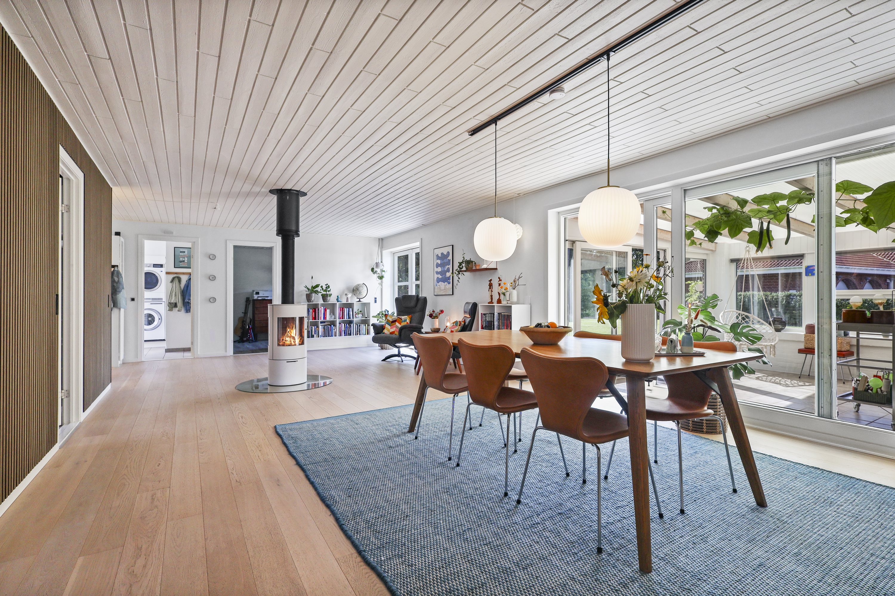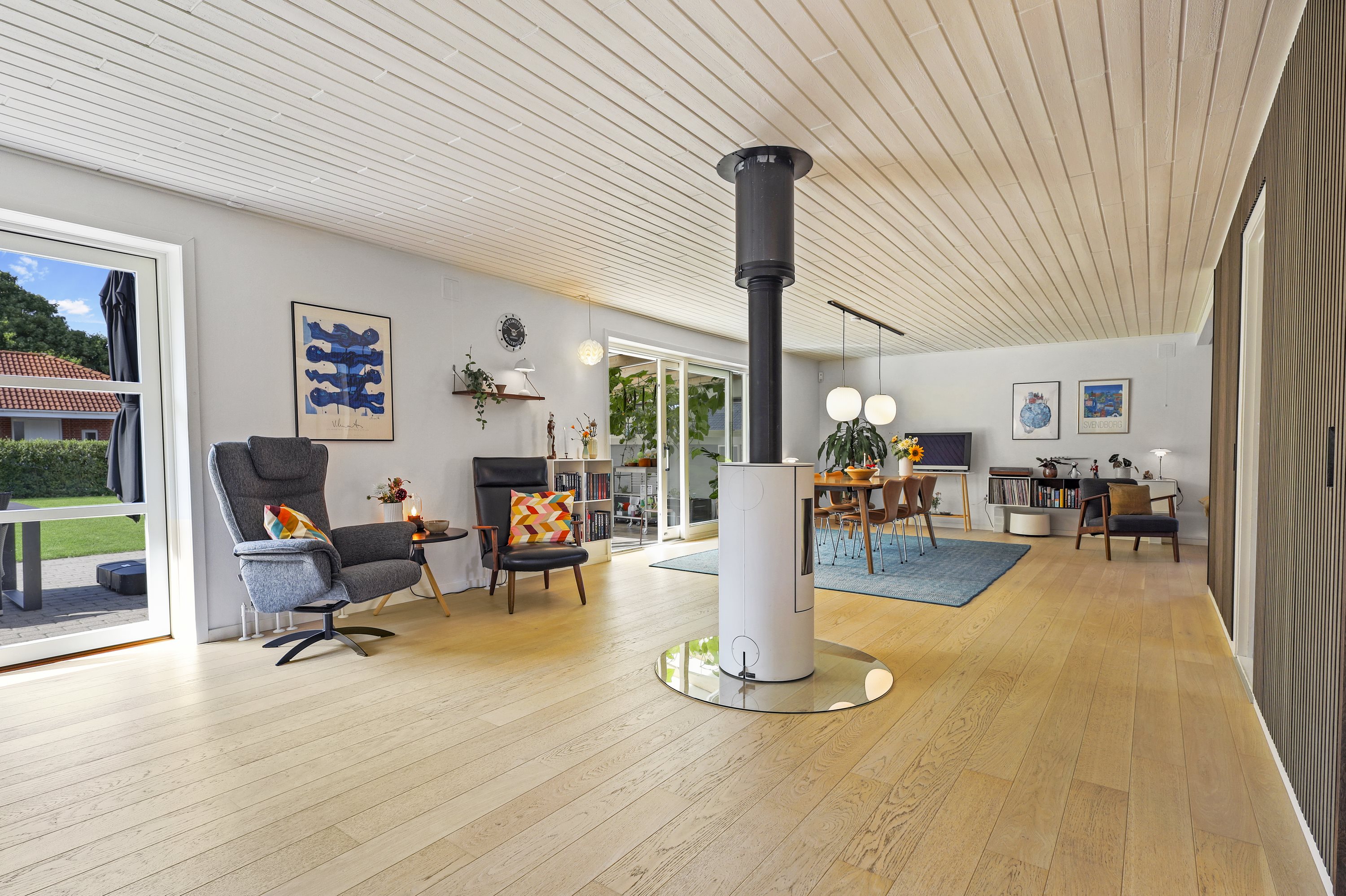 Når vinteren melder sig, er det brændeovnen som er samlingsstedet, som passer perfekt ind i den store åbne stue.