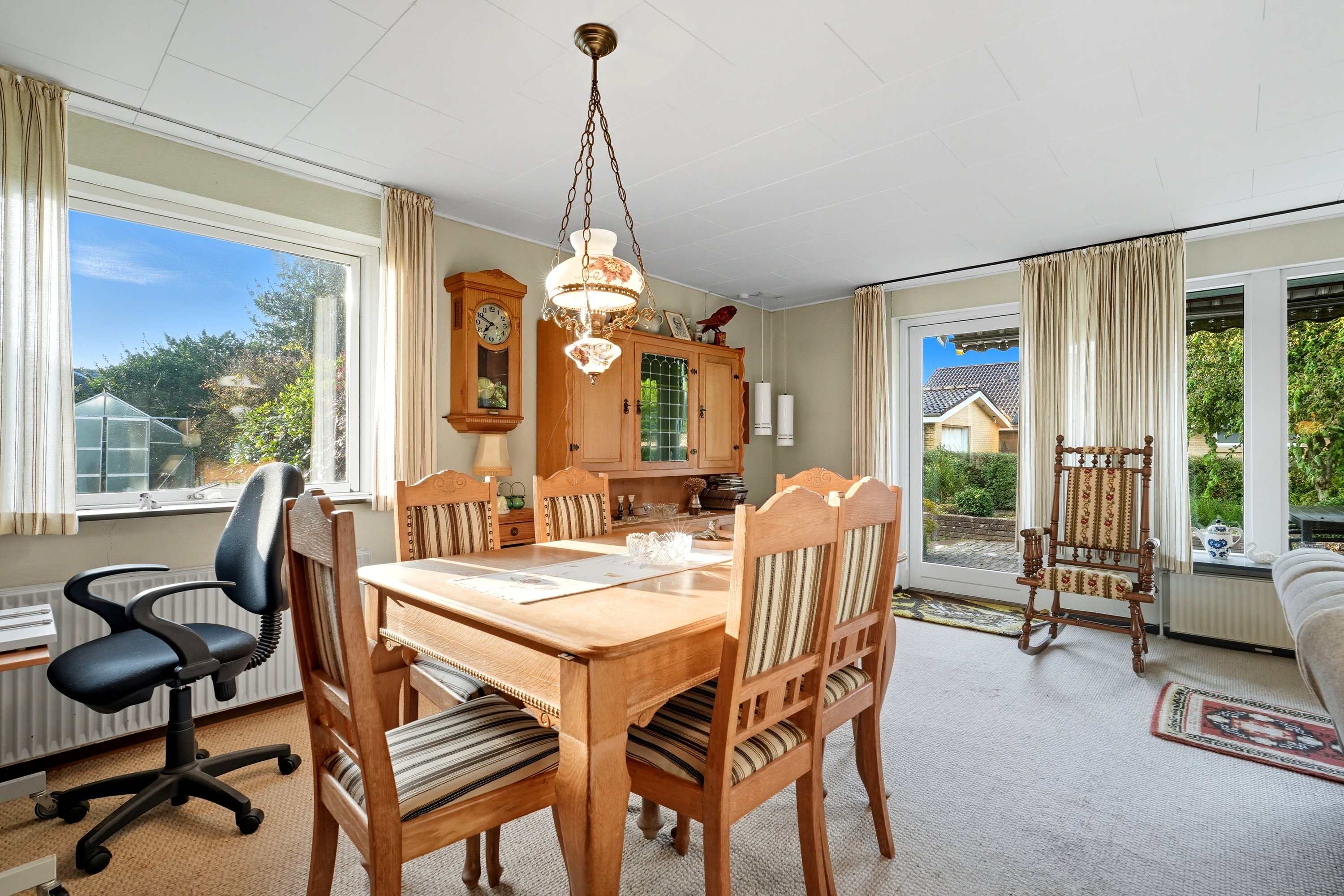 En anden oplagt mulighed, ville være at undersøge muligheden for at åbne op mellem køkken og stue, og på den måde skabe et stort, lyst køkken/alrum, hvor familie og venner kan samles. Hermed vil man samtidig kunne nyde det flotte gennemgående lysindfald fra vinduerne mod terrassen og haven. Fra stuen er der direkte udgang til terrassen, hvor man kan nyde solen det meste af dagen og samtidig have et godt kig til den nemt anlagte have.