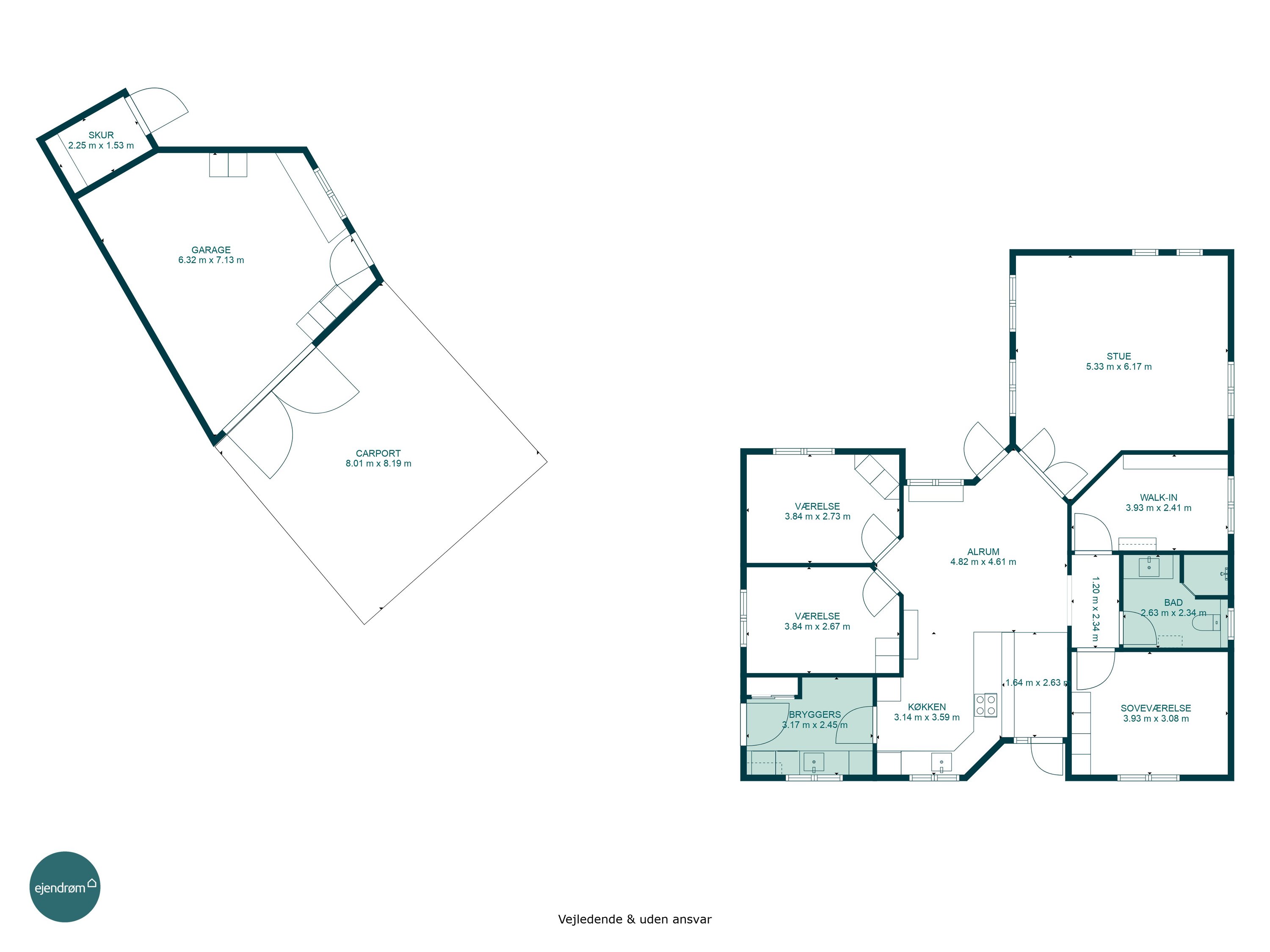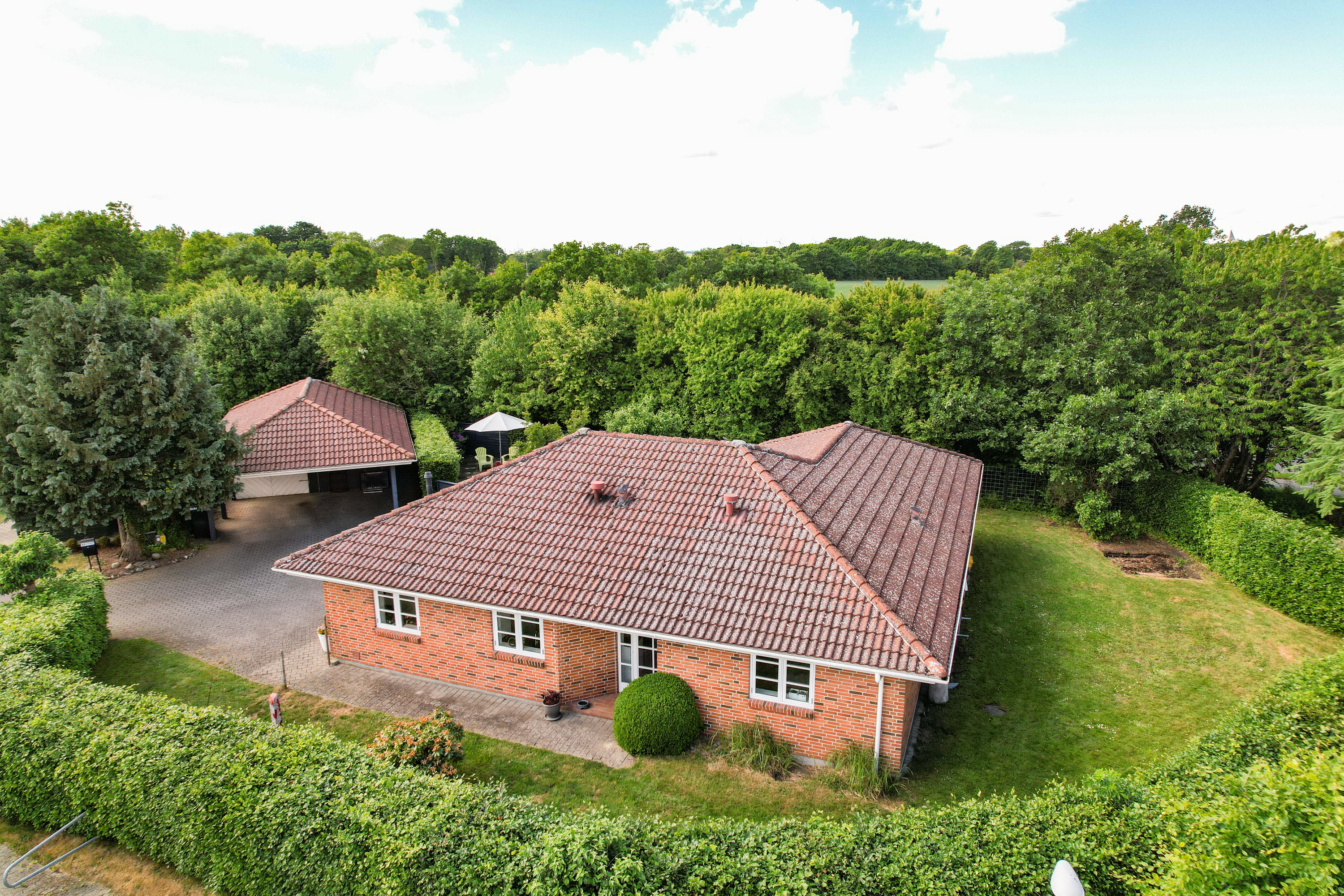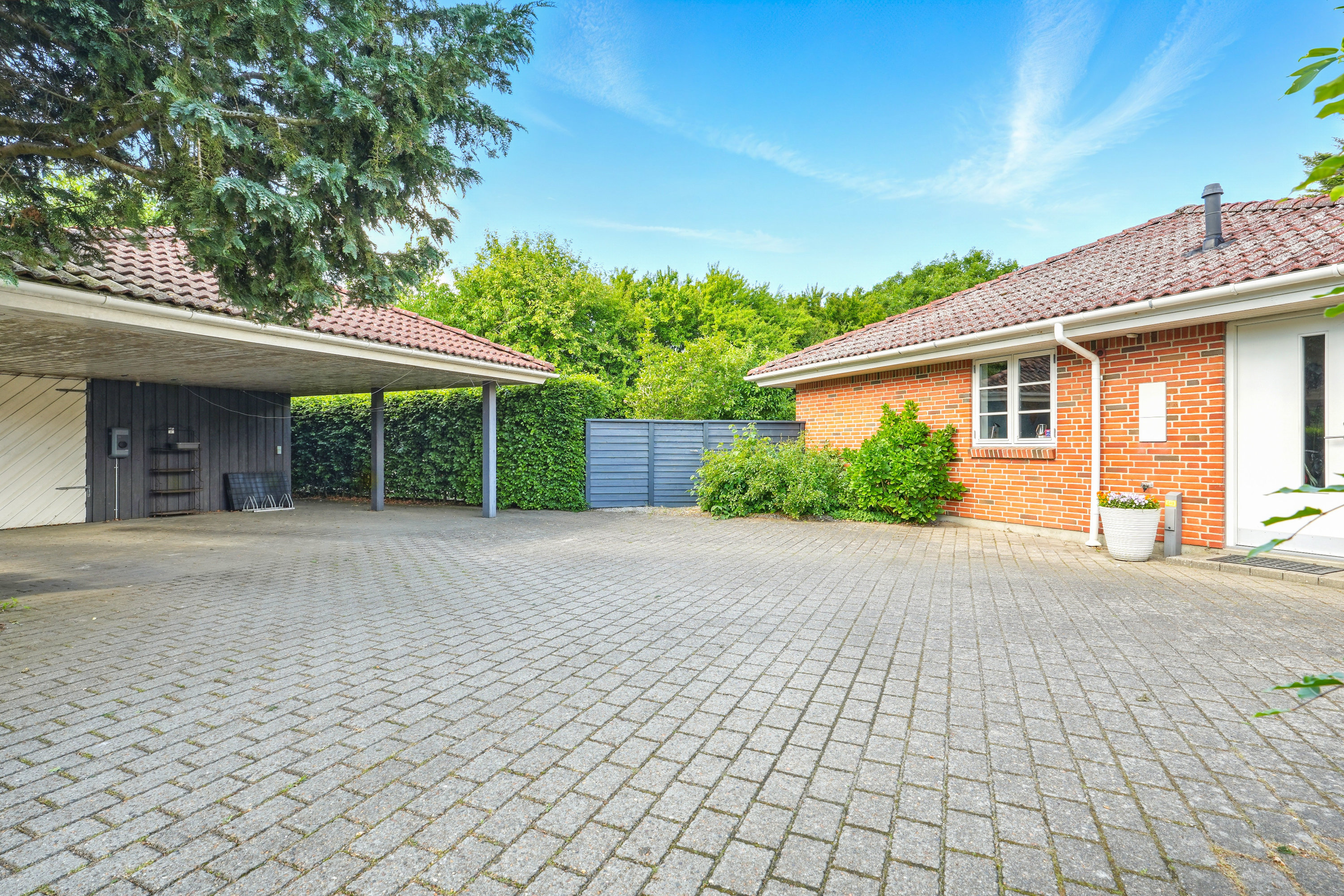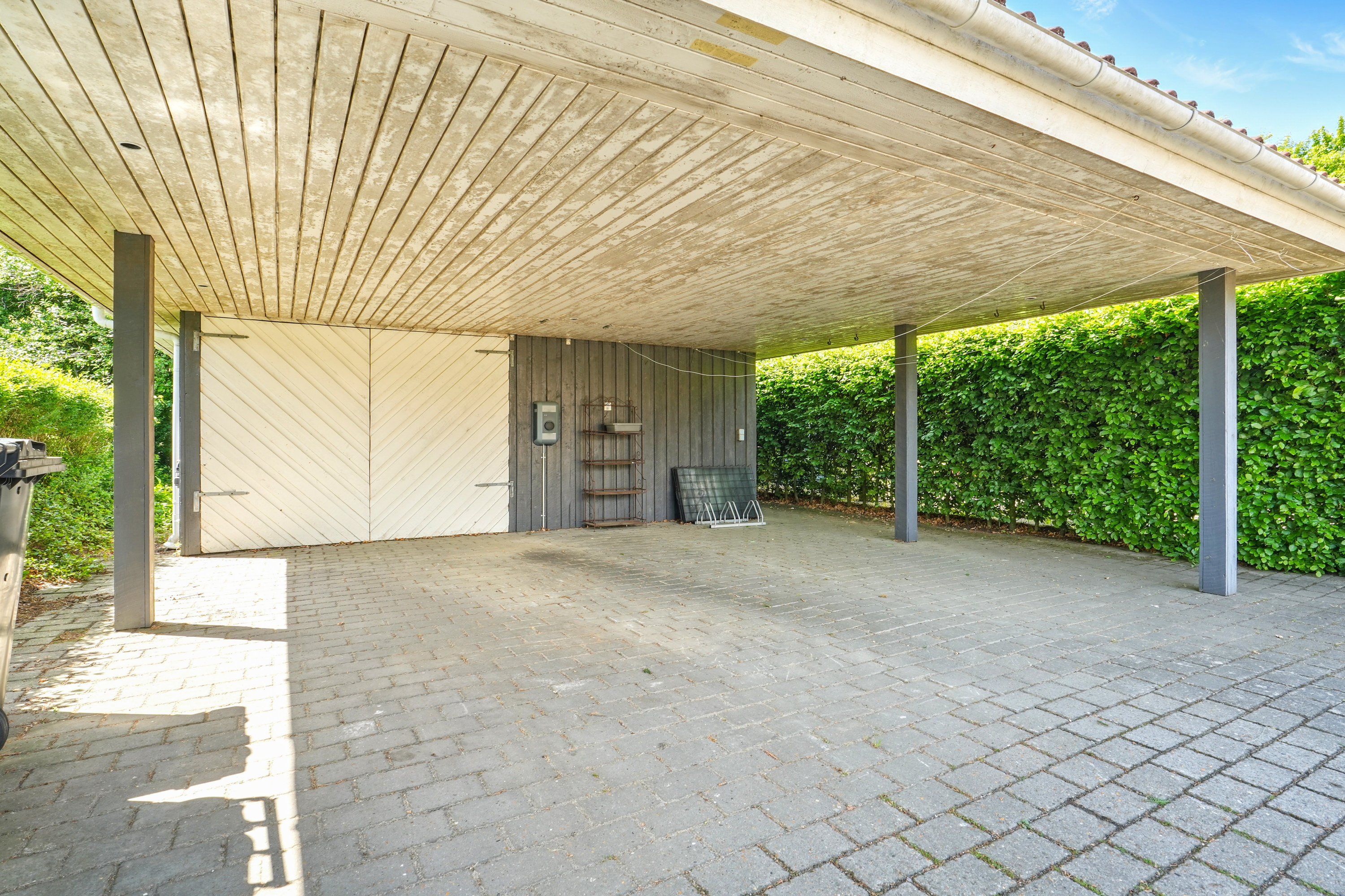Til ejendommen hører en stor, integreret carport og garage på hele 59 m². Her er rigeligt med plads til bil, opbevaring, værksted og hobbyprojekter – ideelt for den pladskrævende eller praktisk anlagte.