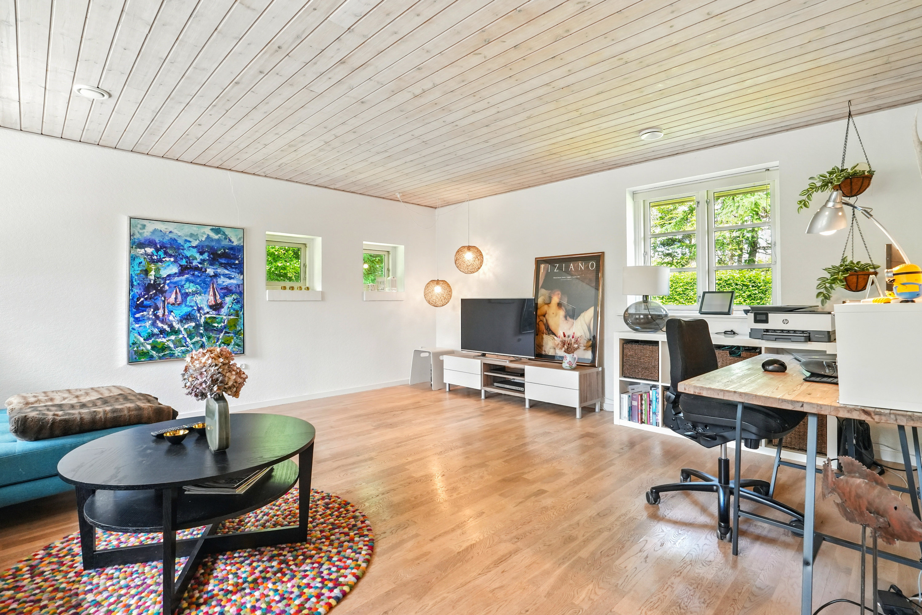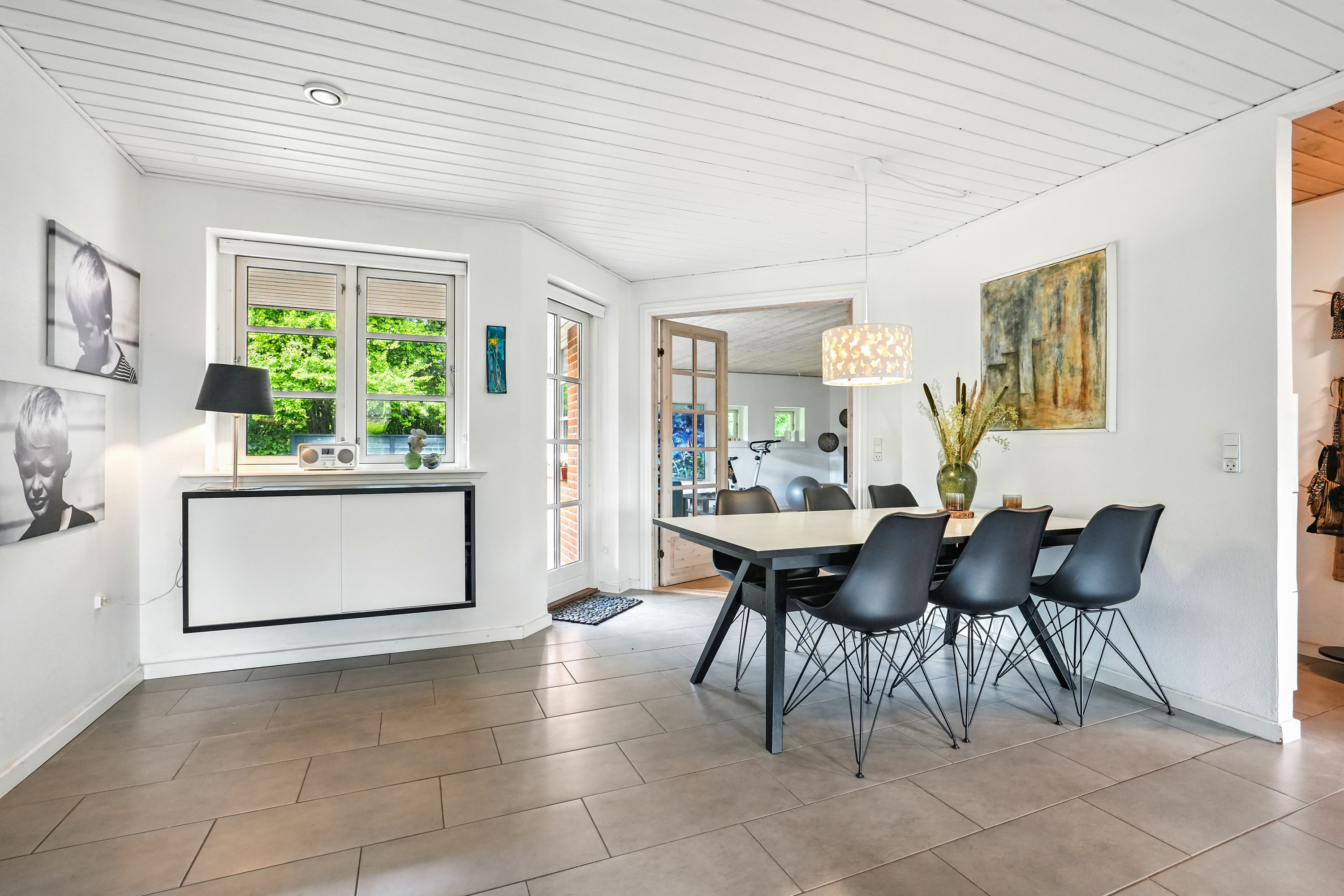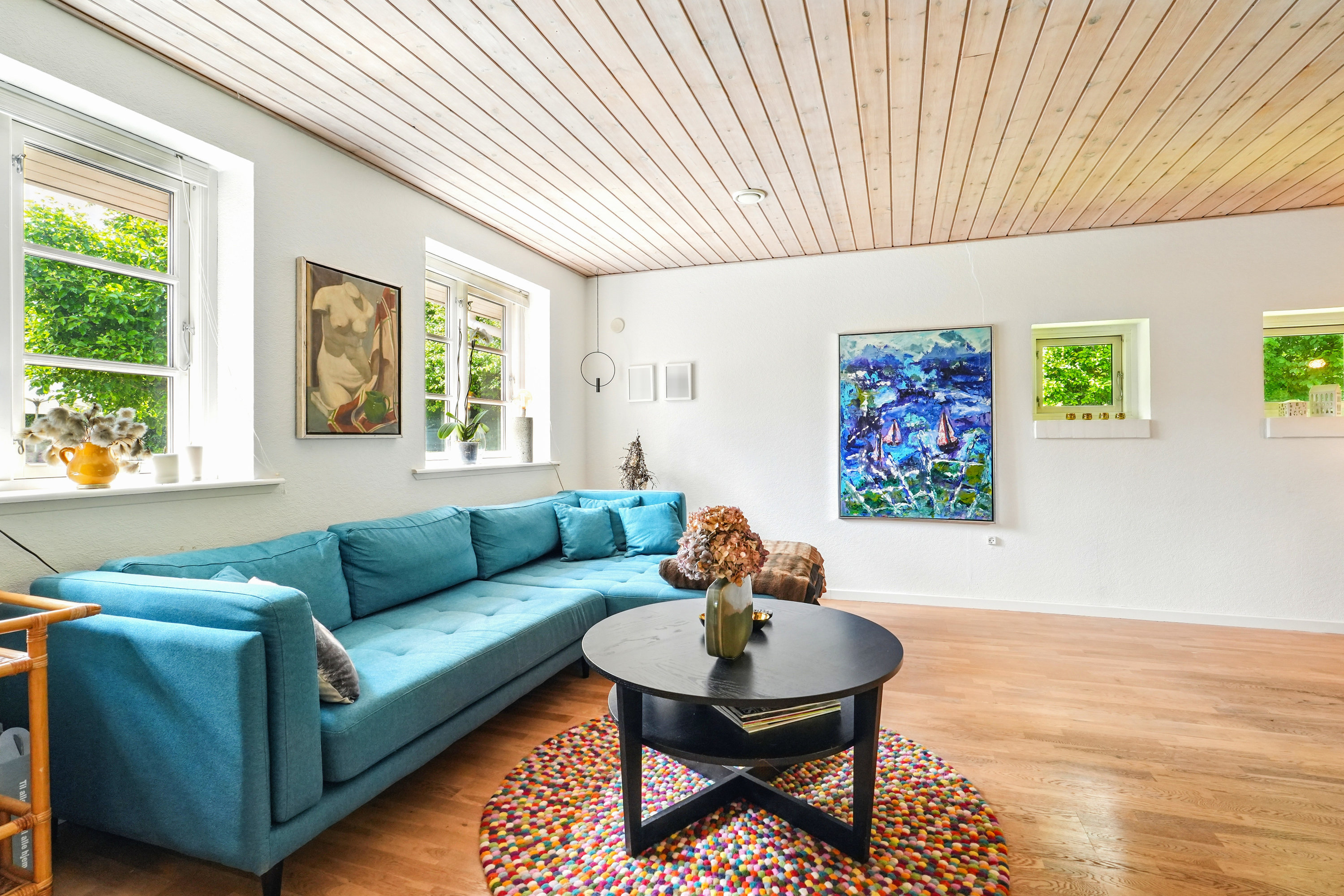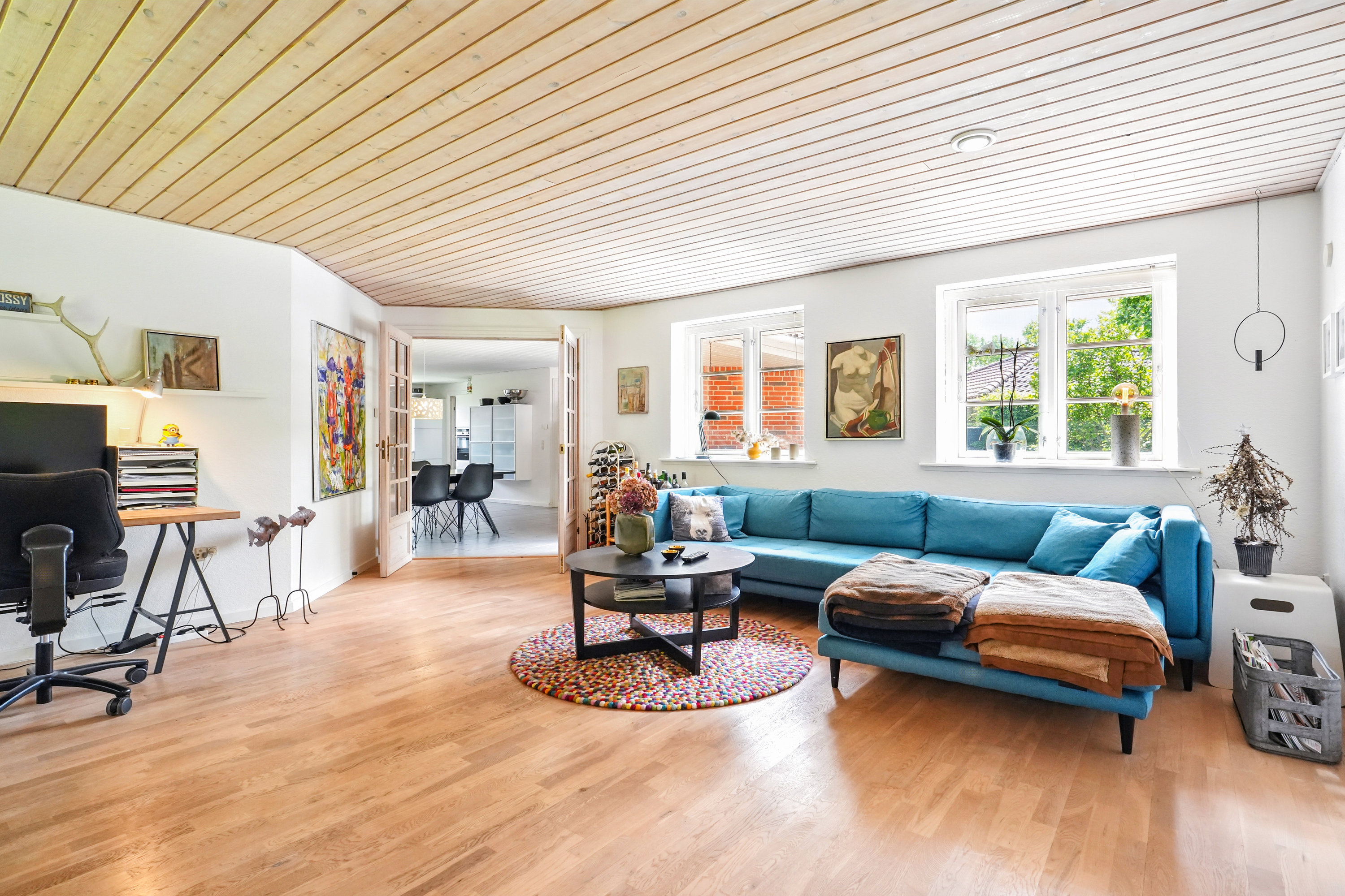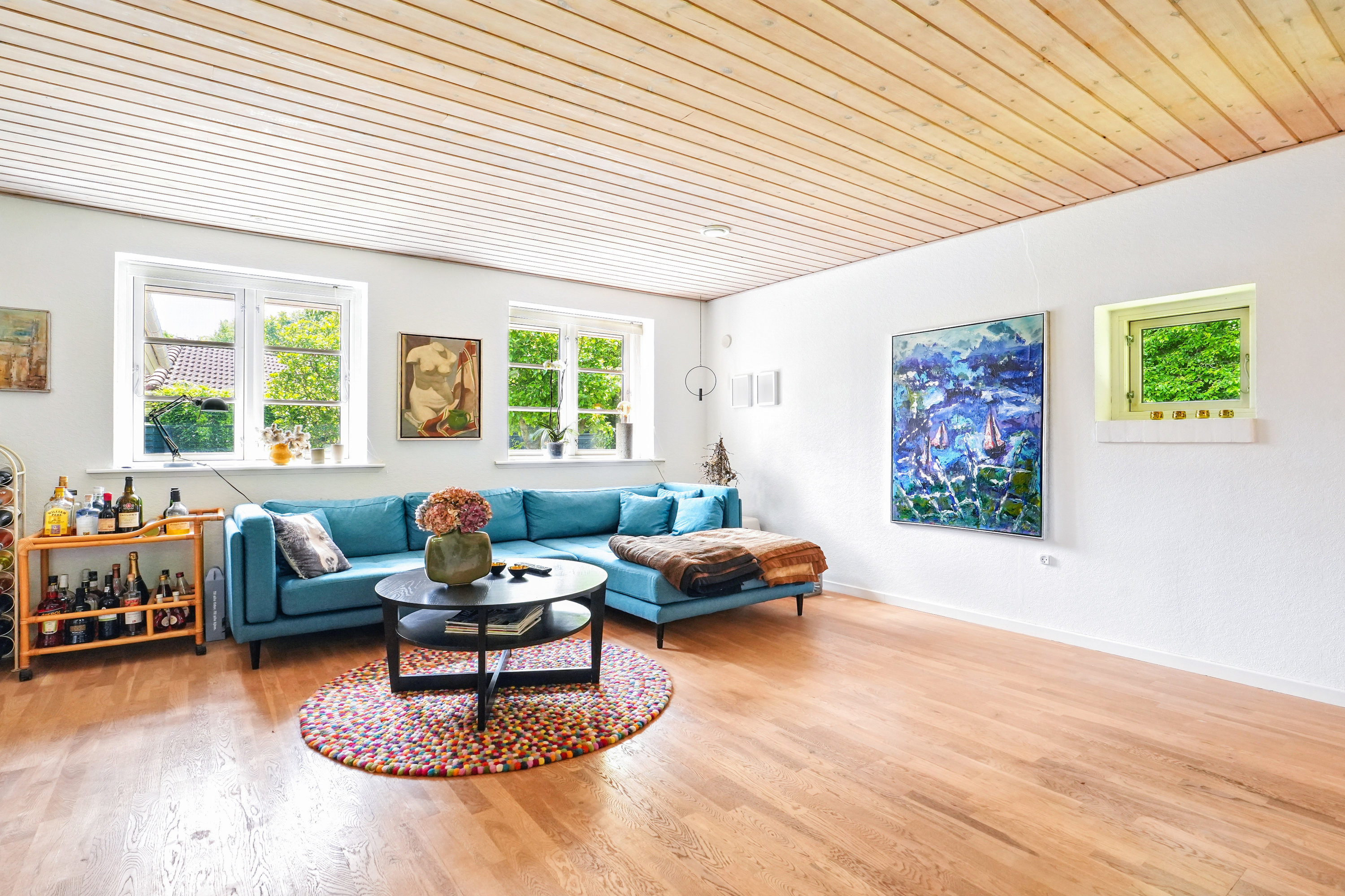 Fra alrummet er der videre adgang til villaens rummelige og møbleringsvenlige stue med masser af plads til at indrette et hyggeligt sofaarrangement.