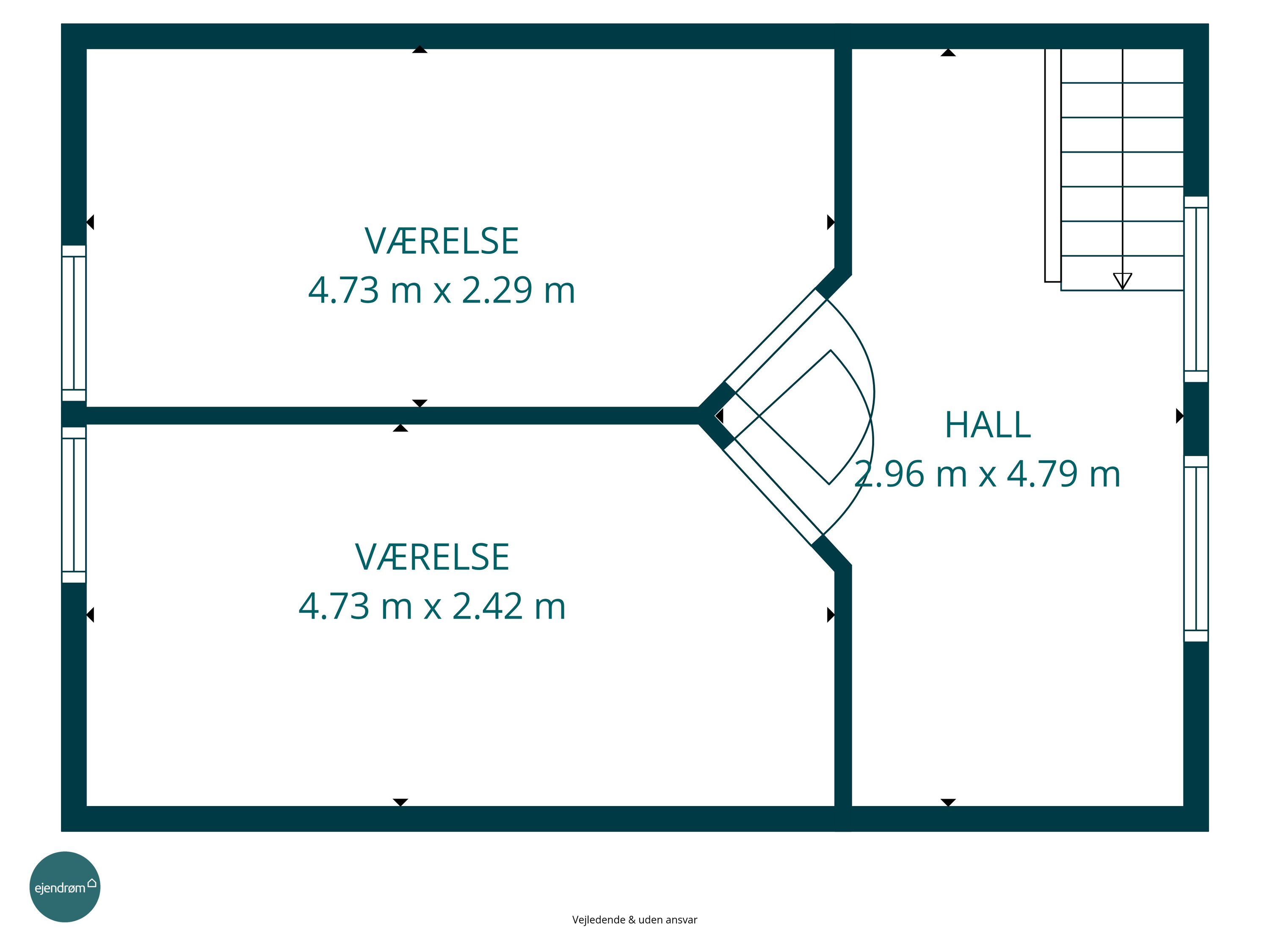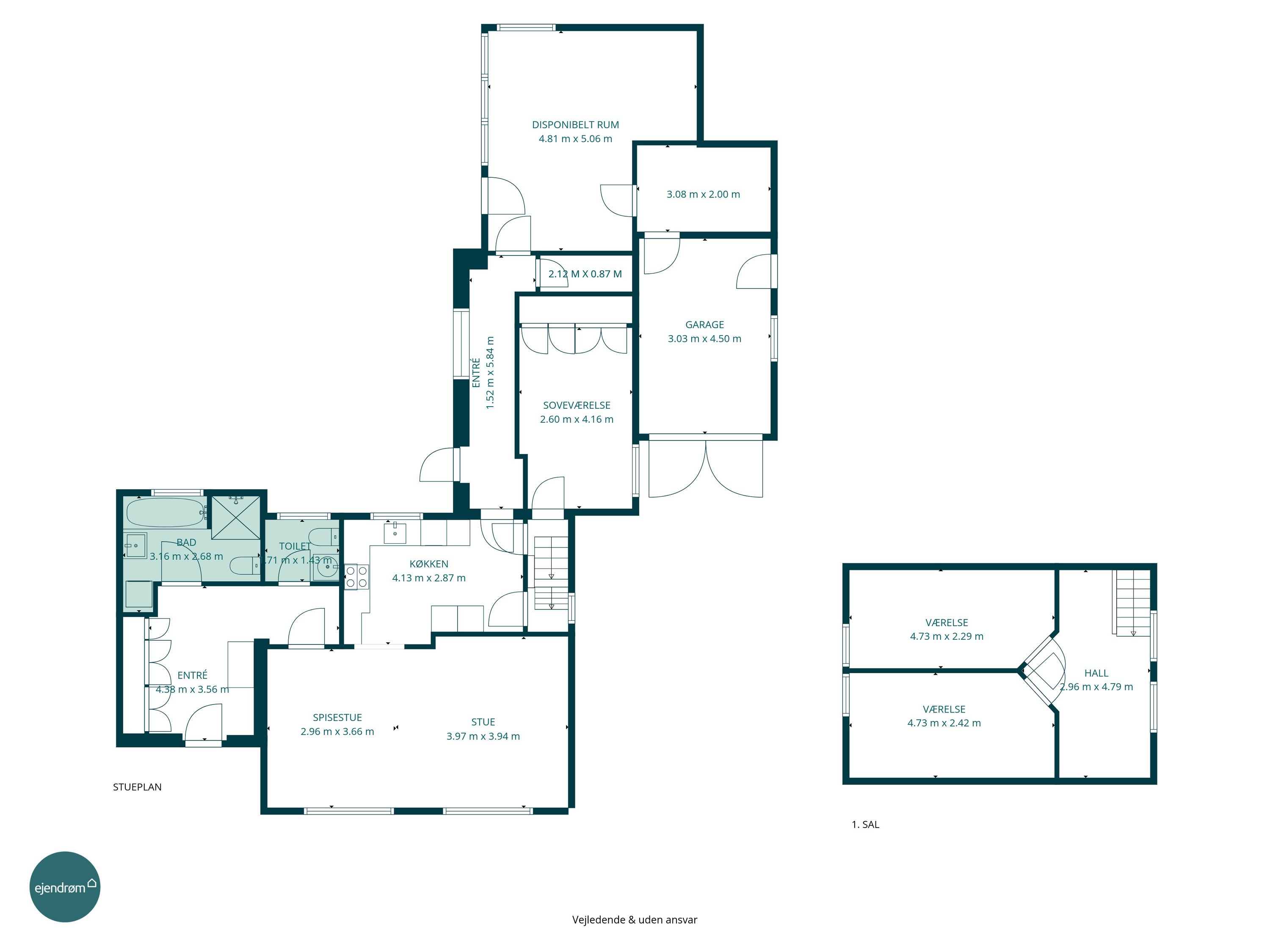 På 1. salen, som blev lavet helt om i 2014, finder du to gode og regulære værelser samt repos. Etagen fremstår lys og indbydende og er ideel som børne- eller teenageafdeling. Her kan repoen med fordel også anvendes som et funktionelt kontor.