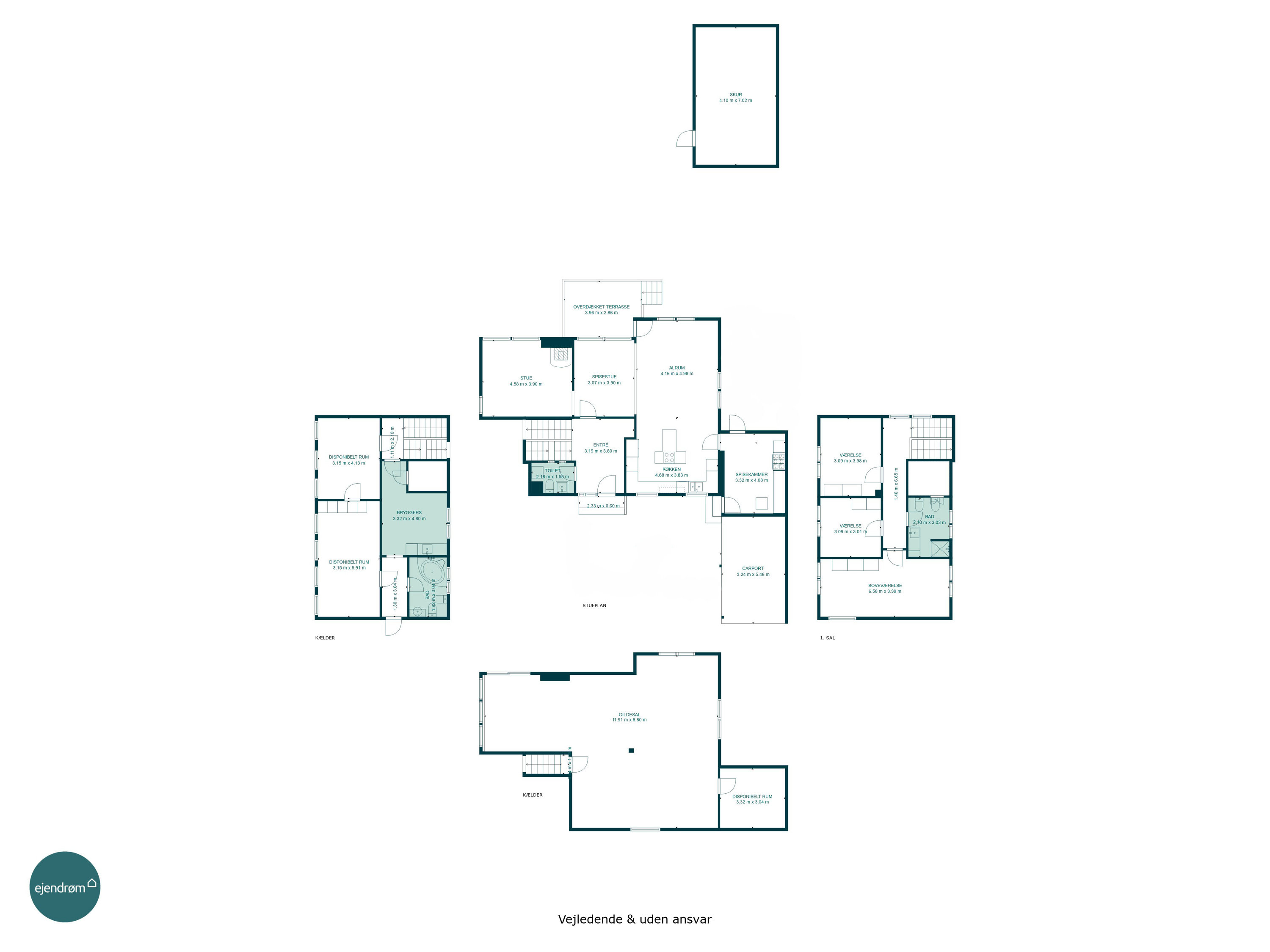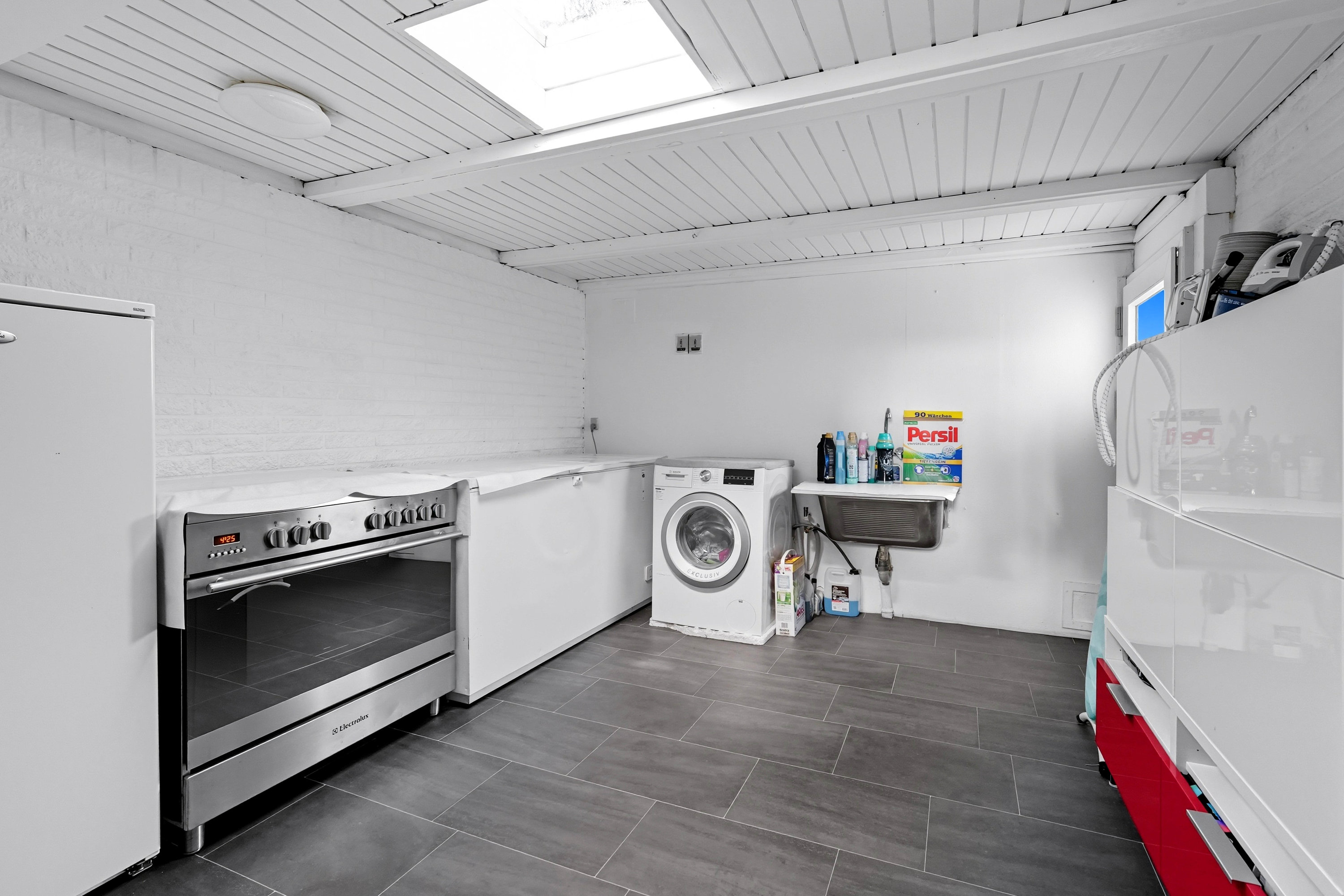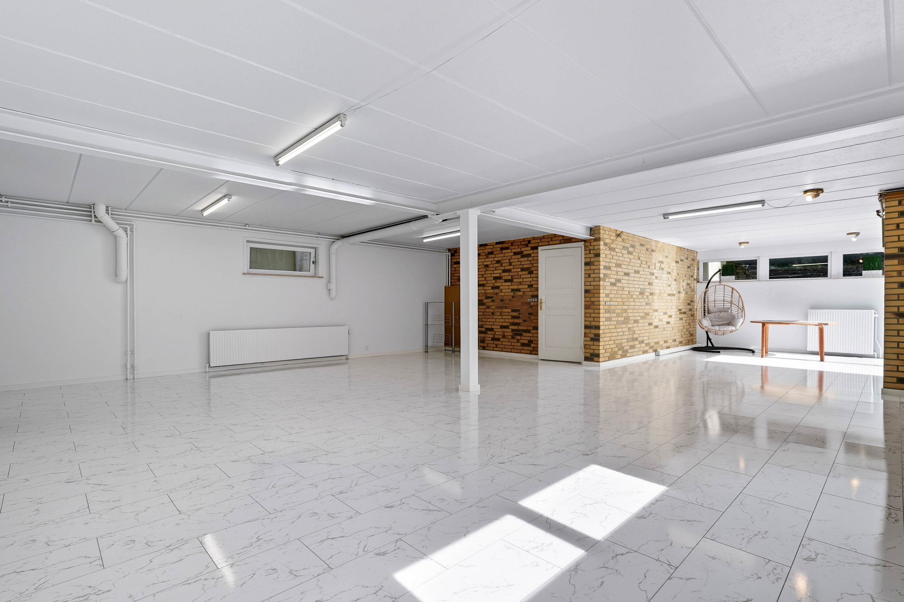 I kælderen får I ekstra mange muligheder: Her ligger den store gildesal, som kan danne rammen om alt fra fødselsdage og konfirmationer til hyggeaften med venner. I forlængelse heraf findes to disponible rum, som nemt kan anvendes til hobbyrum eller opbevaring. Kælderen rummer desuden yderligere depotplads og teknikrum.