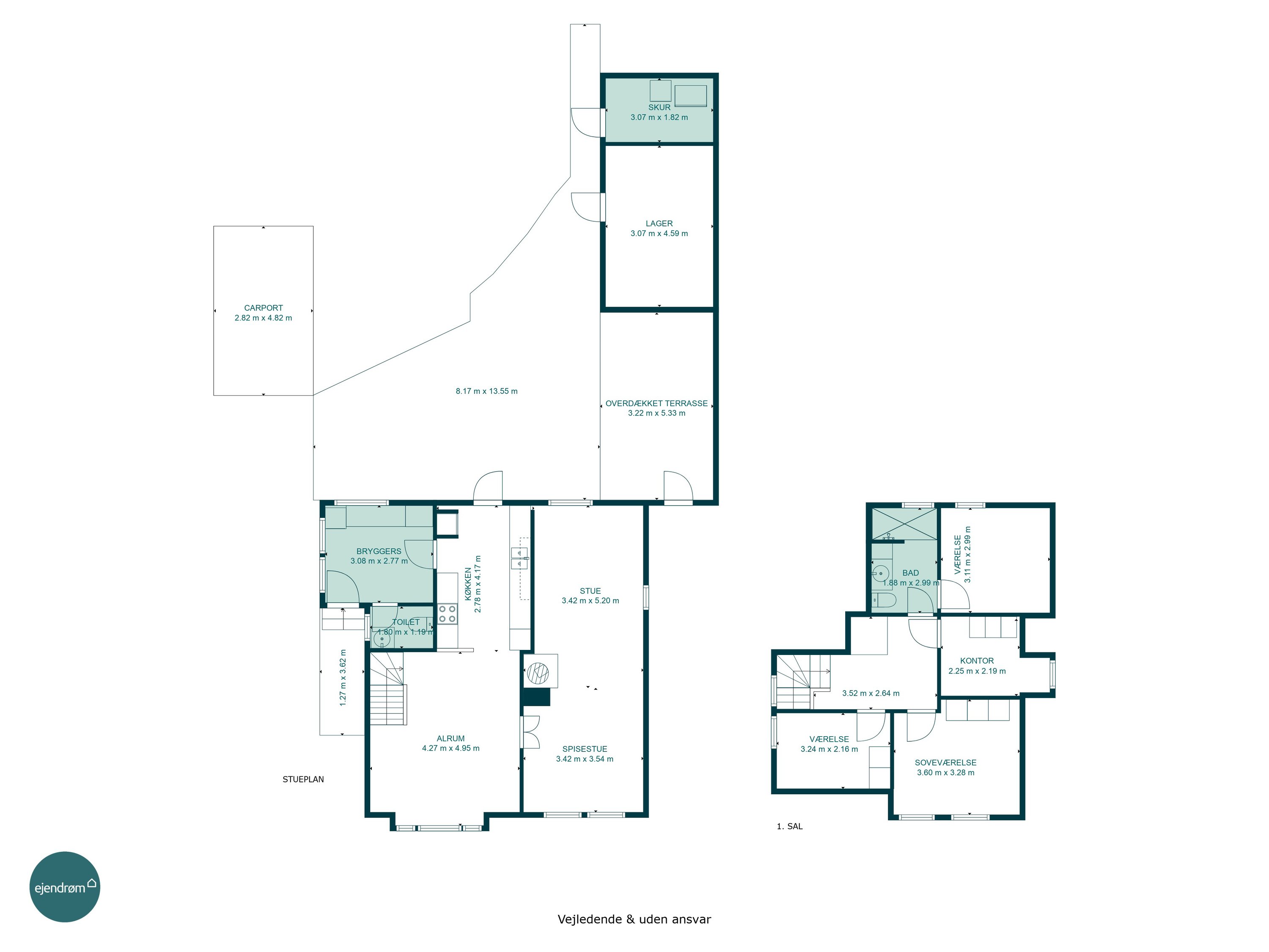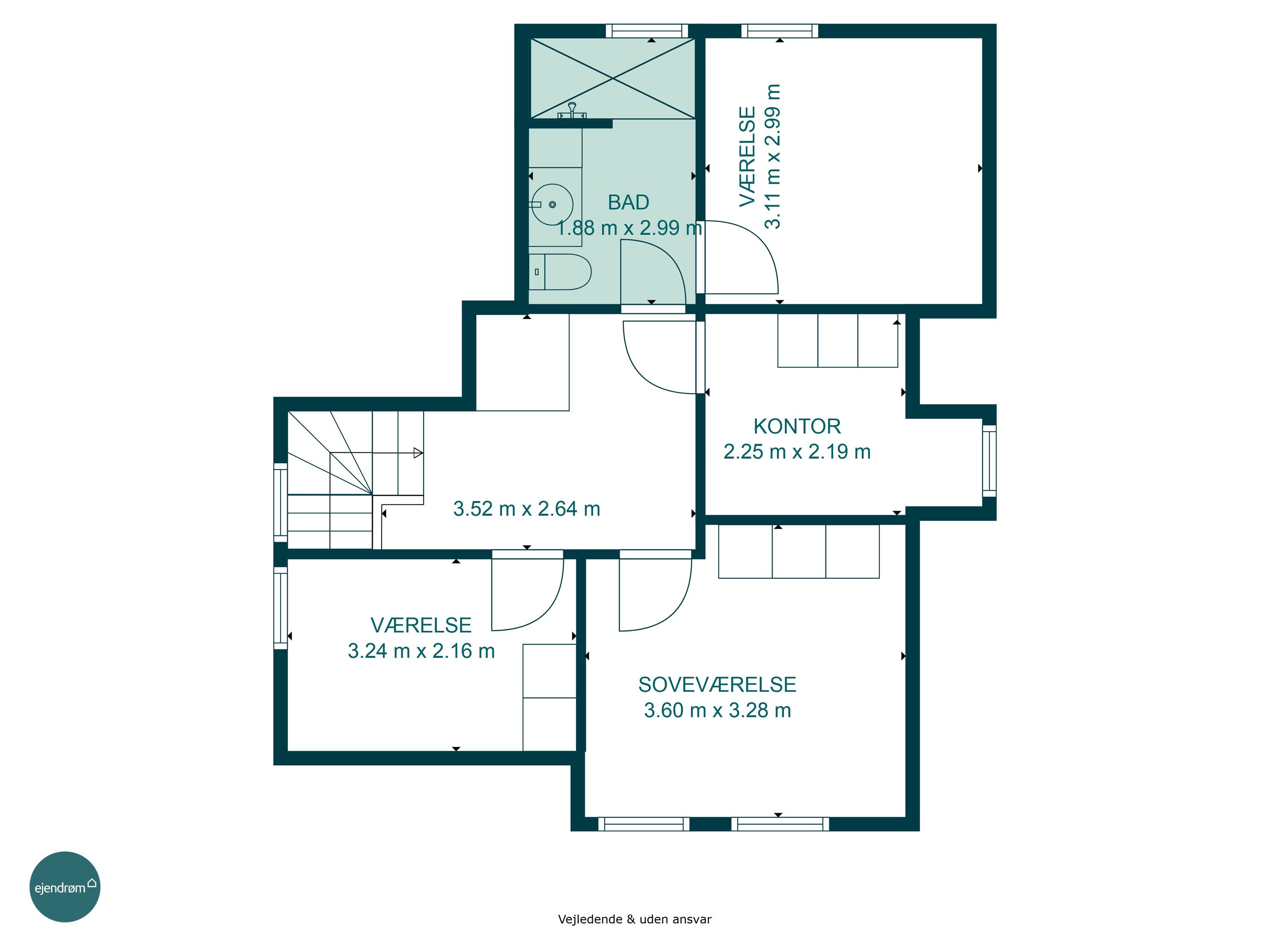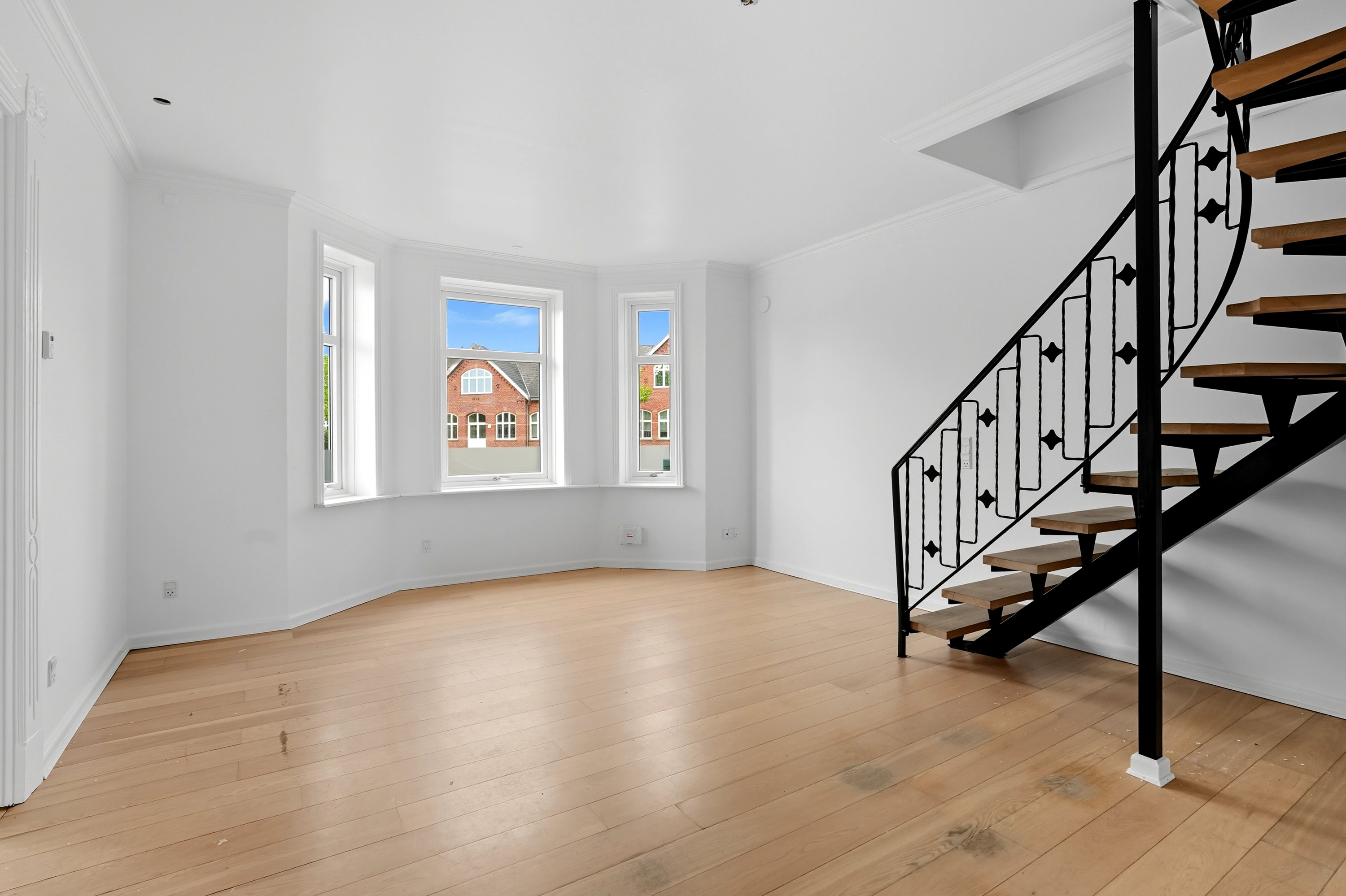 1. salen er værelsesafdelingen med i alt 4 værelser. Her er mulighed for den store og pladskrævende familie, mens der desuden er fundet plads til et badeværelse. En perfekt afdeling hvor børn og forældre kan være tæt på hinanden.