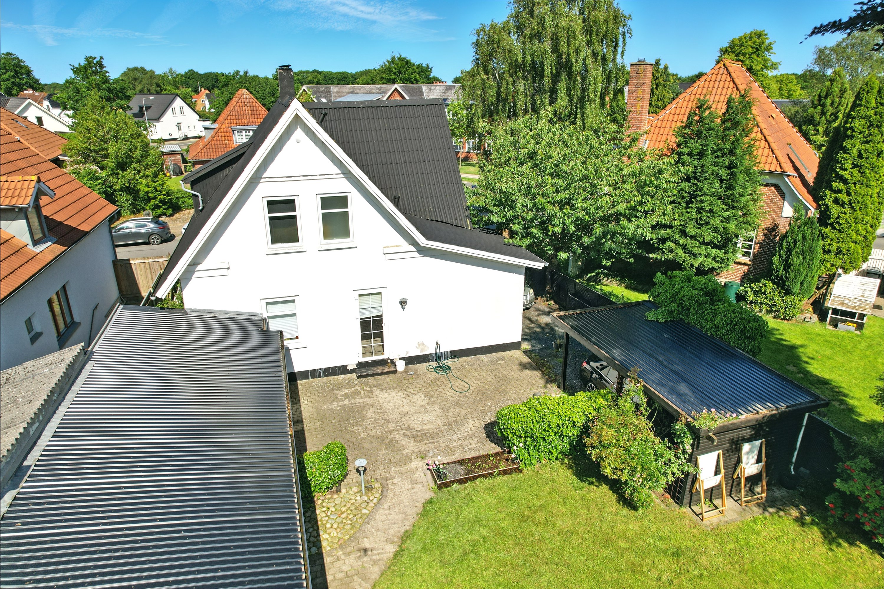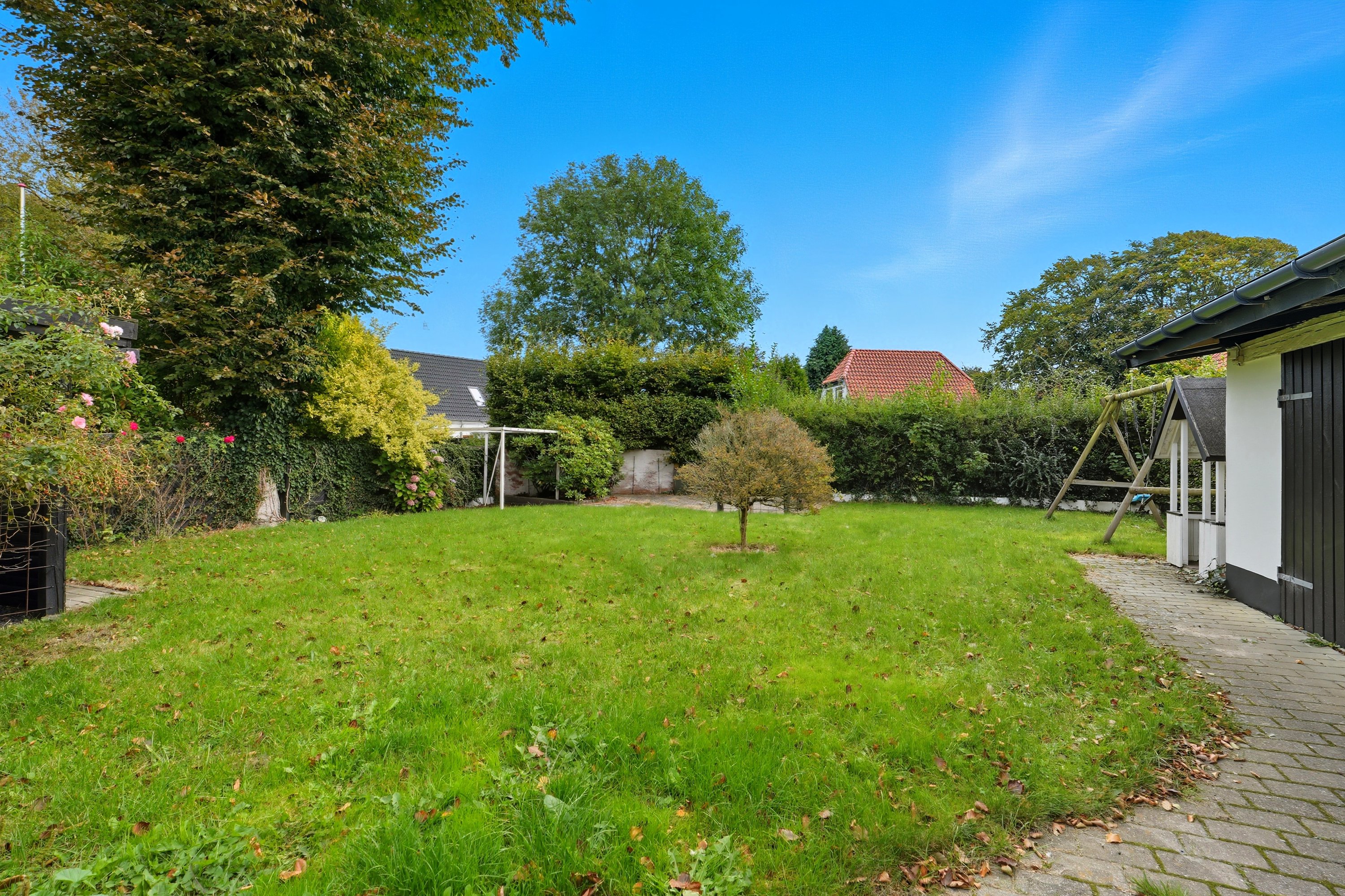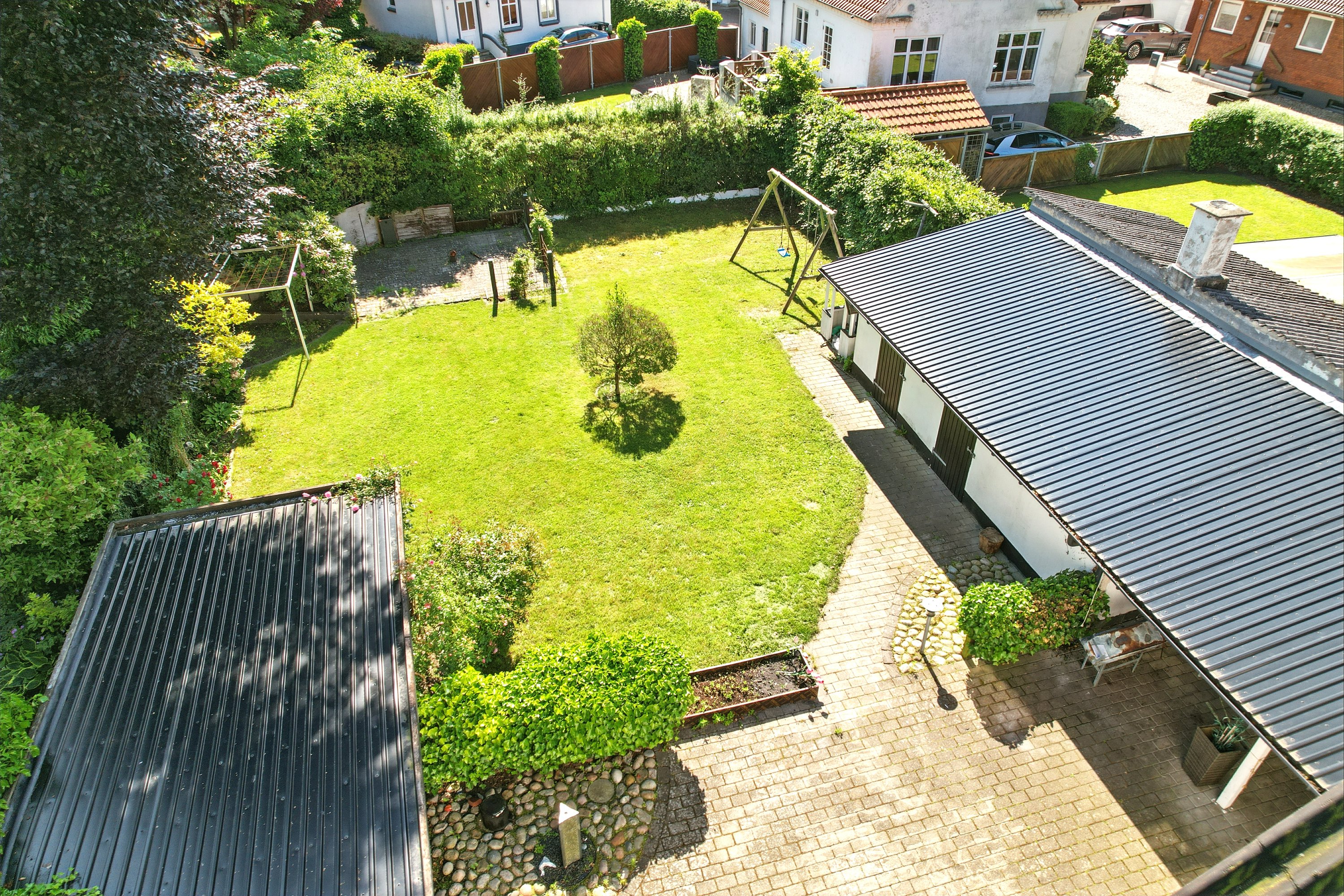 Haven er nem og overkommelig. Her er der desuden et godt skur og redskabrum, mens terrassen gør det muligt at nyde tilværelsen og de gode sommermåneder.