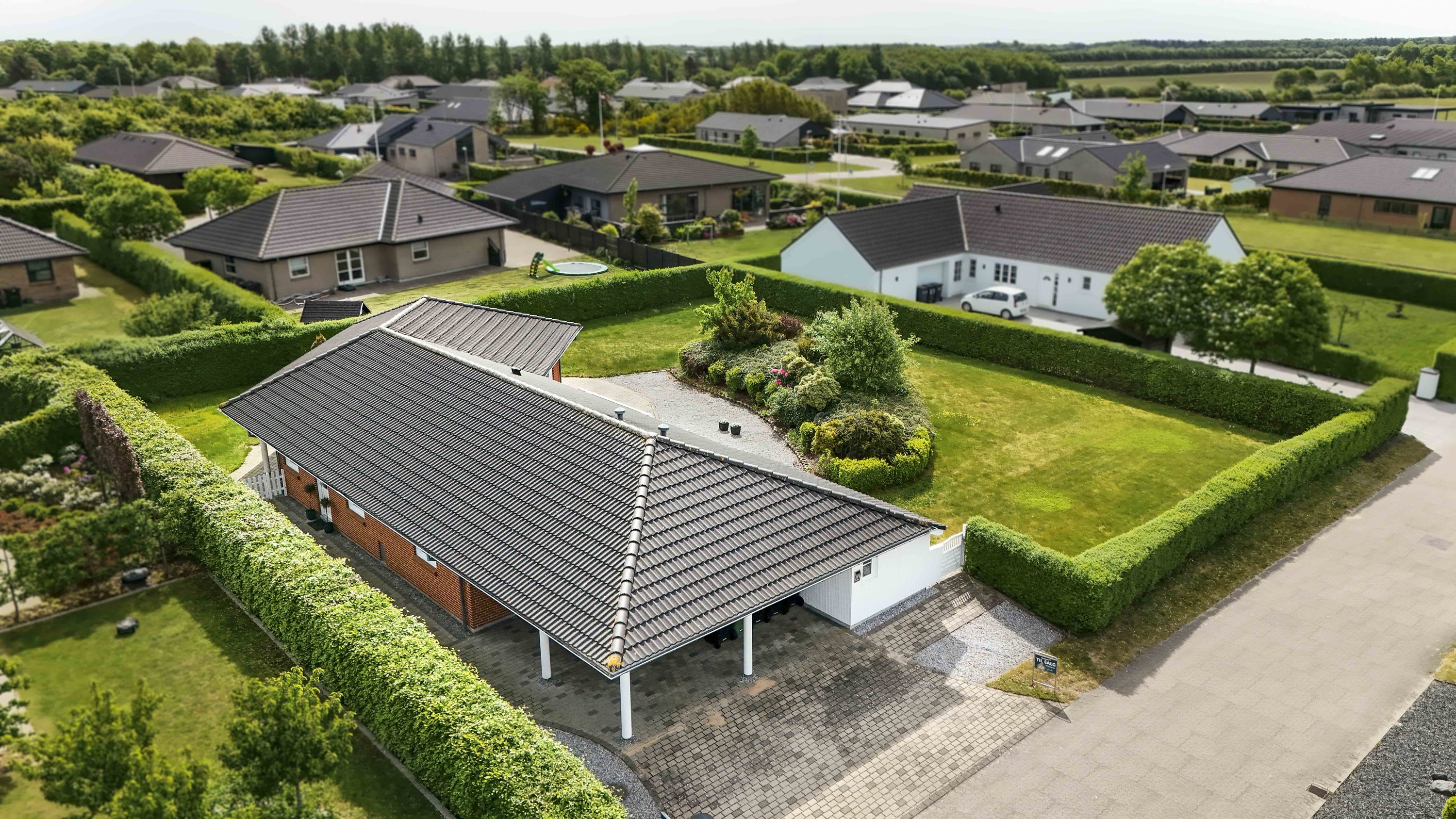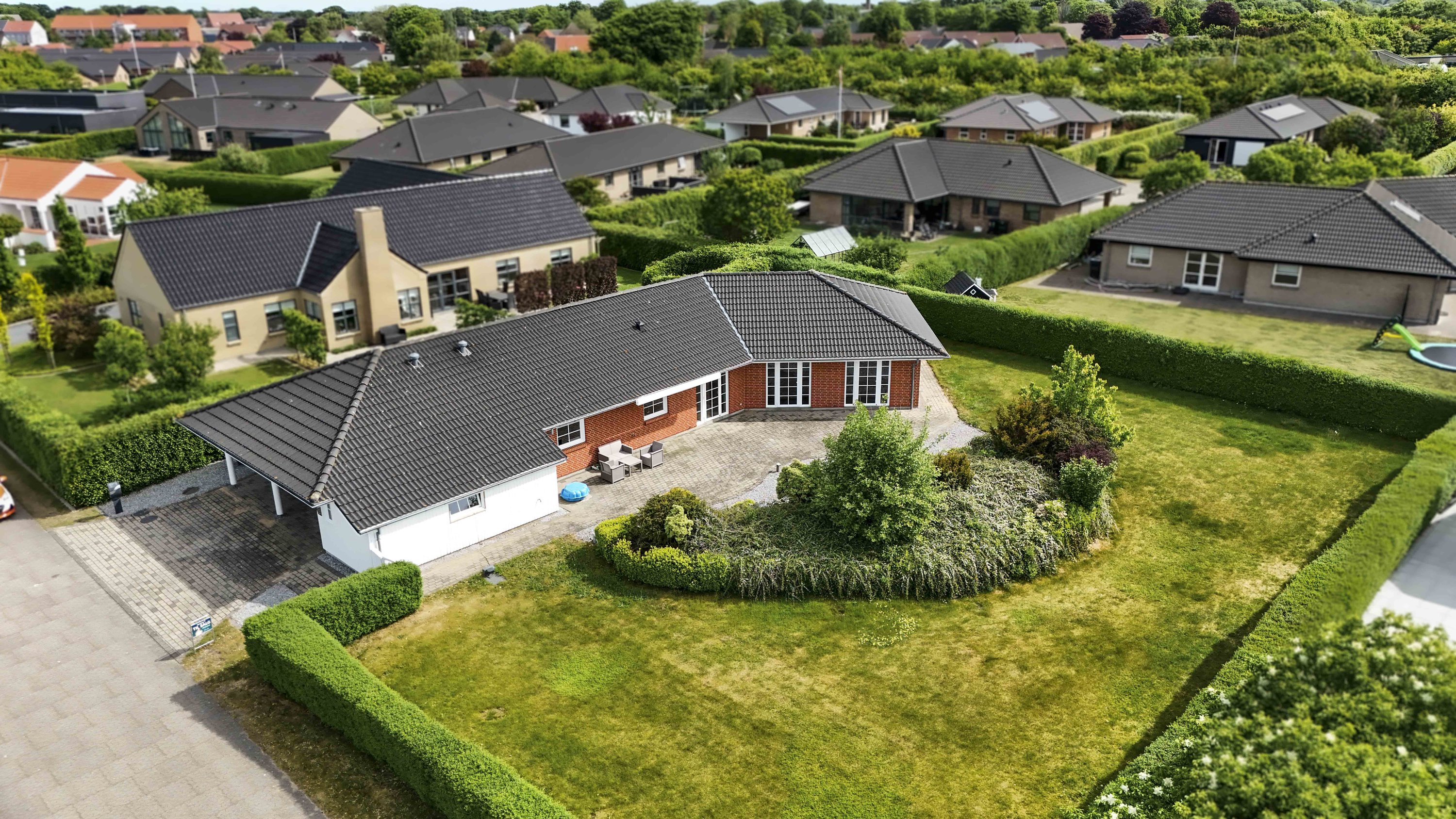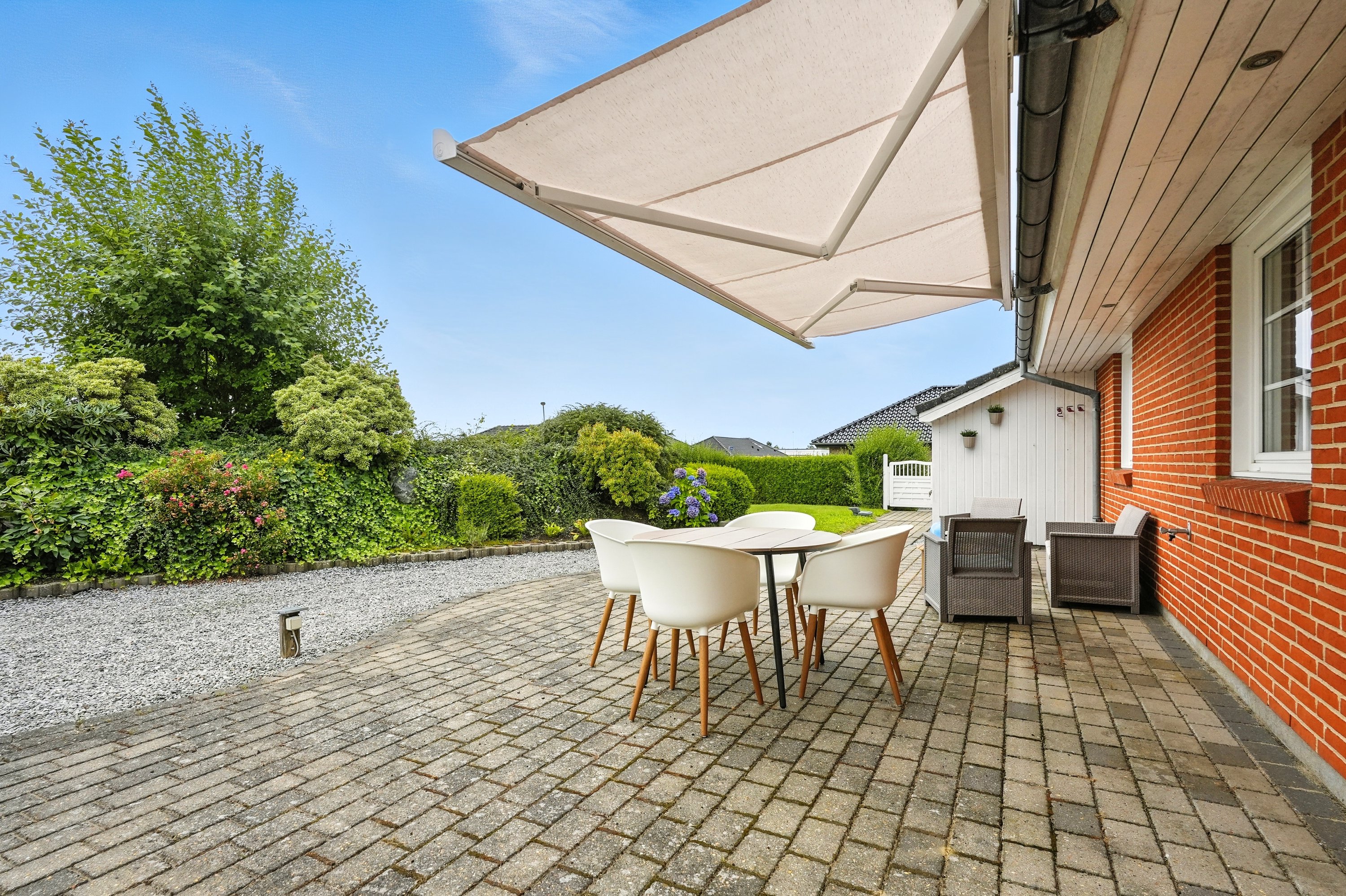 Villaen har en stor carport med tilhørende værksted/redskabsrum. Her kan man sagtens åbne op, og lave en dobbelt carport, hvis drømmen om dette skulle opstå. Villaens have er nem og overkommelig, og der er fra terrassen mulighed for at nyde solen hele dagen.
