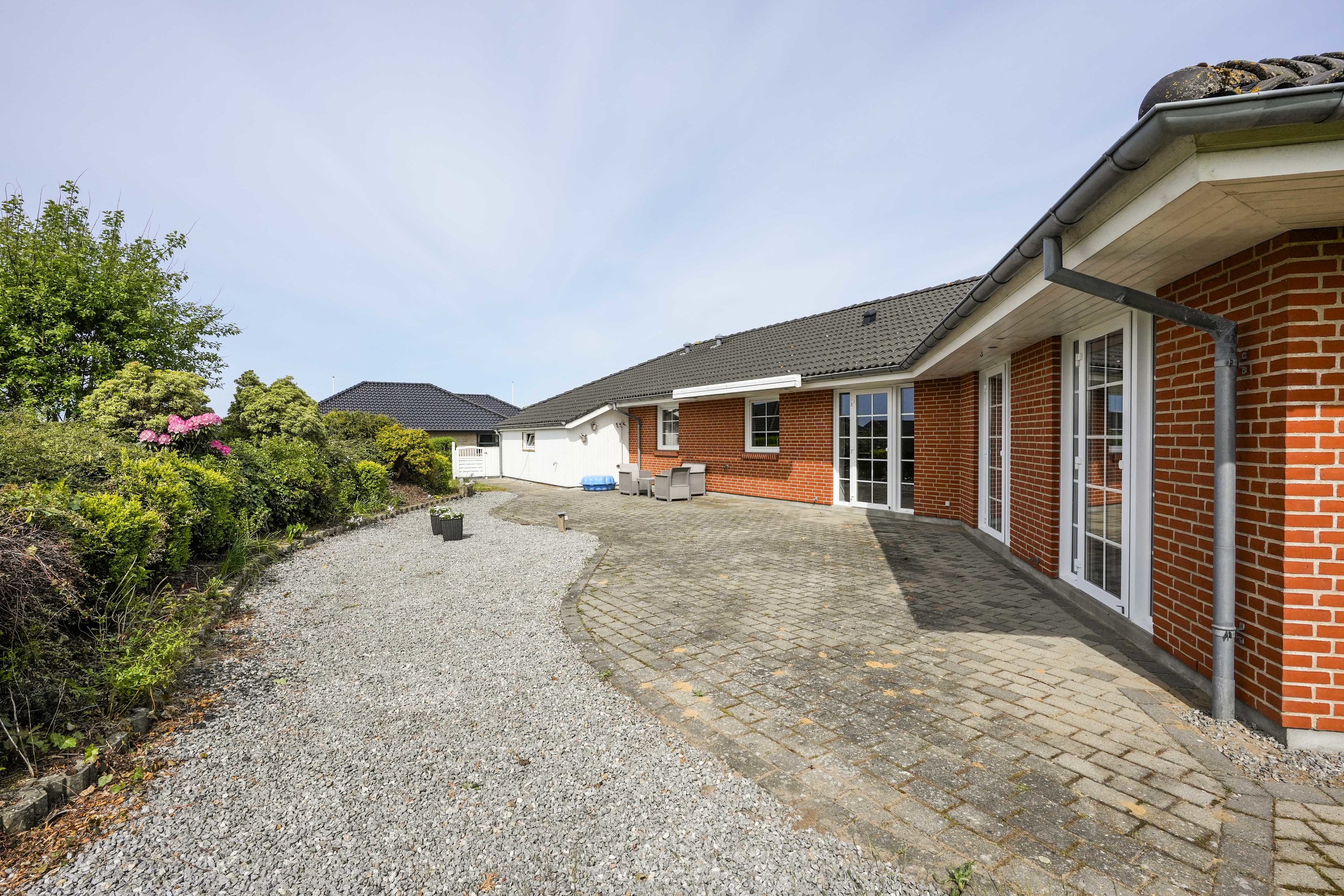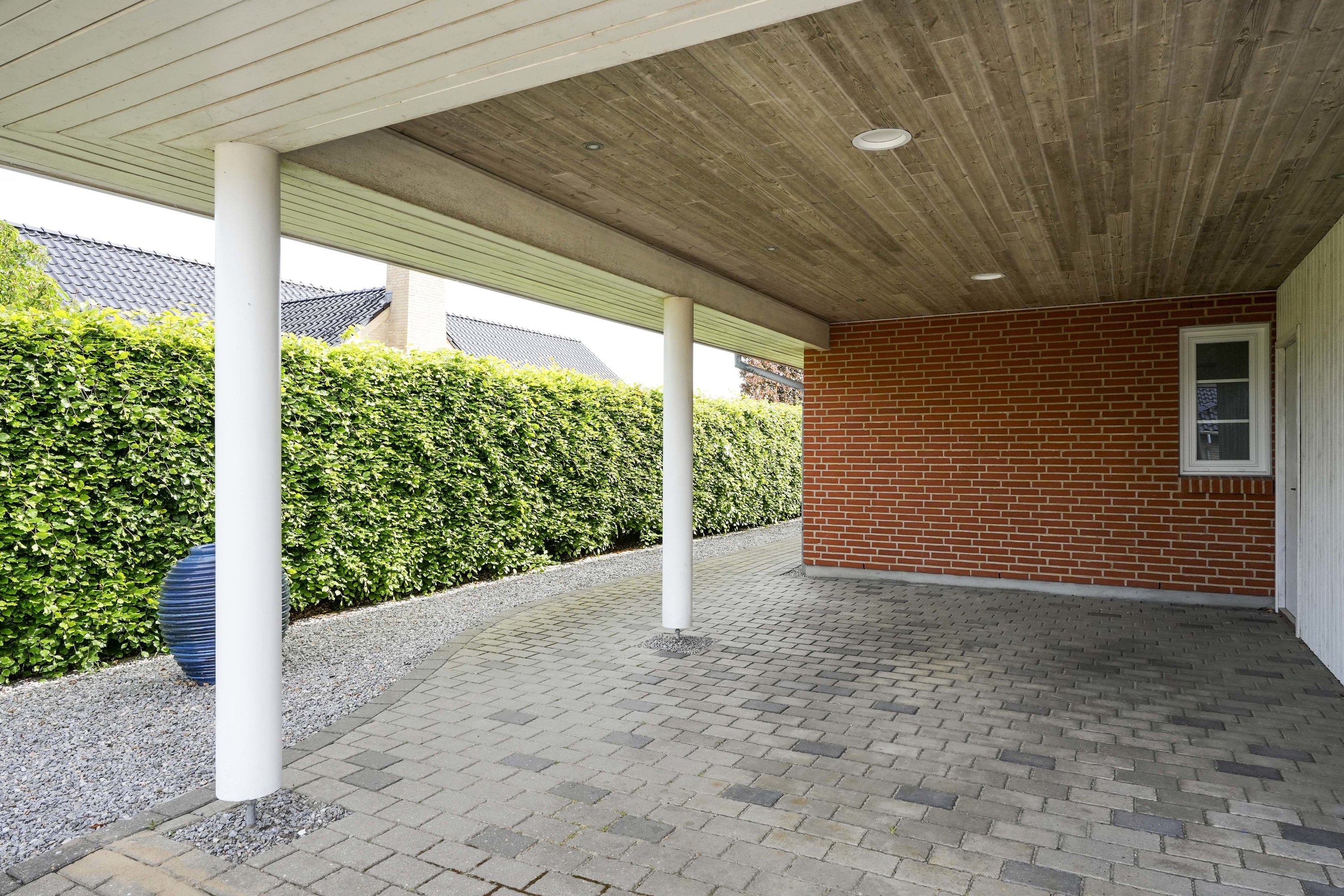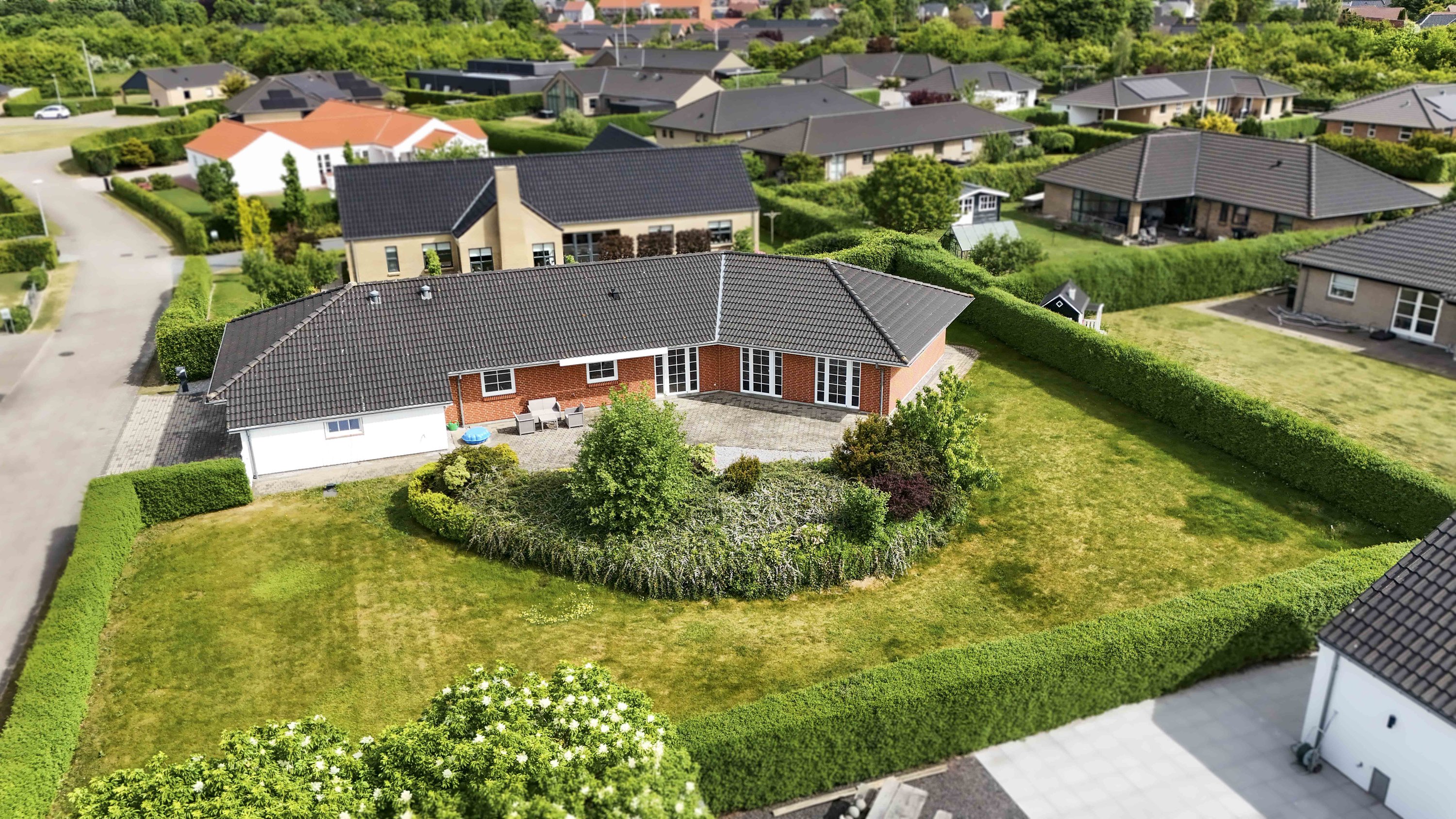 Villaen har en stor carport med tilhørende værksted/redskabsrum. Her kan man sagtens åbne op, og lave en dobbelt carport, hvis drømmen om dette skulle opstå. Villaens have er nem og overkommelig, og der er fra terrassen mulighed for at nyde solen hele dagen.