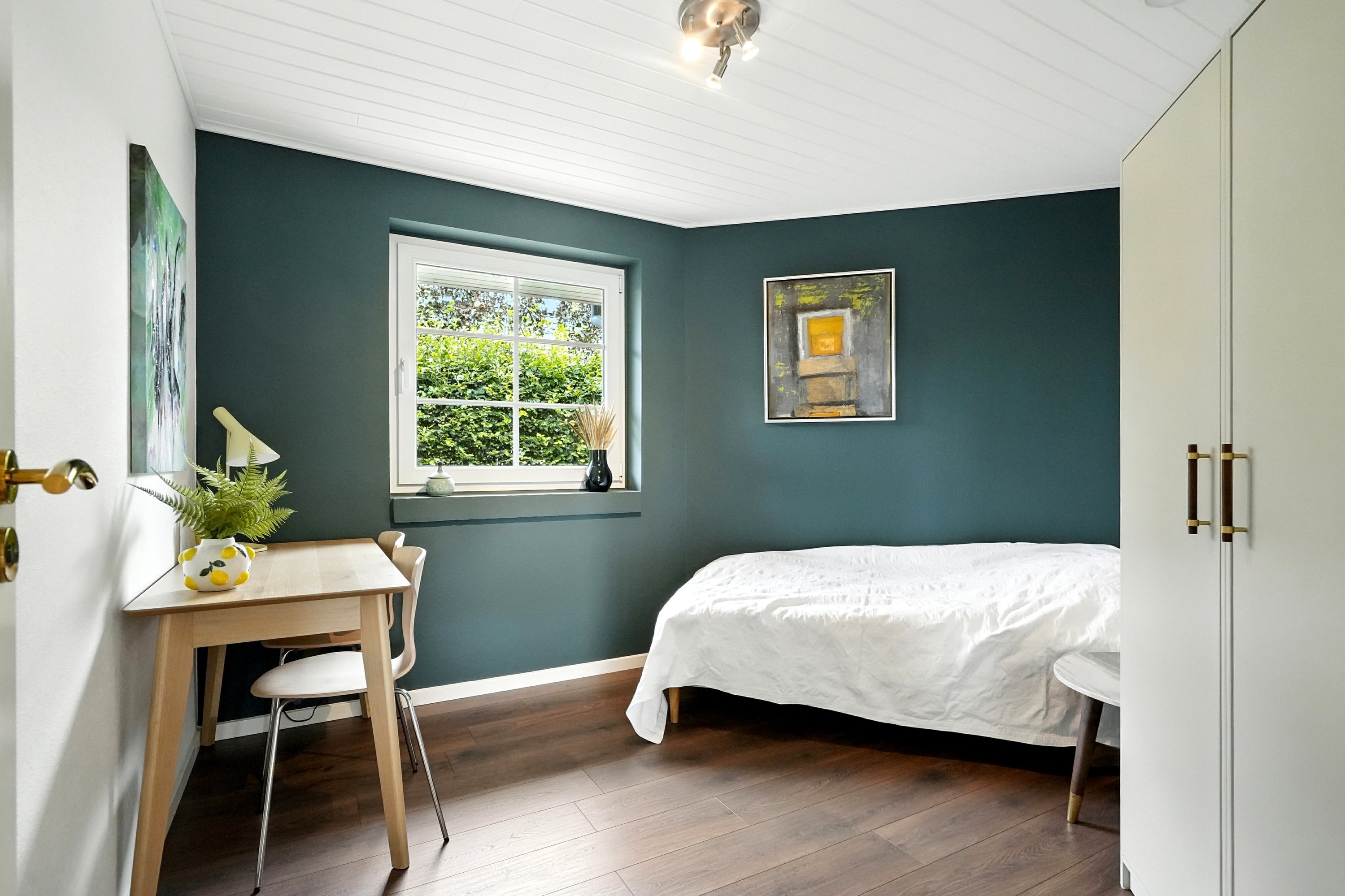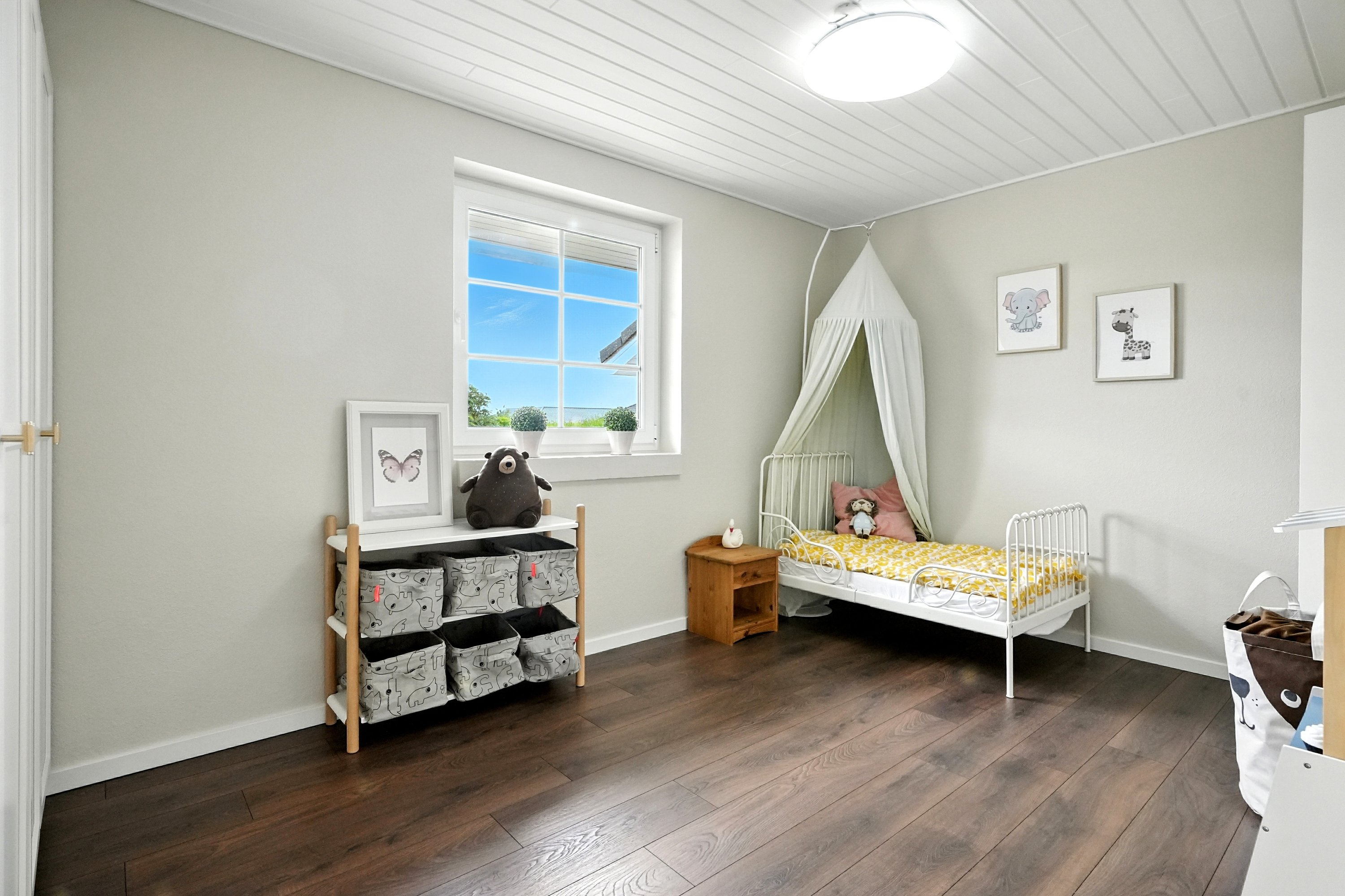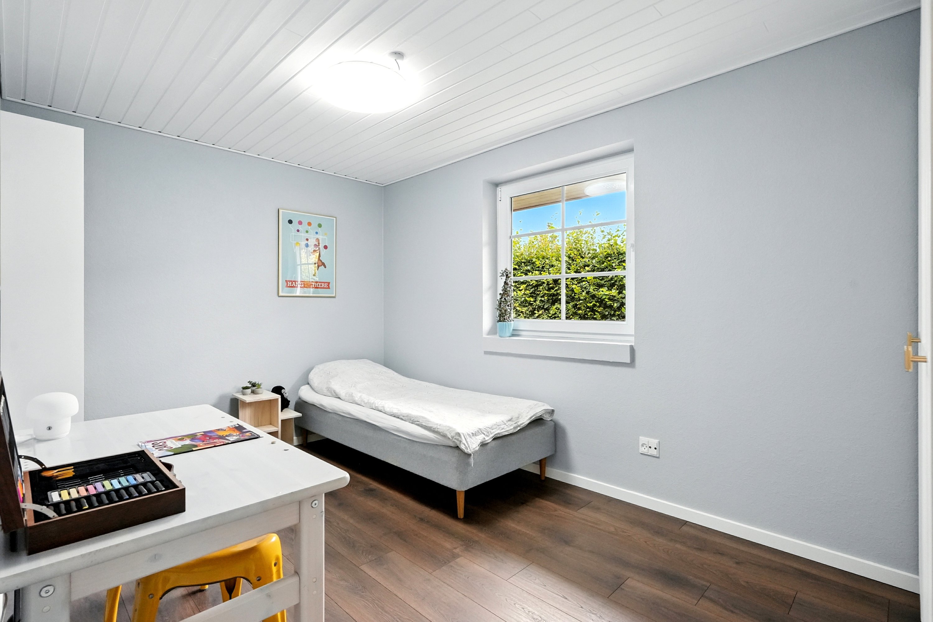 Fra køkkenet finder man børneafdelingen med 2 store børneværelser med eget badeværelse. Også her har nuværende ejer været på spil, med bl.a. gulve skiftet, samt inventar i badeværelset. Fra alrummet finder man yderligere et godt værelse, som enten er ideelt som kontor, eller til familiens 3. barn. En god løsning, hvor der er let adgang til alrummet.