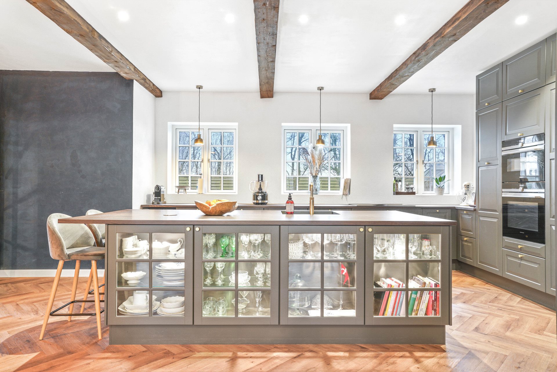 “Hjertet” er det store og åbne køkken/alrum. Her er der åbent til 1. salen, som giver en helt utrolig følelse af luft og rummelighed. Samtidig er rummet krydret med den smukke udsigt til begge sider. Køkkenet har masser af skabs- og bordplads, som vil behage enhver med hang til madlavning. Stuen er møbleringsvenlig og hyggelig. Her sørger brændeovnen for at stemningen er intakt.