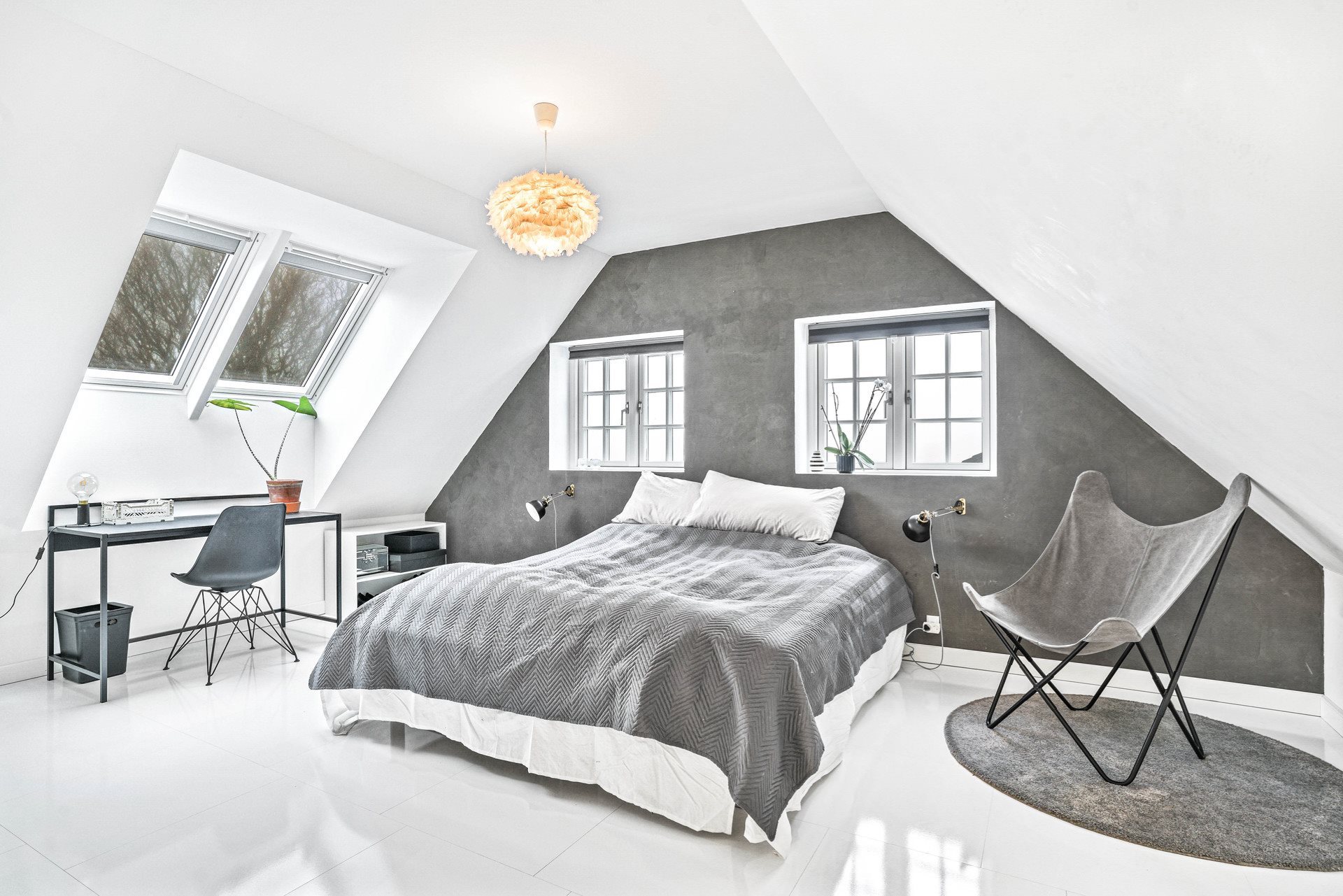 1. salen byder på et stort soveværelse med walk-in-closet. Dertil er der et skønt badeværelse med fritstående badekar. Et unikt rum som giver stemningen af velvære. Dertil er der yderligere et stort værelse, som uden videre kan omdannes til 2 værelser, hvis behovet for dette skulle opstå.