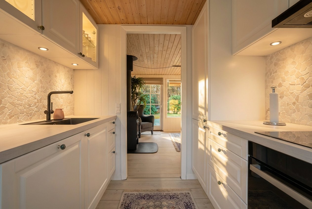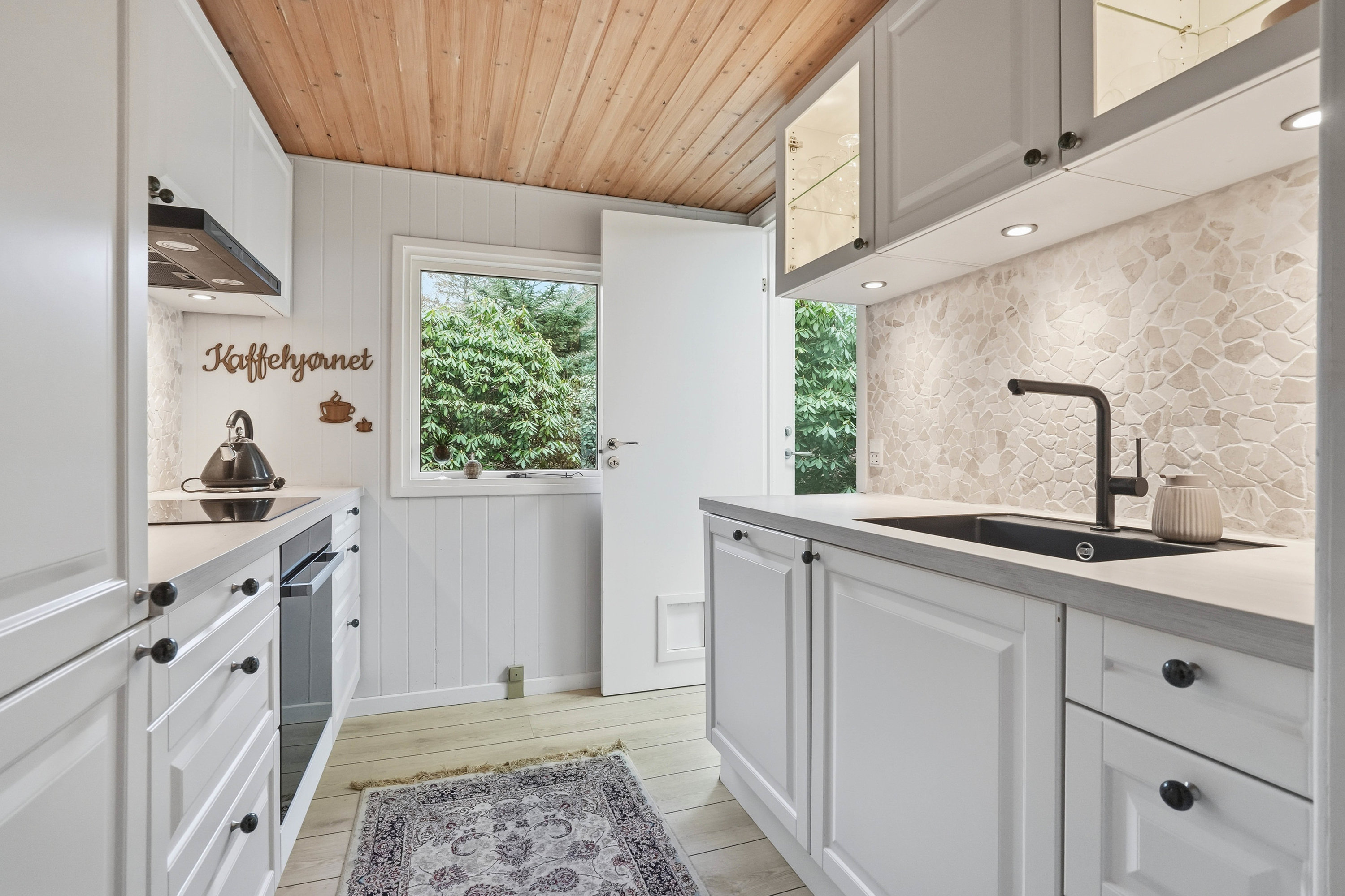 Køkkenet er nyere og indbydende, så både morgenkaffen og sommerens grilltilbehør kan trylles frem i lækre rammer. Her er tænkt over detaljerne, så funktionalitet og æstetik går hånd i hånd.