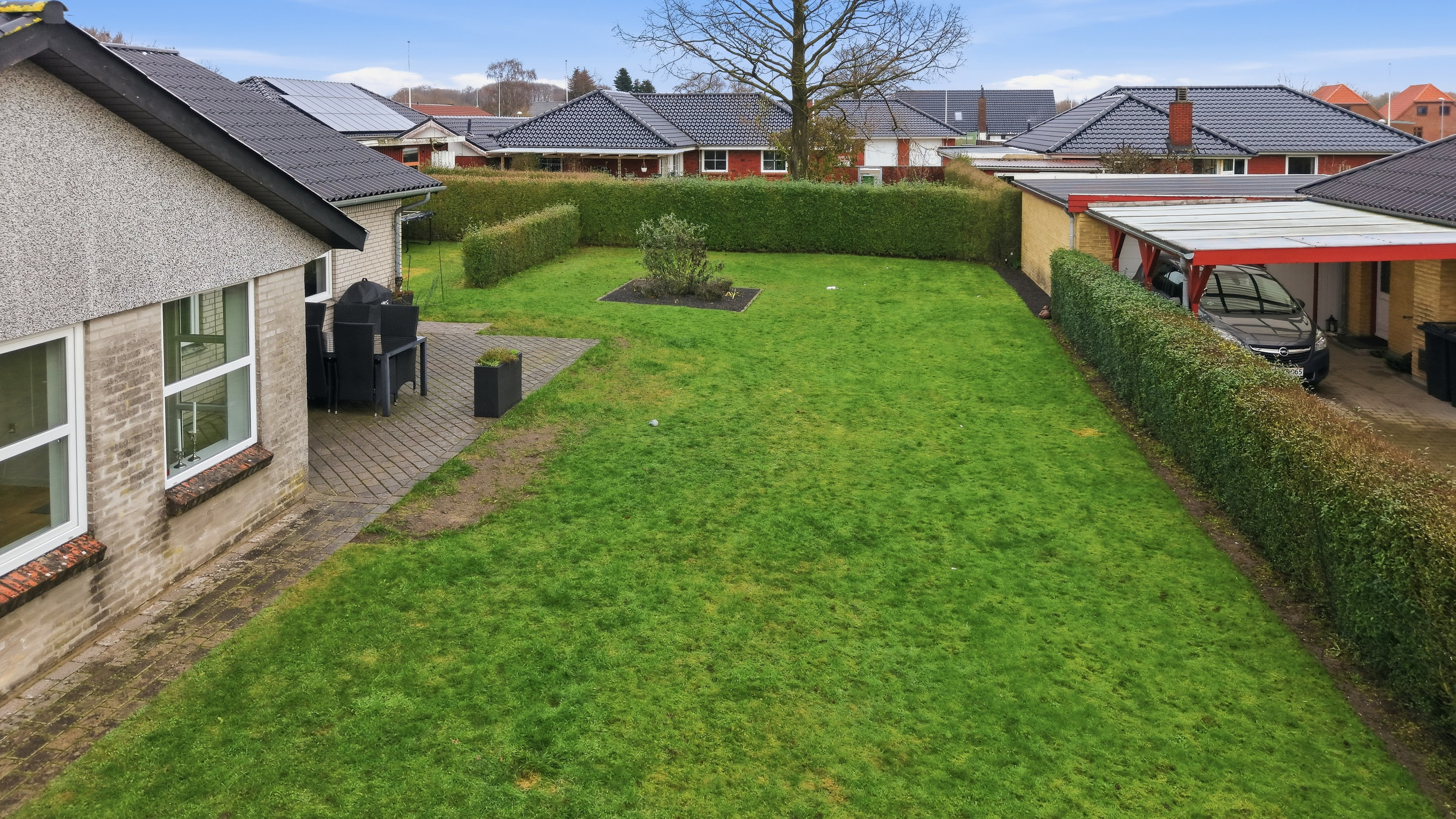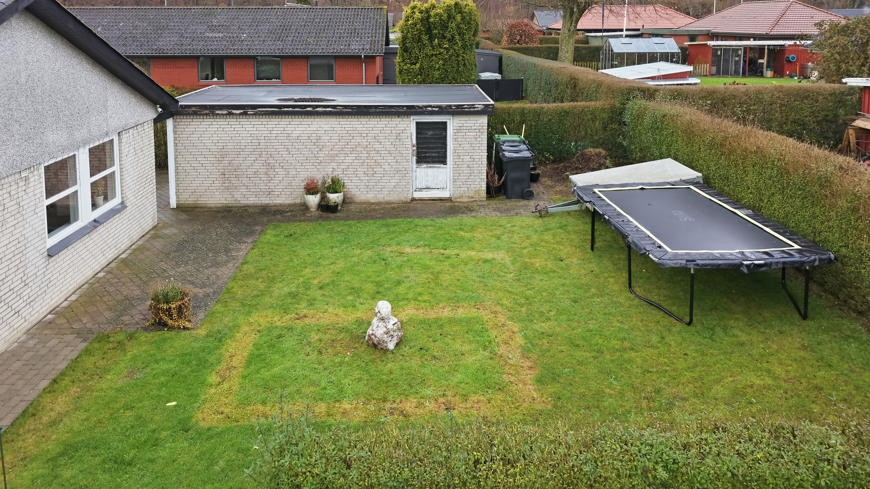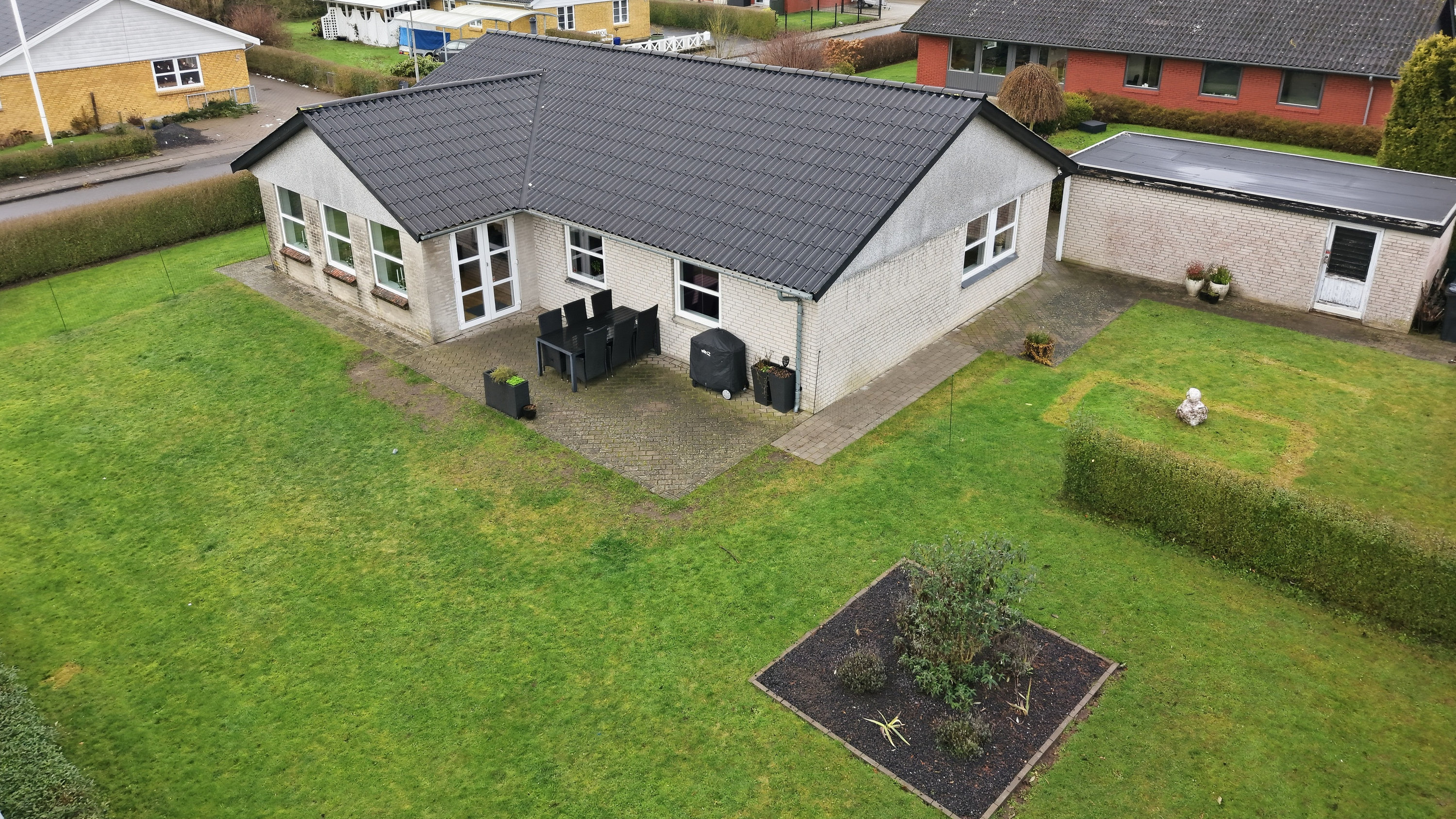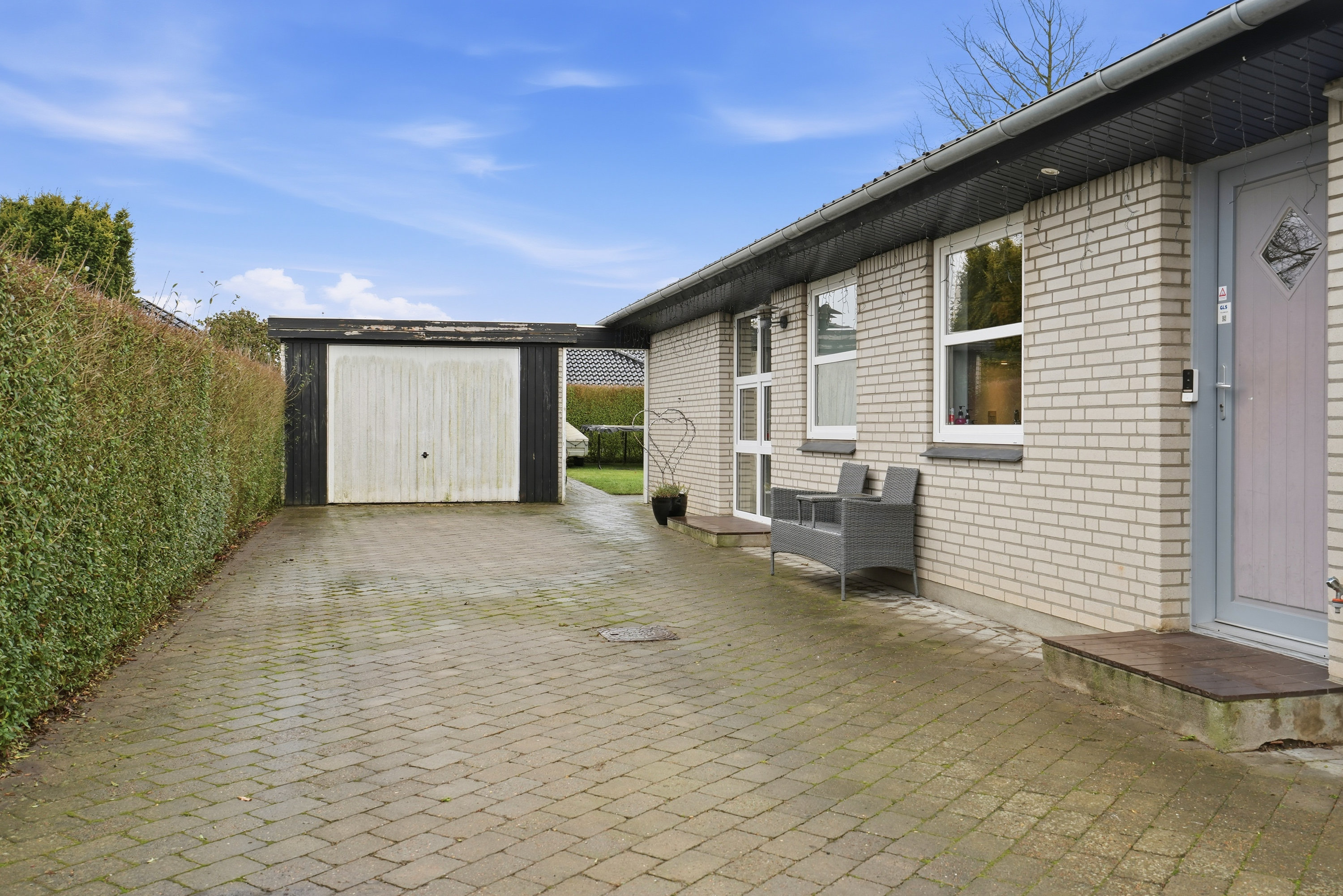 Haven er overskuelig og nem at holde, og den tilhørende garage på 25 m² giver gode muligheder for både bil, værksted eller opbevaring.