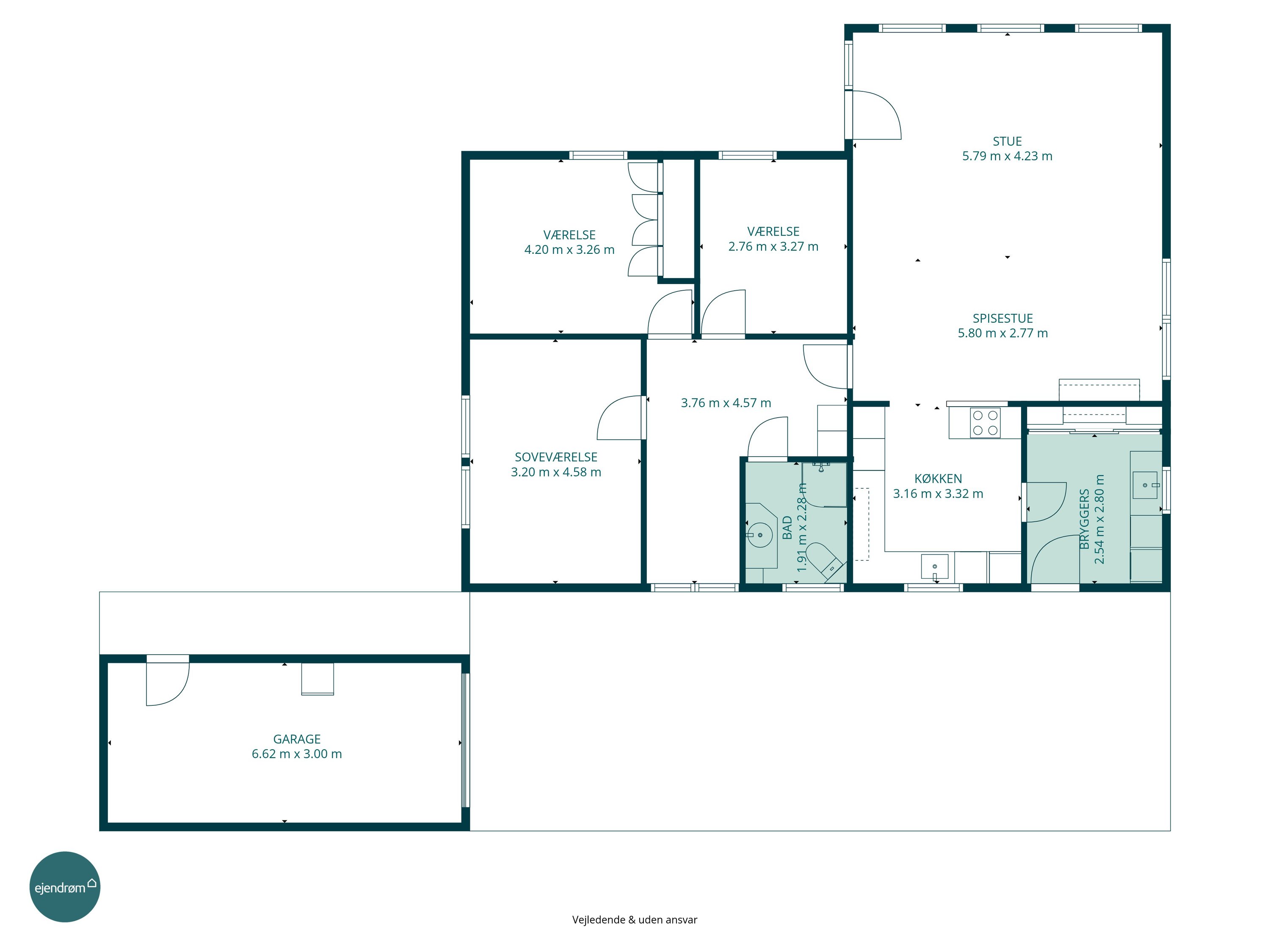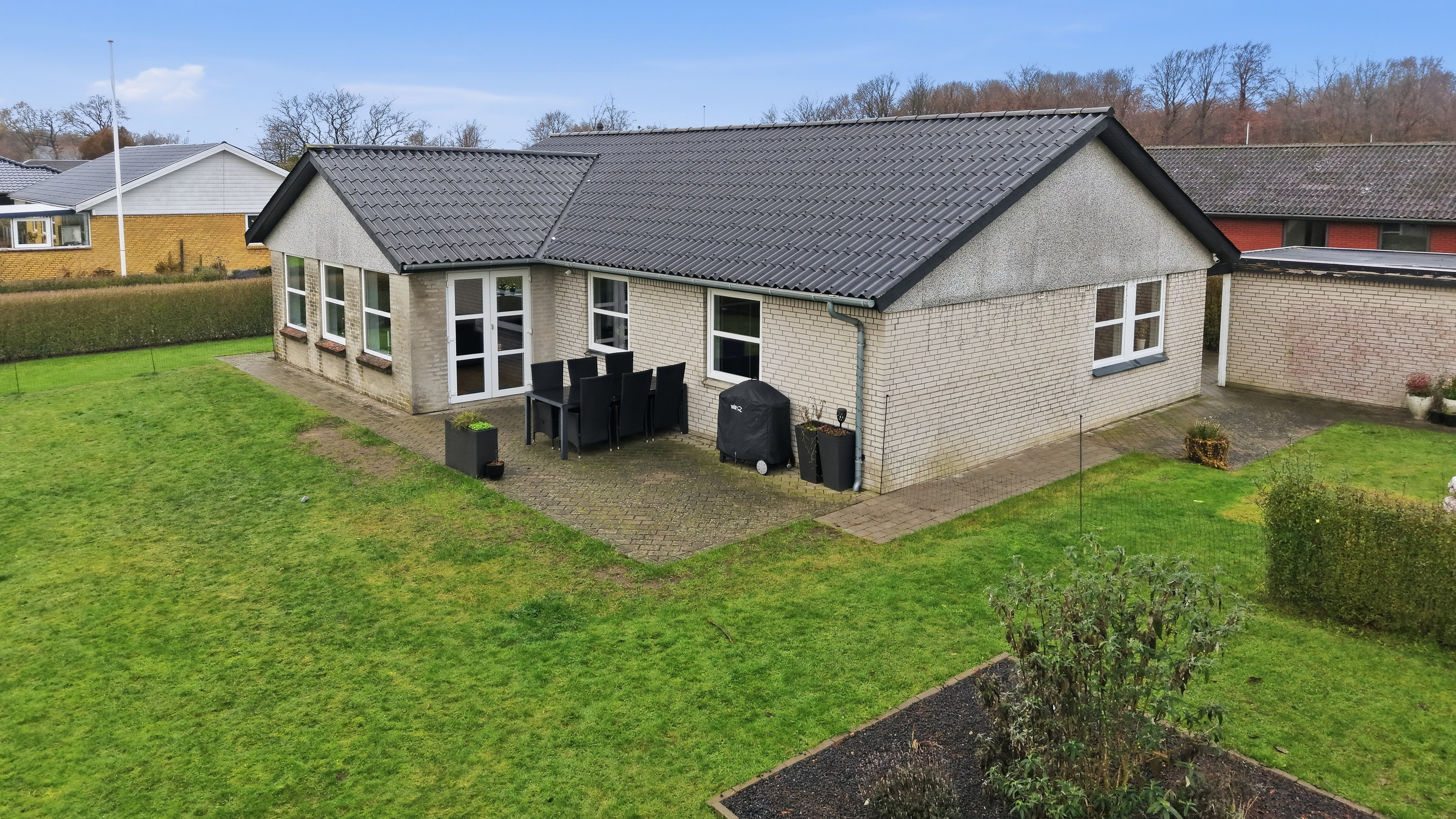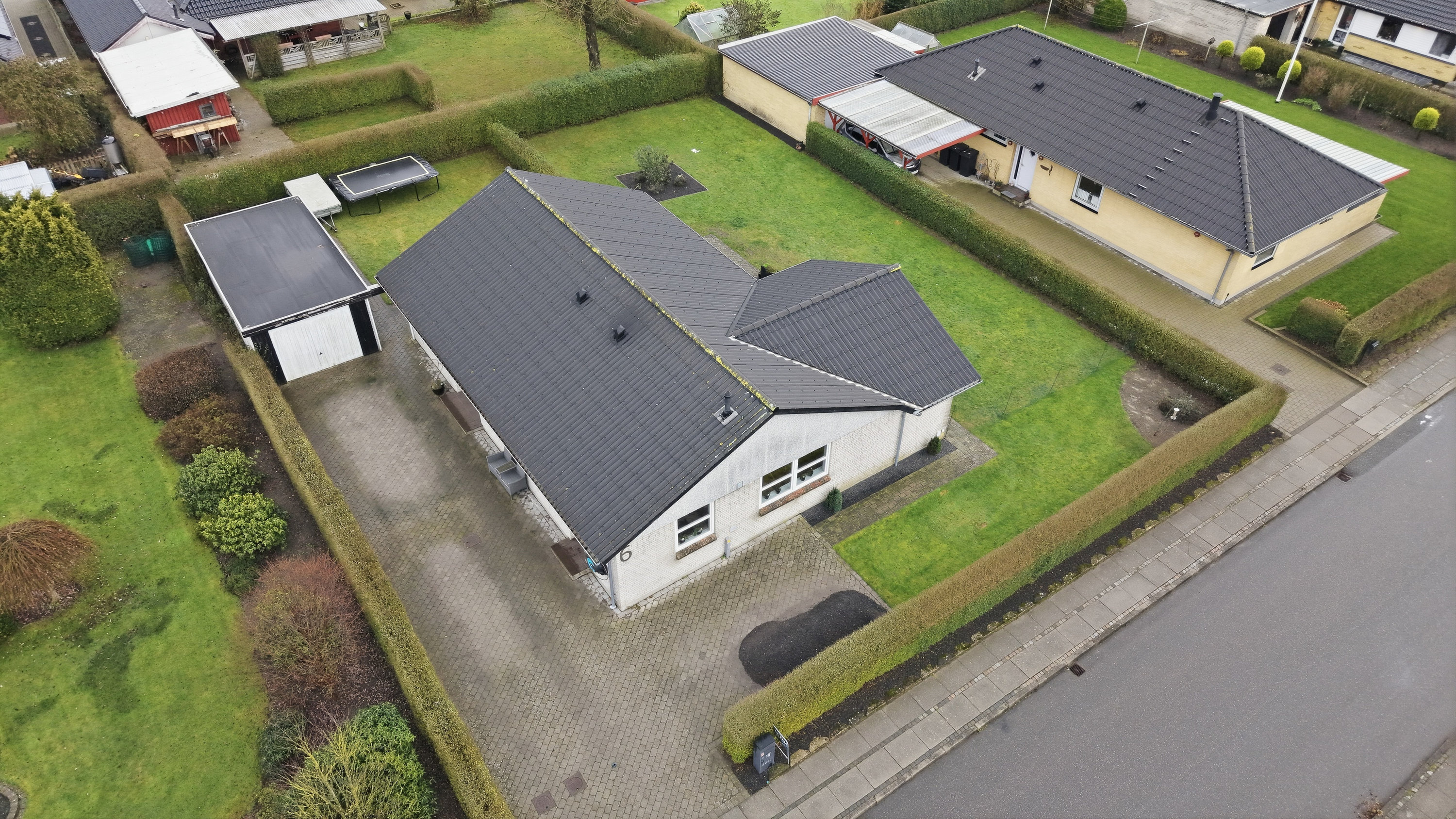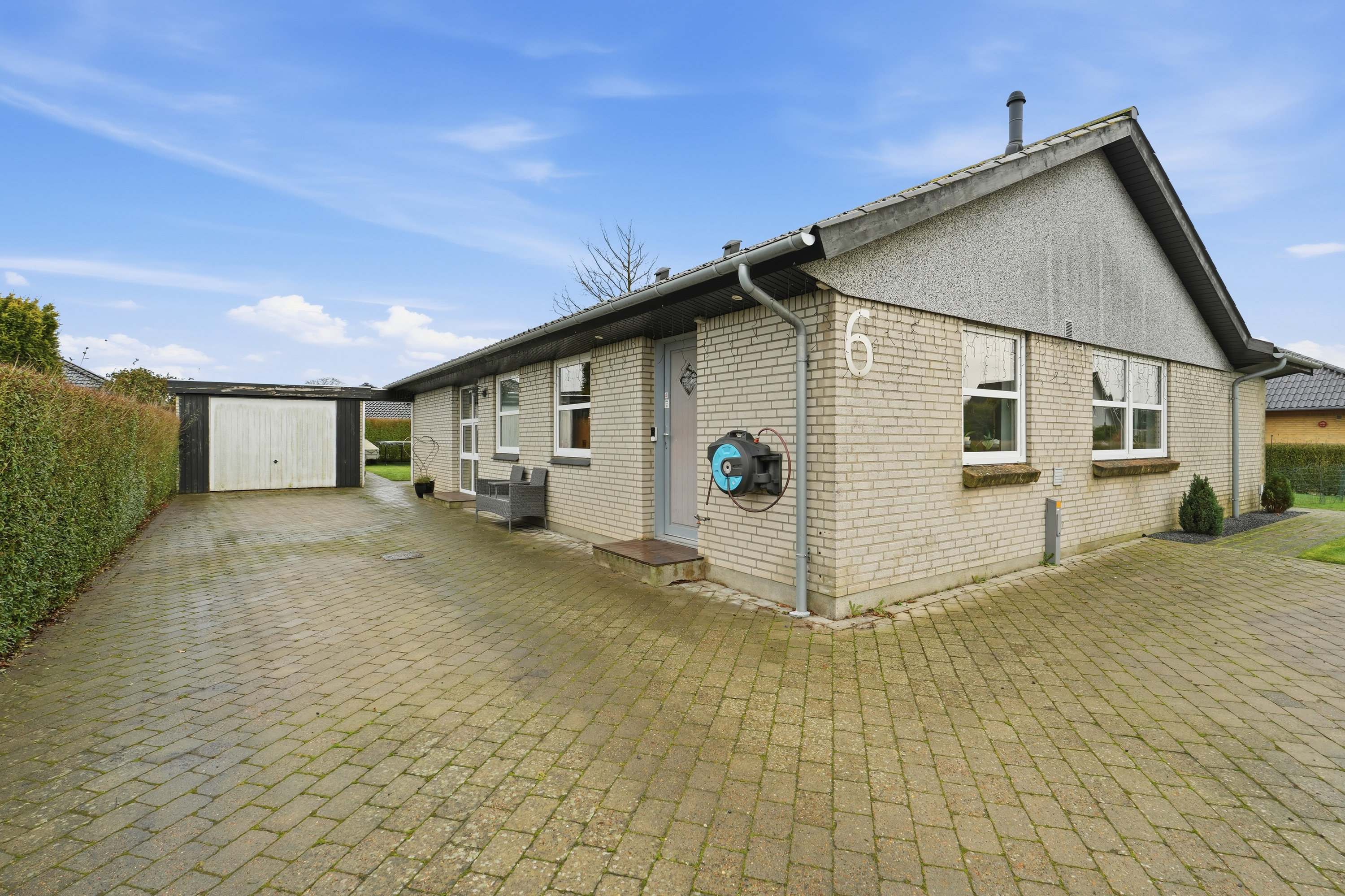 Haven er overskuelig og nem at holde, og den tilhørende garage på 25 m² giver gode muligheder for både bil, værksted eller opbevaring.