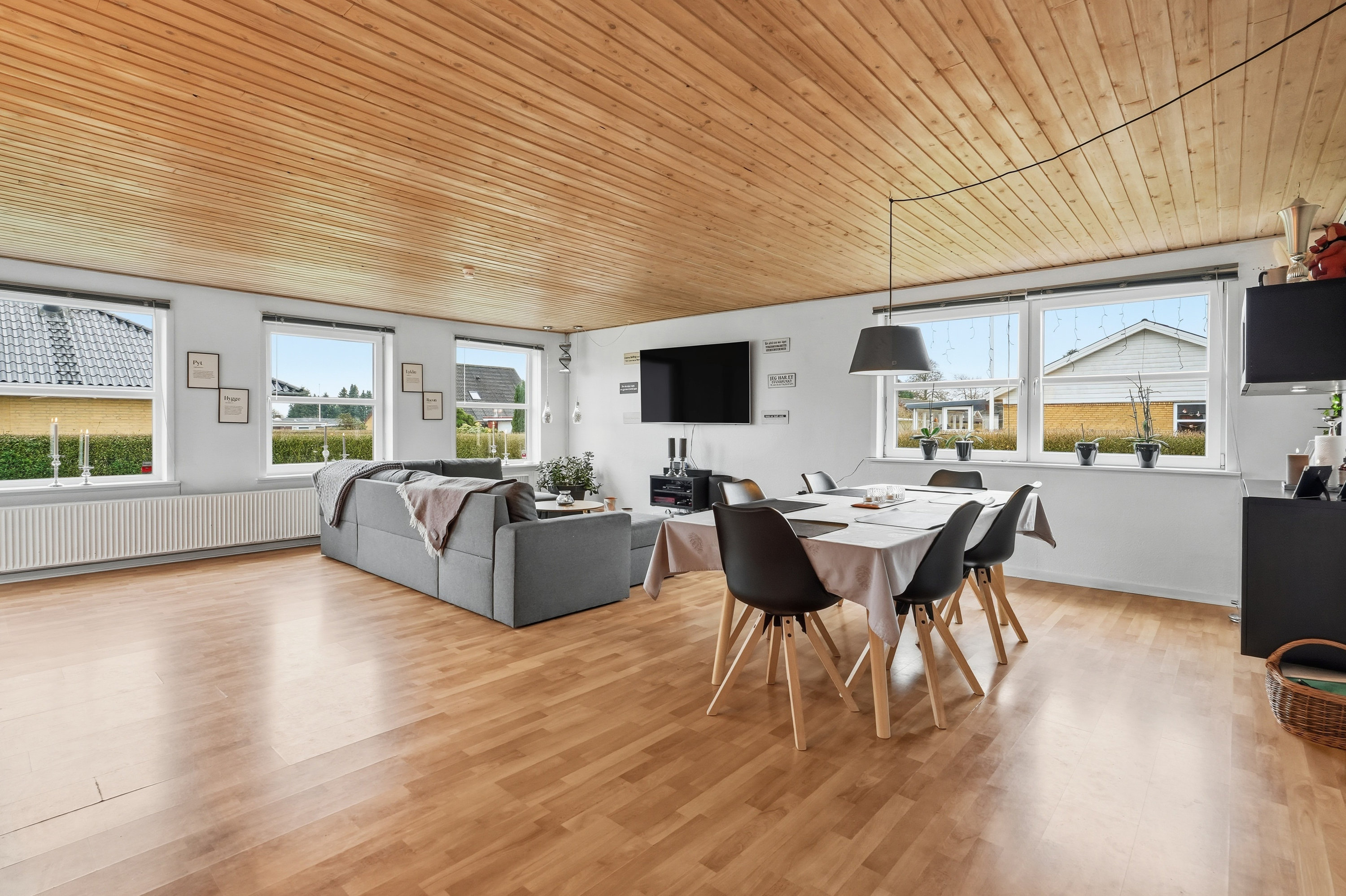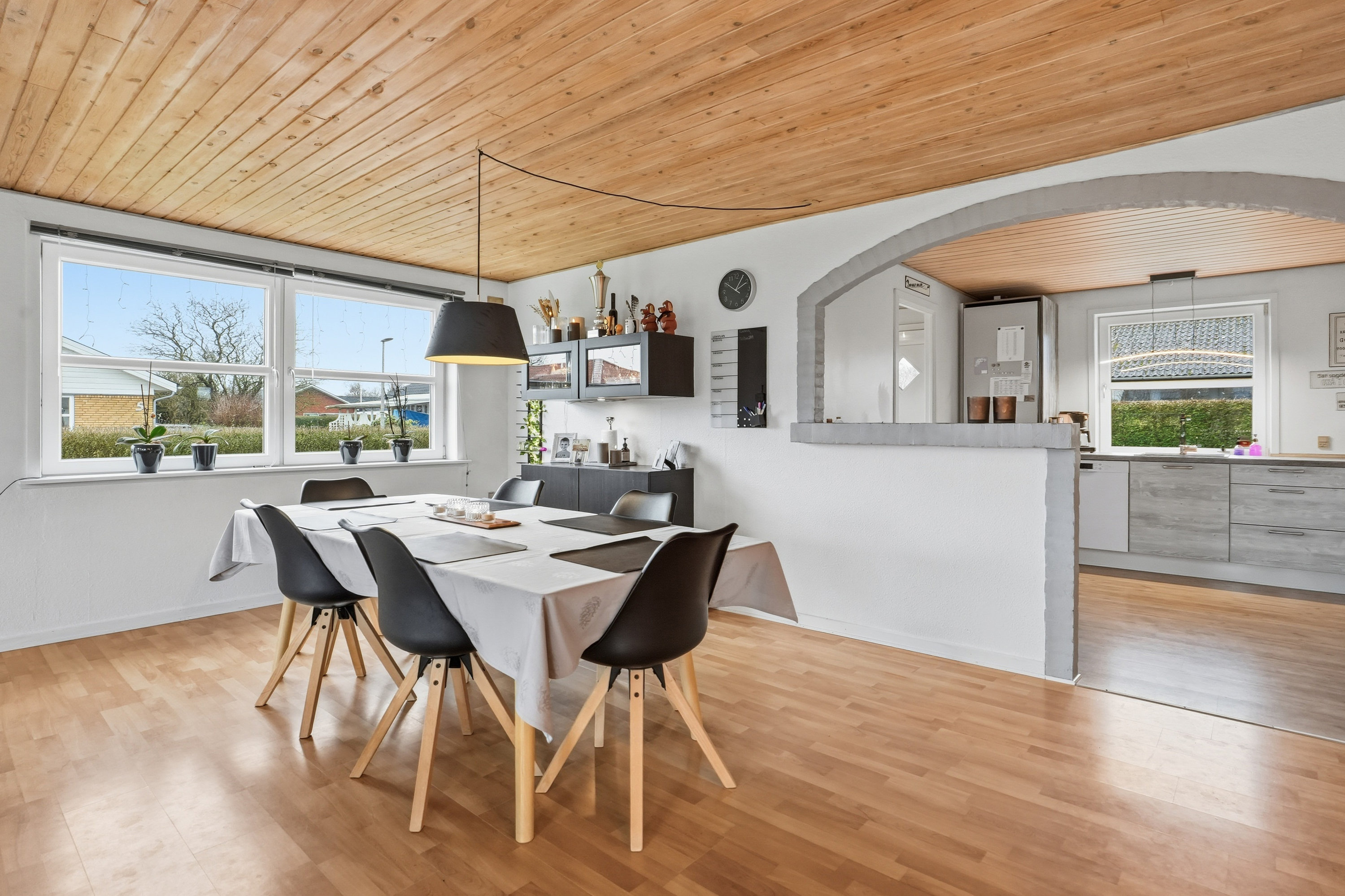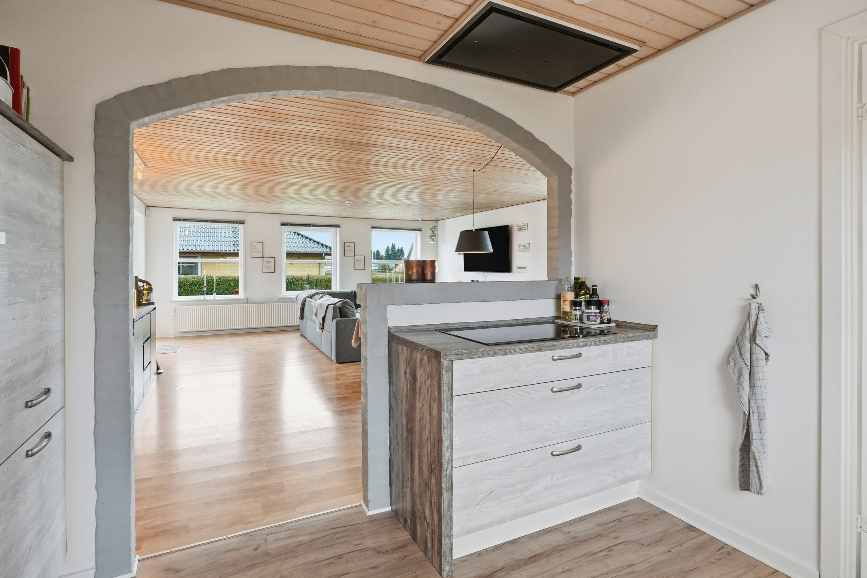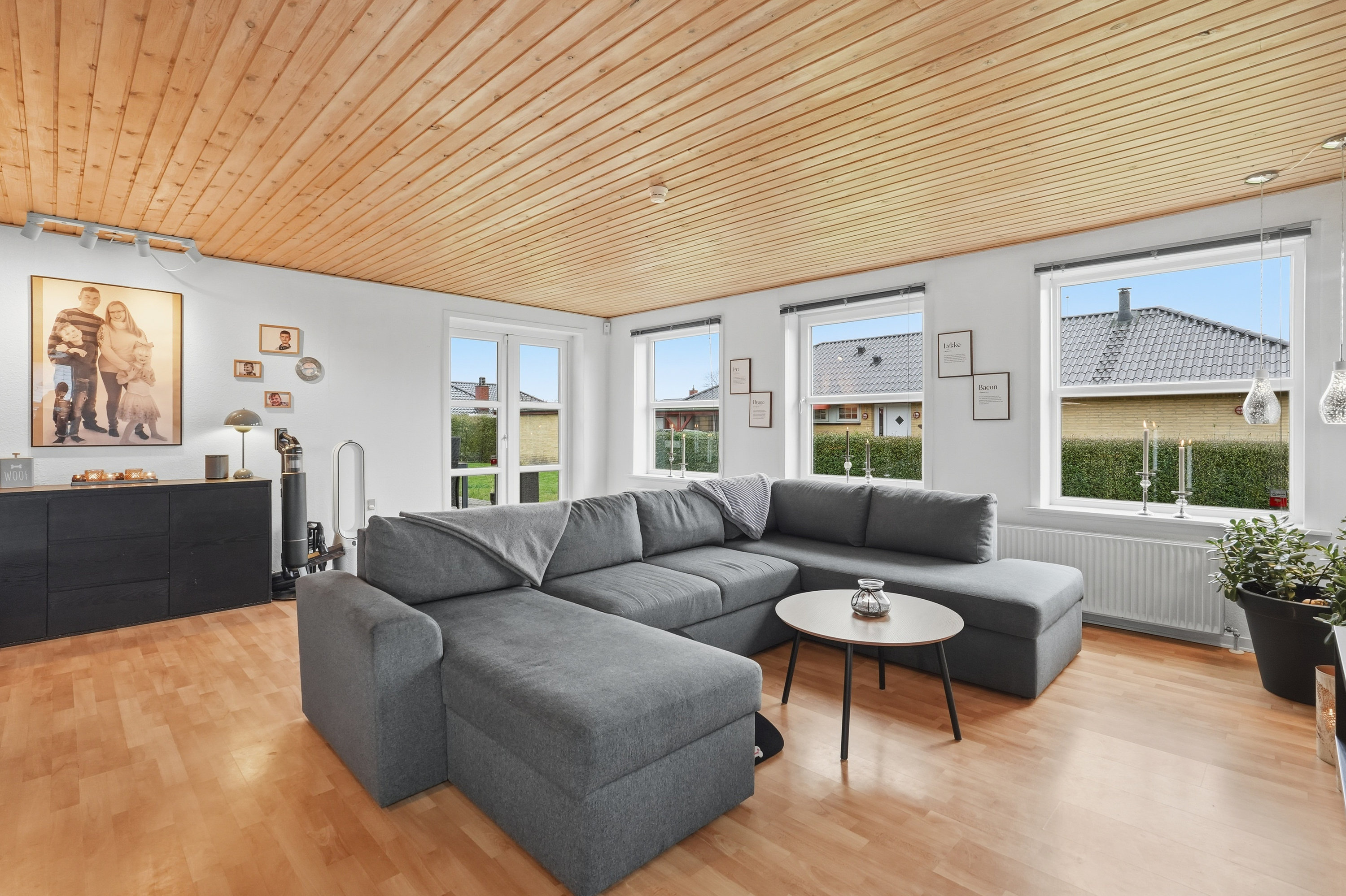 Allerede udefra fornemmer man, at huset er passet godt på. Indenfor træder du ind gennem bryggerset, hvor der er god plads til hverdagens praktiske behov. Herfra fortsætter du videre ind i køkkenet, som ligger i naturlig åben forbindelse med boligens store opholdsstue. Her får du et lyst og indbydende opholdsrum, hvor lyset strømmer ind fra flere sider og skaber en behagelig og varm atmosfære i hele rummet. Her er der rigelig plads til både spisebord og sofagruppe, og stuen fungerer som et naturligt samlingspunkt i hverdagen. Fra stuen er der desuden udgang til terrassen og haven – et oplagt sted for både afslapning og familietid i de varme måneder.