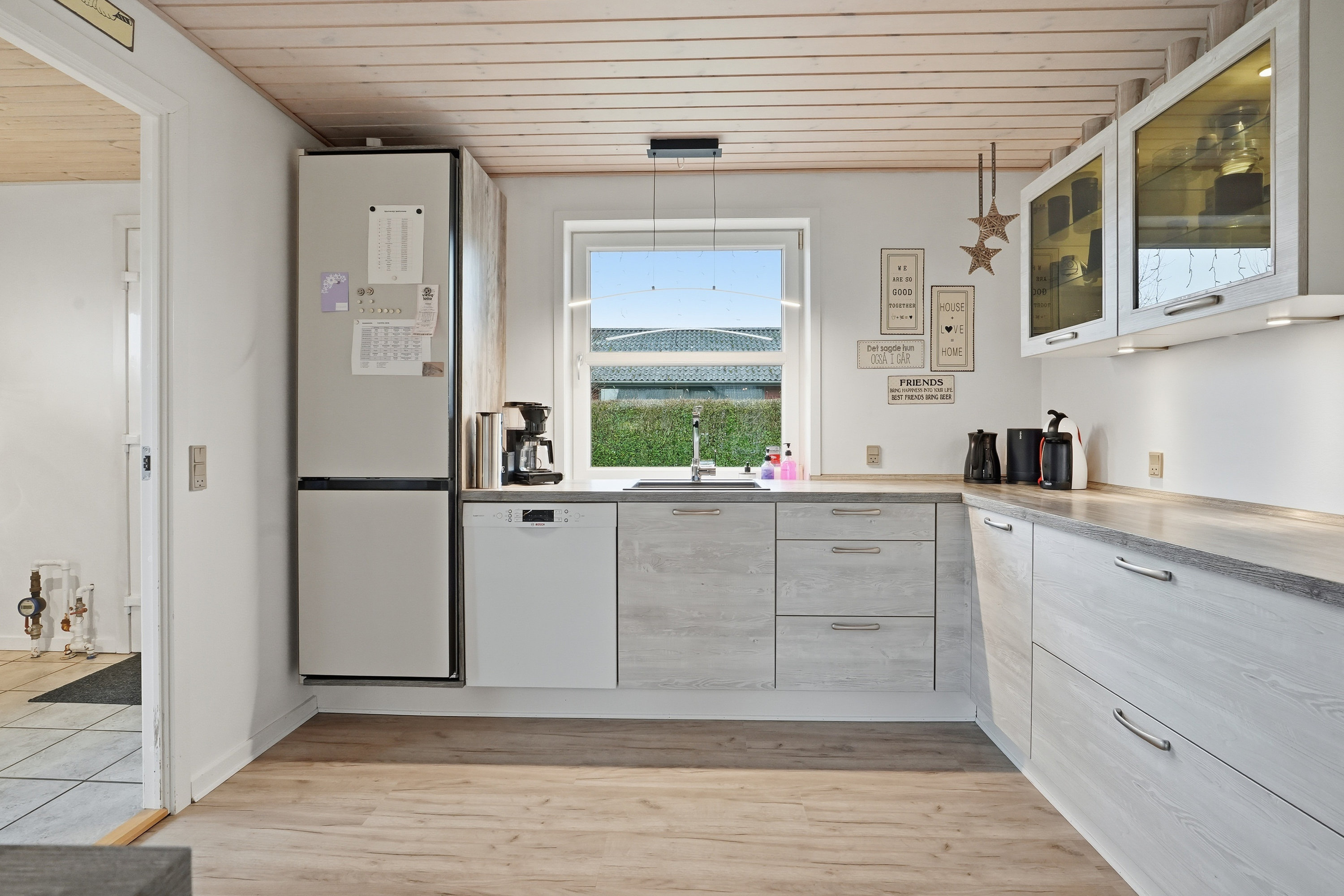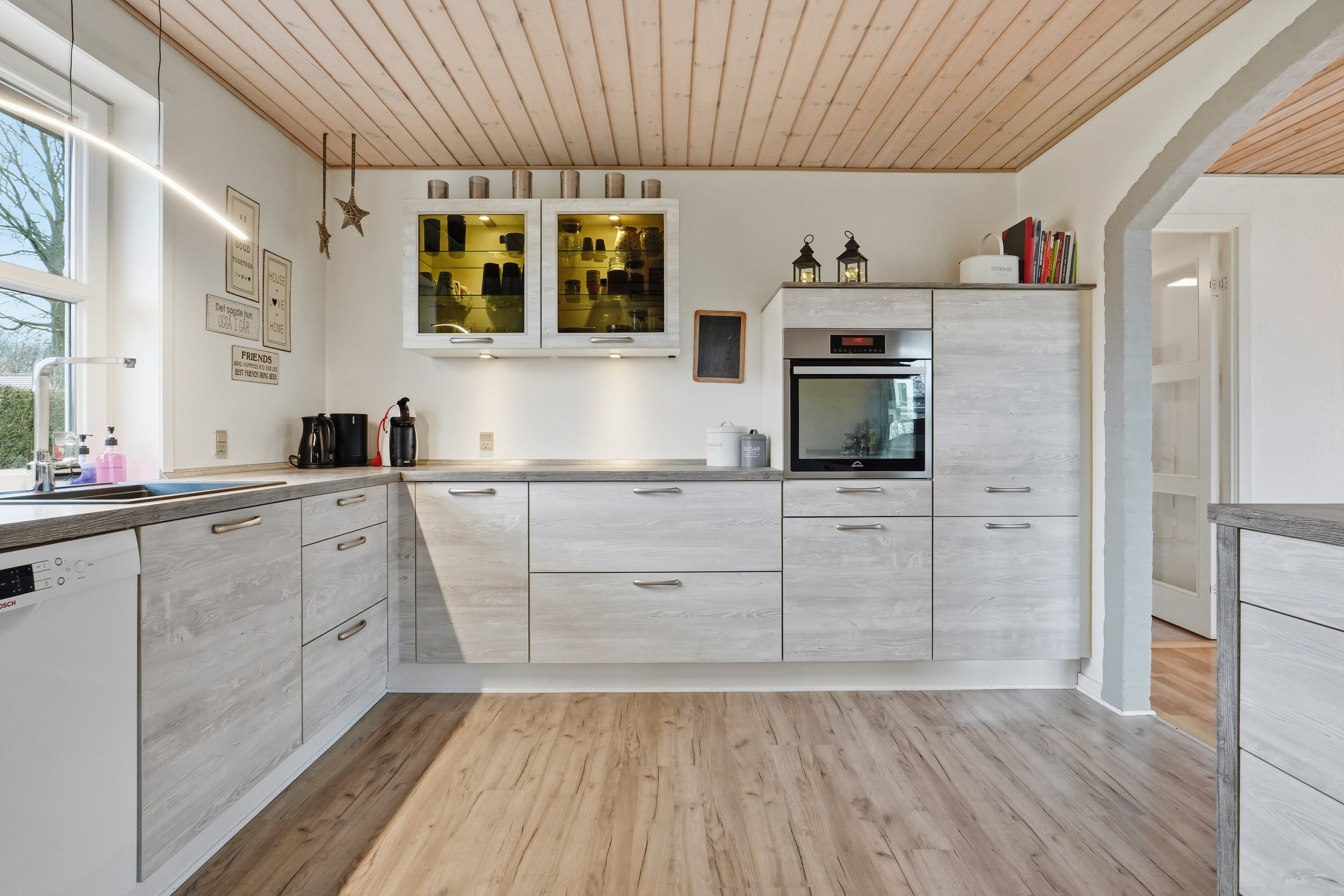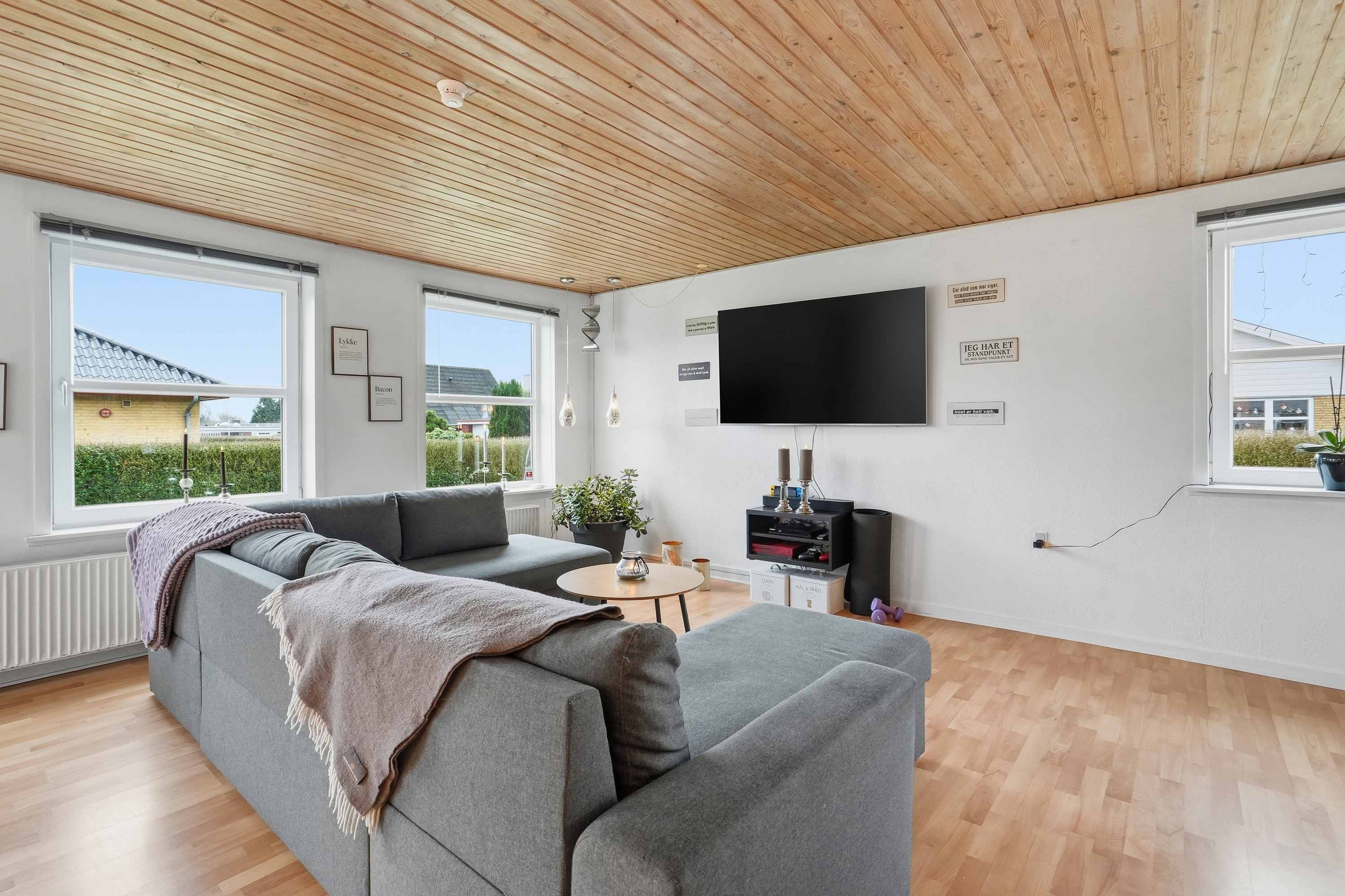 Allerede udefra fornemmer man, at huset er passet godt på. Indenfor træder du ind gennem bryggerset, hvor der er god plads til hverdagens praktiske behov. Herfra fortsætter du videre ind i køkkenet, som ligger i naturlig åben forbindelse med boligens store opholdsstue. Her får du et lyst og indbydende opholdsrum, hvor lyset strømmer ind fra flere sider og skaber en behagelig og varm atmosfære i hele rummet. Her er der rigelig plads til både spisebord og sofagruppe, og stuen fungerer som et naturligt samlingspunkt i hverdagen. Fra stuen er der desuden udgang til terrassen og haven – et oplagt sted for både afslapning og familietid i de varme måneder.