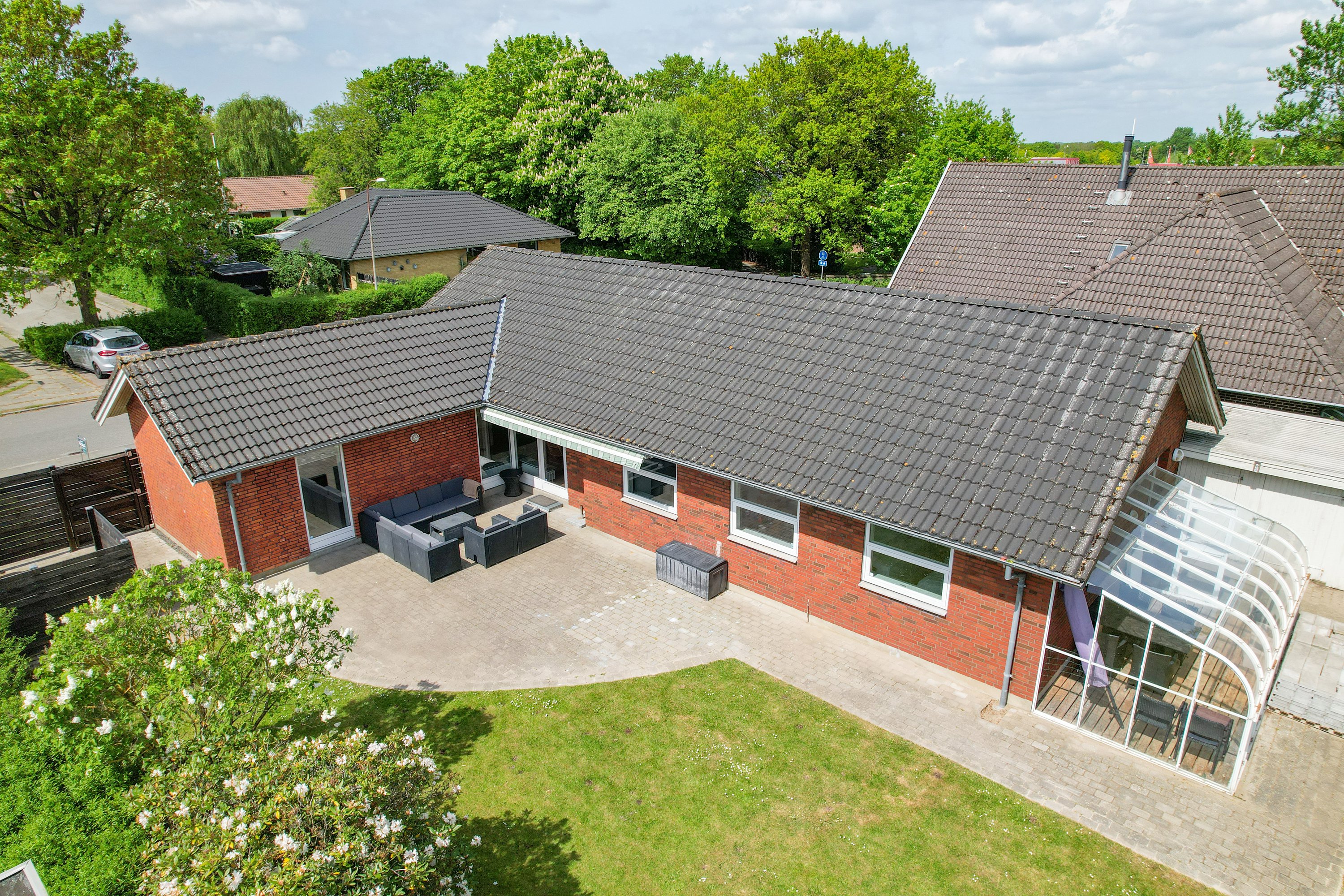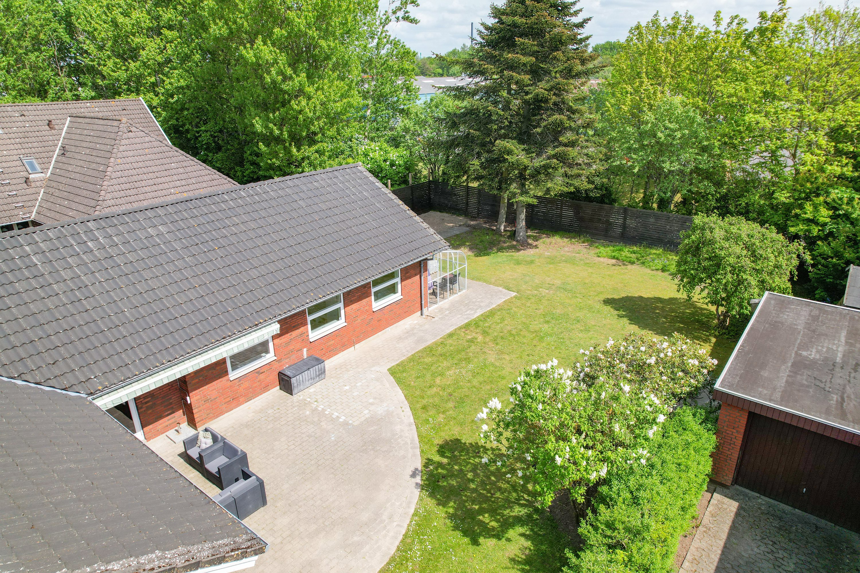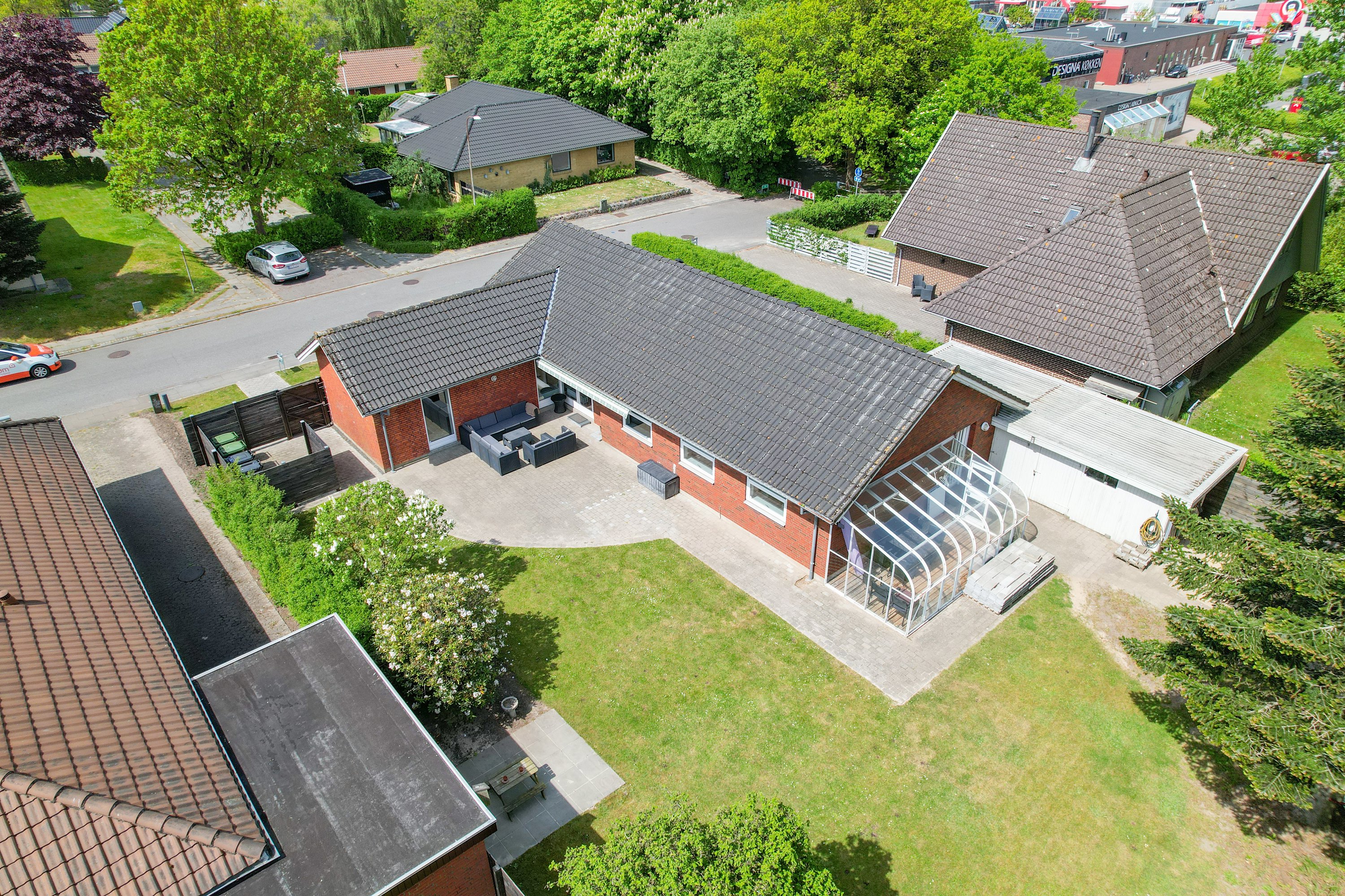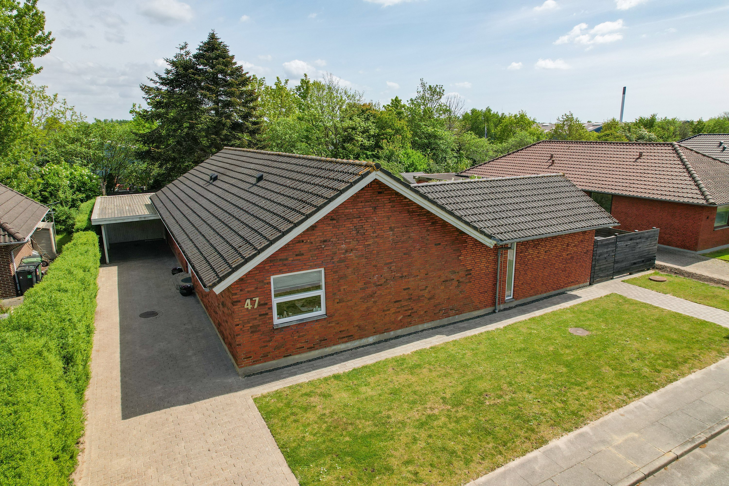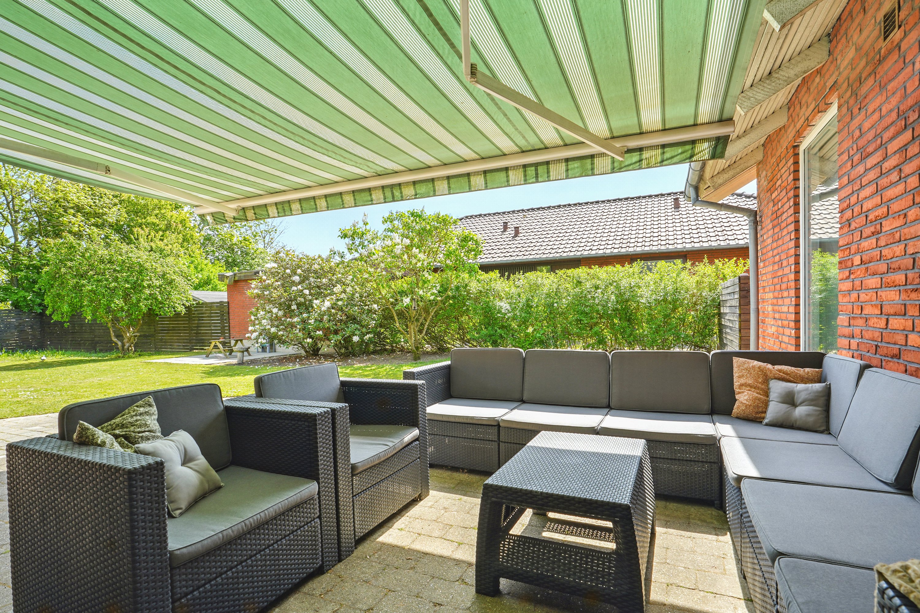 Haven er lukket og privat, hvilket skaber trygge og rolige rammer for leg og udeliv. Her findes også en hyggelig terrasse med markise, der ligger i direkte forbindelse til spisestuen – ideelt til både hverdag og gæster. Til boligen hører desuden en carport og et praktisk skur med plads til haveredskaber og opbevaring.