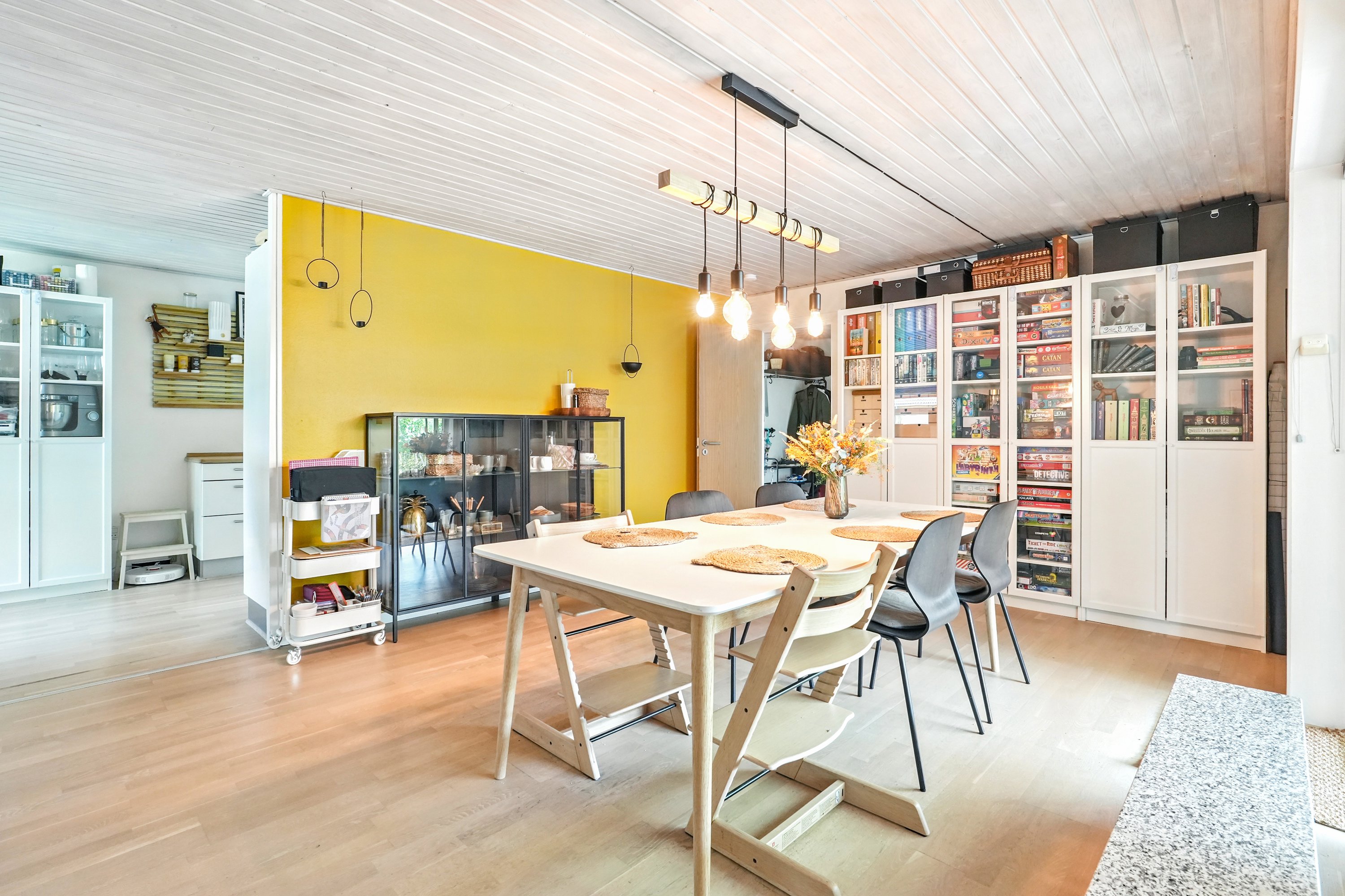 Husets hjerte er det lyse og rummelige køkken, som ligger i åben forbindelse til spisestuen og stuen – her er der masser af plads til at samle hele familien og nyde både hverdag og fest. Derudover er der et kontor, som nemt kan integreres i spisestuen eller flyttes ned hvor stuen er, hvis der opstår behov for et ekstra værelse eller en anderledes indretning.
