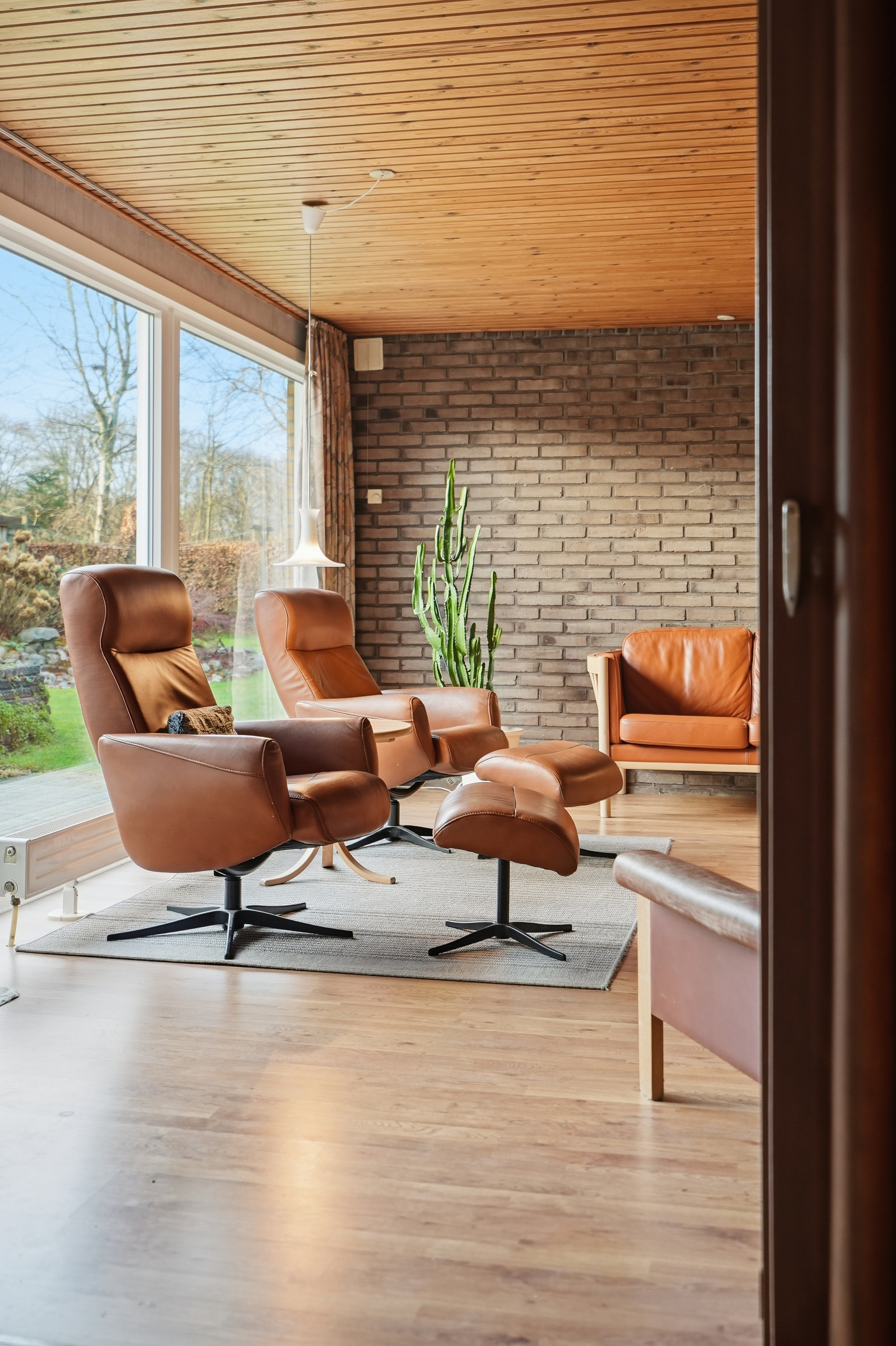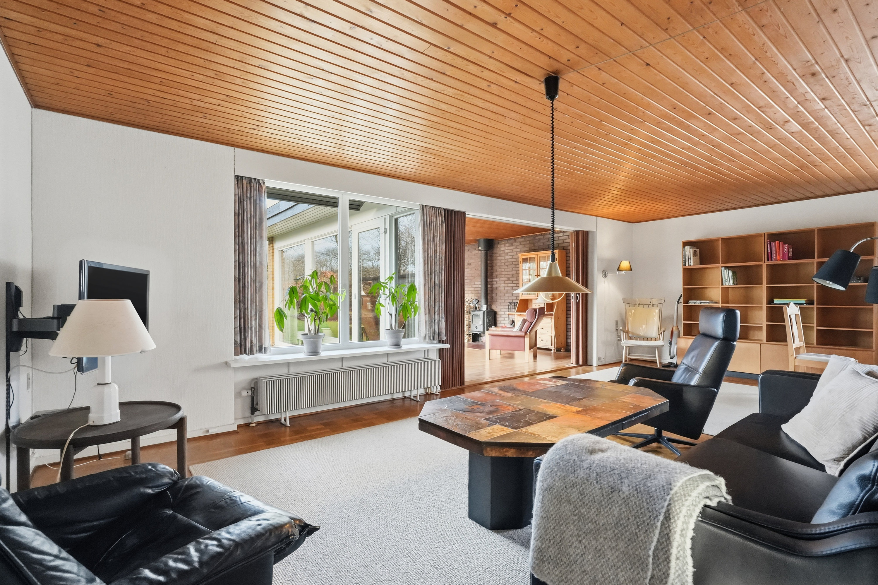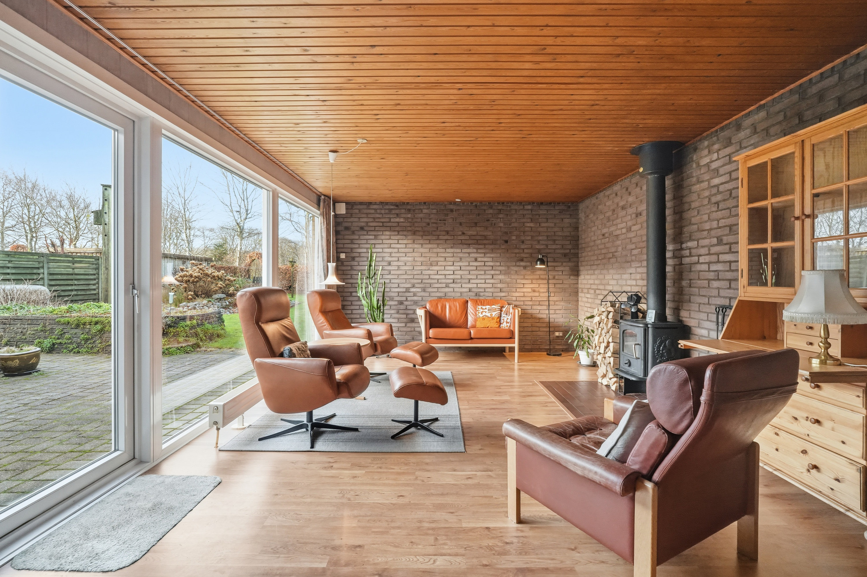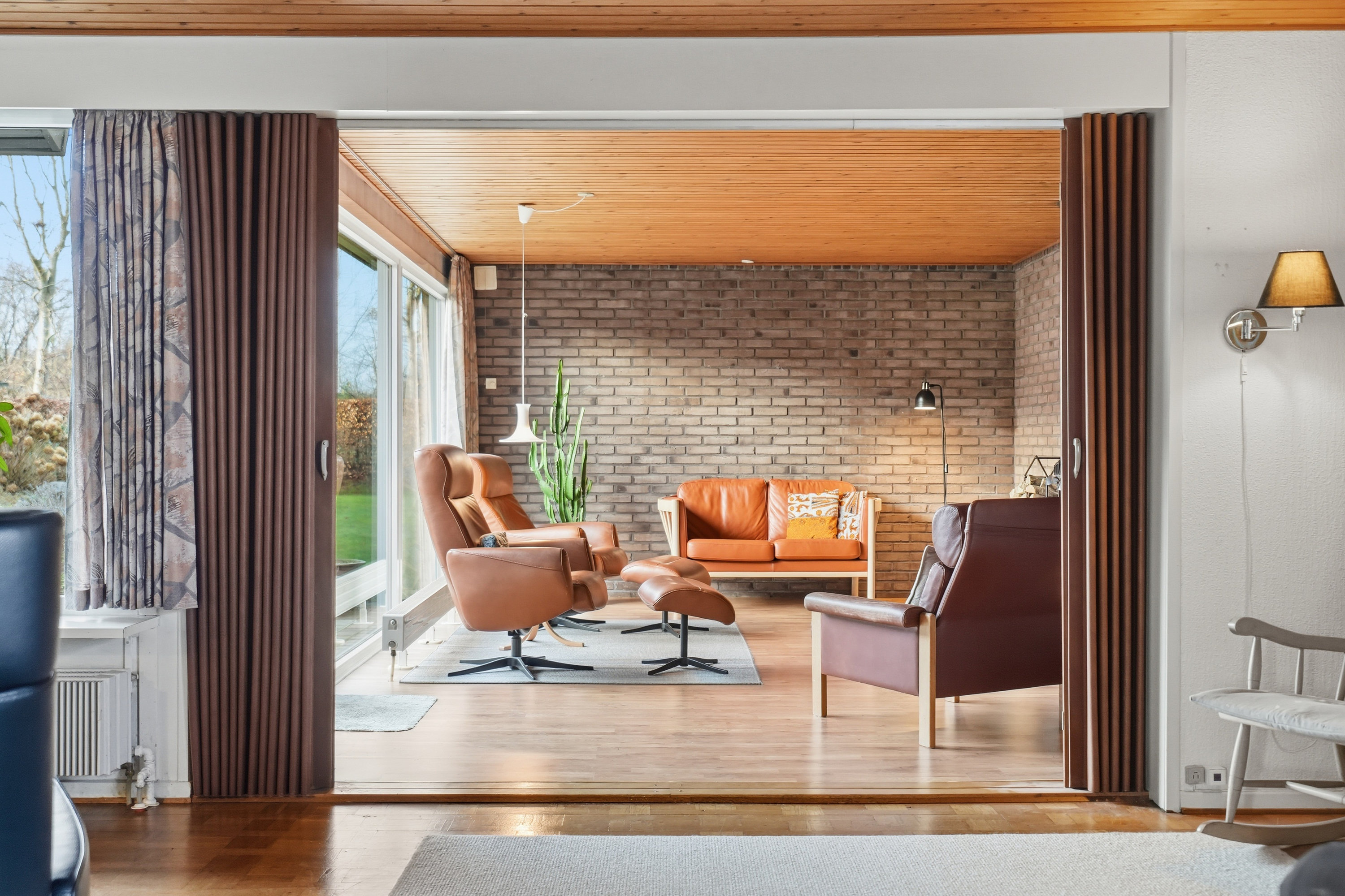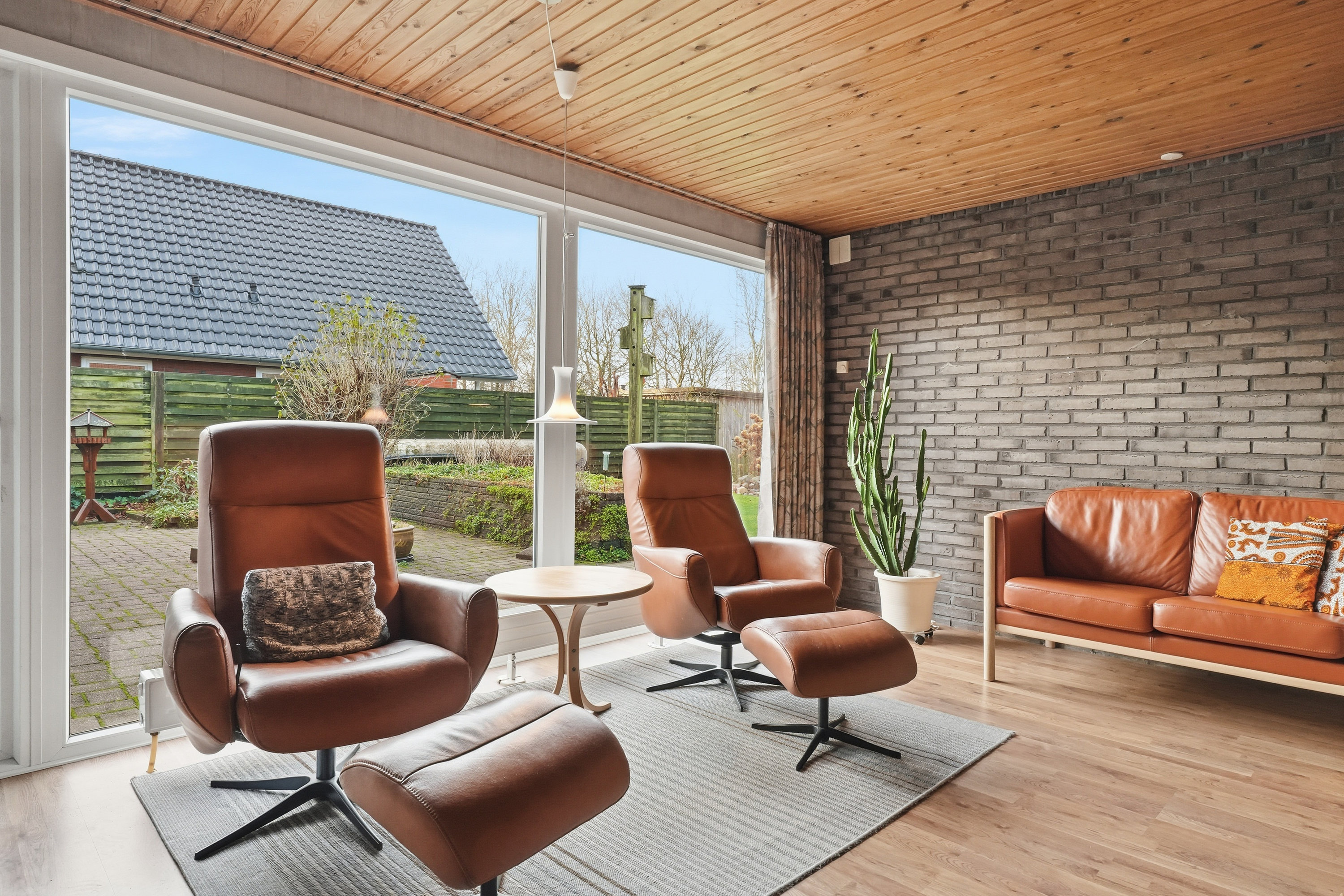 Indenfor mødes du af en hyggelig stue med brune murstensvægge og et stort vinduesparti, der åbner rummet mod haven og fylder det med naturligt lys. Atmosfæren er varm og imødekommende, og stuen fungerer som et naturligt samlingspunkt i hverdagen. Boligen rummer flere regulære værelser, som let kan tilpasses forskellige behov – hvad enten du ønsker børneværelser, kontor, gæsterum eller ekstra hobbyplads.