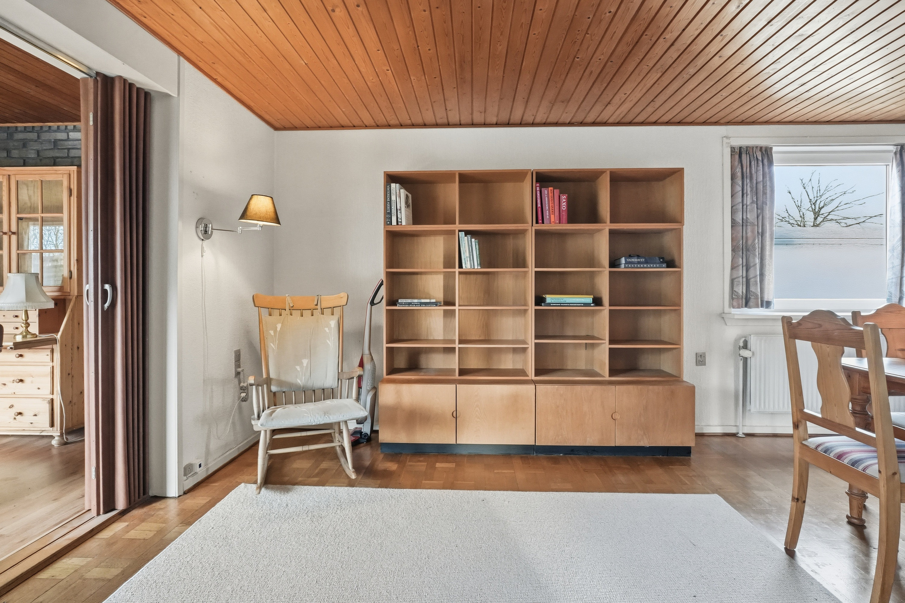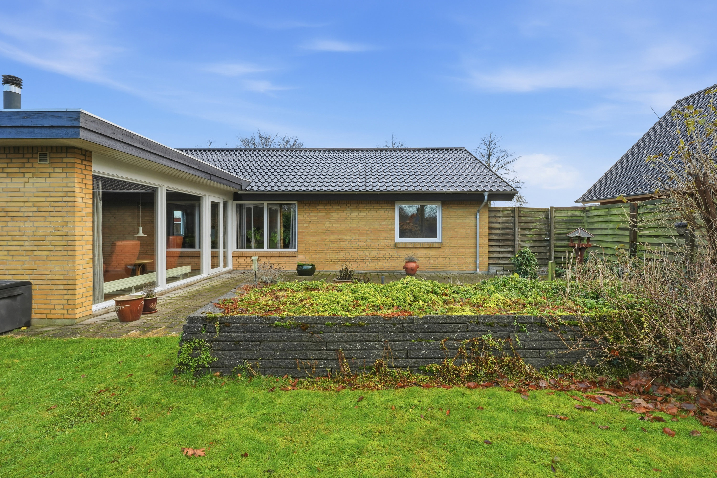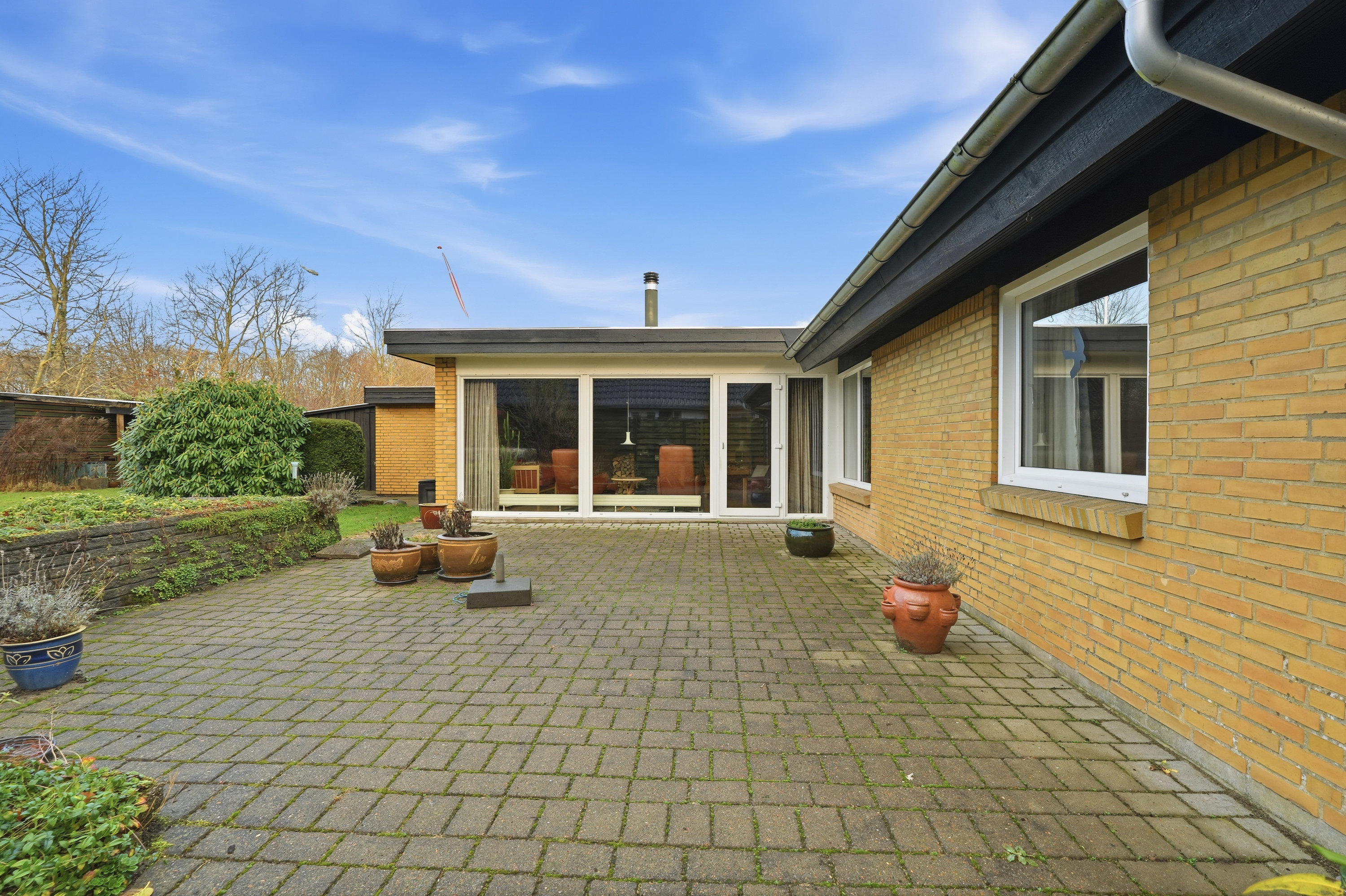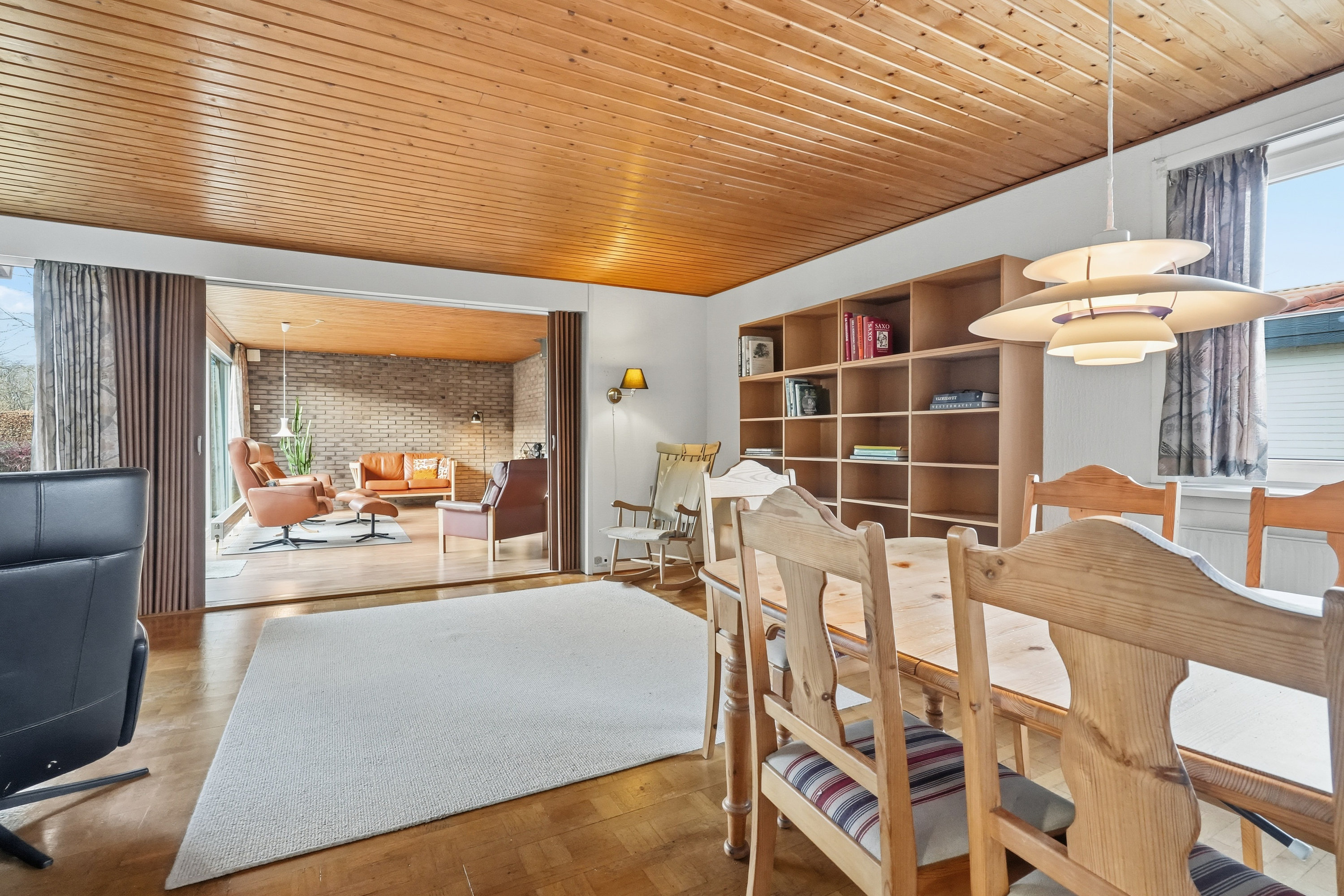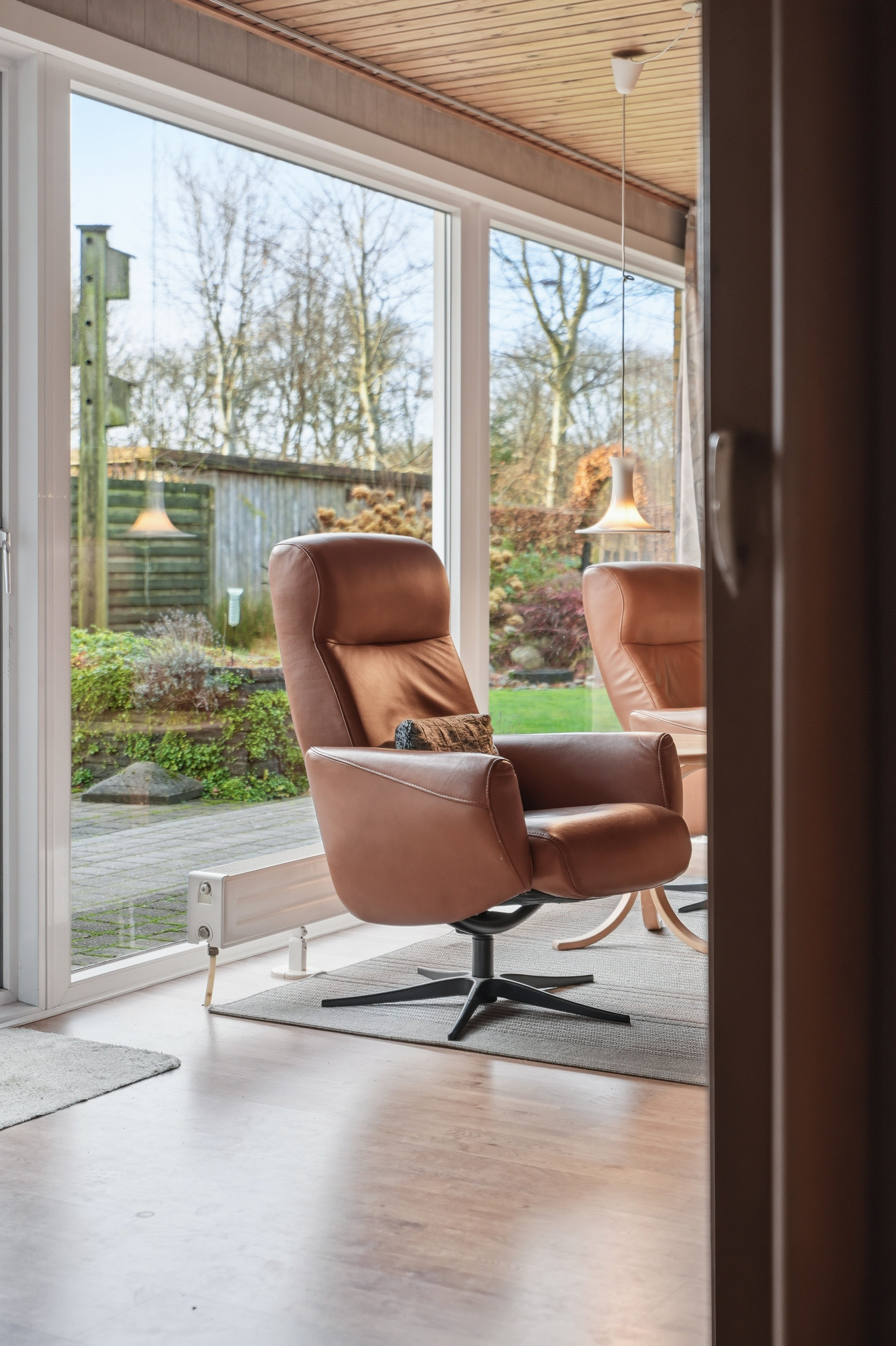Indenfor mødes du af en hyggelig stue med brune murstensvægge og et stort vinduesparti, der åbner rummet mod haven og fylder det med naturligt lys. Atmosfæren er varm og imødekommende, og stuen fungerer som et naturligt samlingspunkt i hverdagen. Boligen rummer flere regulære værelser, som let kan tilpasses forskellige behov – hvad enten du ønsker børneværelser, kontor, gæsterum eller ekstra hobbyplads.