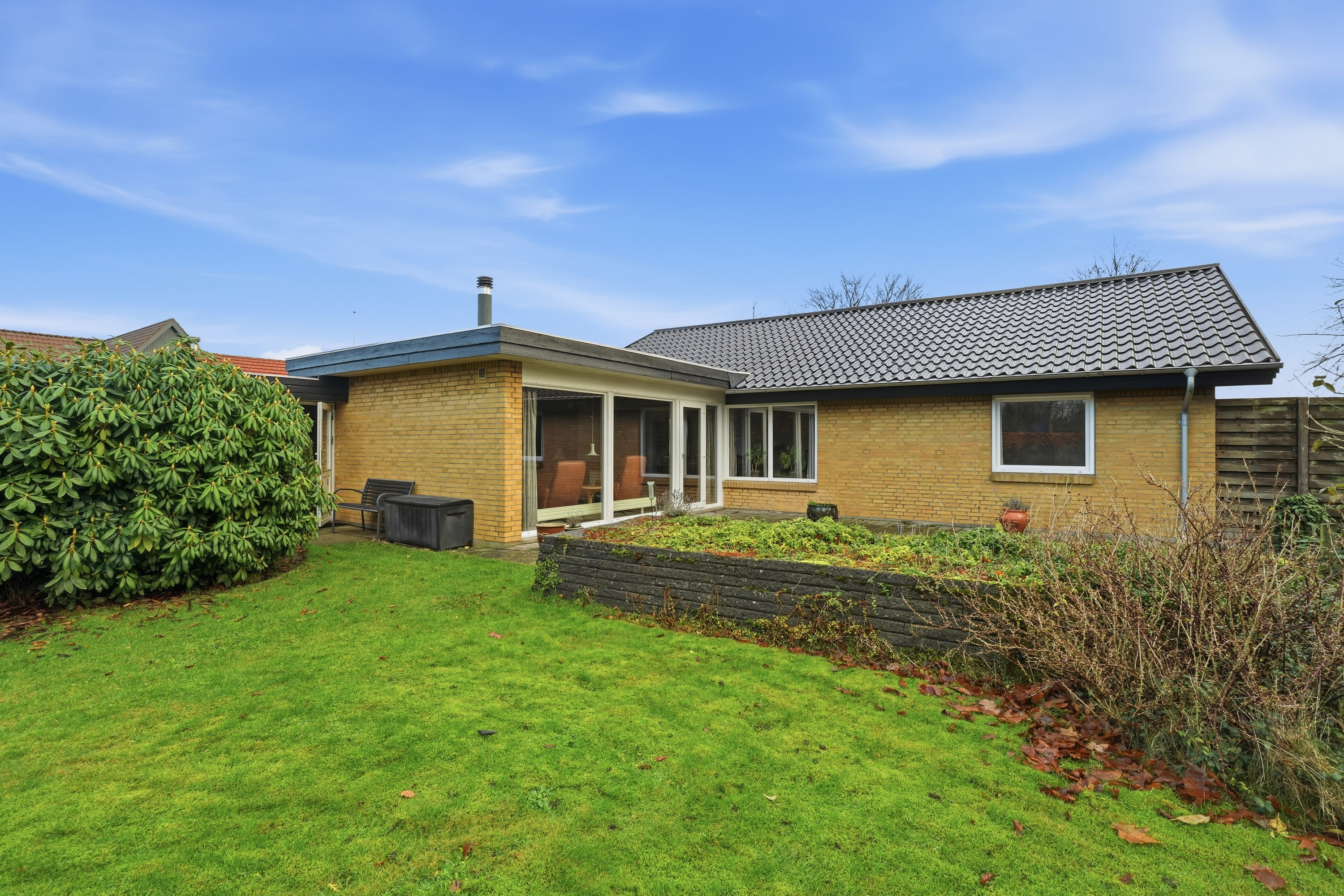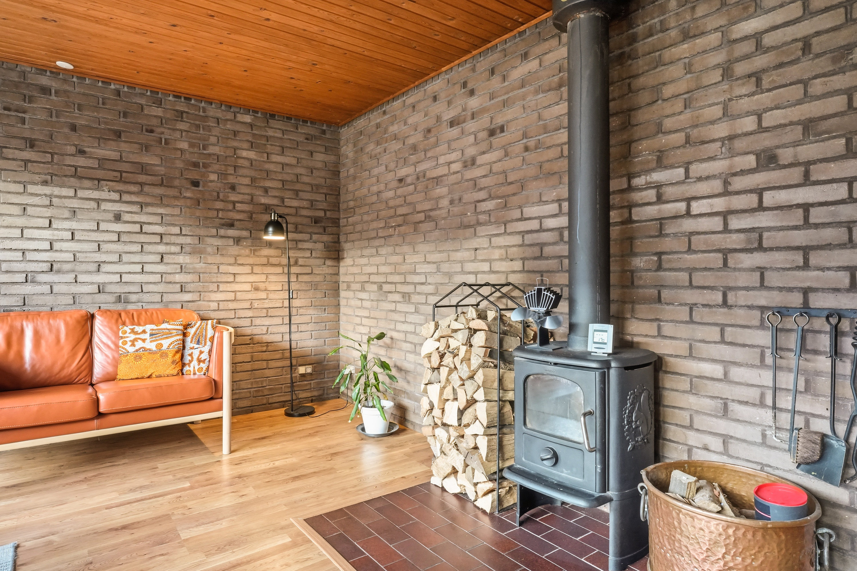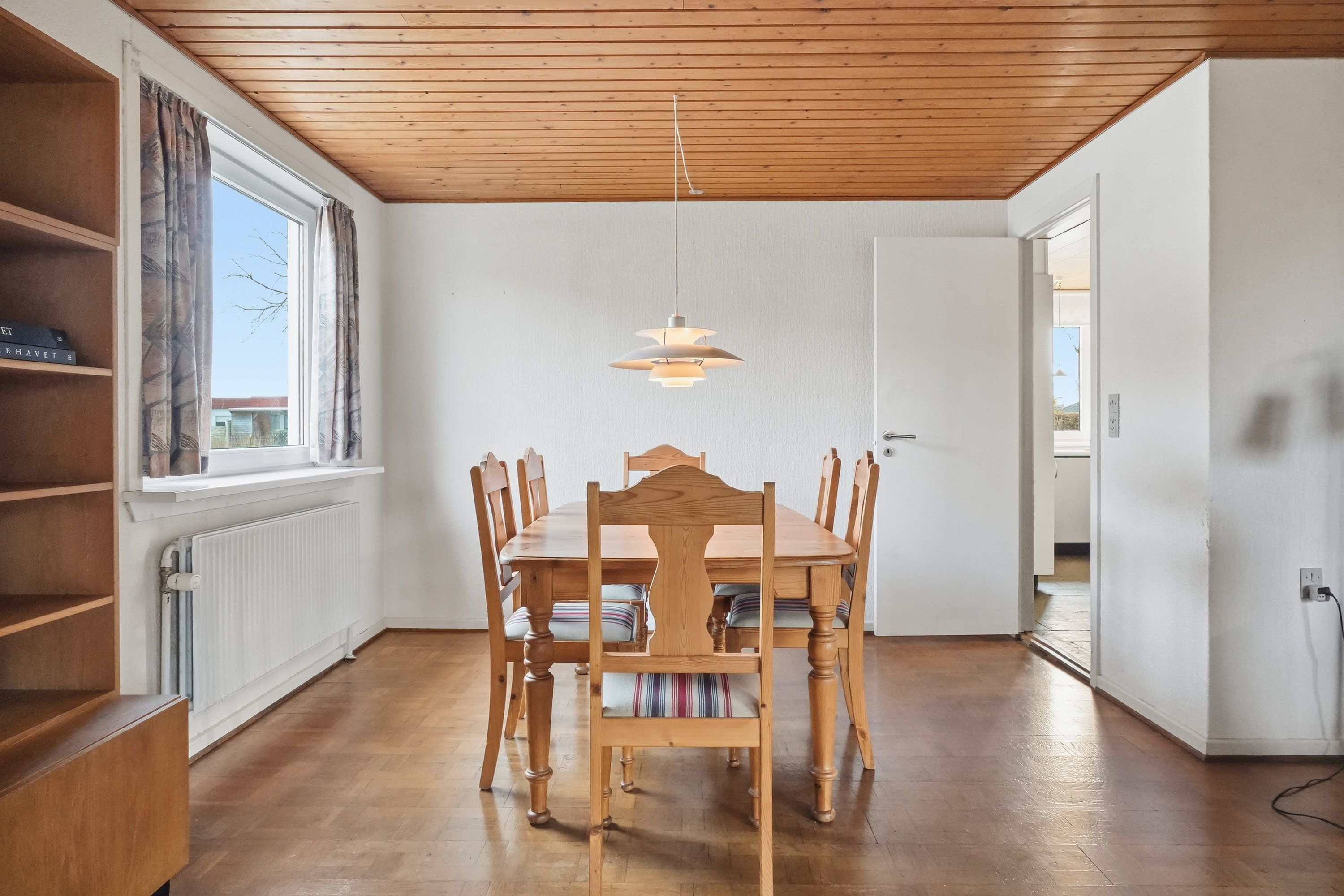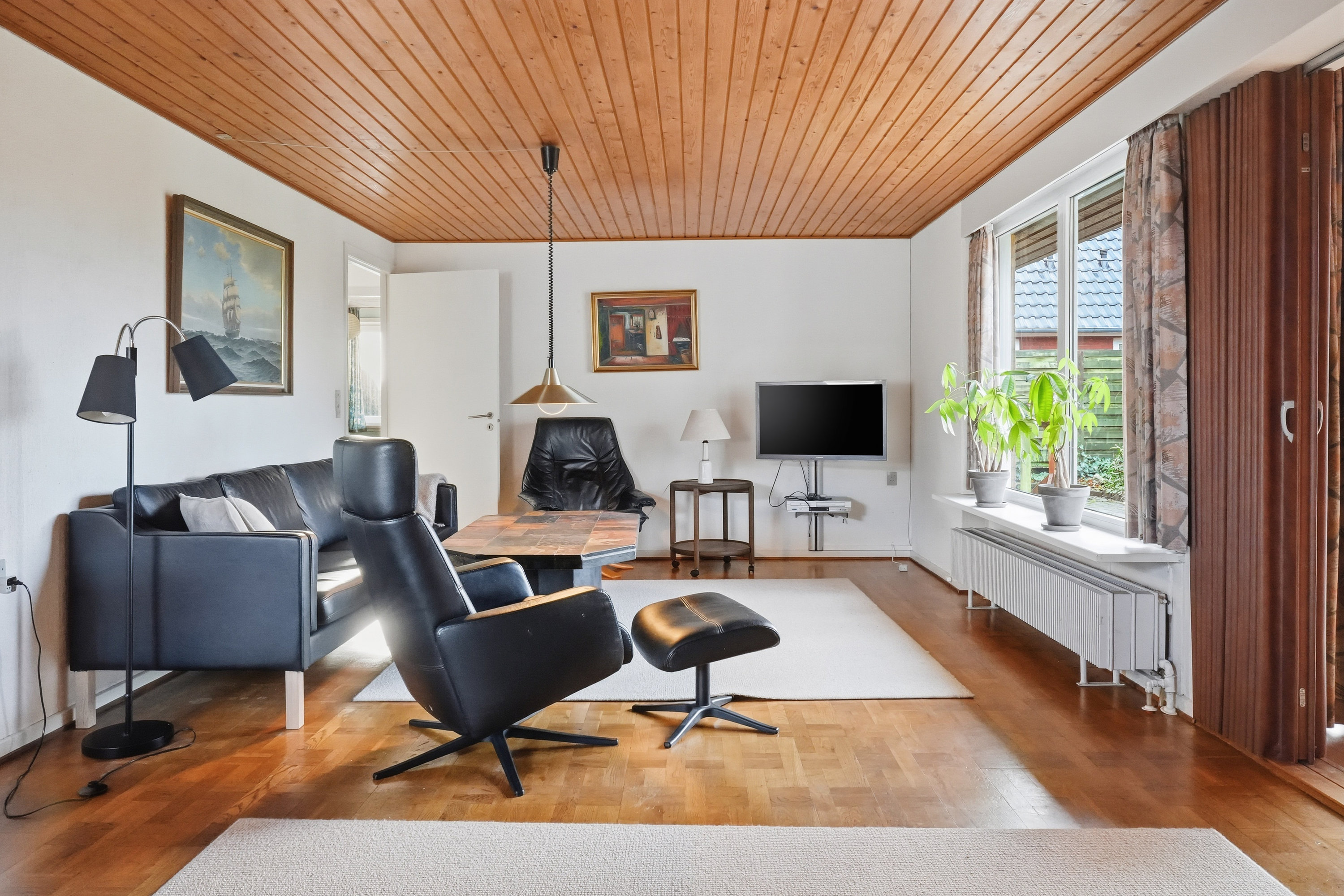 Indenfor mødes du af en hyggelig stue med brune murstensvægge og et stort vinduesparti, der åbner rummet mod haven og fylder det med naturligt lys. Atmosfæren er varm og imødekommende, og stuen fungerer som et naturligt samlingspunkt i hverdagen. Boligen rummer flere regulære værelser, som let kan tilpasses forskellige behov – hvad enten du ønsker børneværelser, kontor, gæsterum eller ekstra hobbyplads.