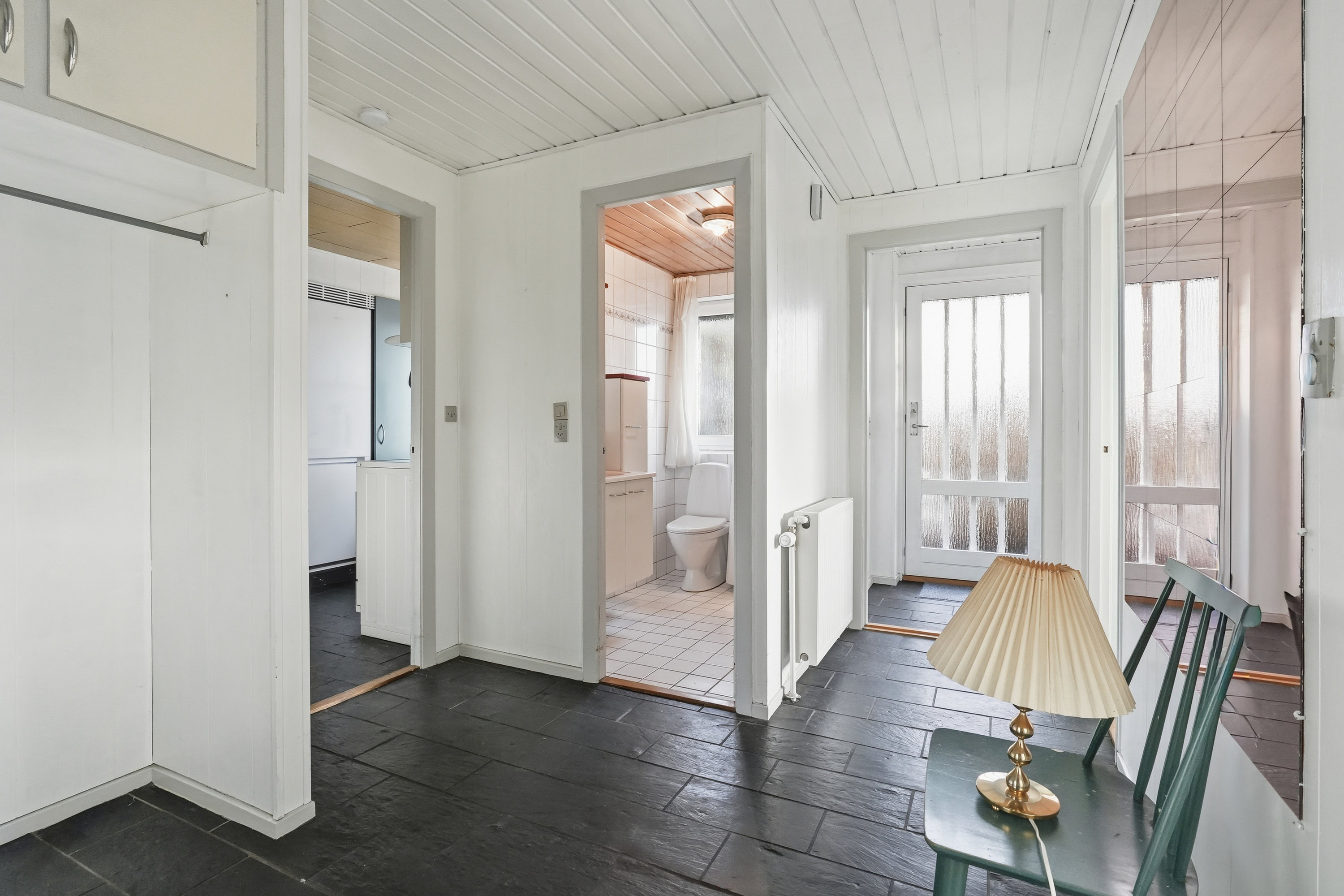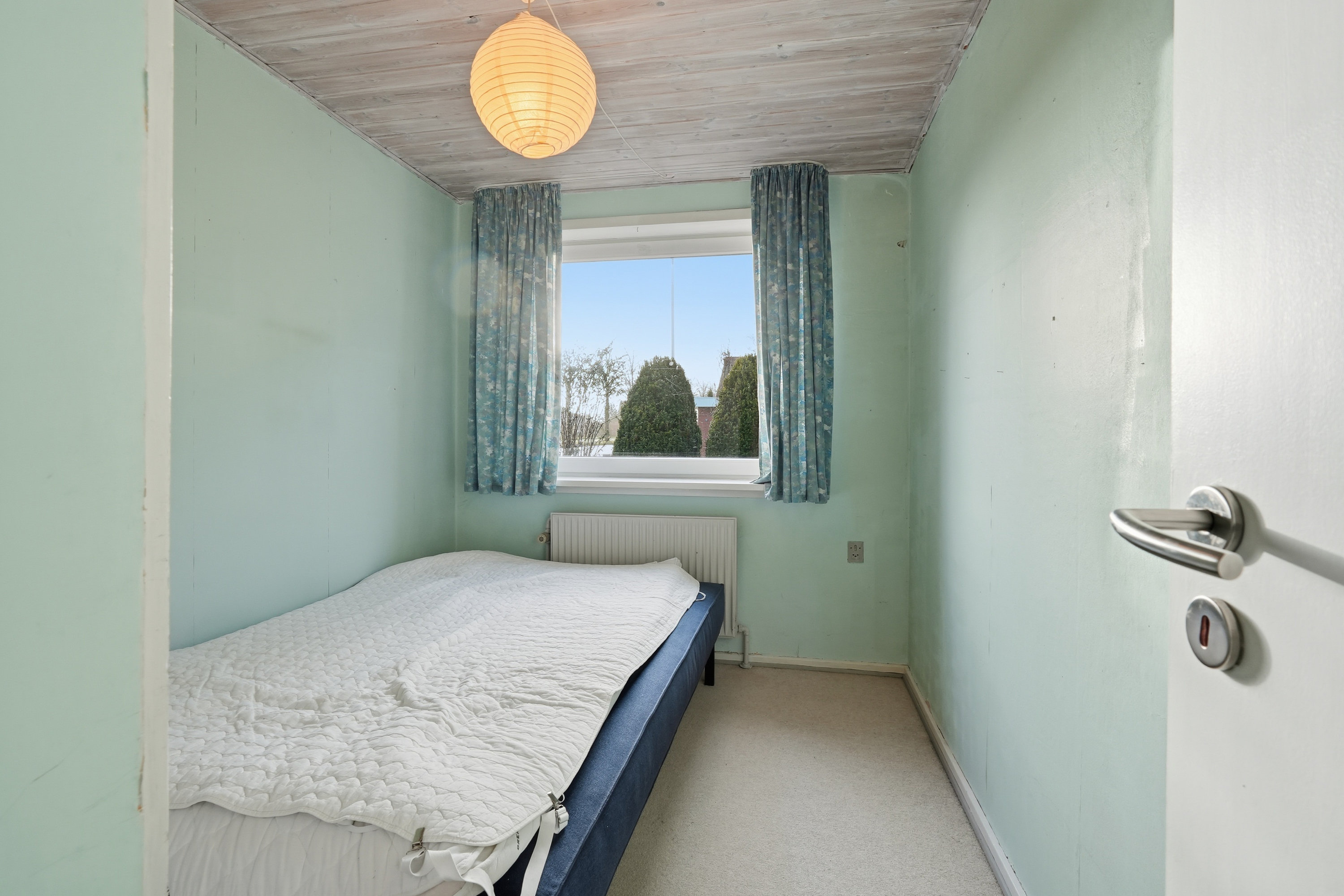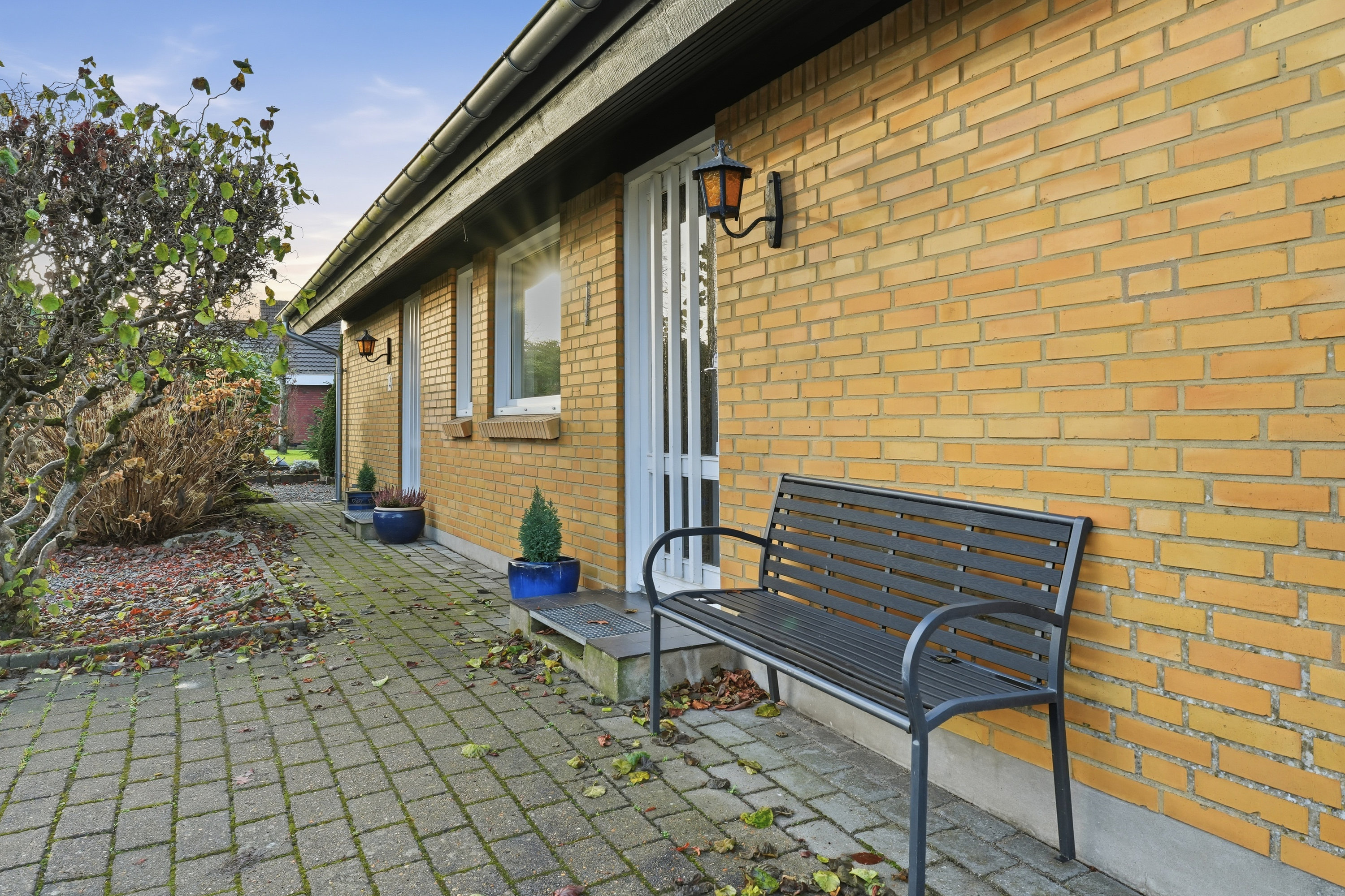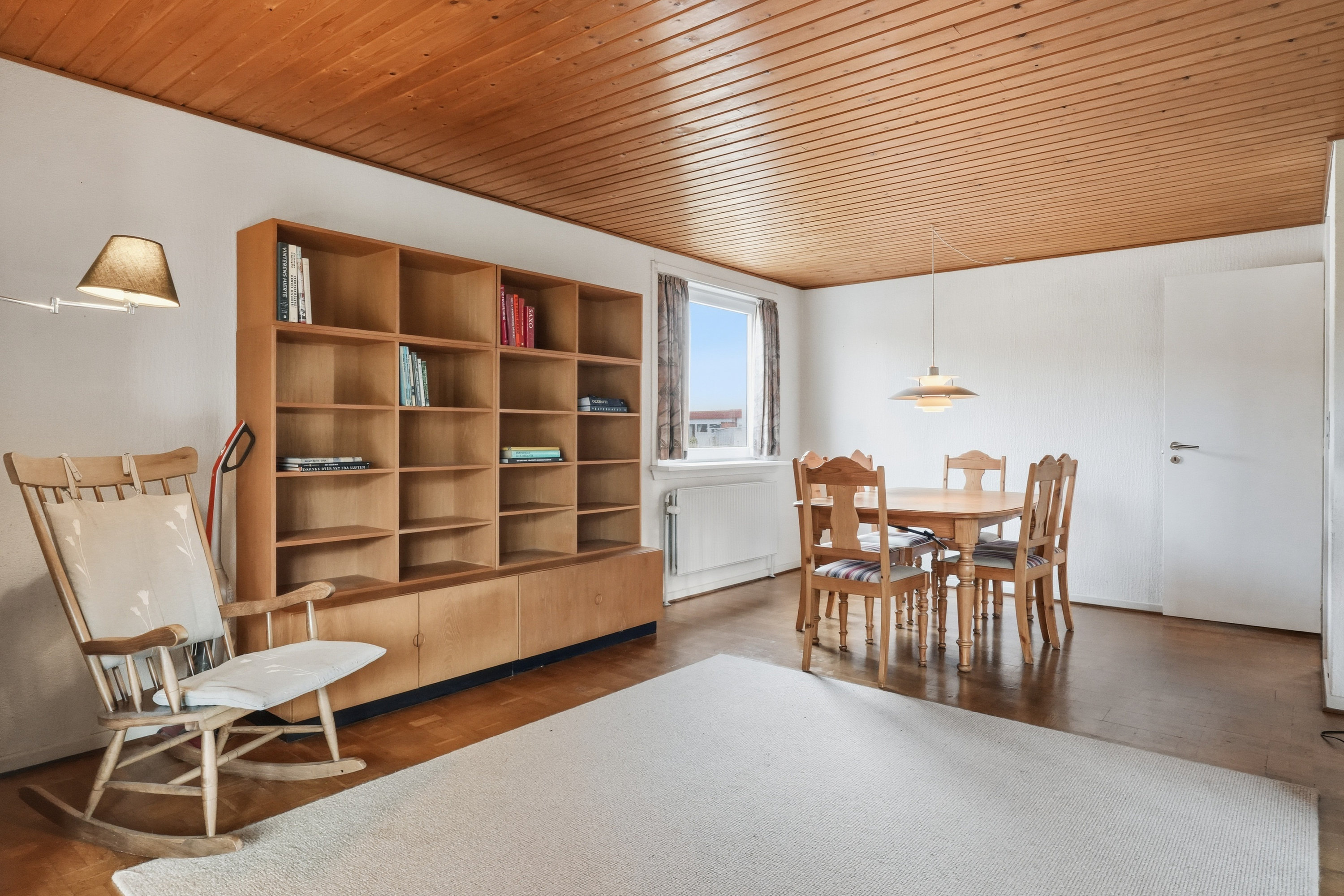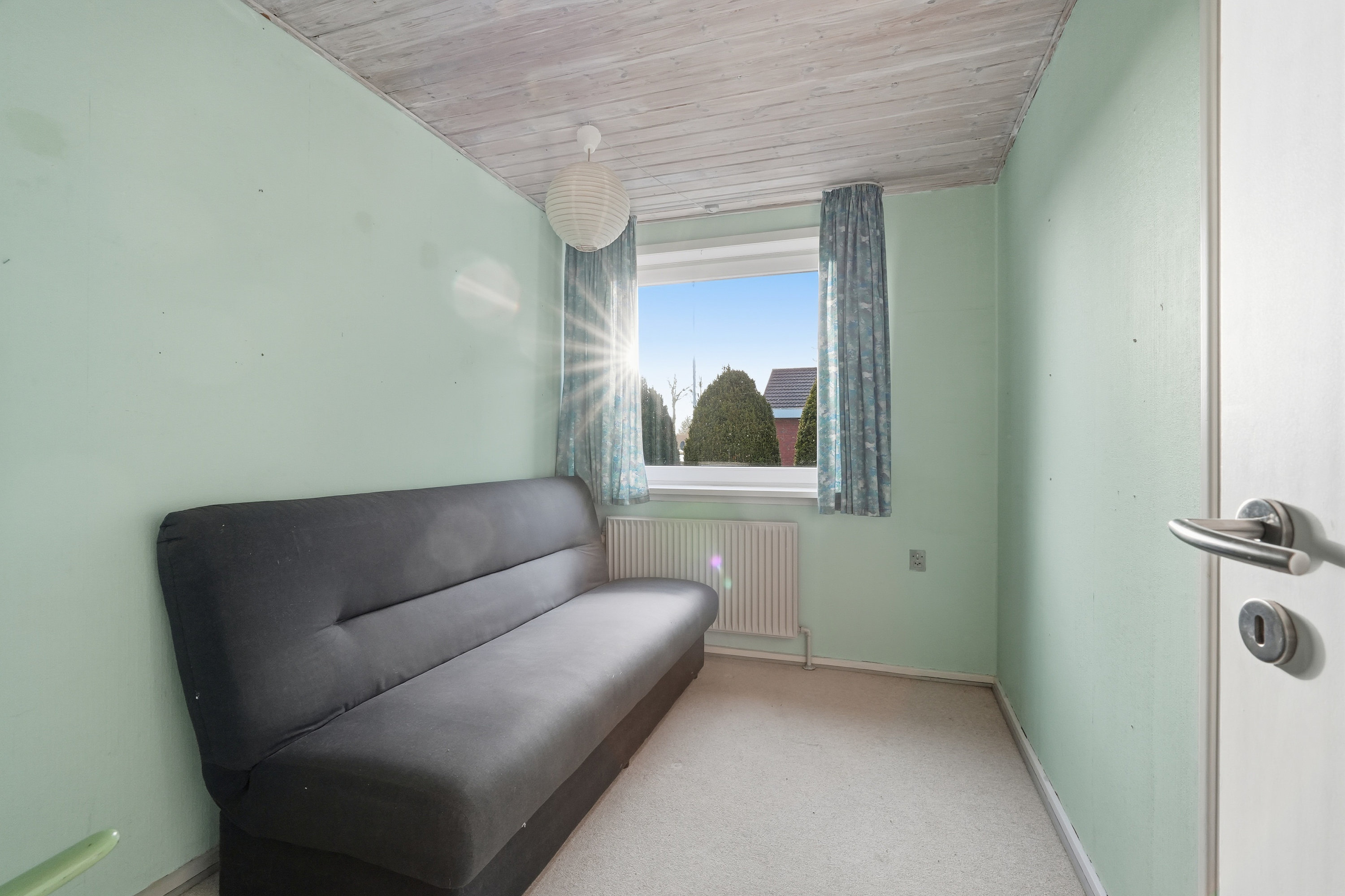 Indenfor mødes du af en hyggelig stue med brune murstensvægge og et stort vinduesparti, der åbner rummet mod haven og fylder det med naturligt lys. Atmosfæren er varm og imødekommende, og stuen fungerer som et naturligt samlingspunkt i hverdagen. Boligen rummer flere regulære værelser, som let kan tilpasses forskellige behov – hvad enten du ønsker børneværelser, kontor, gæsterum eller ekstra hobbyplads.
