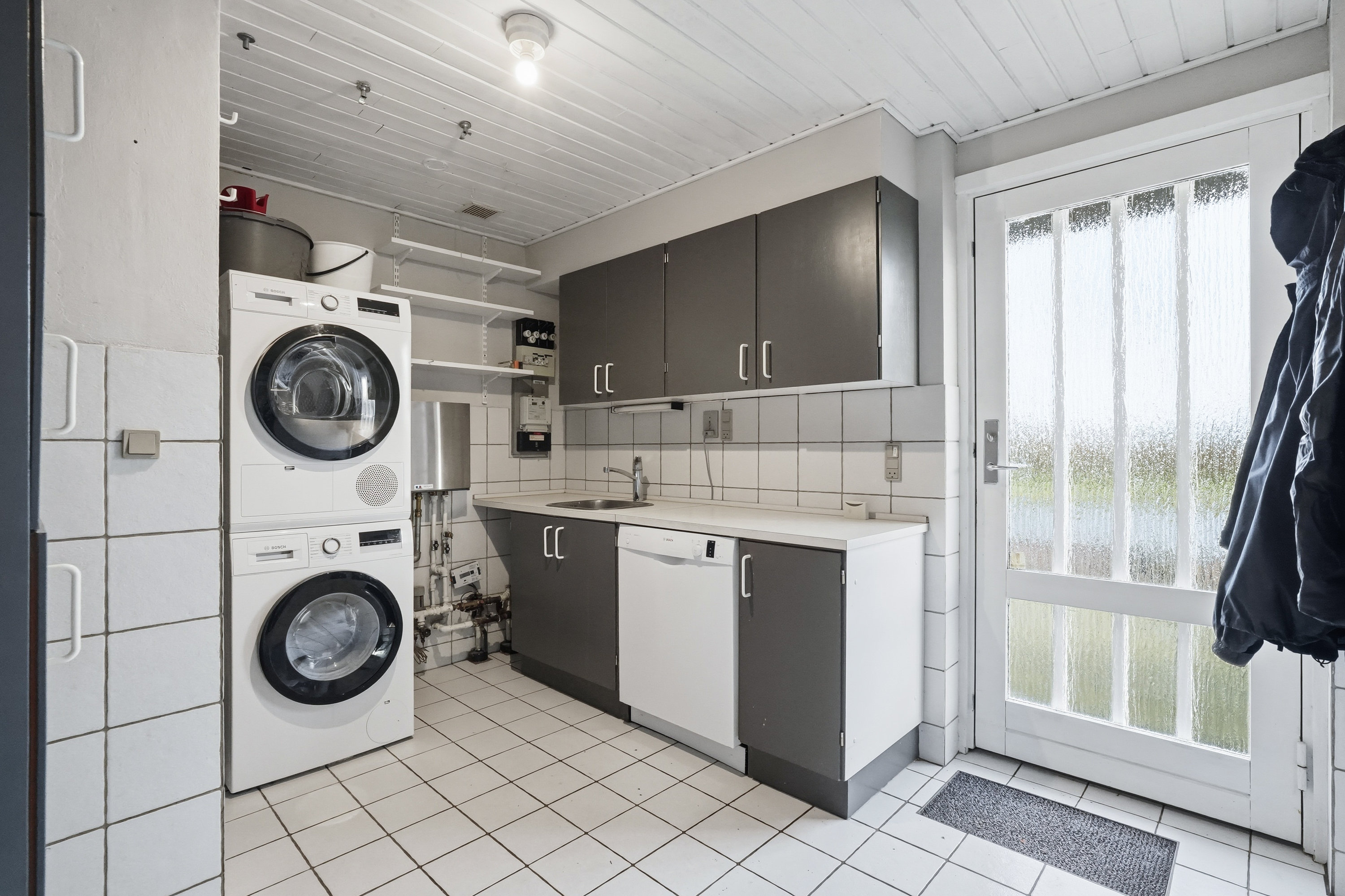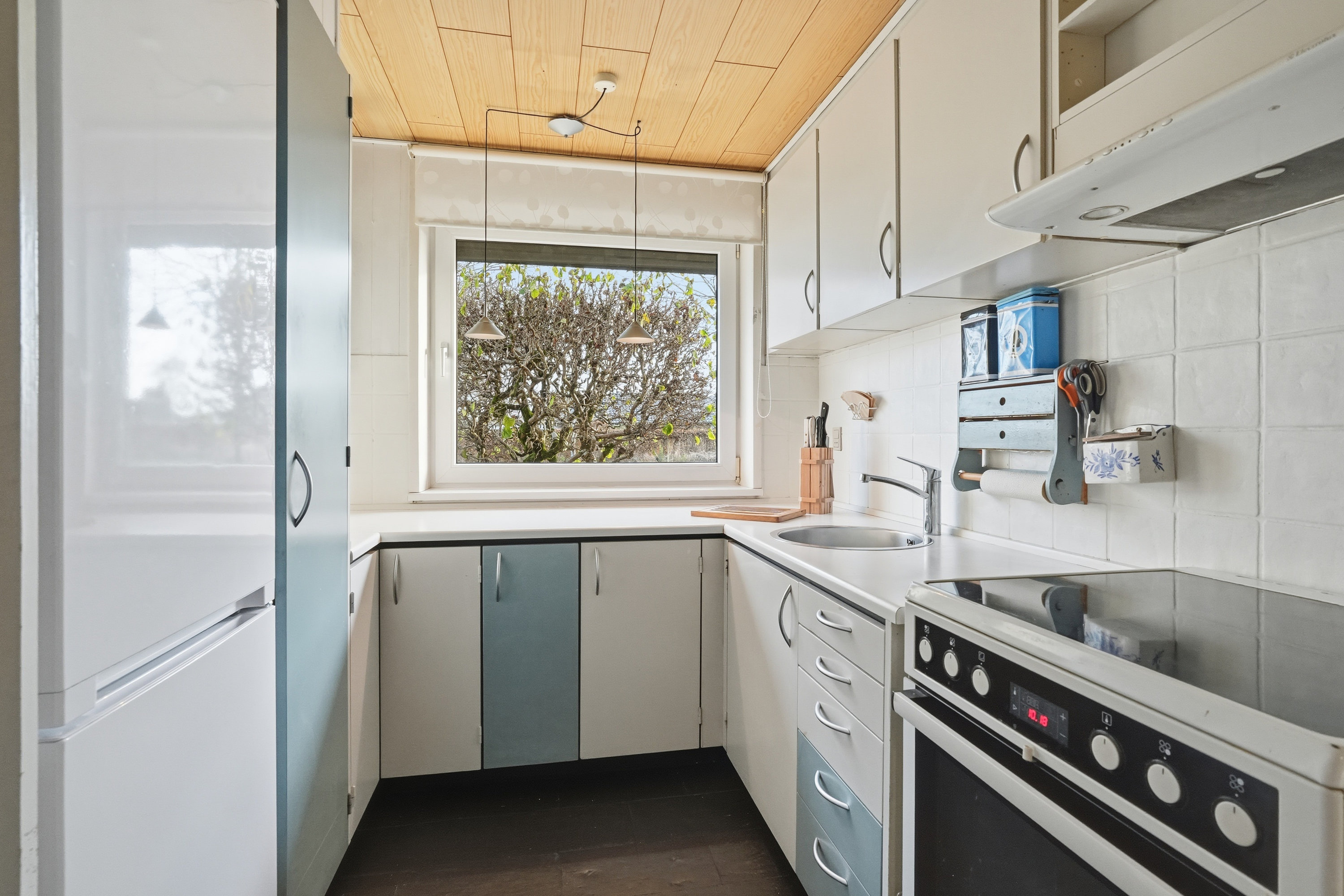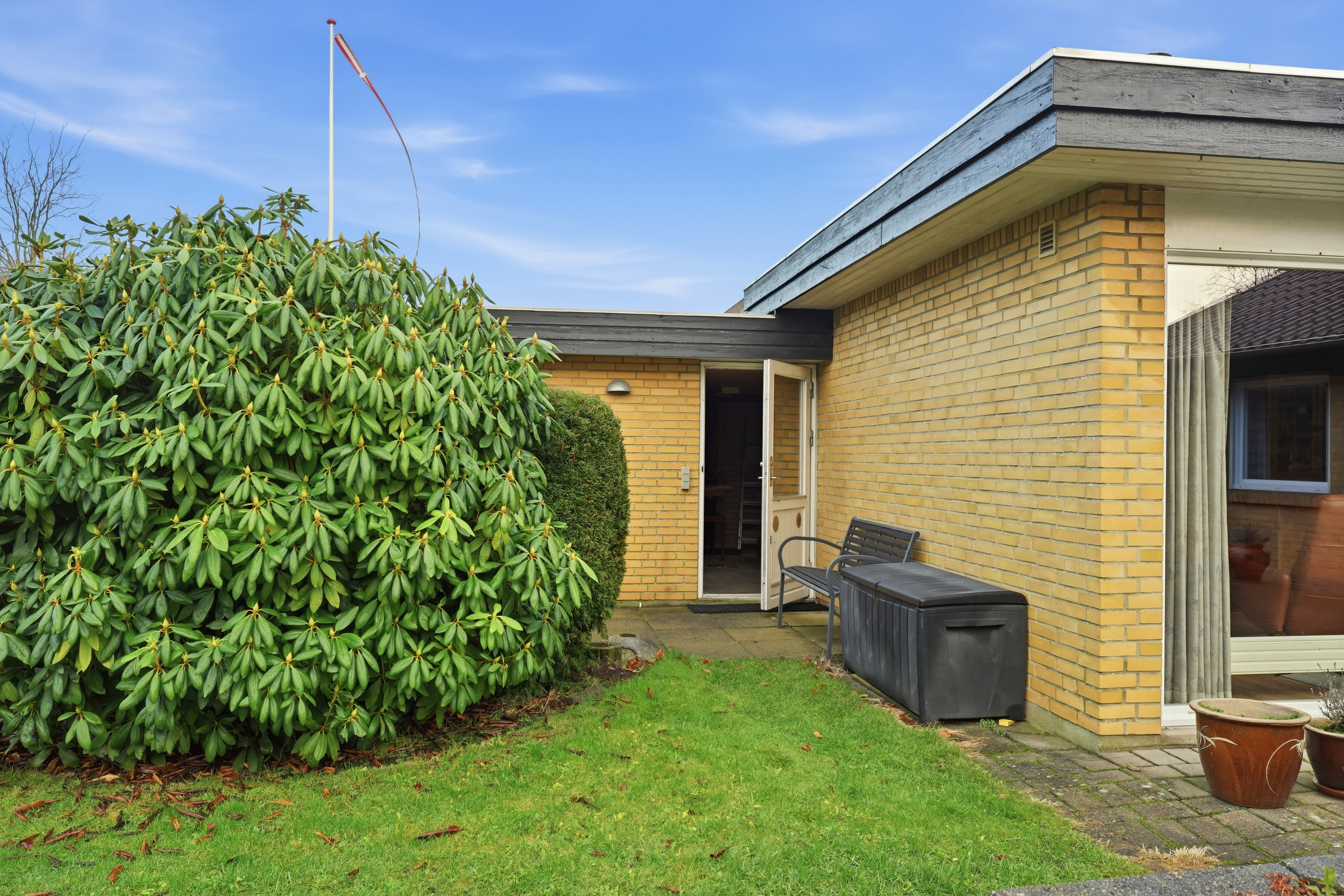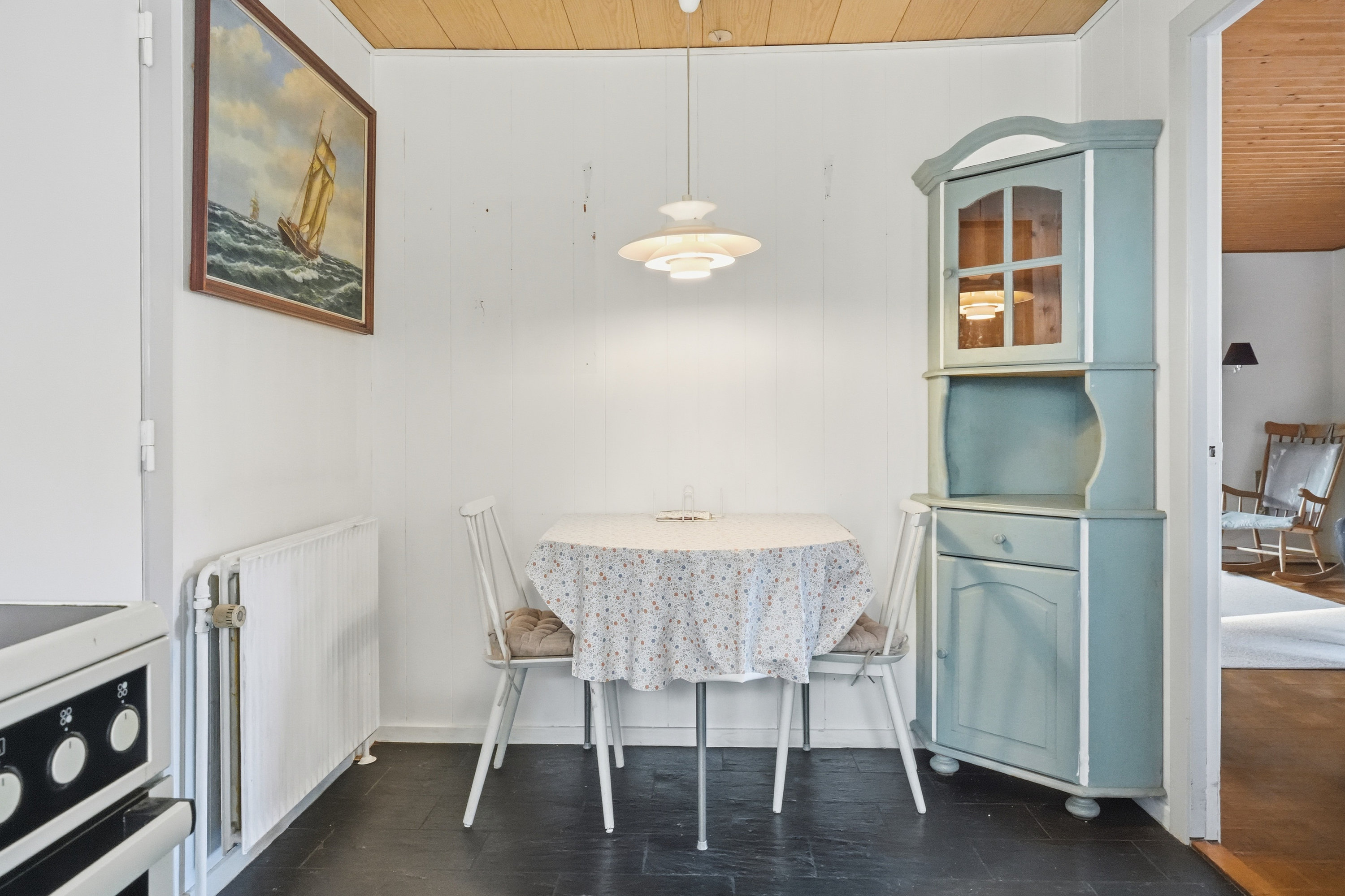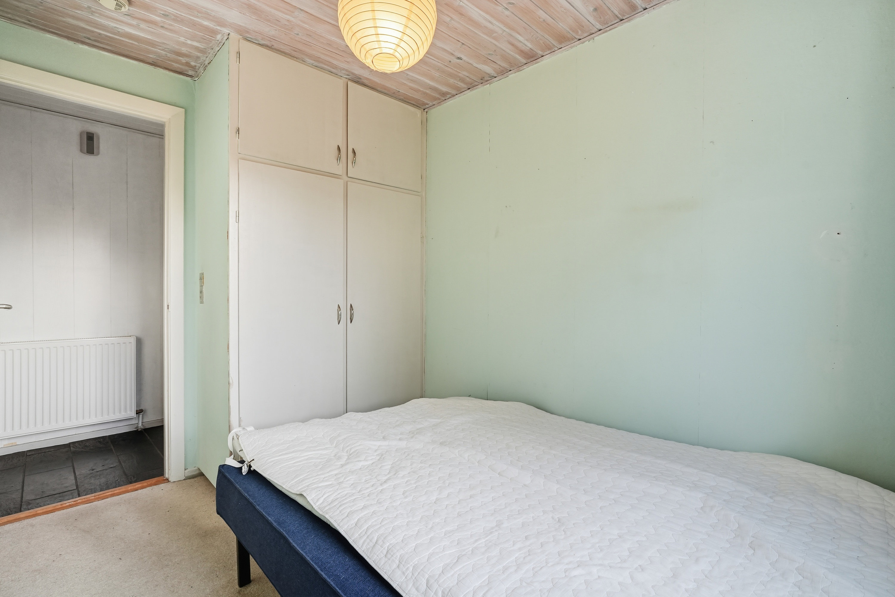 Indenfor mødes du af en hyggelig stue med brune murstensvægge og et stort vinduesparti, der åbner rummet mod haven og fylder det med naturligt lys. Atmosfæren er varm og imødekommende, og stuen fungerer som et naturligt samlingspunkt i hverdagen. Boligen rummer flere regulære værelser, som let kan tilpasses forskellige behov – hvad enten du ønsker børneværelser, kontor, gæsterum eller ekstra hobbyplads.