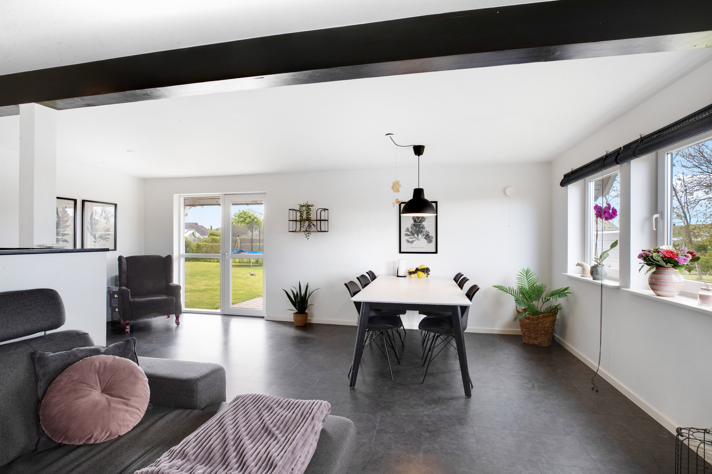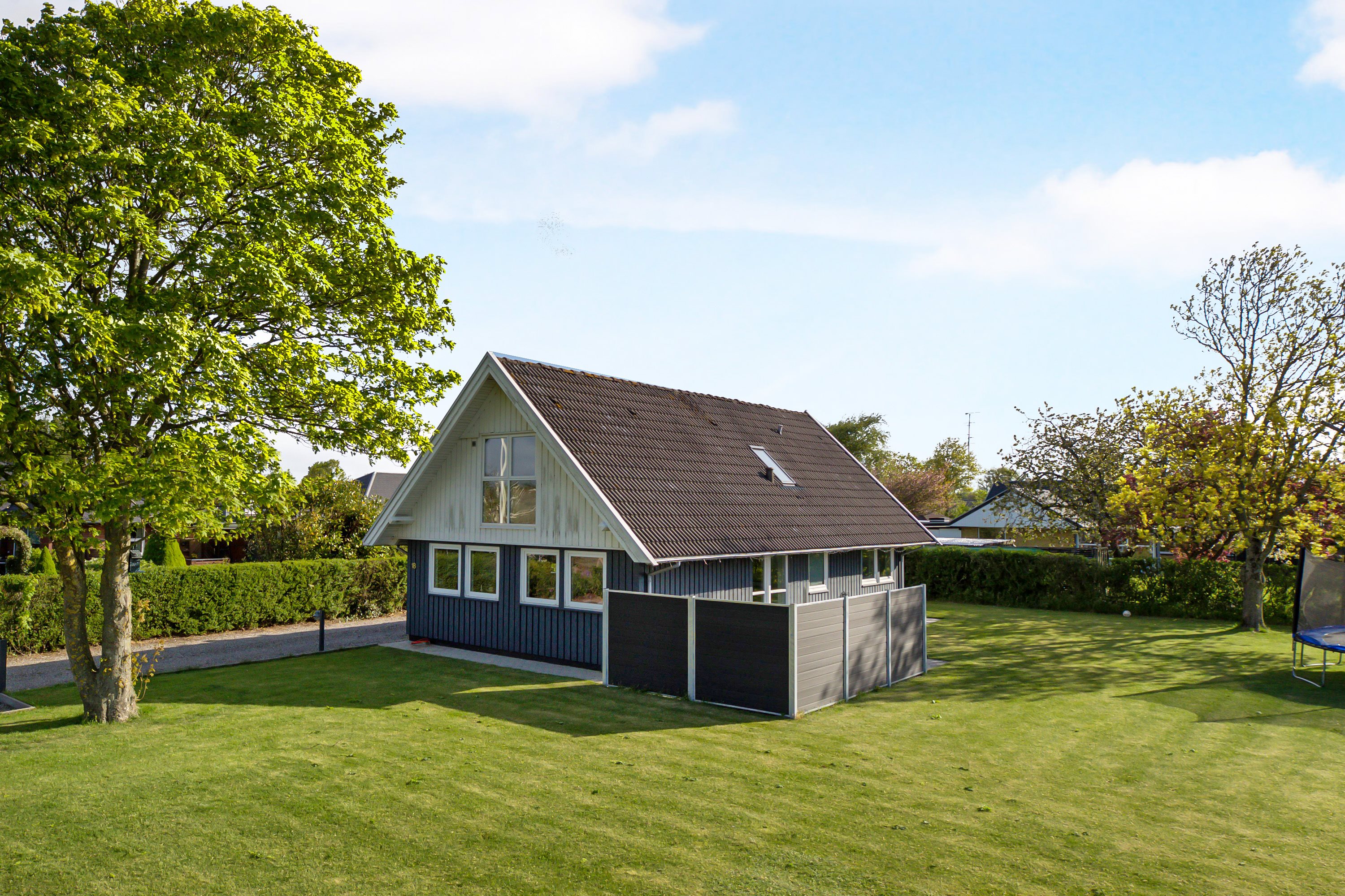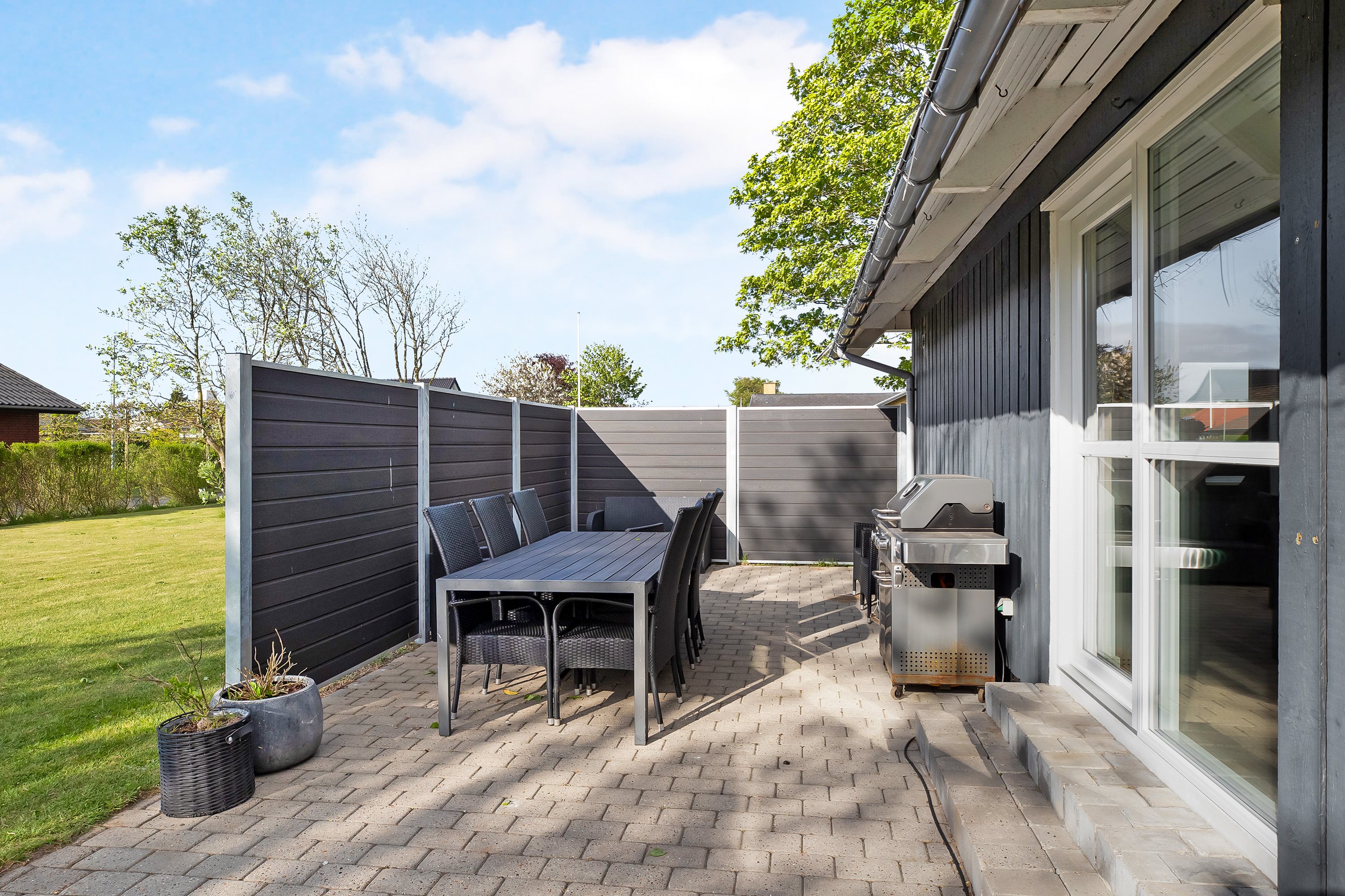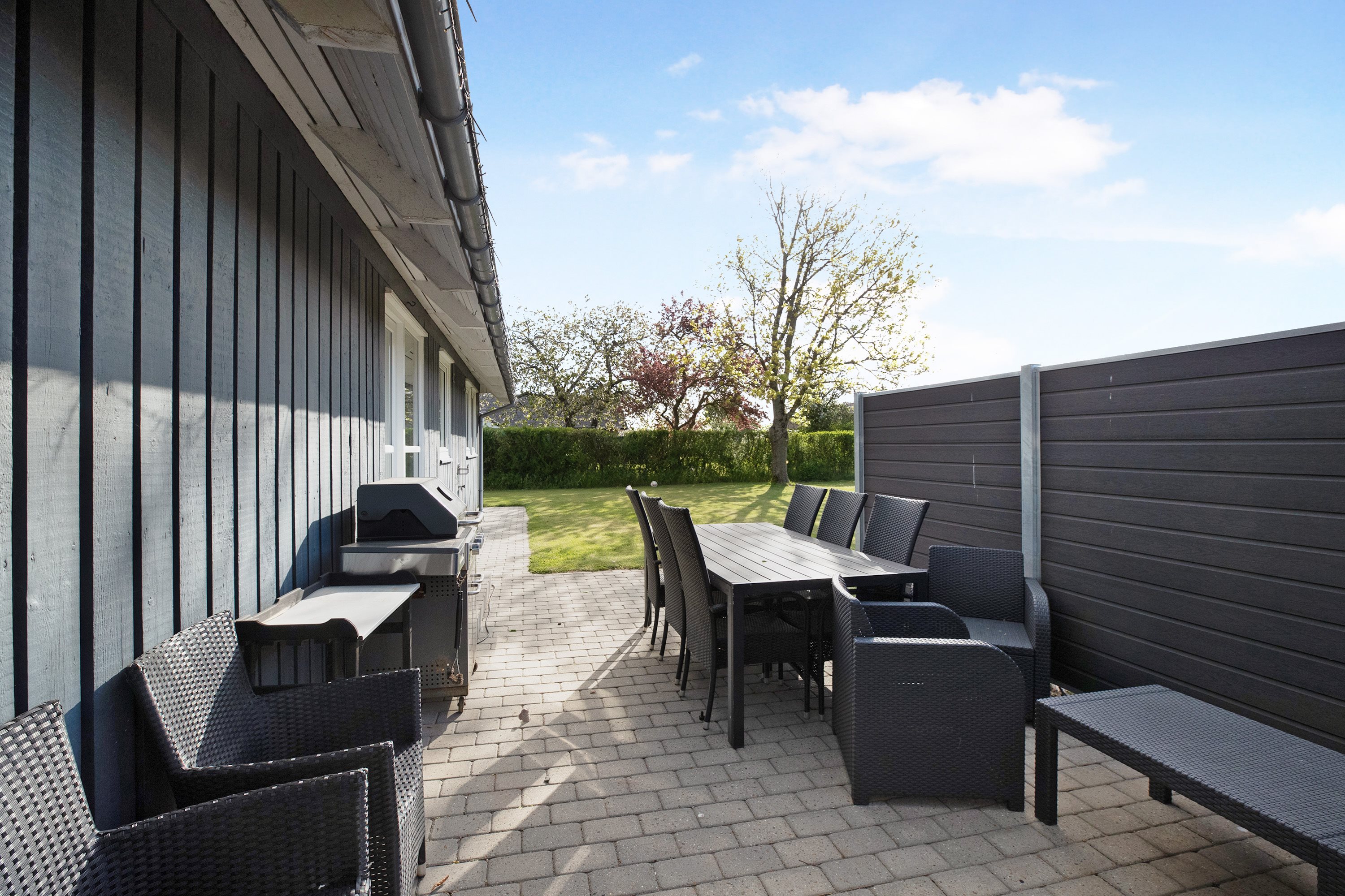 Udendørs venter en dejlig og ugeneret have med masser af plads til både afslapning, leg og boldspil. Den store terrasse inviterer til lange sommeraftener, mens den omkransende hæk sikrer både privatliv og ro.